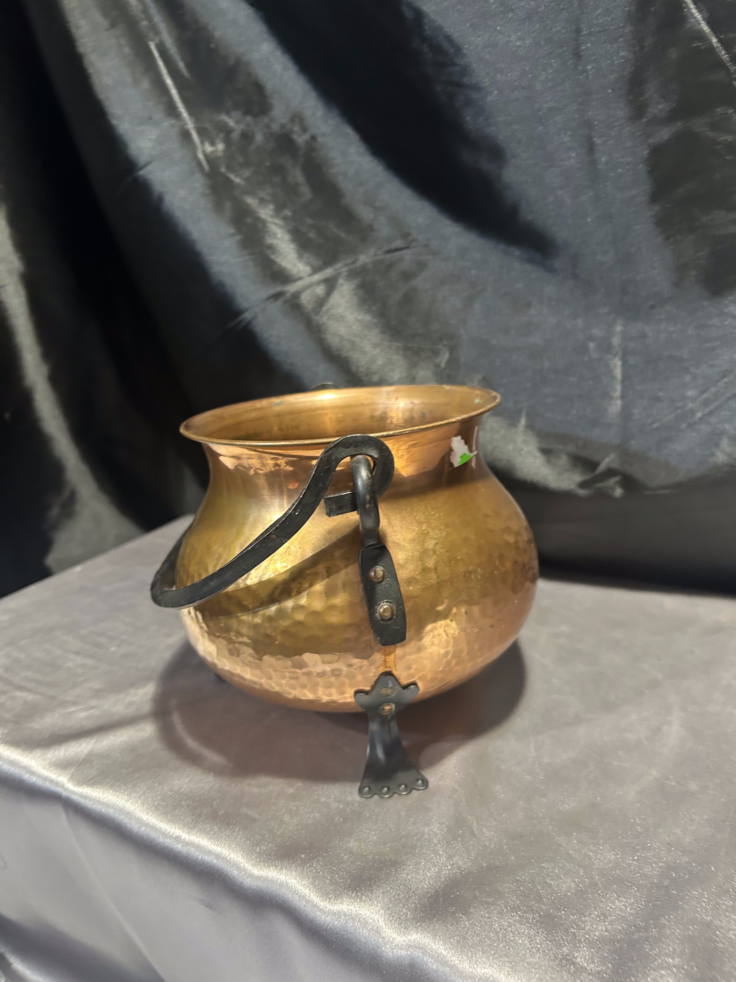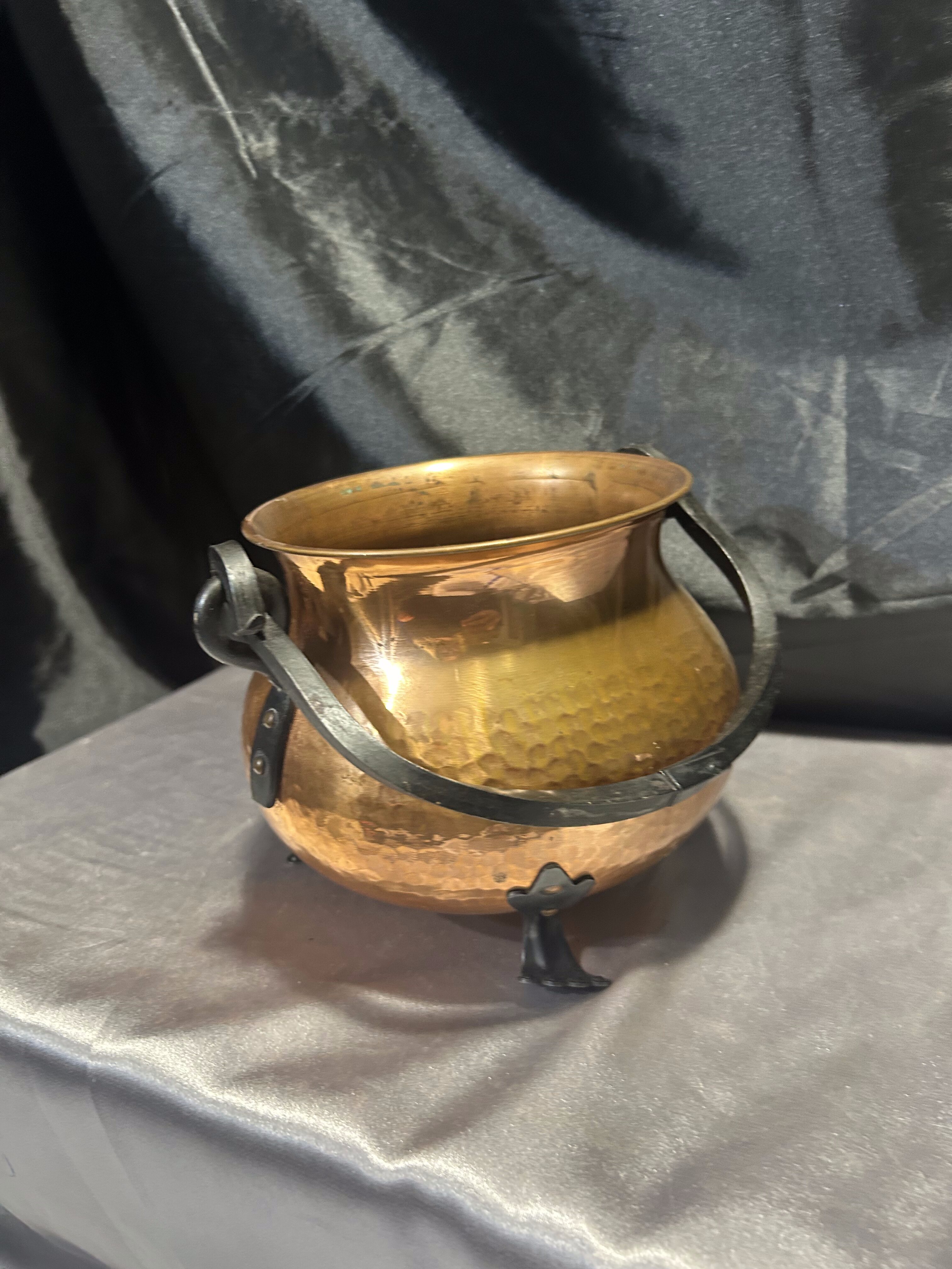 Na sprzedaż solidny miedziany kociołek wiedźmy, który doskonale sprawdzi się jako kwietnik, osłonka na doniczkę lub dekoracyjny pojemnik. Posiada kutą rączkę oraz kute nogi, co nadaje mu wyjątkowego, rustykalnego charakteru. Jego solidna konstrukcja i klasyczna forma sprawiają, że idealnie pasuje do wnętrz w stylu vintage, rustykalnym, gotyckim lub klasycznym.