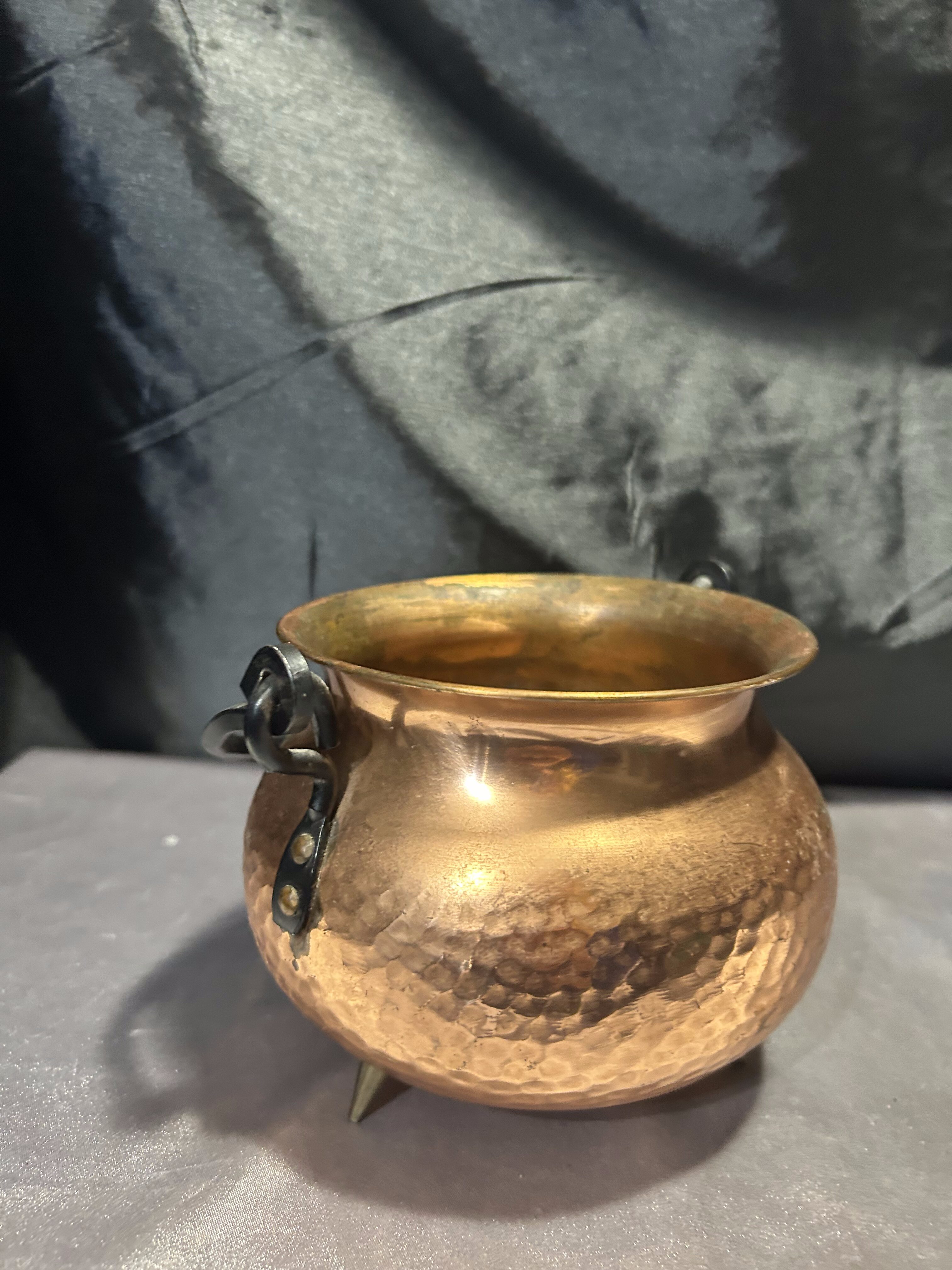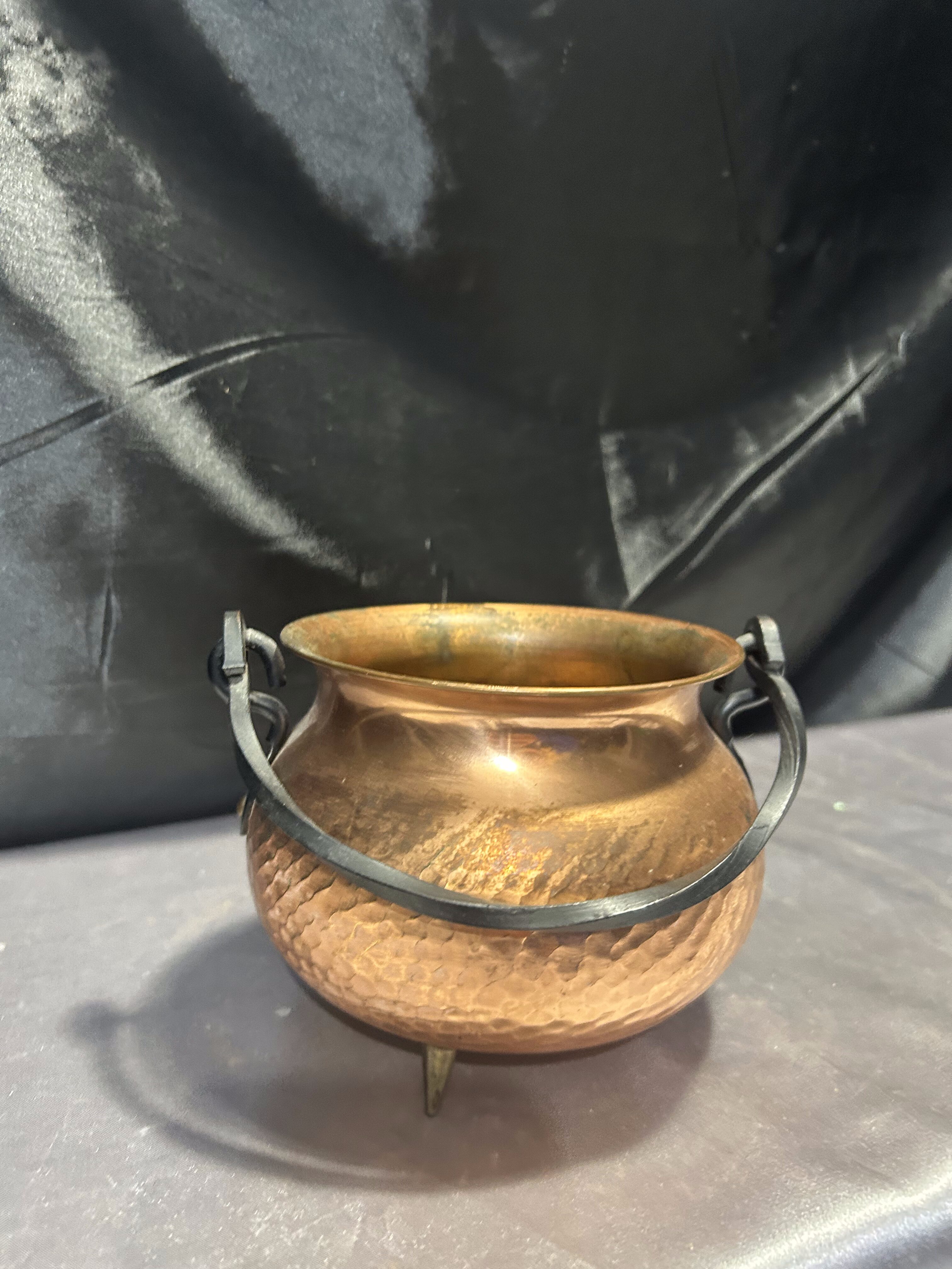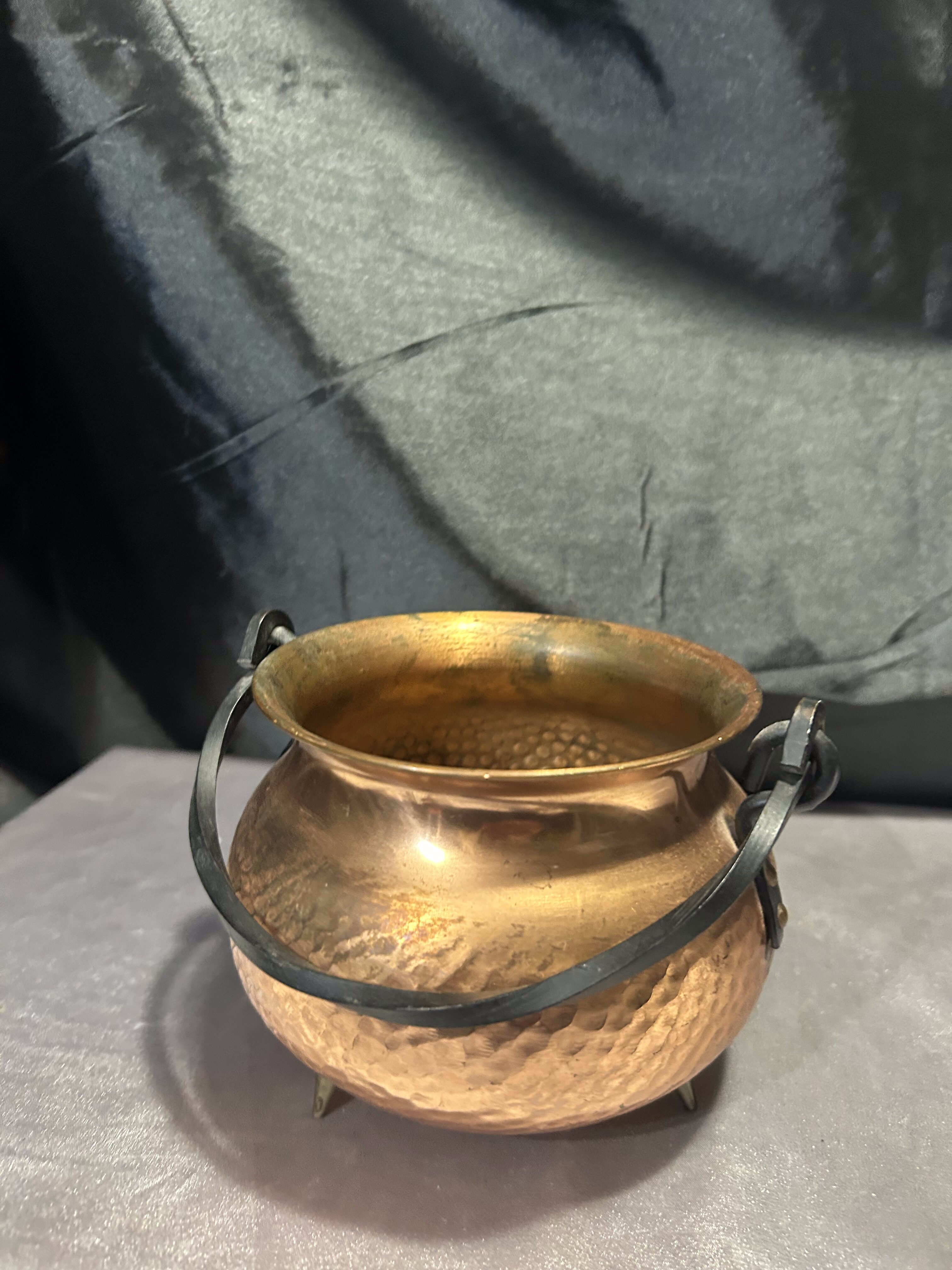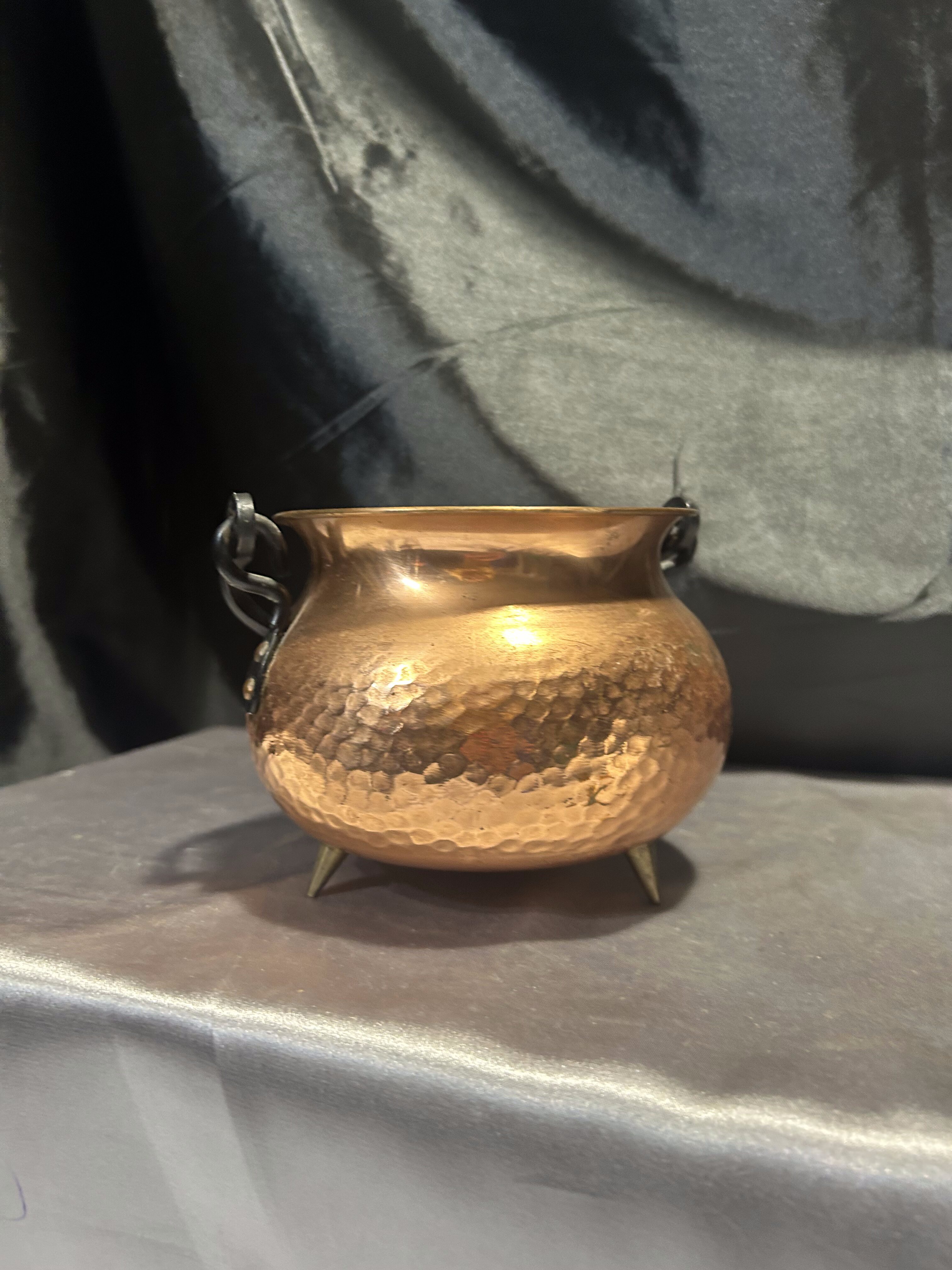 Na sprzedaż miedziany młotkowany kociołek wiedźmy, który zachwyca kutą rączką oraz trzema solidnymi mosiężnymi nogami. Jego wyjątkowy charakter i staranne wykonanie sprawiają, że doskonale sprawdzi się jako kwietnik, osłonka na doniczkę lub dekoracyjny pojemnik.