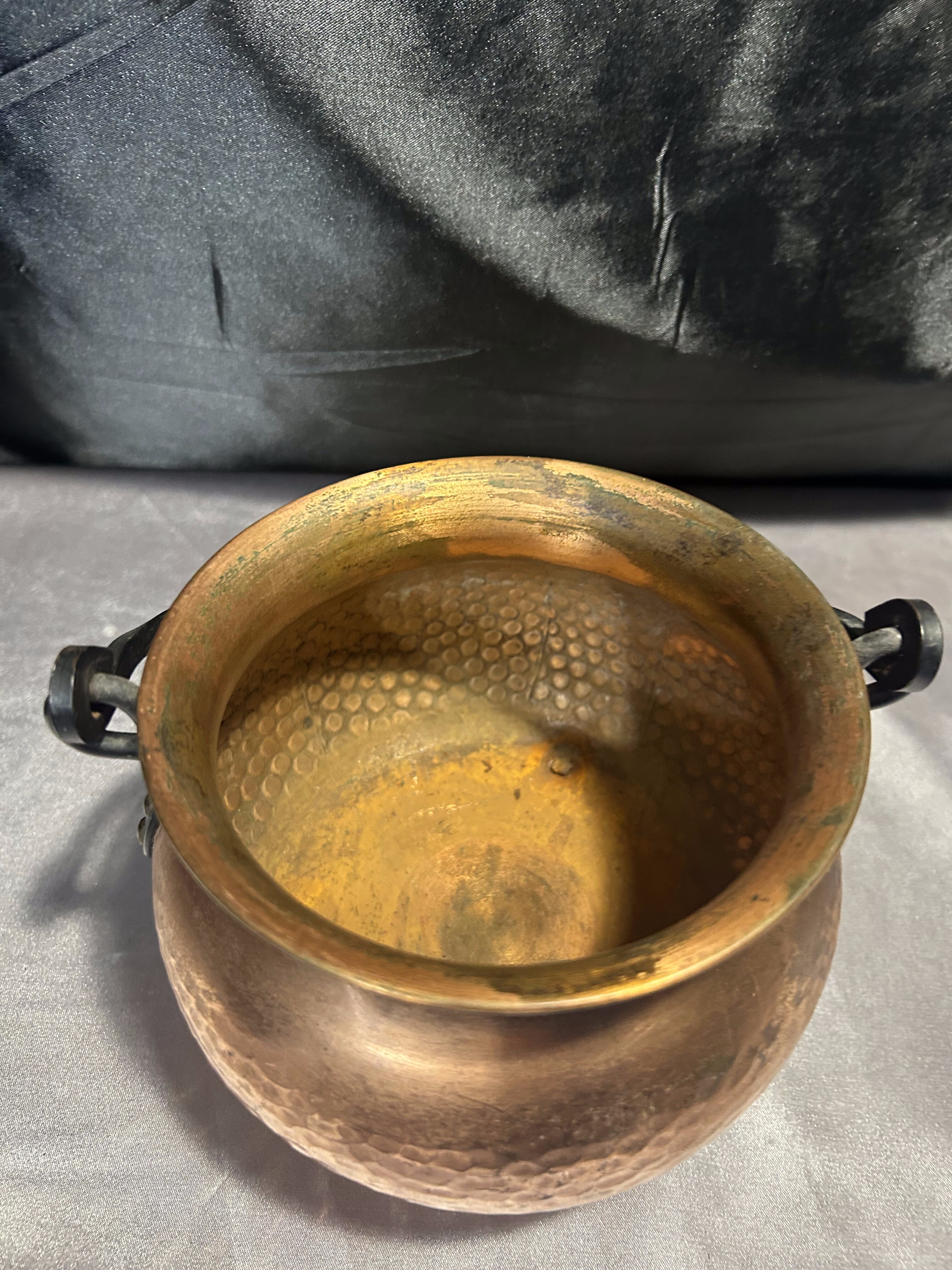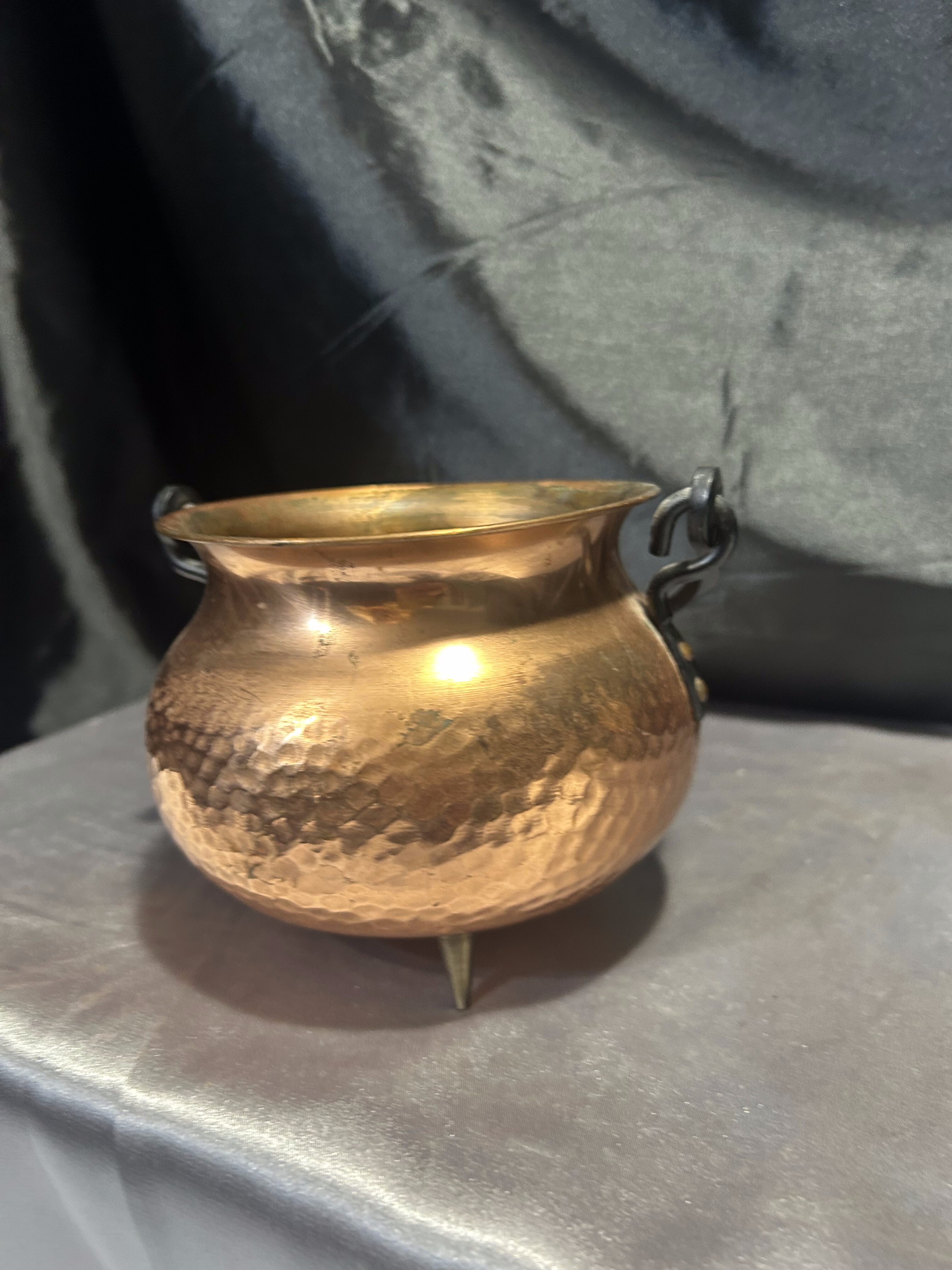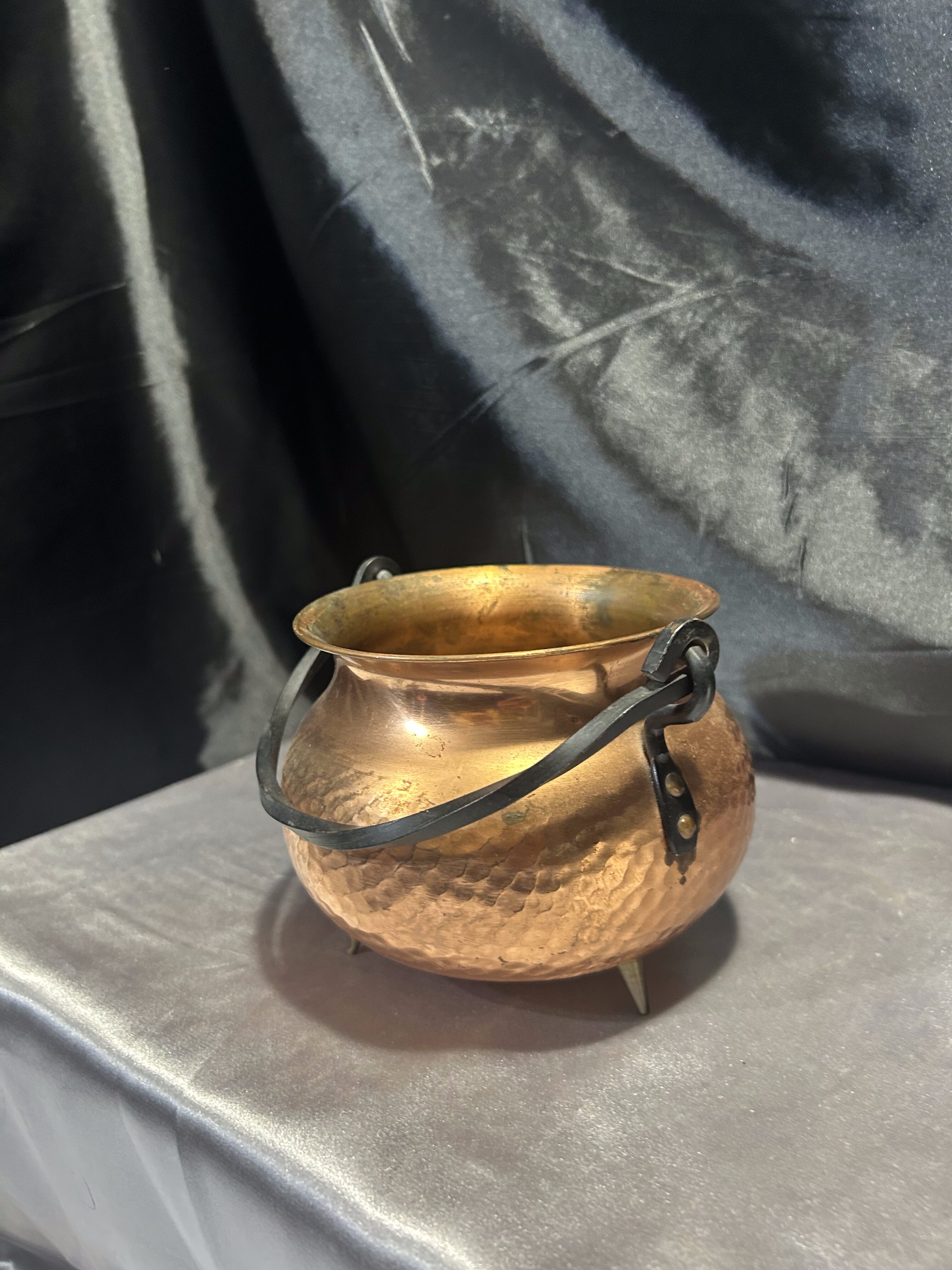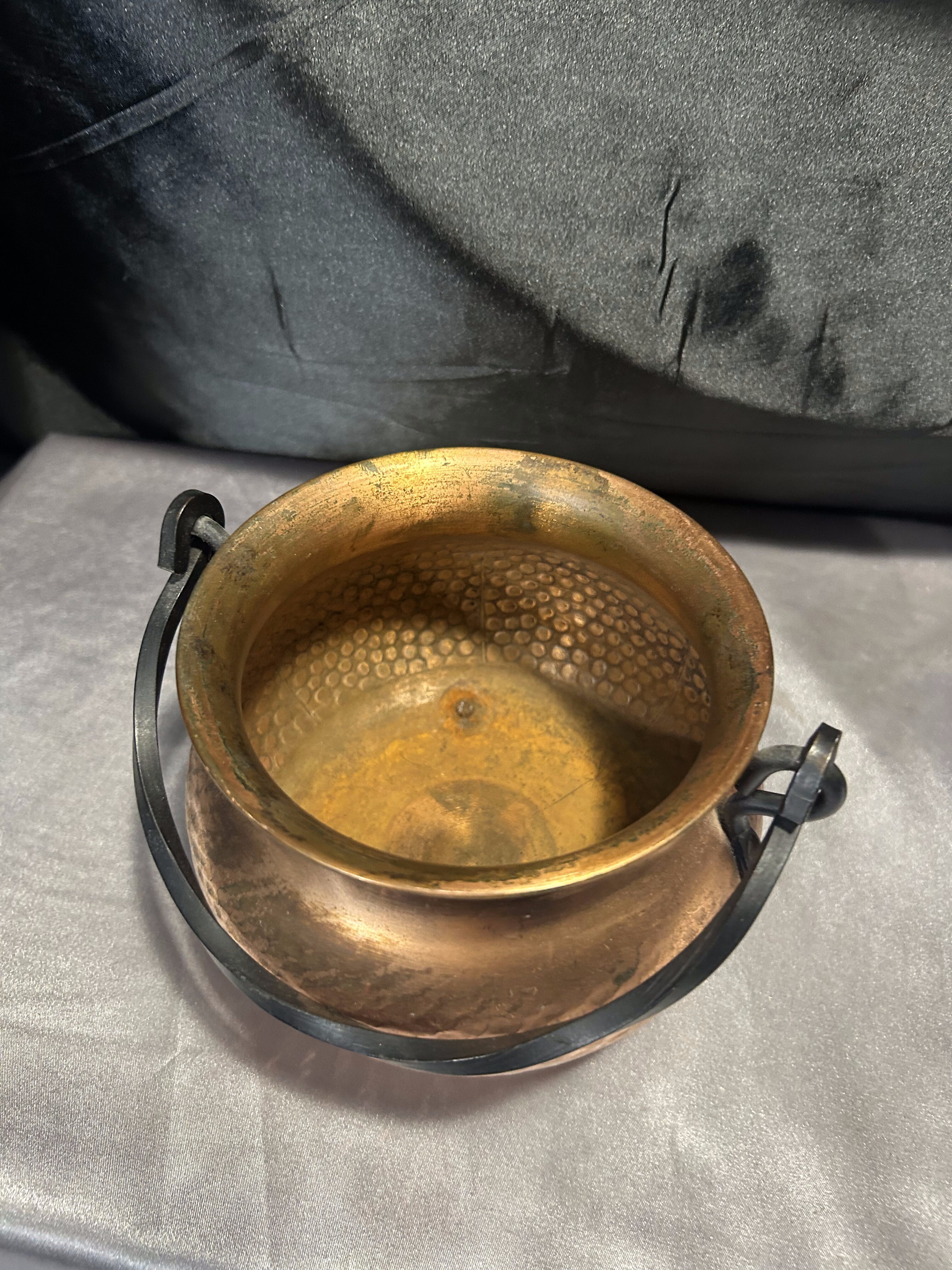 Na sprzedaż miedziany młotkowany kociołek wiedźmy, który zachwyca kutą rączką oraz trzema solidnymi mosiężnymi nogami. Jego wyjątkowy charakter i staranne wykonanie sprawiają, że doskonale sprawdzi się jako kwietnik, osłonka na doniczkę lub dekoracyjny pojemnik.