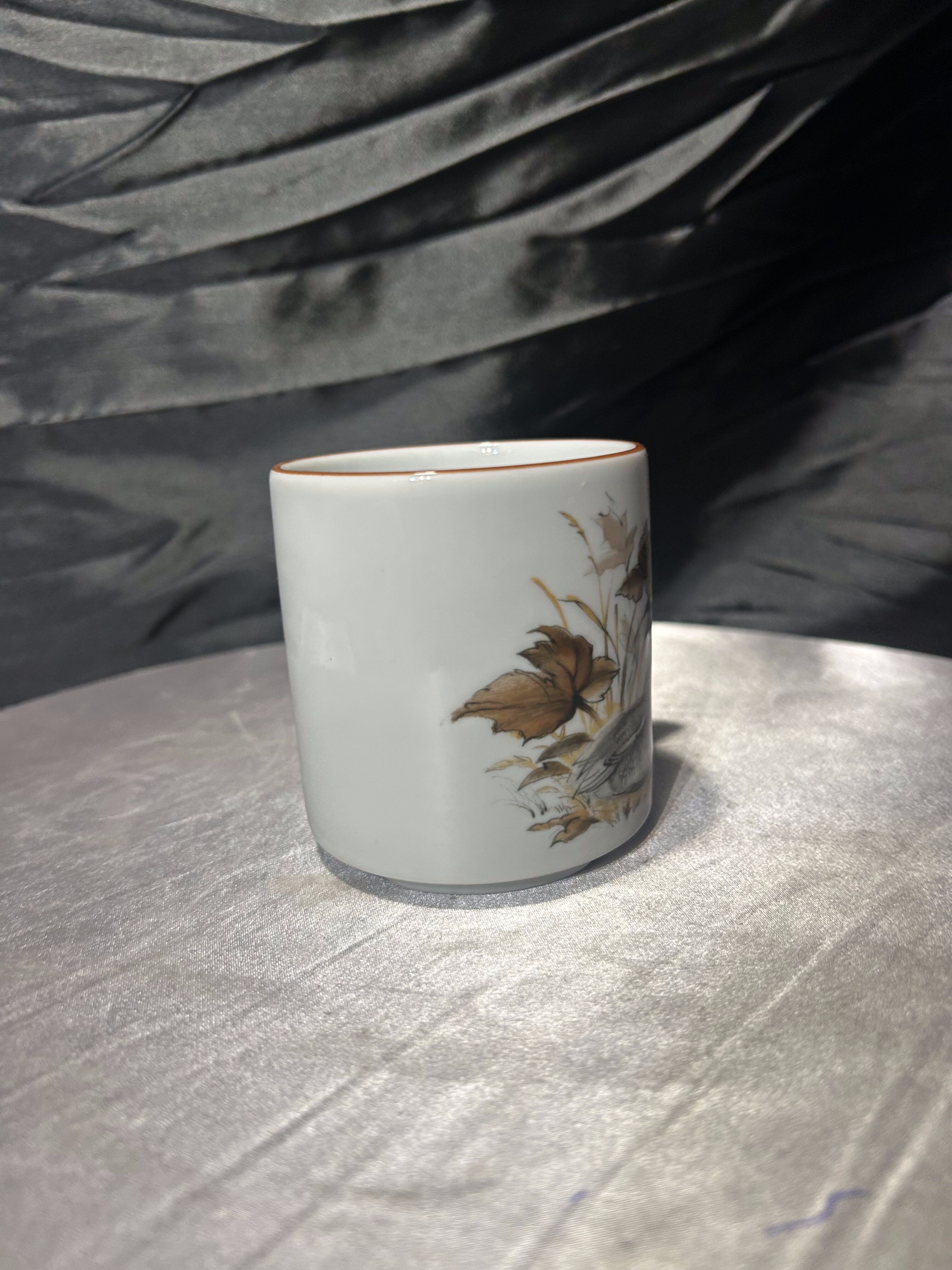 Przedmiotem oferty jest przepiękny kubek kolekcjonerski wykonany z najwyższej jakości białej porcelany przez renomowaną niemiecką manufakturę Seltmann Weiden. Kubek zdobi realistyczna, malarska grafika przedstawiająca kaczki w ich naturalnym środowisku, otoczone jesiennymi liśćmi. Ta sama, pełna detali kompozycja znajduje się po obu stronach naczynia, co sprawia, że prezentuje się ono doskonale z każdej perspektywy. Delikatna, brązowa linia na rancie dodaje mu elegancji i klasycznego sznytu. Jest to przedmiot, który łączy w sobie walory użytkowe z wysoką klasą artystyczną, idealny dla kolekcjonerów porcelany tematycznej oraz miłośników natury.