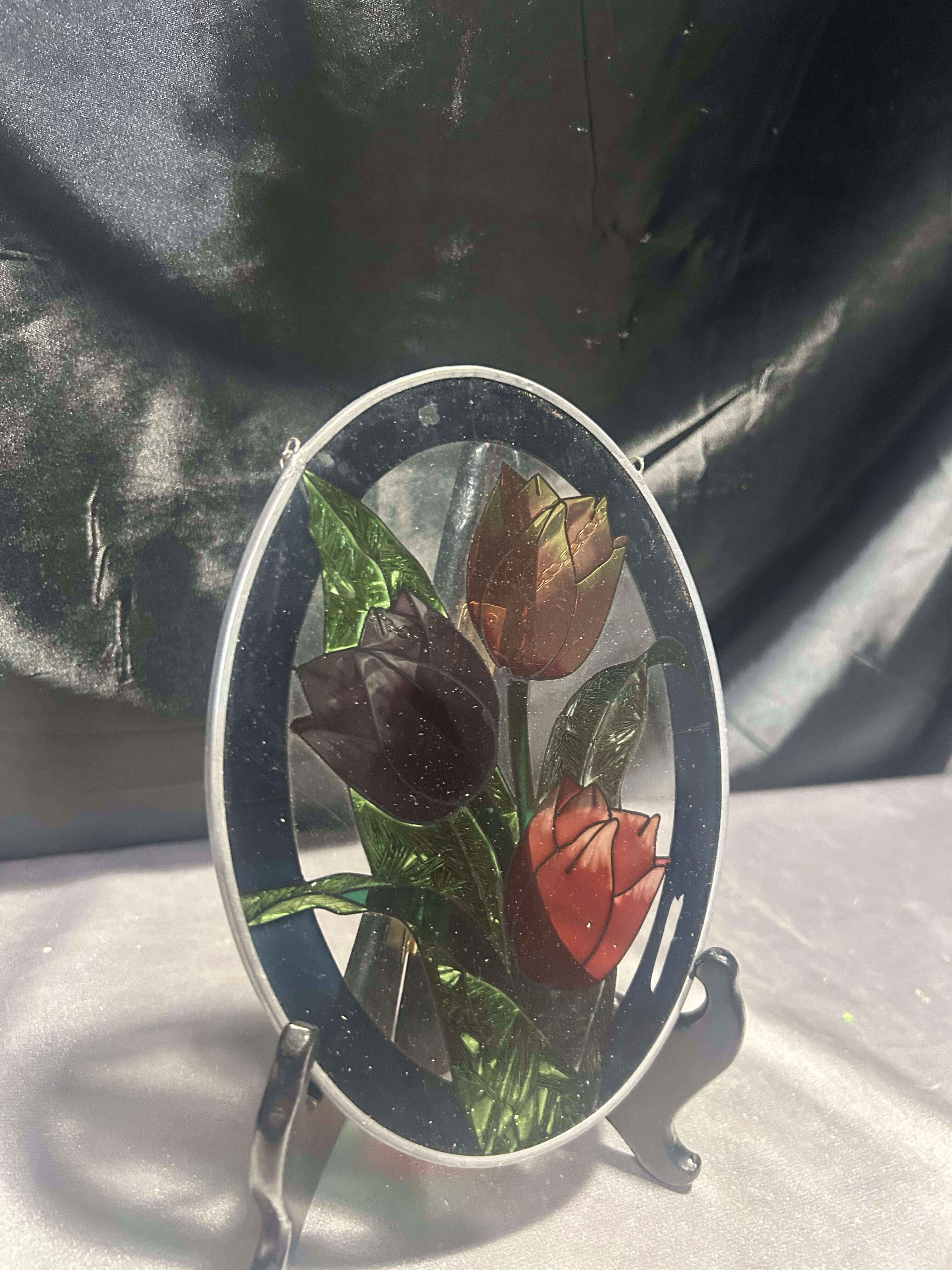 Kolorowy Witraż Szklany – 3 Tulipany – Owalny – Na Łańcuszku do Zawieszenia