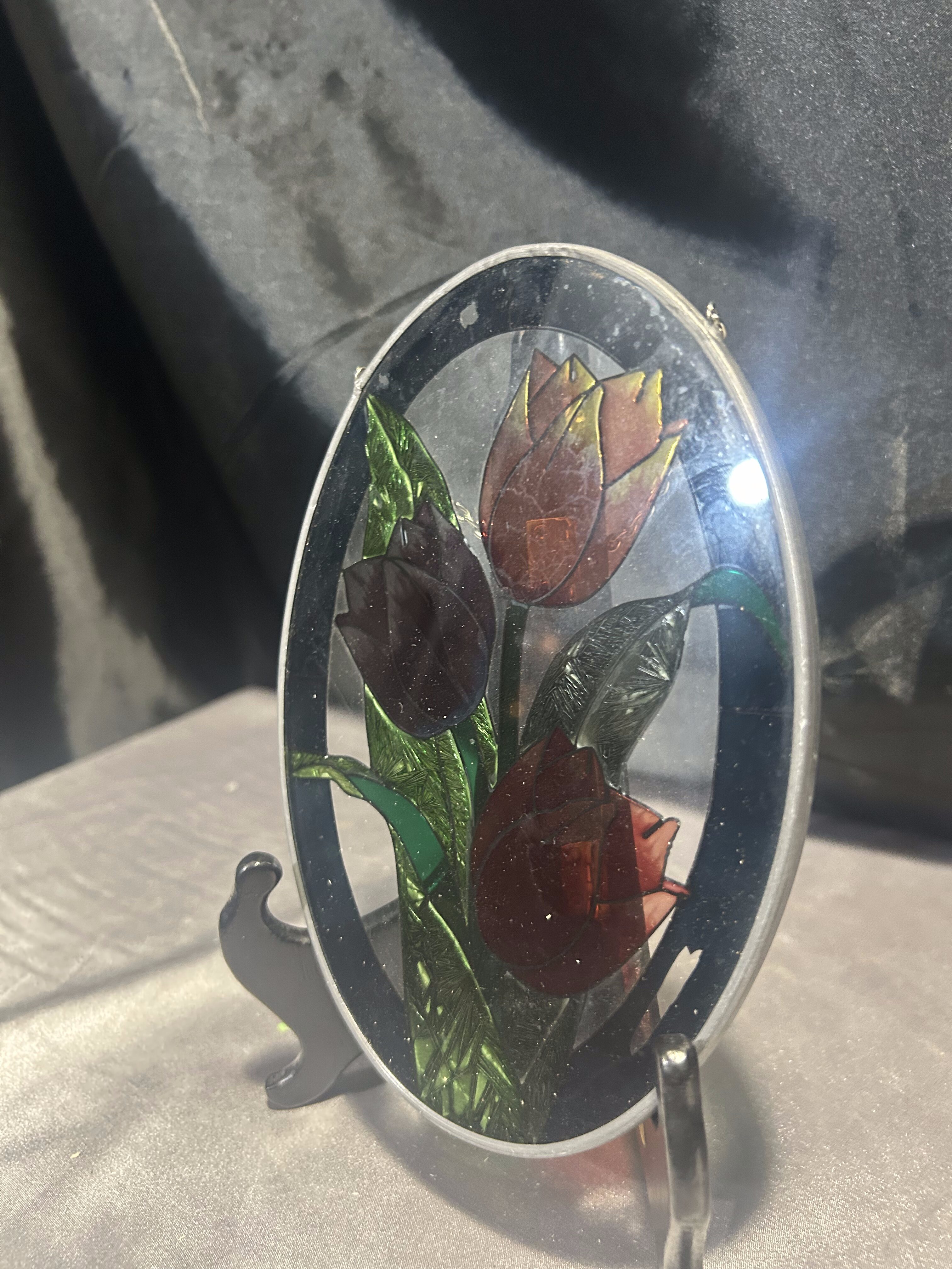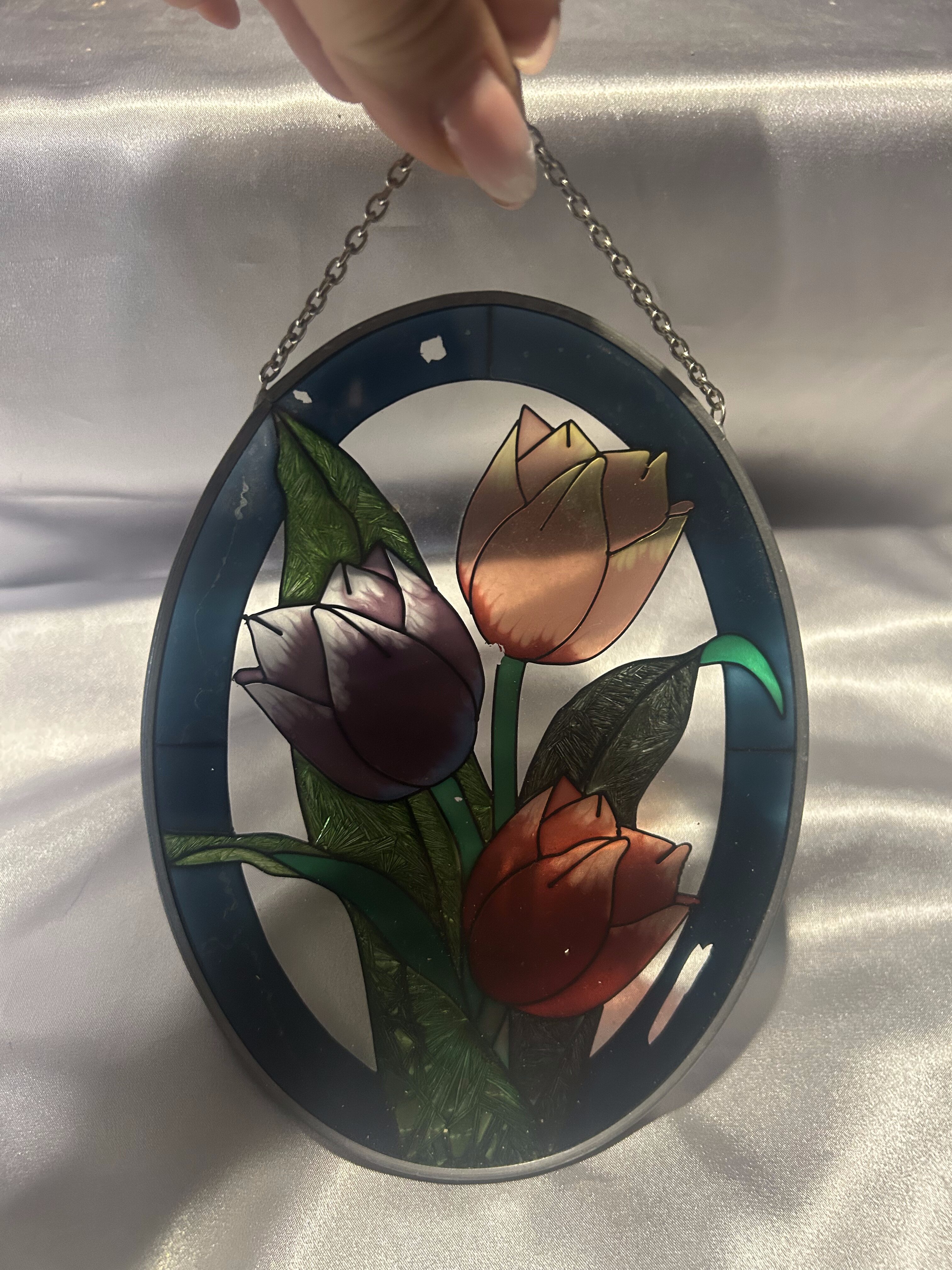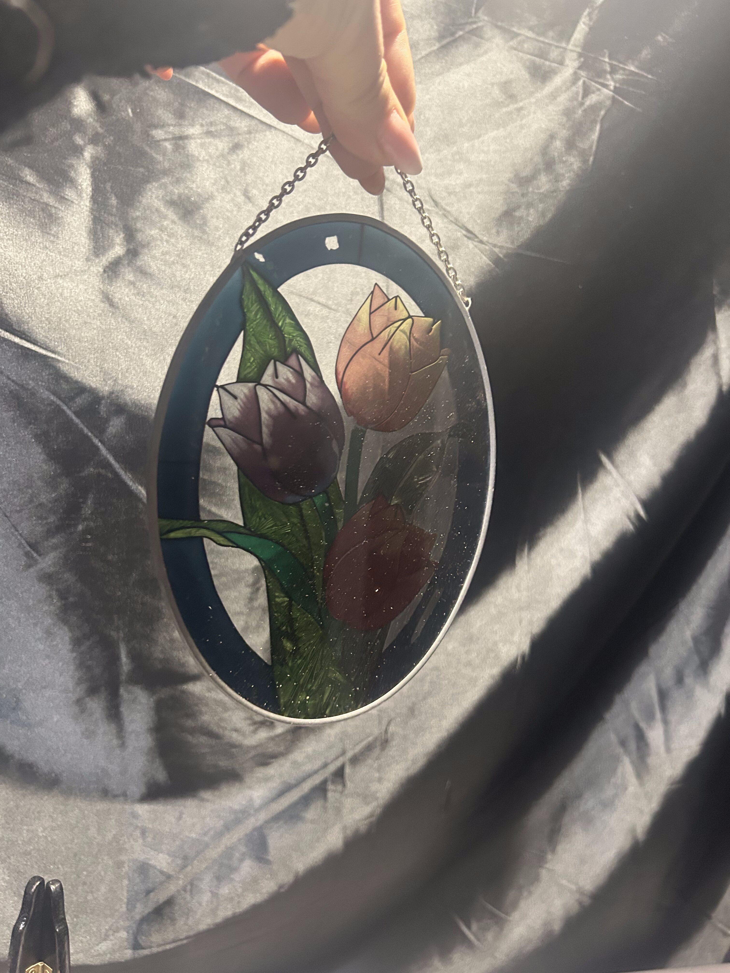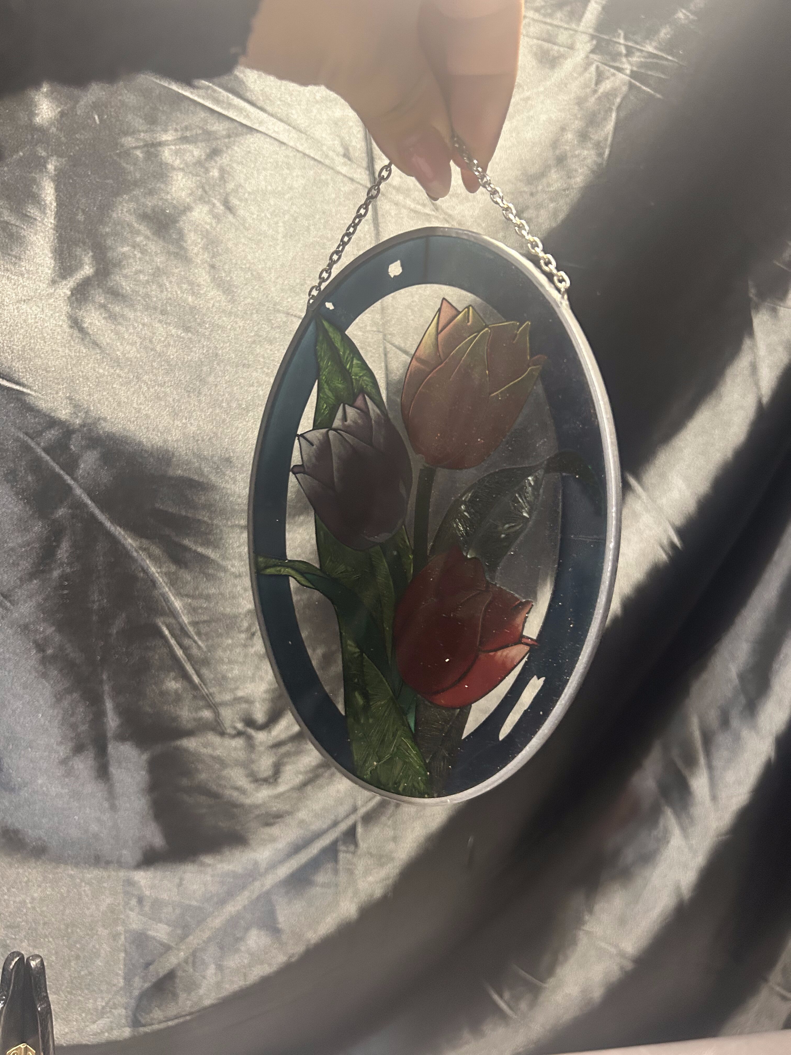 Na sprzedaż piękny, owalny witraż szklany przedstawiający trzy kolorowe tulipany, oprawiony w metal o srebrnym kolorze. Witraż zawieszony jest na delikatnym łańcuszku, dzięki czemu idealnie nadaje się do ekspozycji w oknie, gdzie światło podkreśla jego intensywne barwy i efektowne detale.