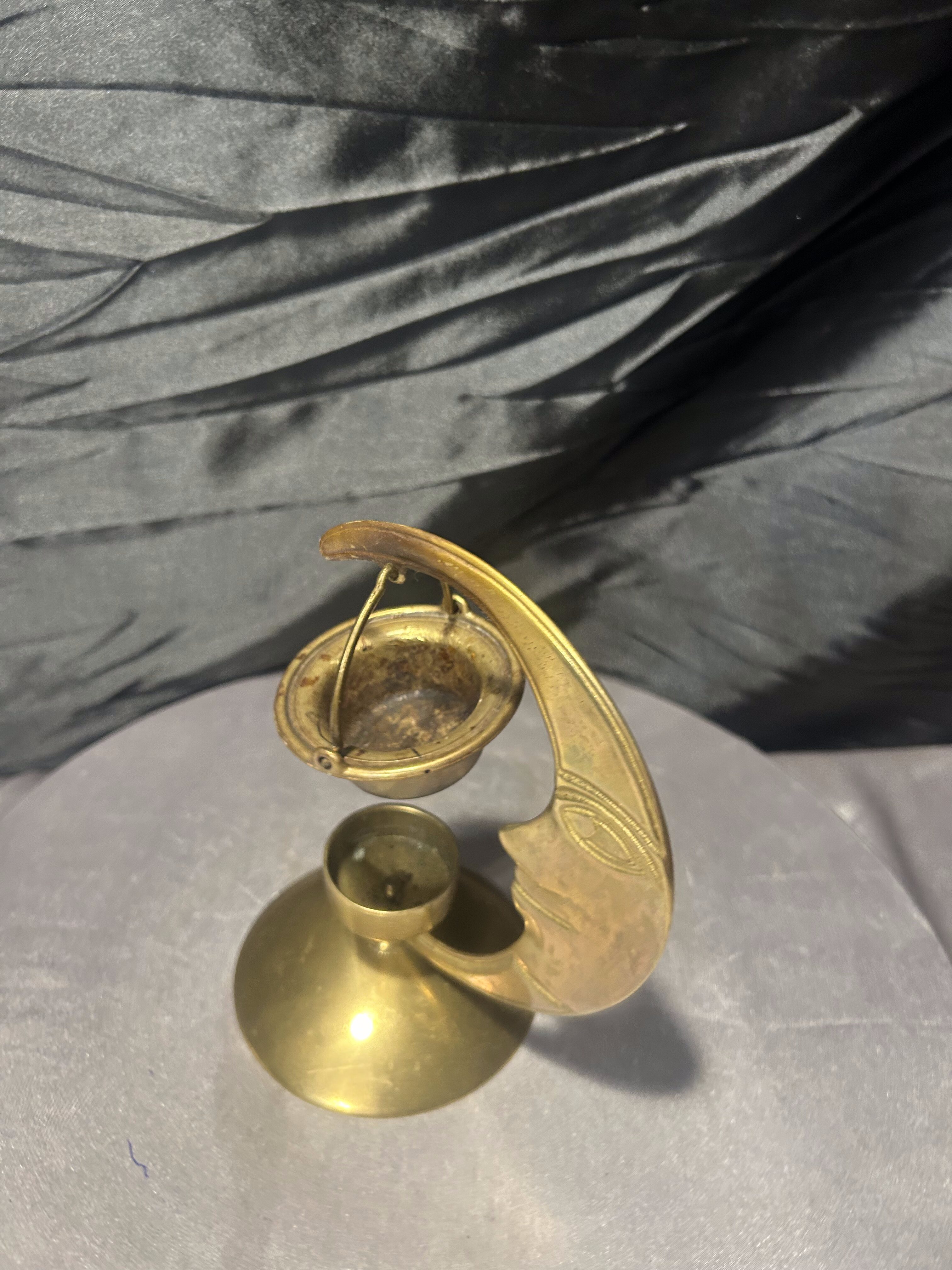 Wyjątkowy kominek zapachowy wykonany z mosiądzu, o niezwykle dekoracyjnej formie półksiężyca z wyraźnie zaznaczonym profilem twarzy. Przedmiot łączy funkcję użytkową z silnym walorem estetycznym, przyciągając uwagę niebanalnym wzornictwem i orientalnym charakterem.