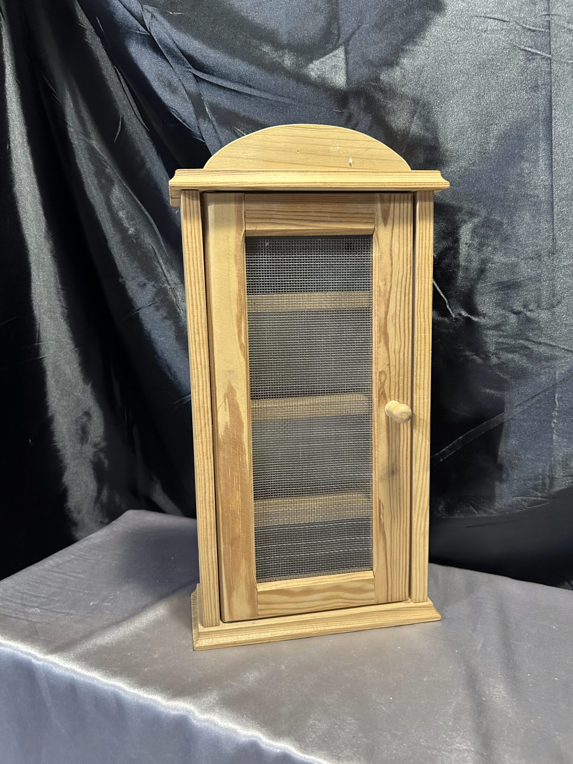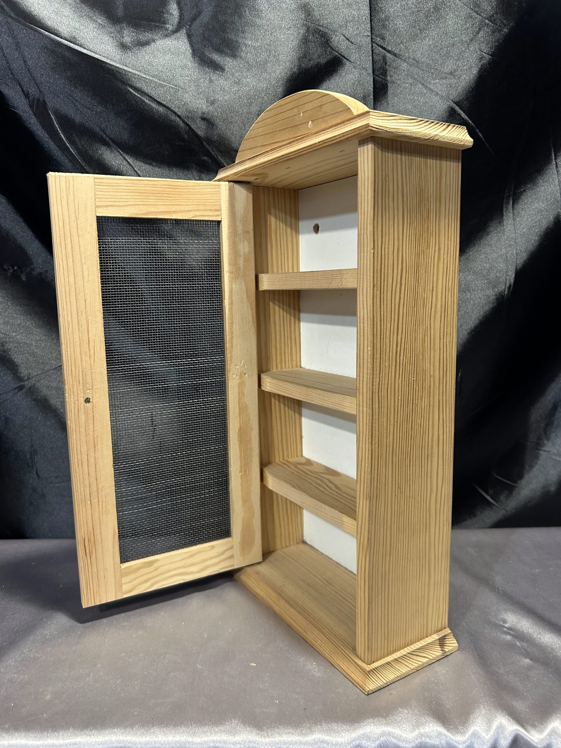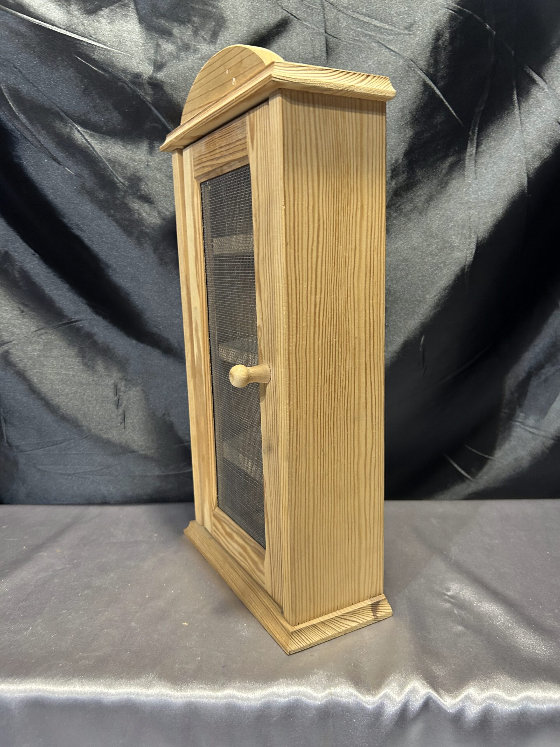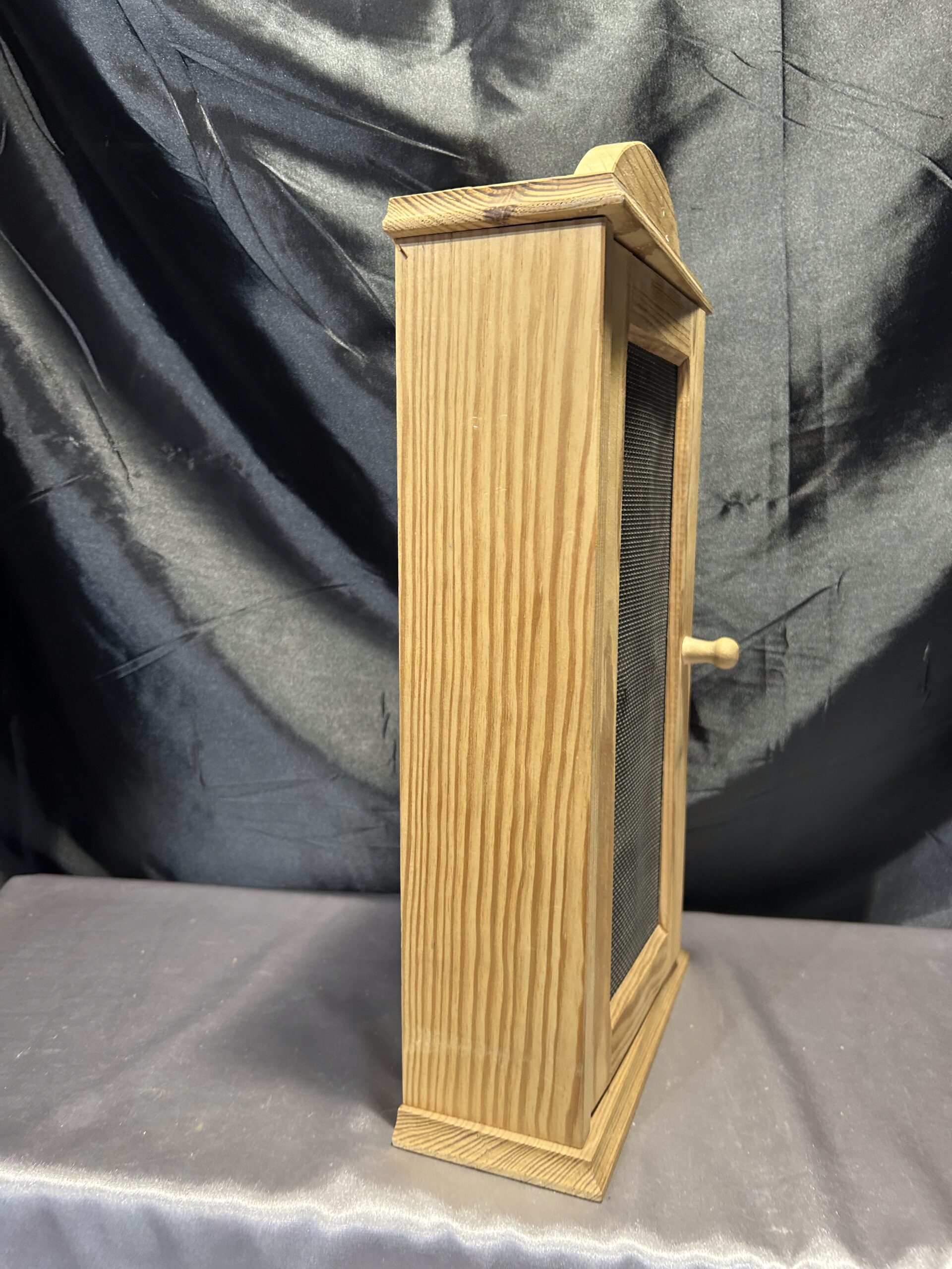 Materiały: sosnowe drewno, metalowa siatka w drzwiczkach