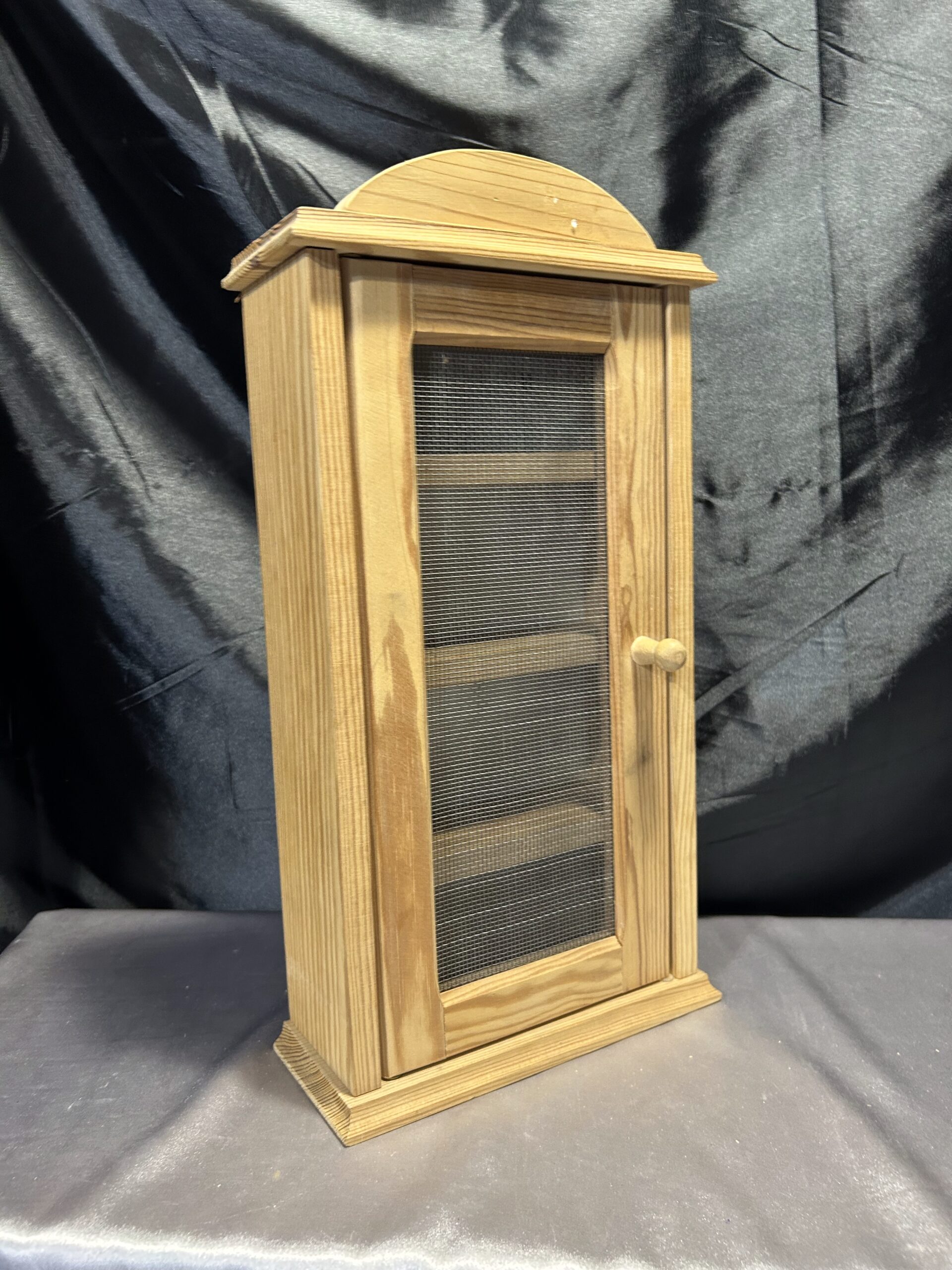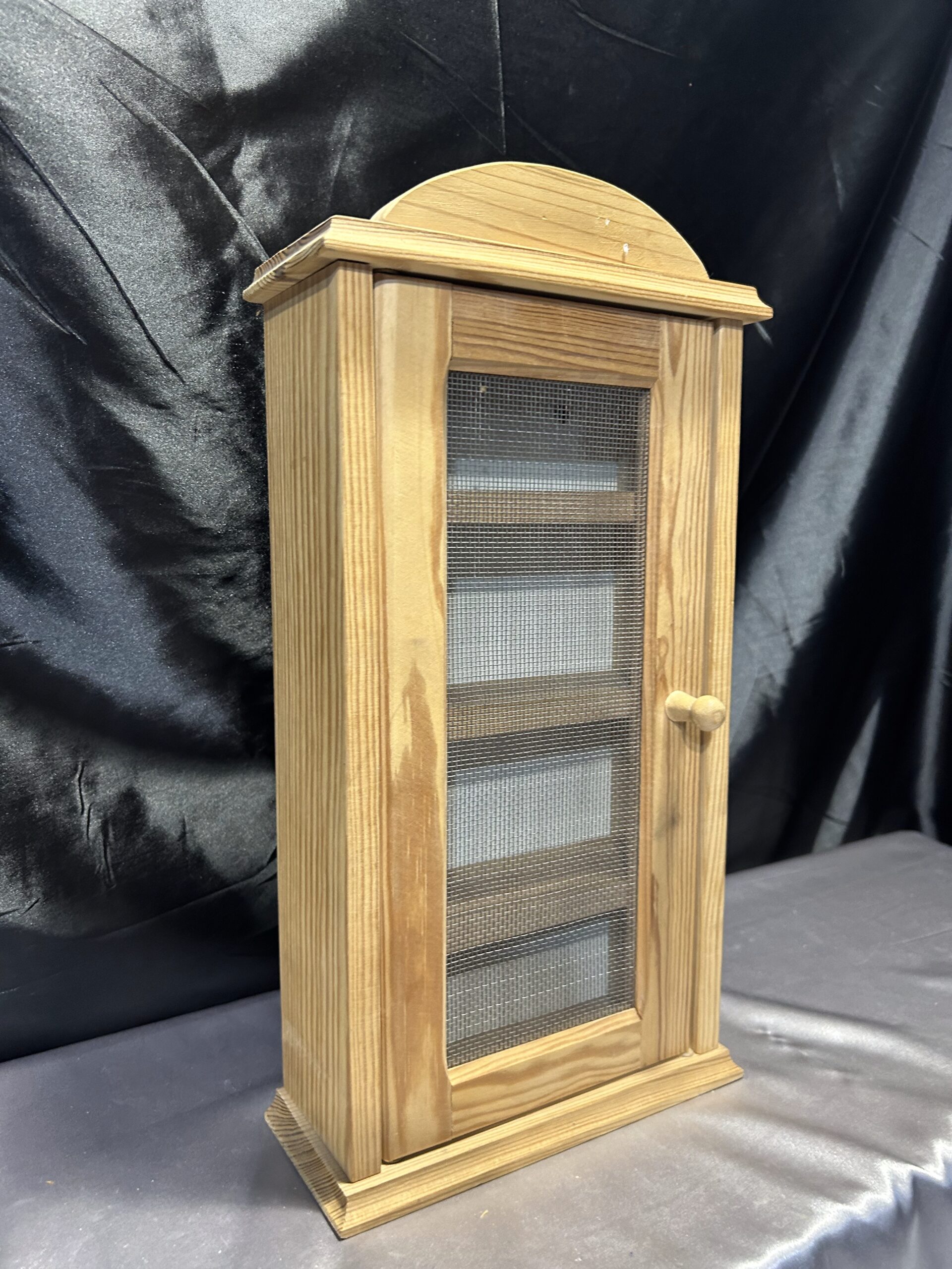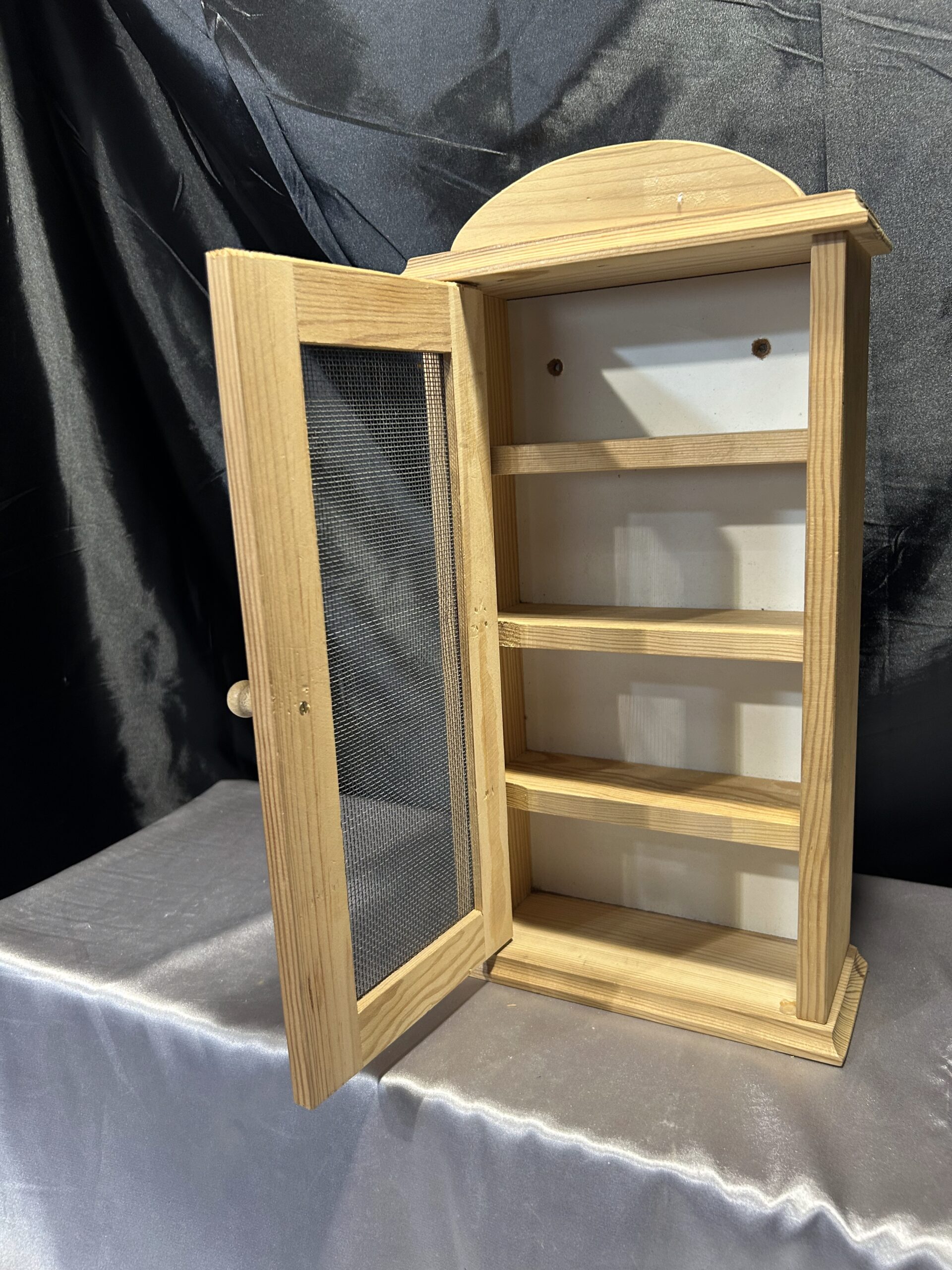 Materiały: sosnowe drewno, metalowa siatka w drzwiczkach