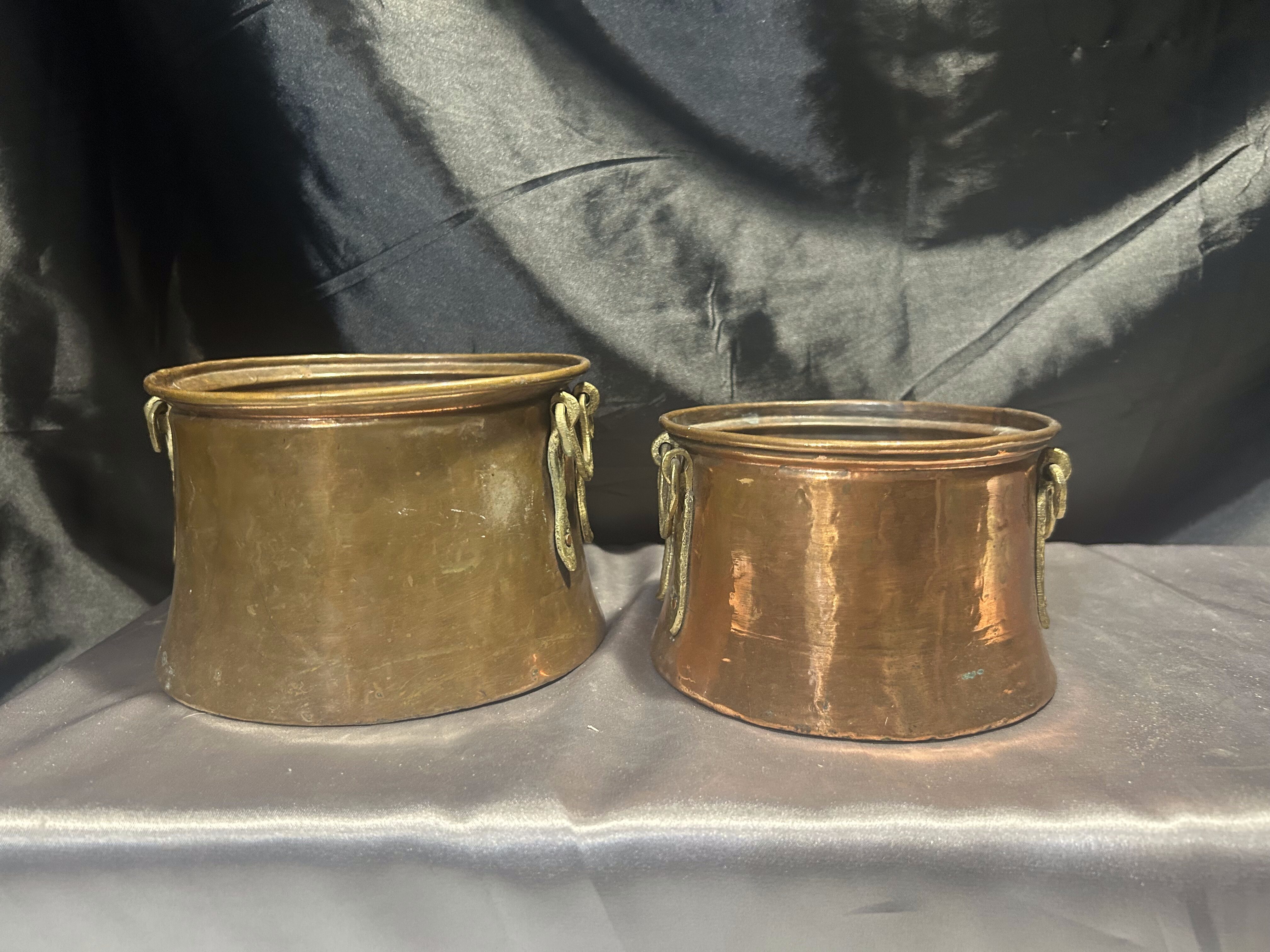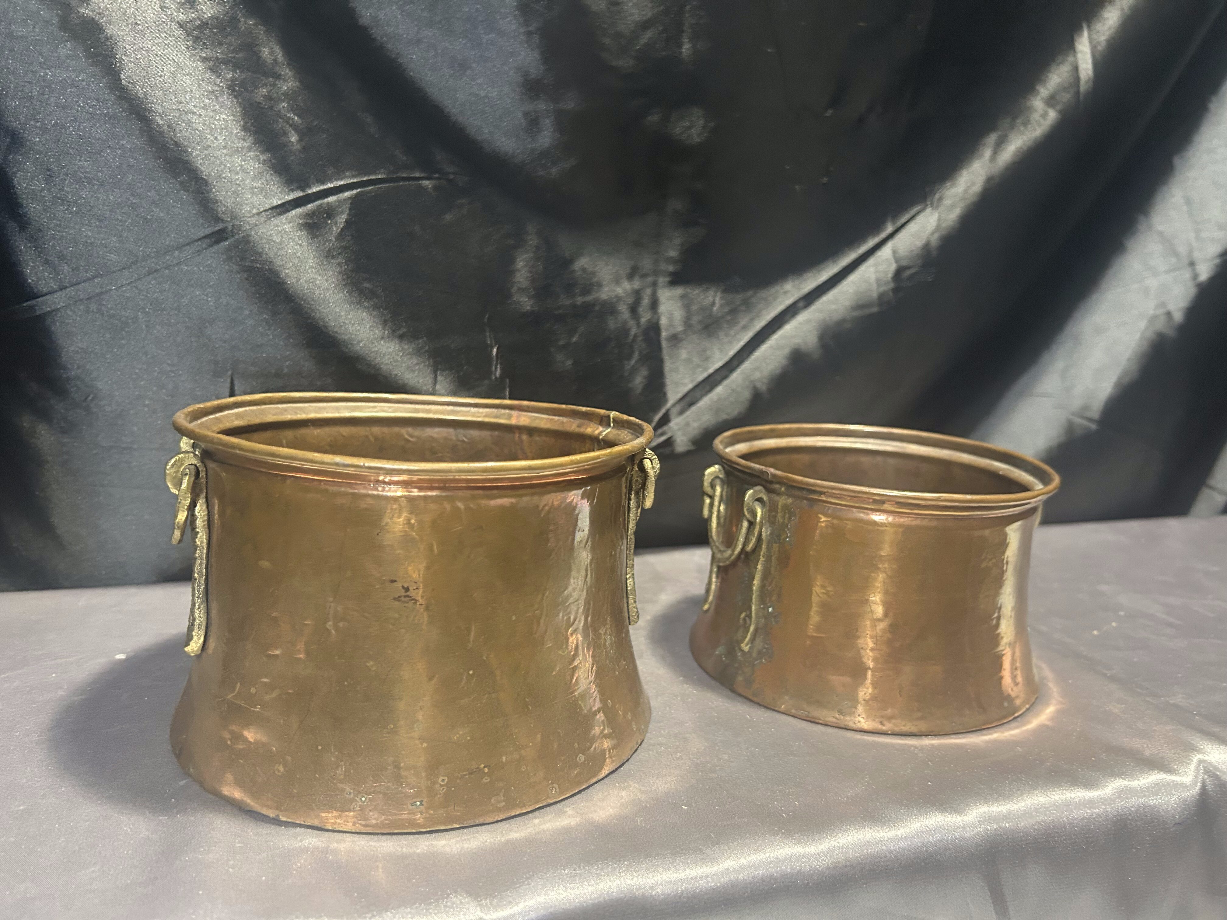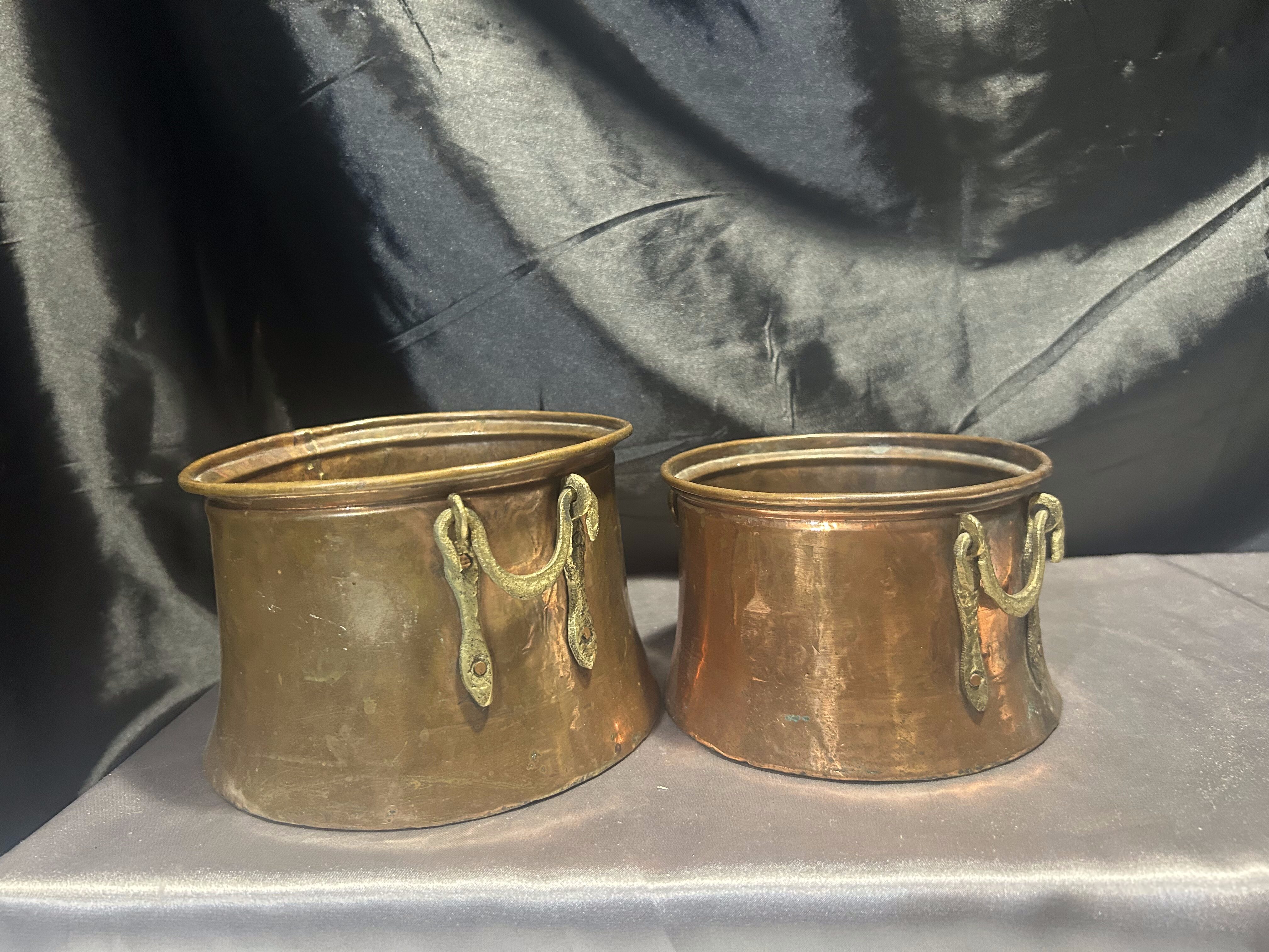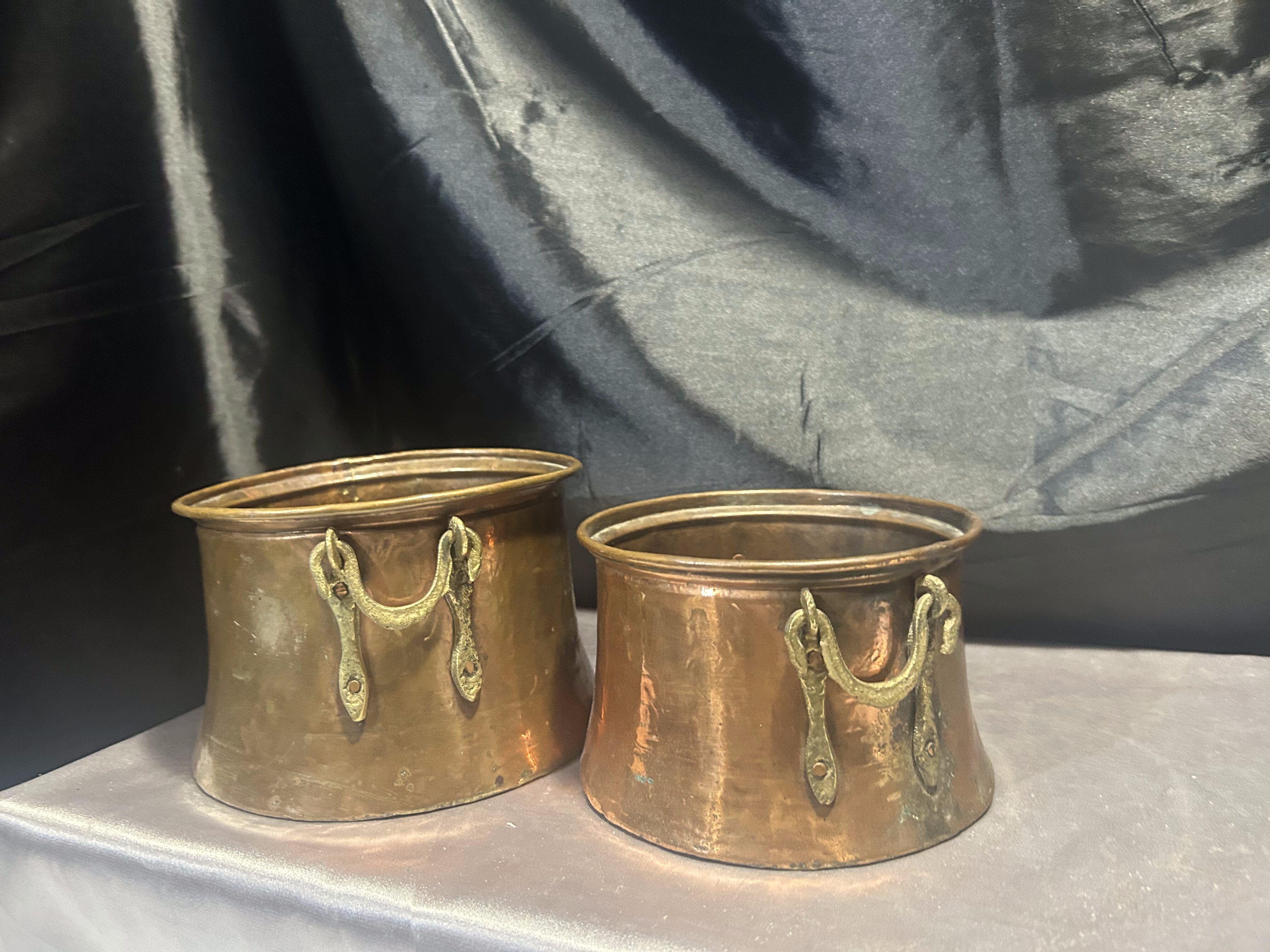 Na sprzedaż zestaw dwóch miedzianych kwietników z pięknymi, kutymi uchwytami z mosiądzu umieszczonymi po bokach. Kwietniki o dwóch różnych rozmiarach, doskonałe do tworzenia ciekawych kompozycji roślinnych. Wykonane solidnie, z charakterystyczną dla miedzi patyną, świetnie wpiszą się w styl rustykalny, retro czy prowansalski.