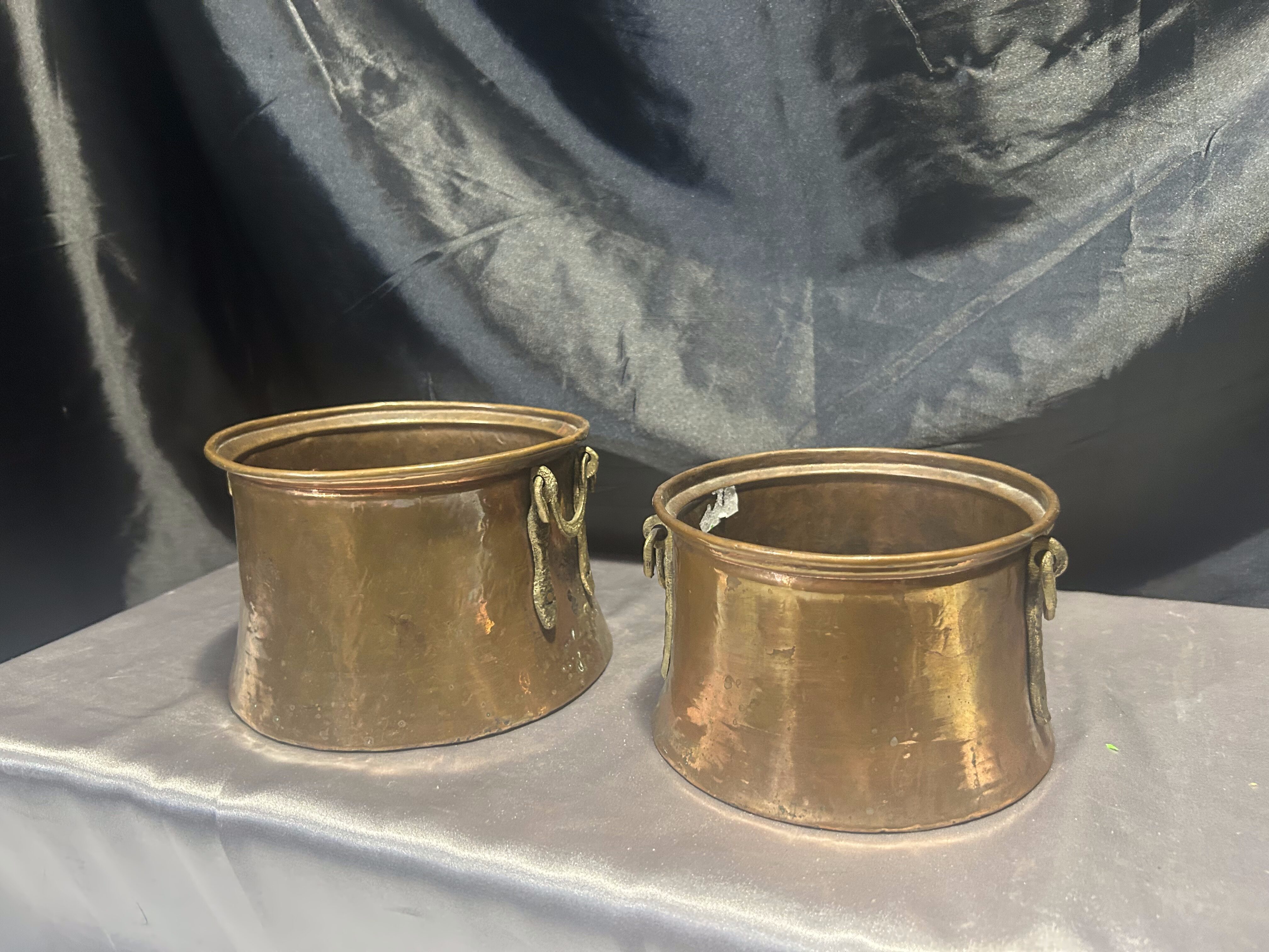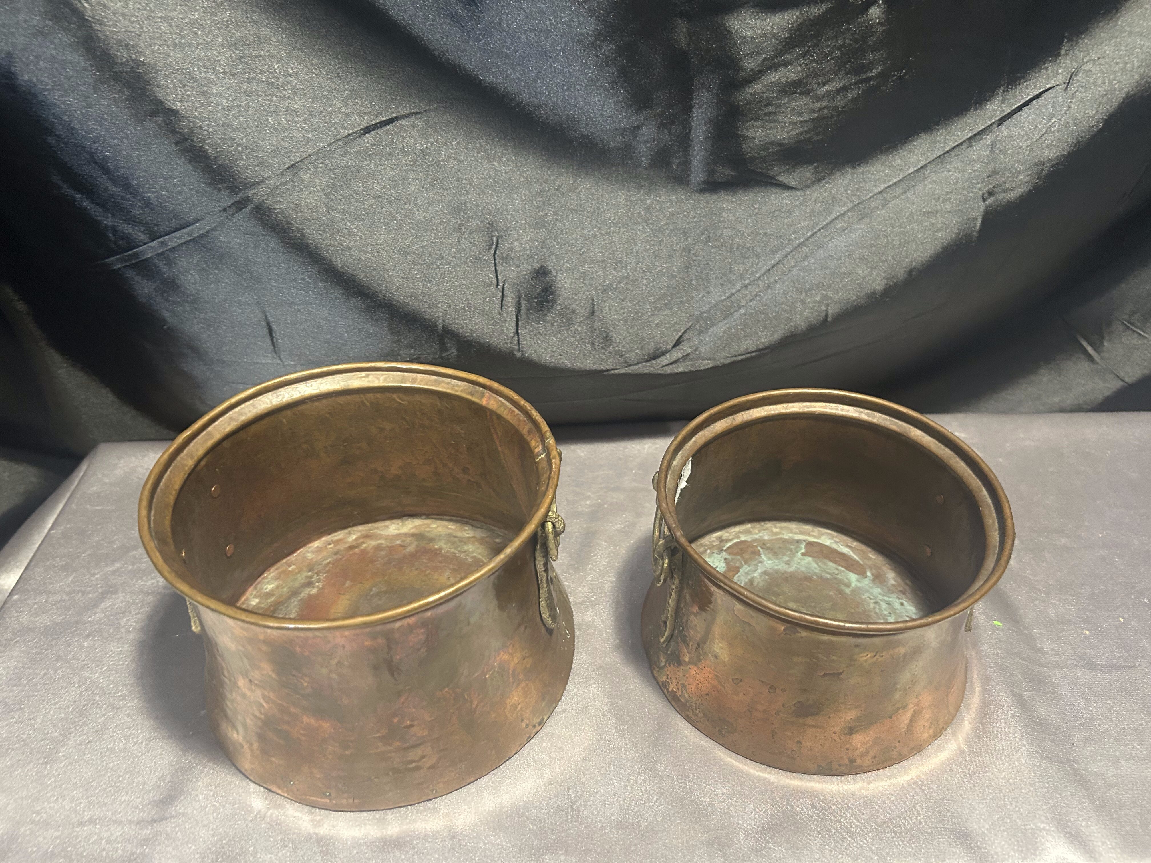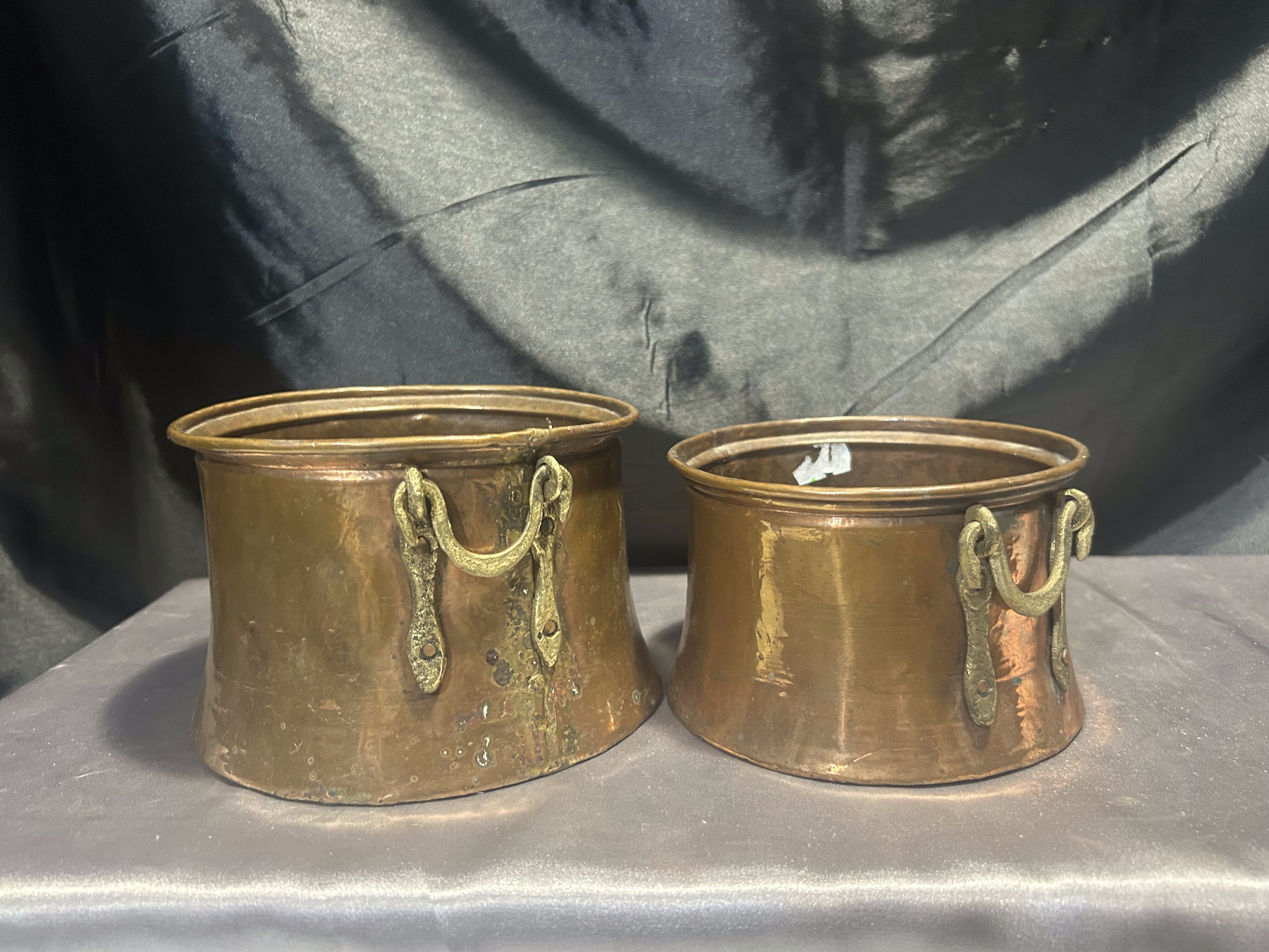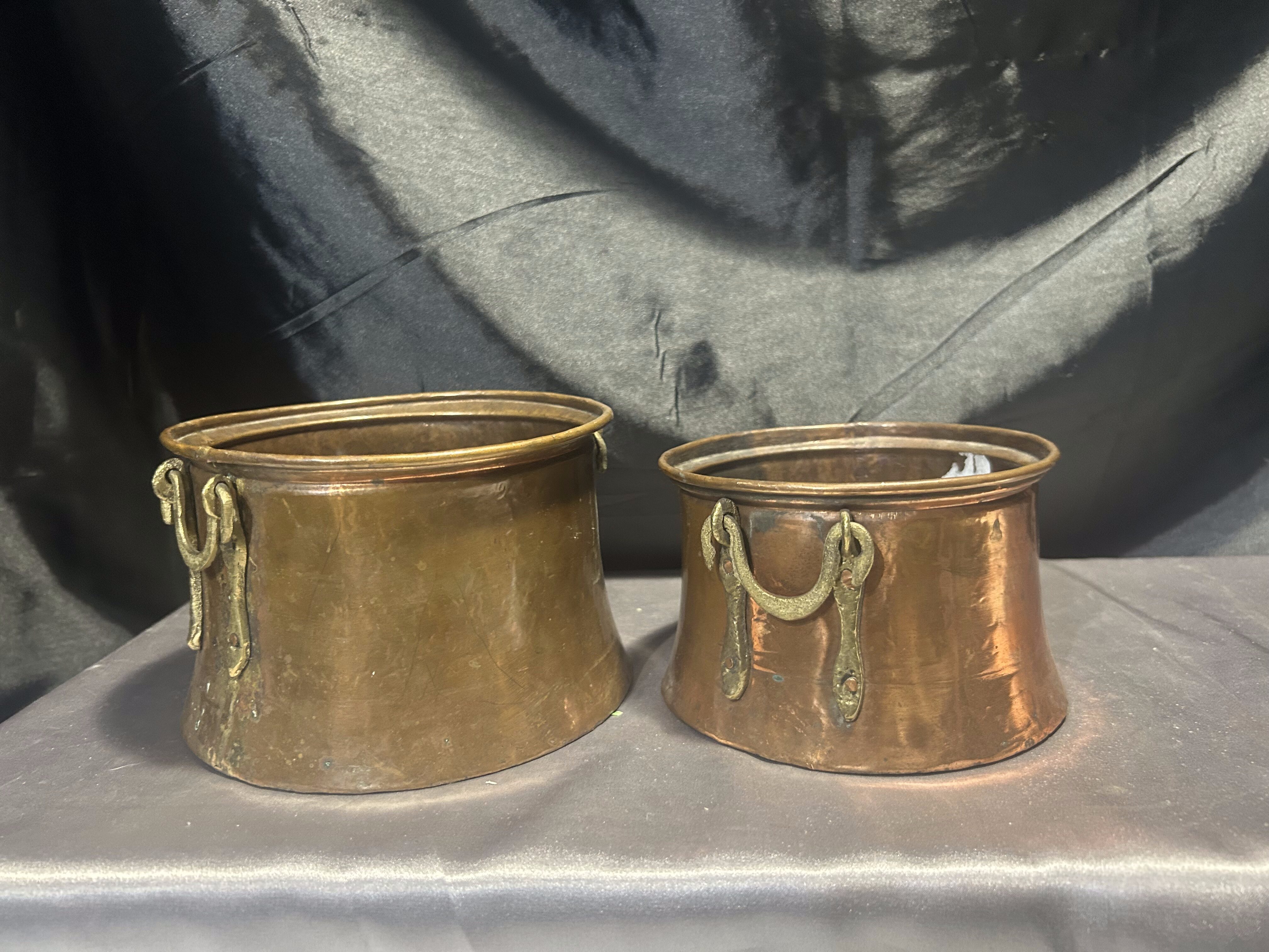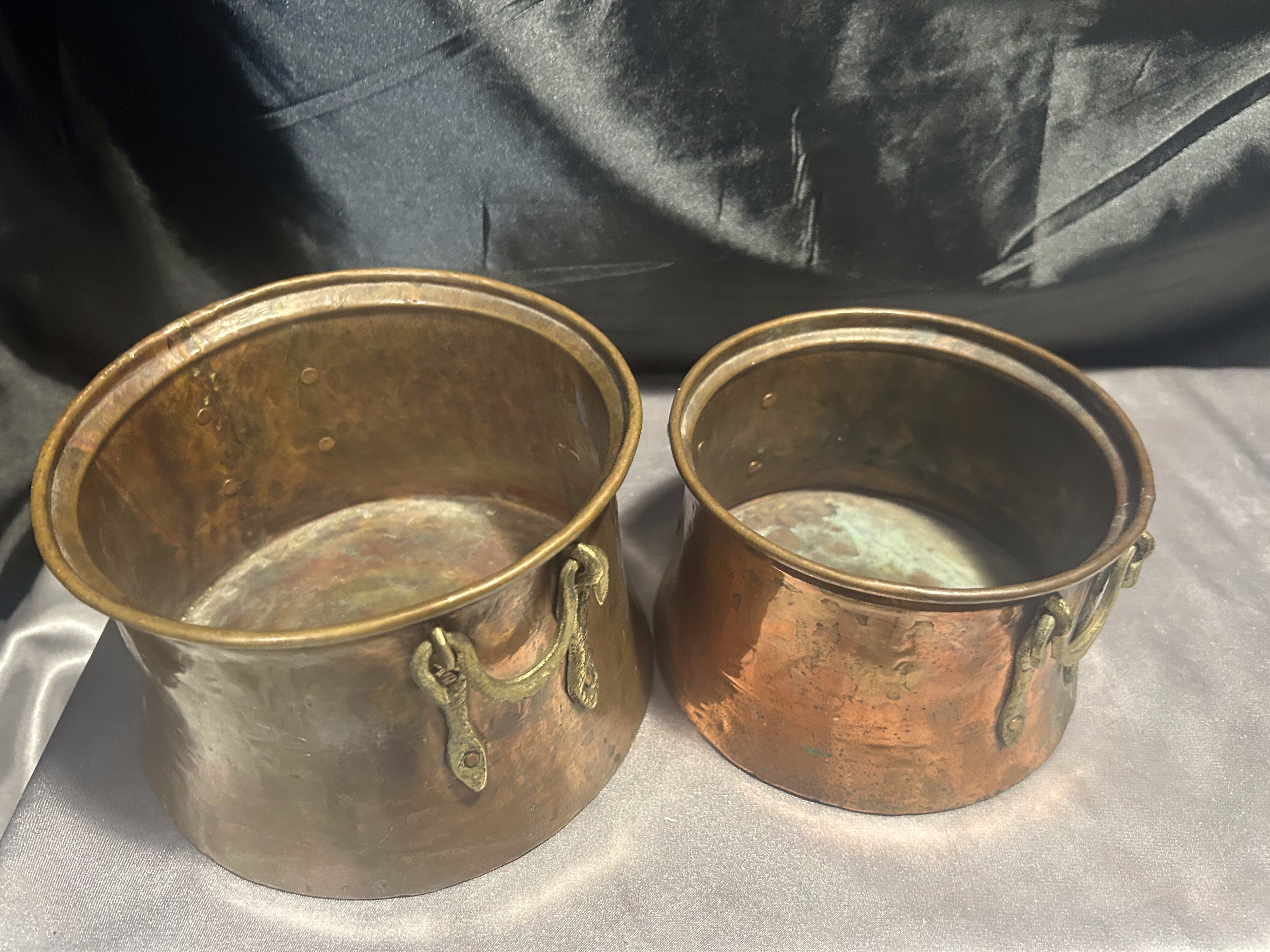 Na sprzedaż zestaw dwóch miedzianych kwietników z pięknymi, kutymi uchwytami z mosiądzu umieszczonymi po bokach. Kwietniki o dwóch różnych rozmiarach, doskonałe do tworzenia ciekawych kompozycji roślinnych. Wykonane solidnie, z charakterystyczną dla miedzi patyną, świetnie wpiszą się w styl rustykalny, retro czy prowansalski.