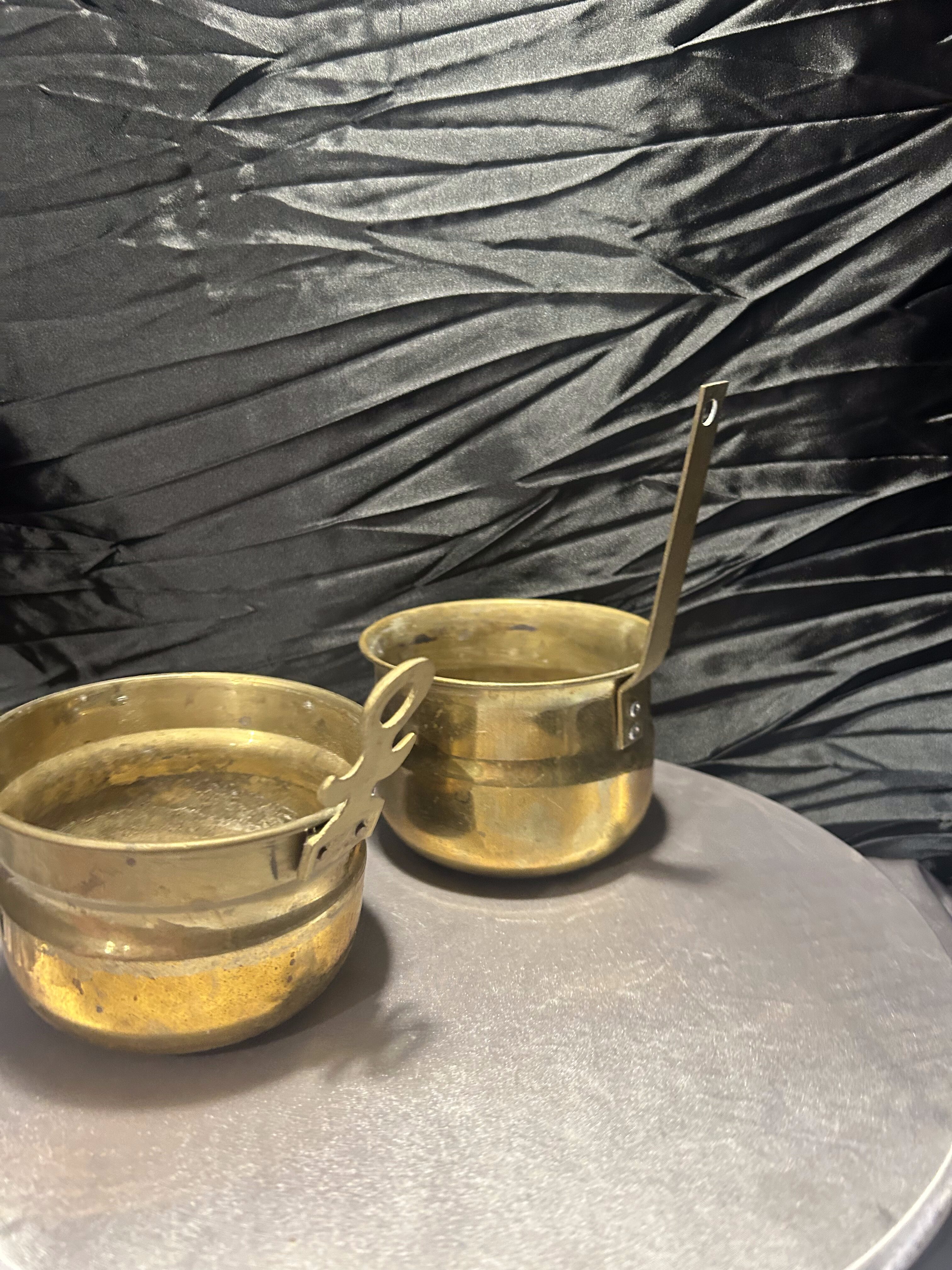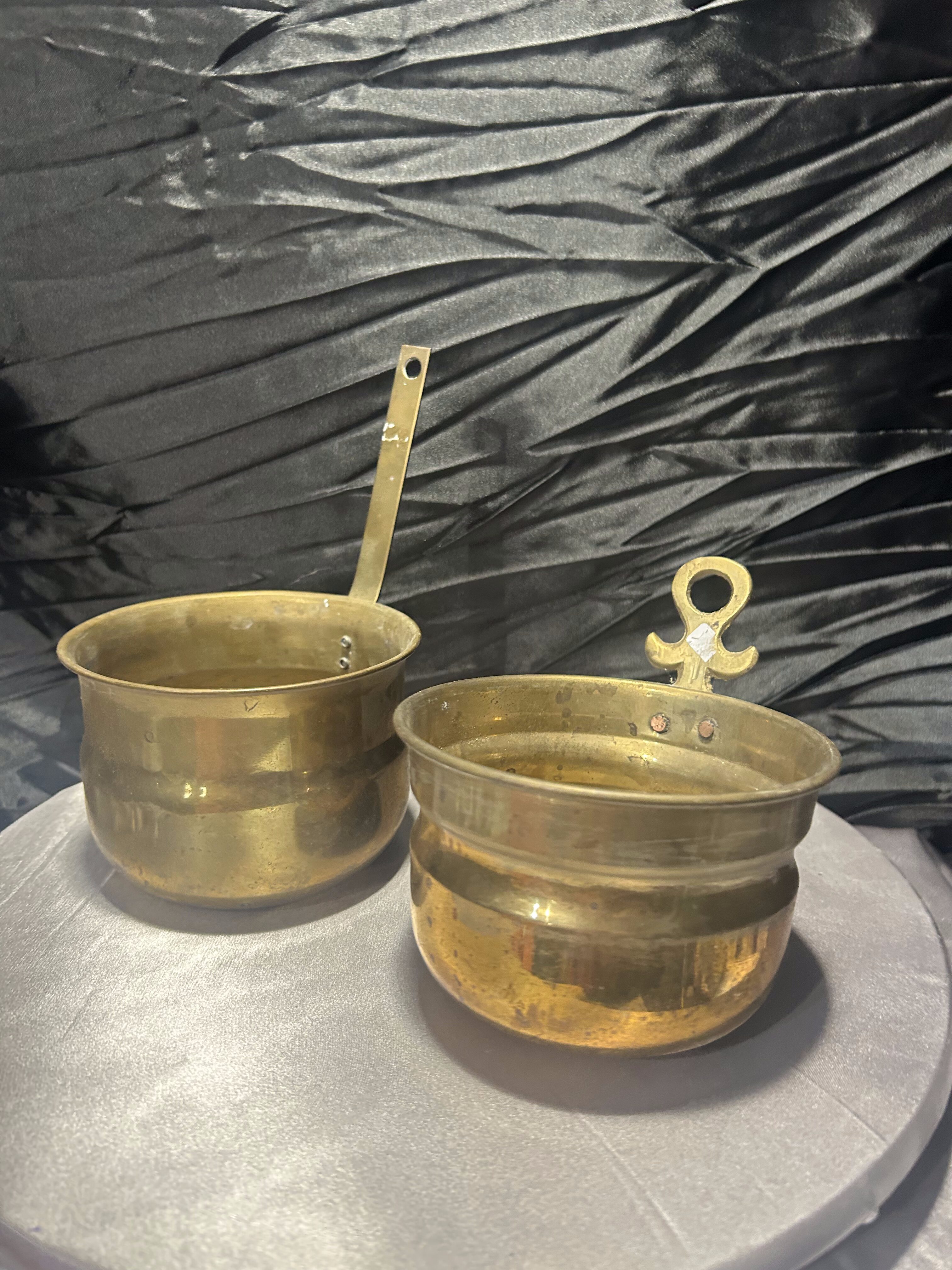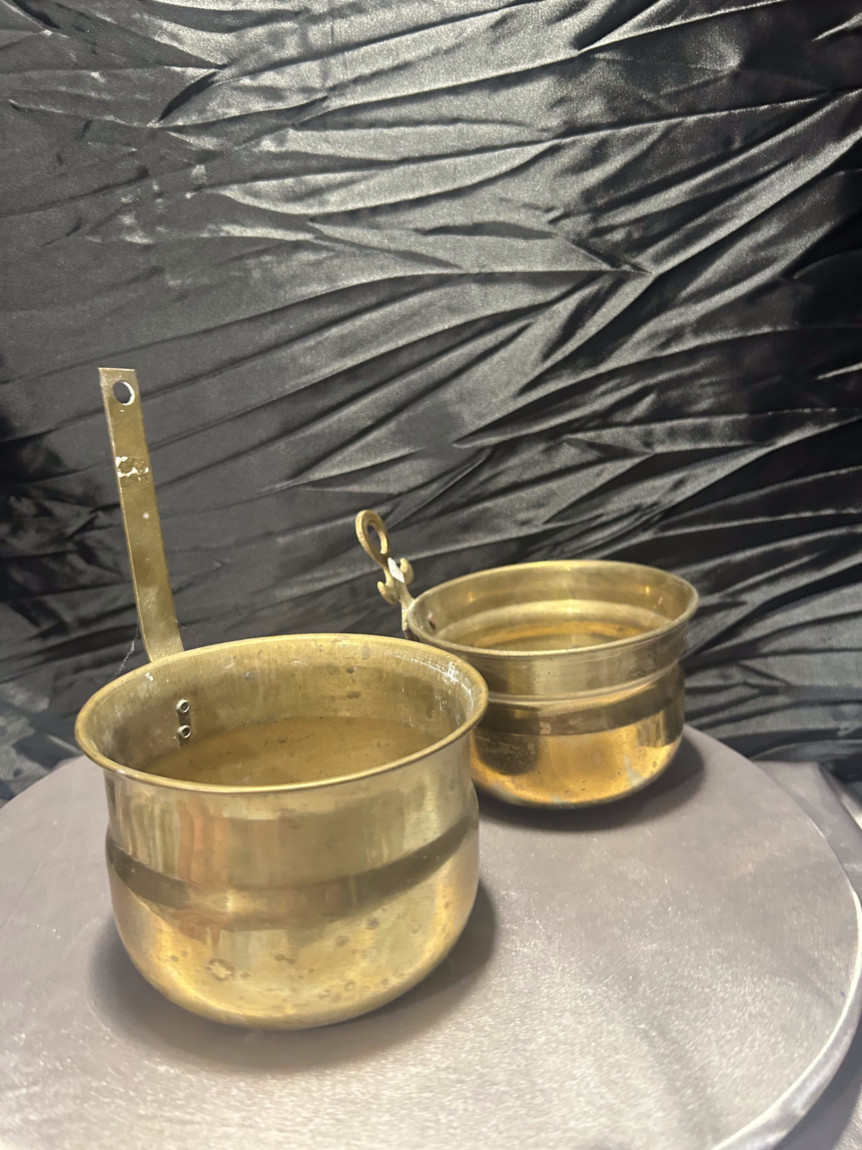 Para urokliwych kwietników ściennych wykonanych z mosiądzu, idealna do zawieszenia na ścianie lub w oknie. Oba naczynia wyróżniają się prostą, ale bardzo dekoracyjną formą – jeden z nich posiada surowy uchwyt, drugi ozdobny zwieńczony finezyjnym detalem. Złocisty połysk mosiądzu pięknie odbija światło, a wiekowa patyna dodaje im charakteru. Sprawdzą się jako pojemniki na niewielkie rośliny, suszki lub jako samodzielna ozdoba w przestrzeni vintage.