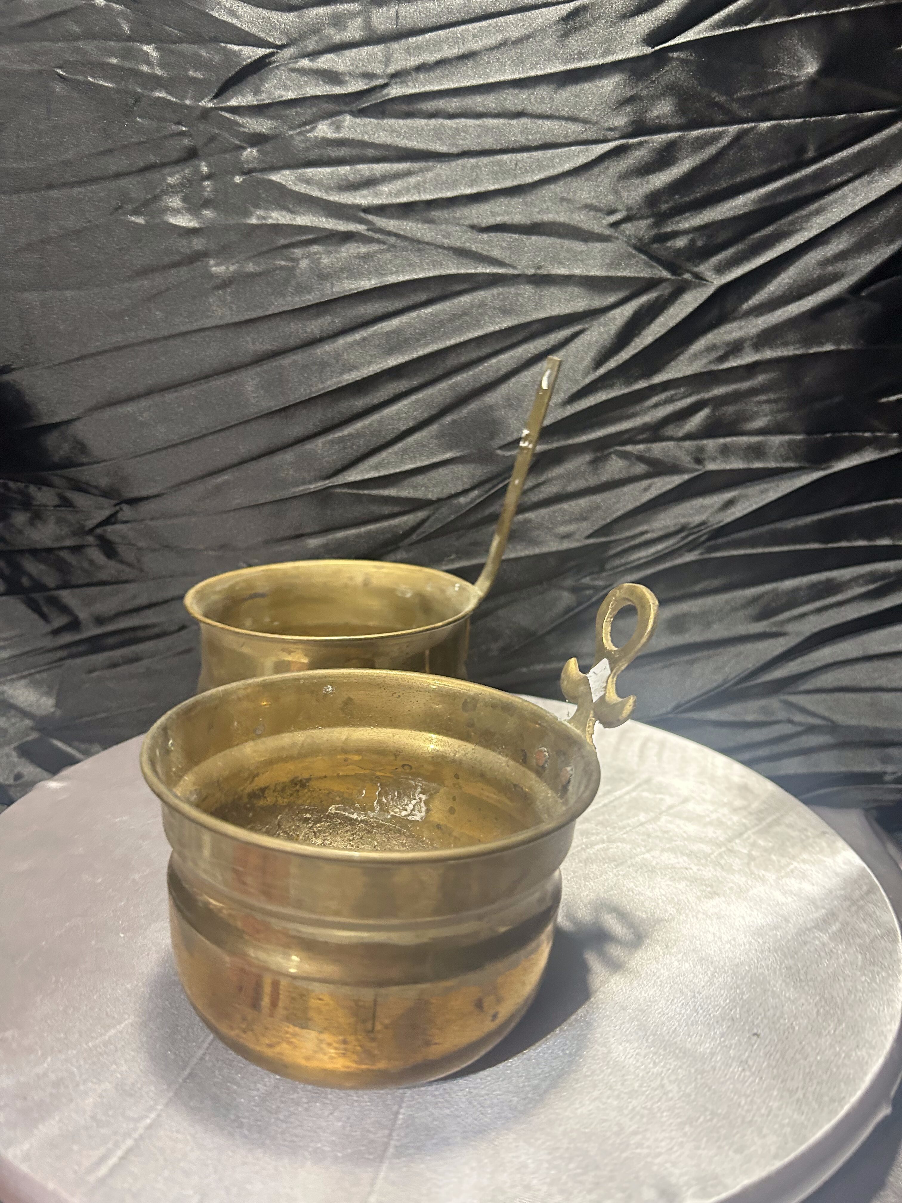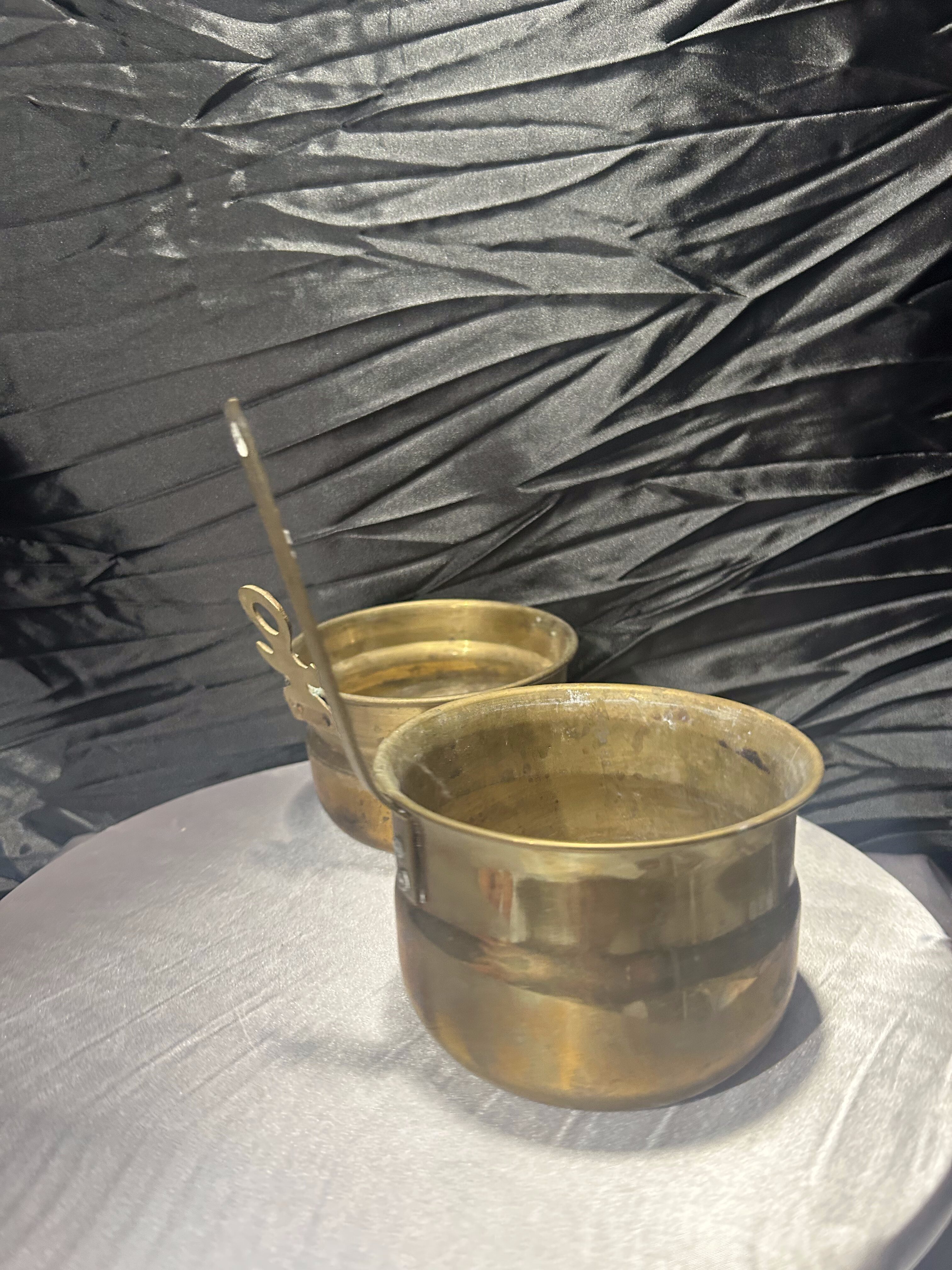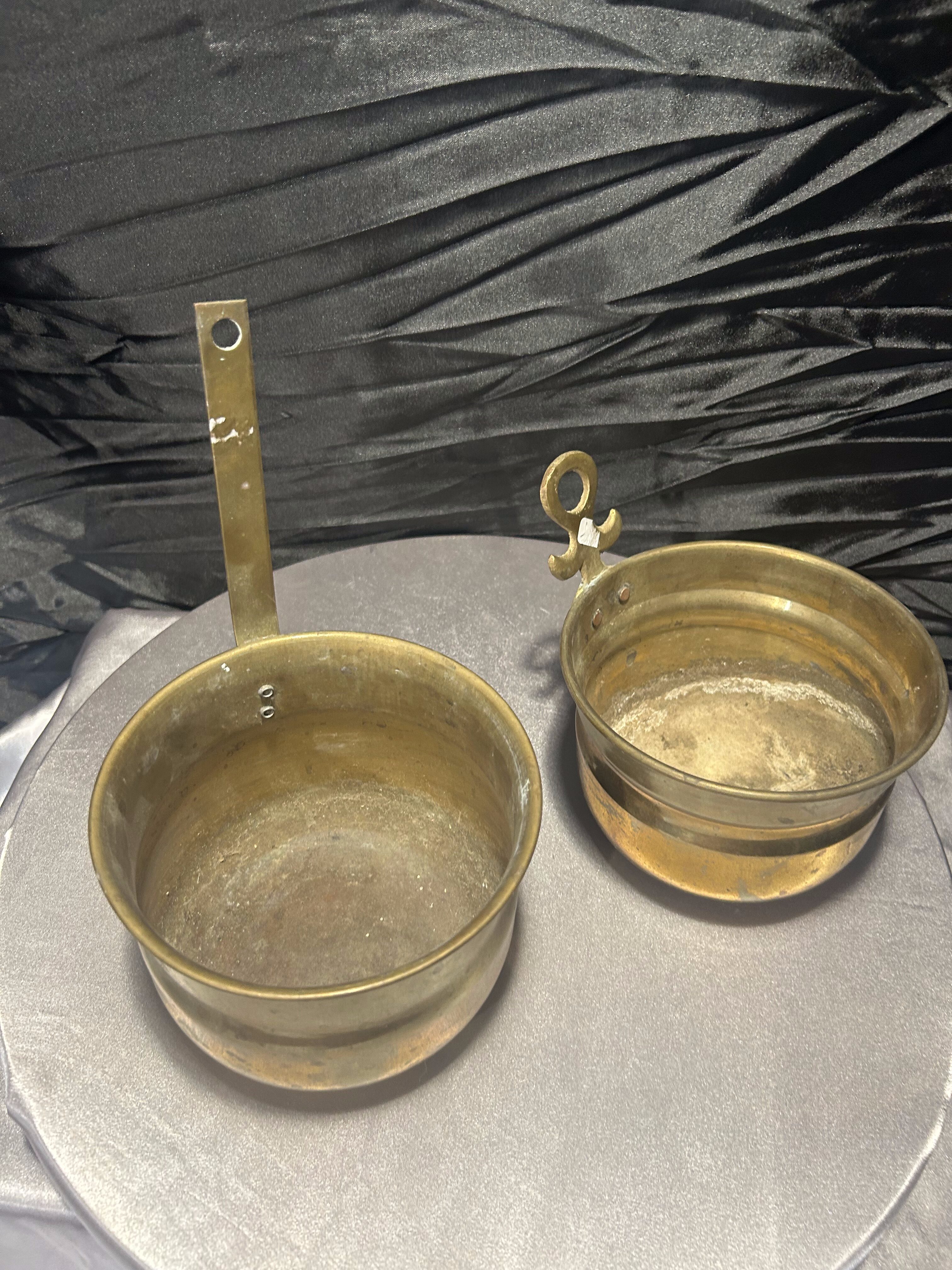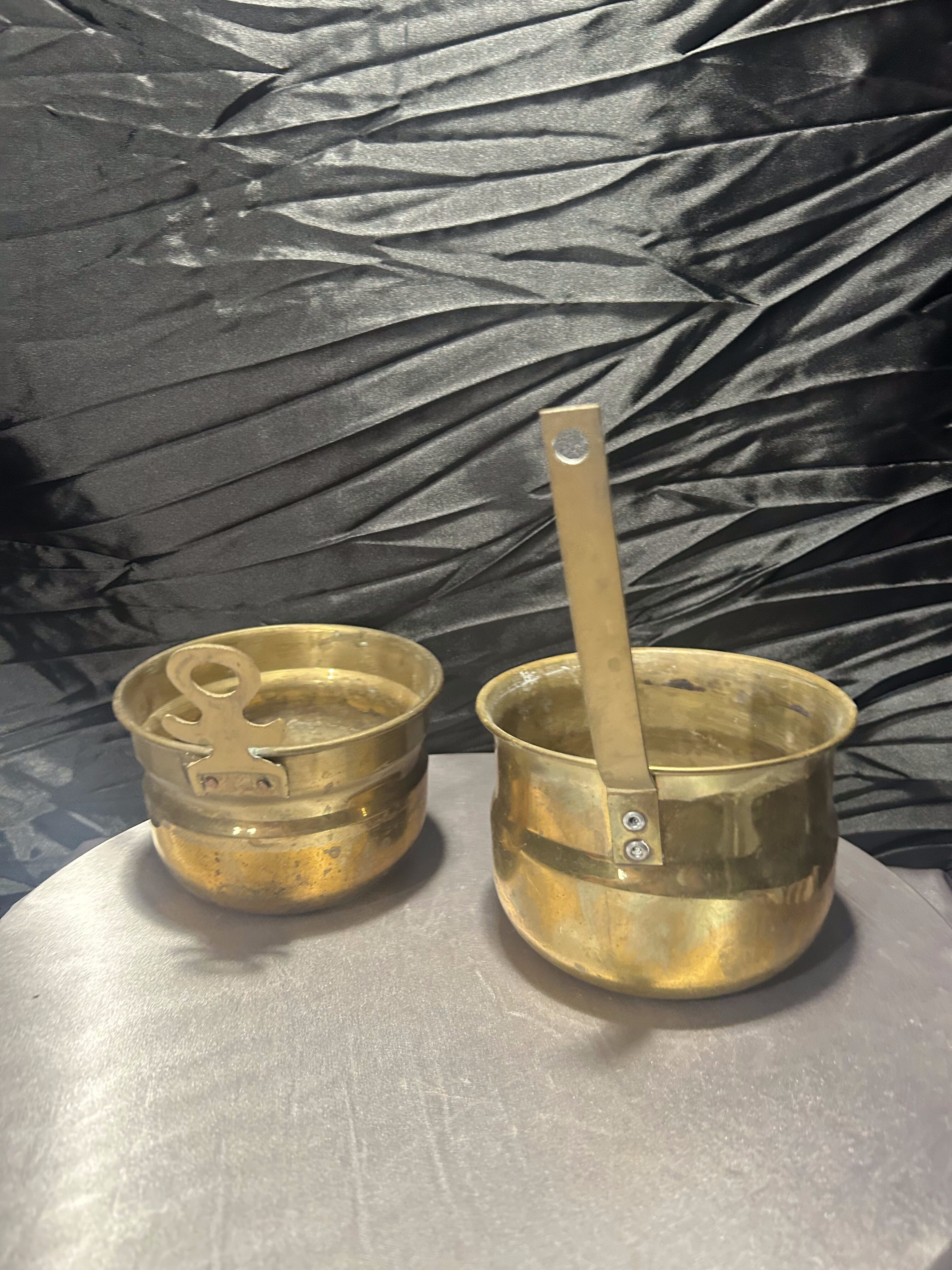 Para urokliwych kwietników ściennych wykonanych z mosiądzu, idealna do zawieszenia na ścianie lub w oknie. Oba naczynia wyróżniają się prostą, ale bardzo dekoracyjną formą – jeden z nich posiada surowy uchwyt, drugi ozdobny zwieńczony finezyjnym detalem. Złocisty połysk mosiądzu pięknie odbija światło, a wiekowa patyna dodaje im charakteru. Sprawdzą się jako pojemniki na niewielkie rośliny, suszki lub jako samodzielna ozdoba w przestrzeni vintage.