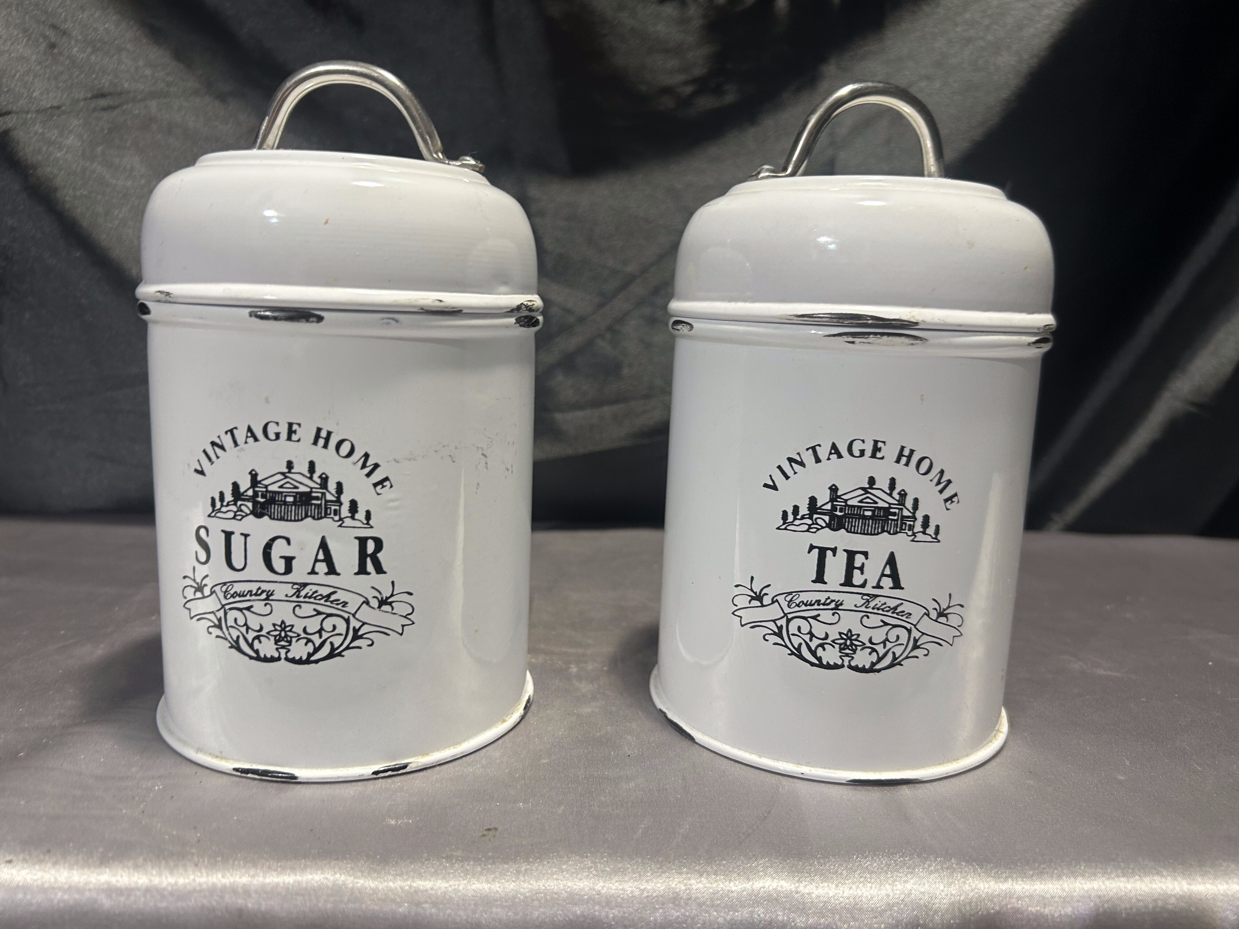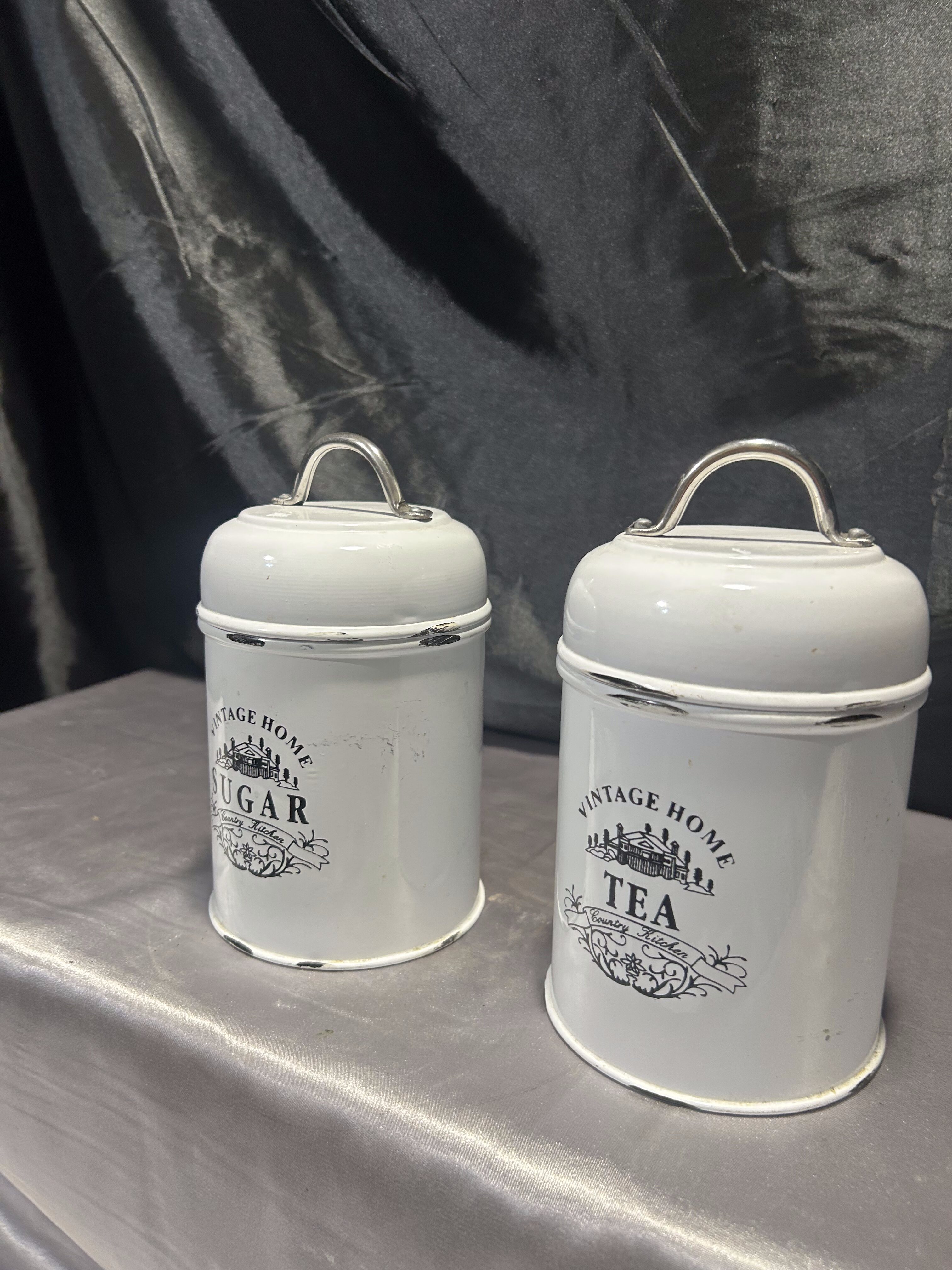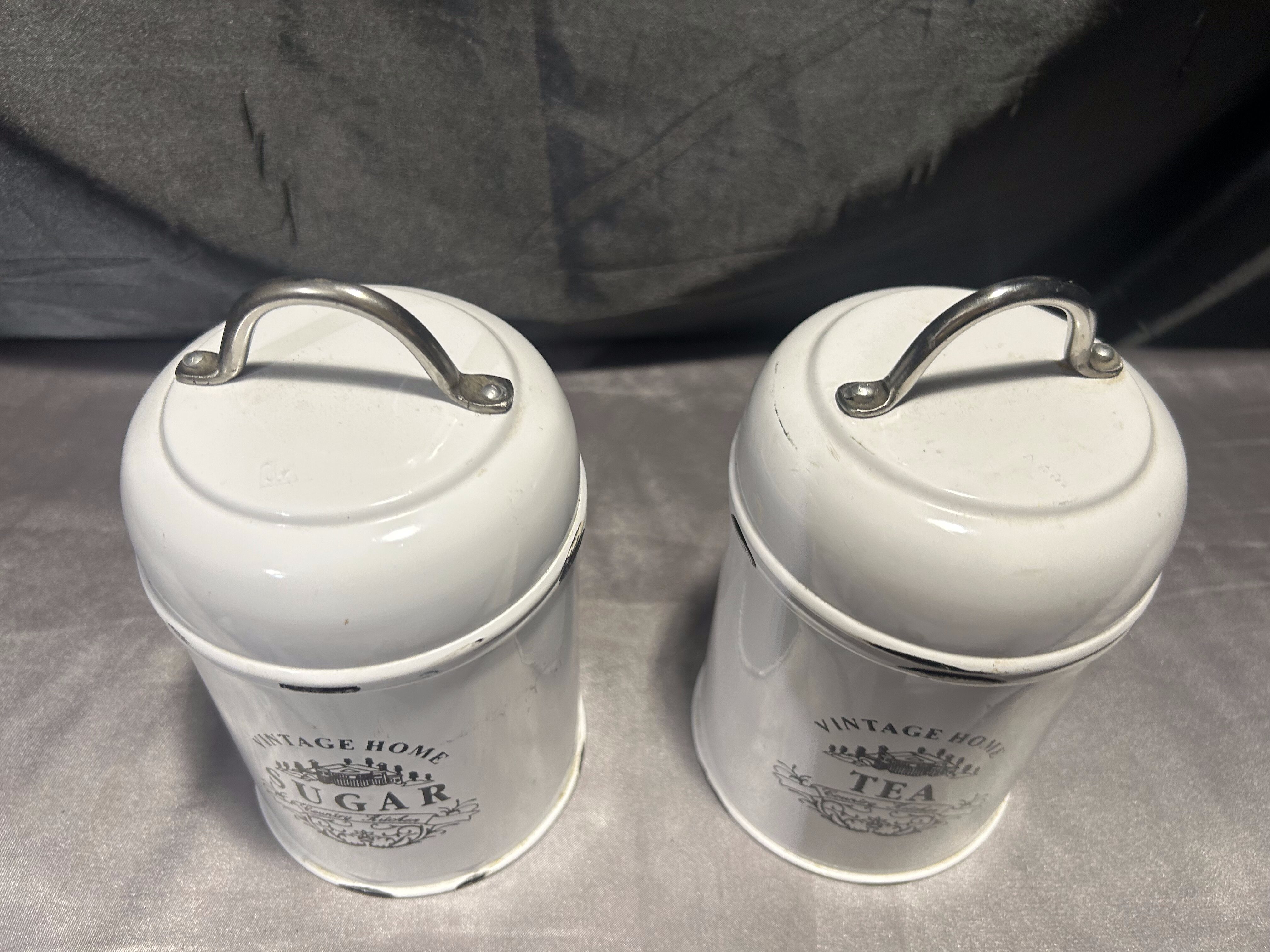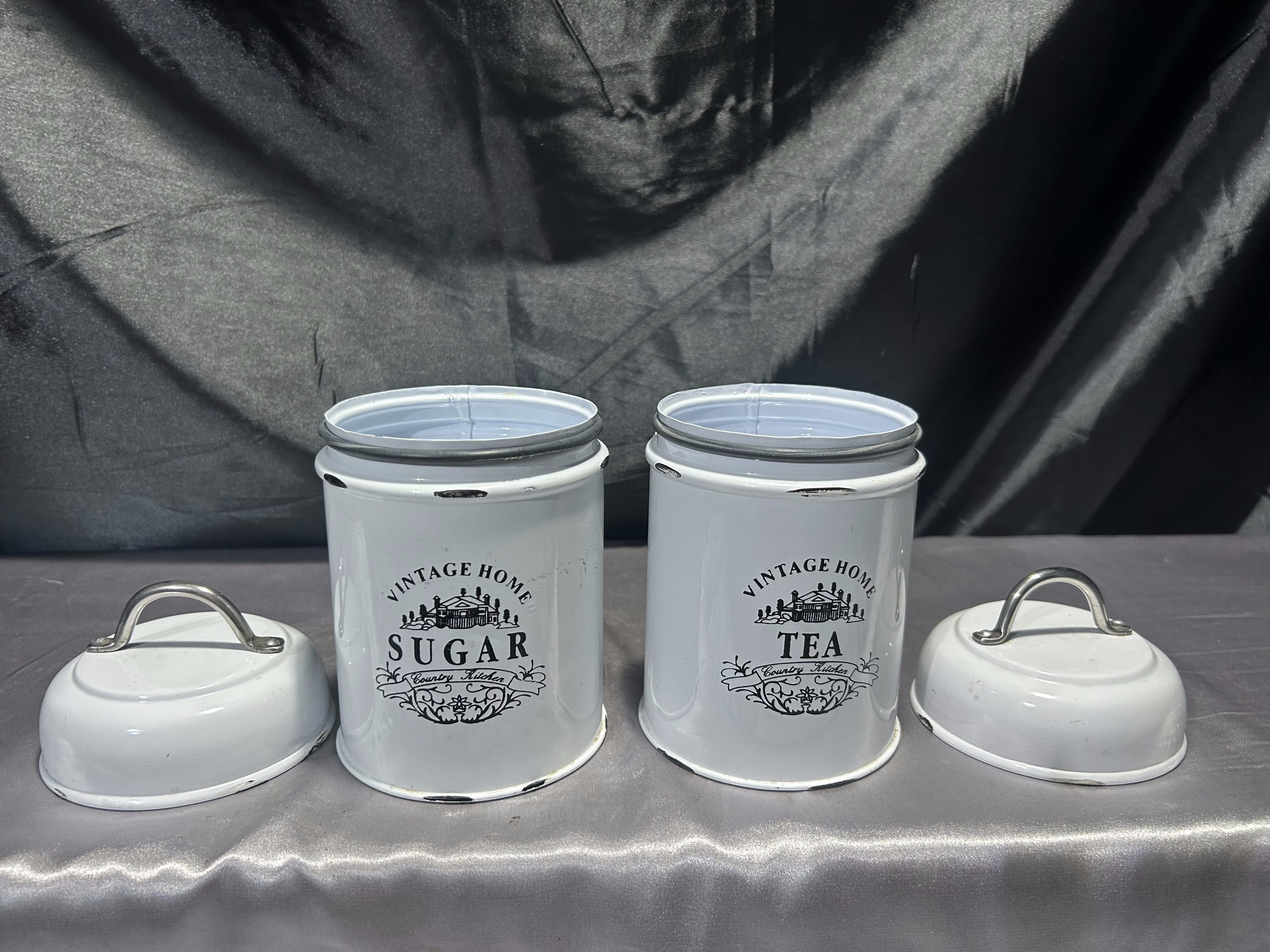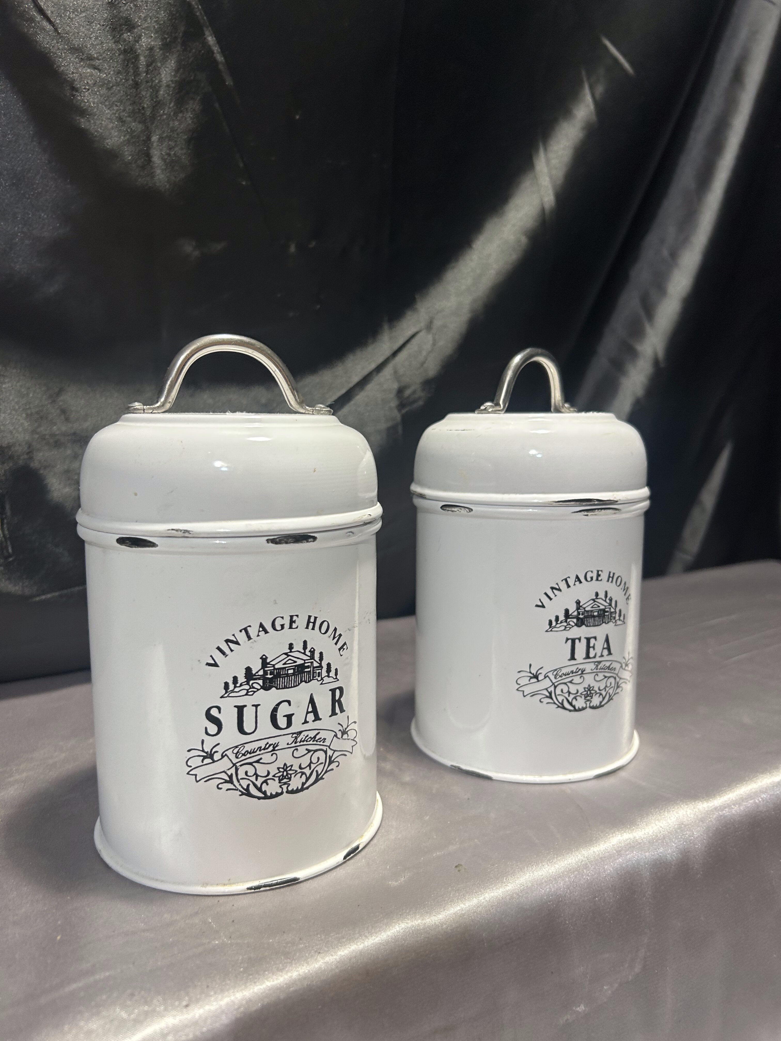 Stylizowany zestaw dwóch metalowych pojemników kuchennych w kolorze przecieranej bieli, z eleganckimi czarnymi napisami w języku angielskim: Sugar i Tea. Pokrywki z uchwytami zapewniają wygodne zamykanie, a całość utrzymana jest w estetyce vintage/shabby chic. Idealne do przechowywania sypkich produktów i jako ozdoba kuchennego blatu lub półki.