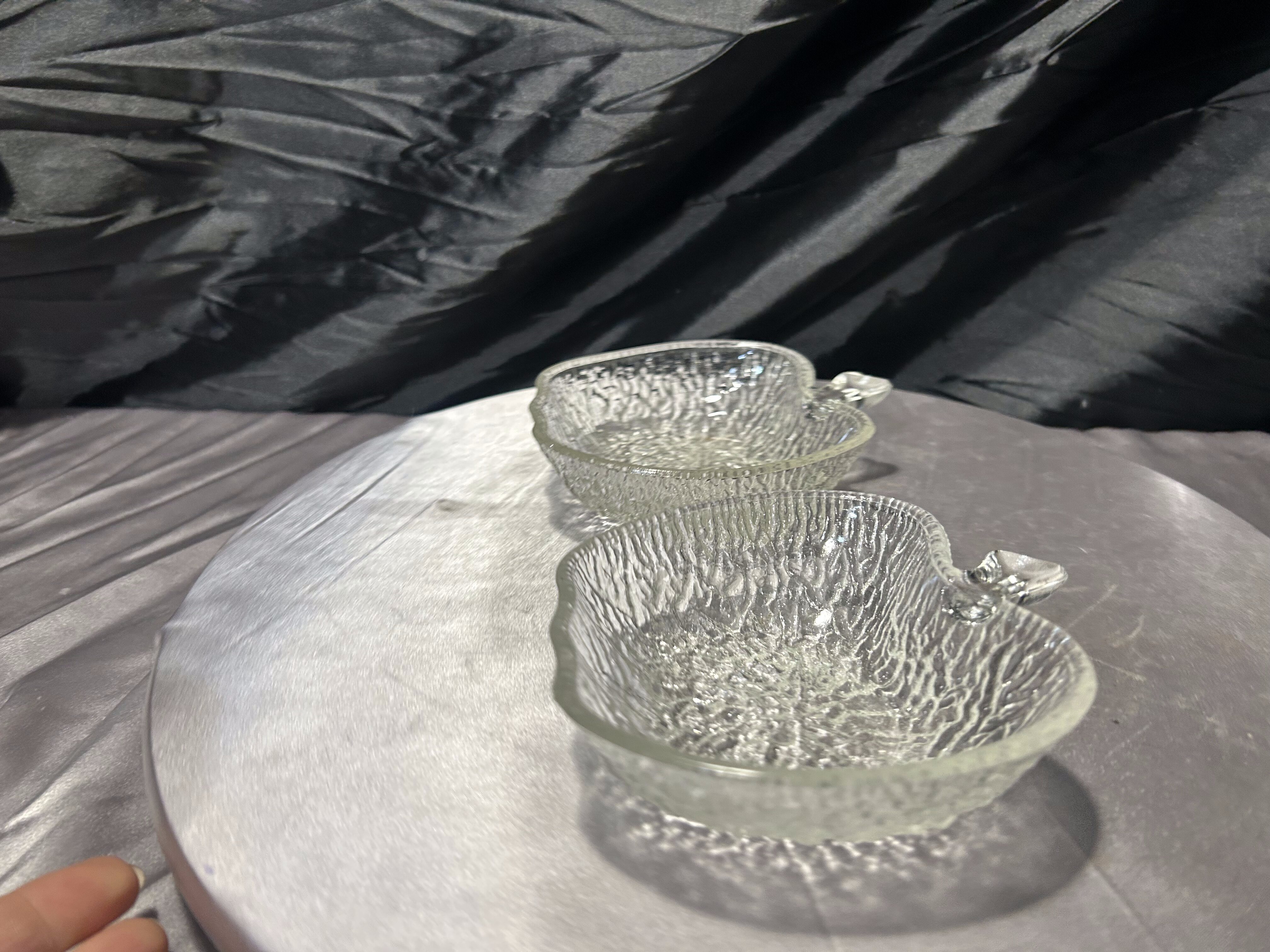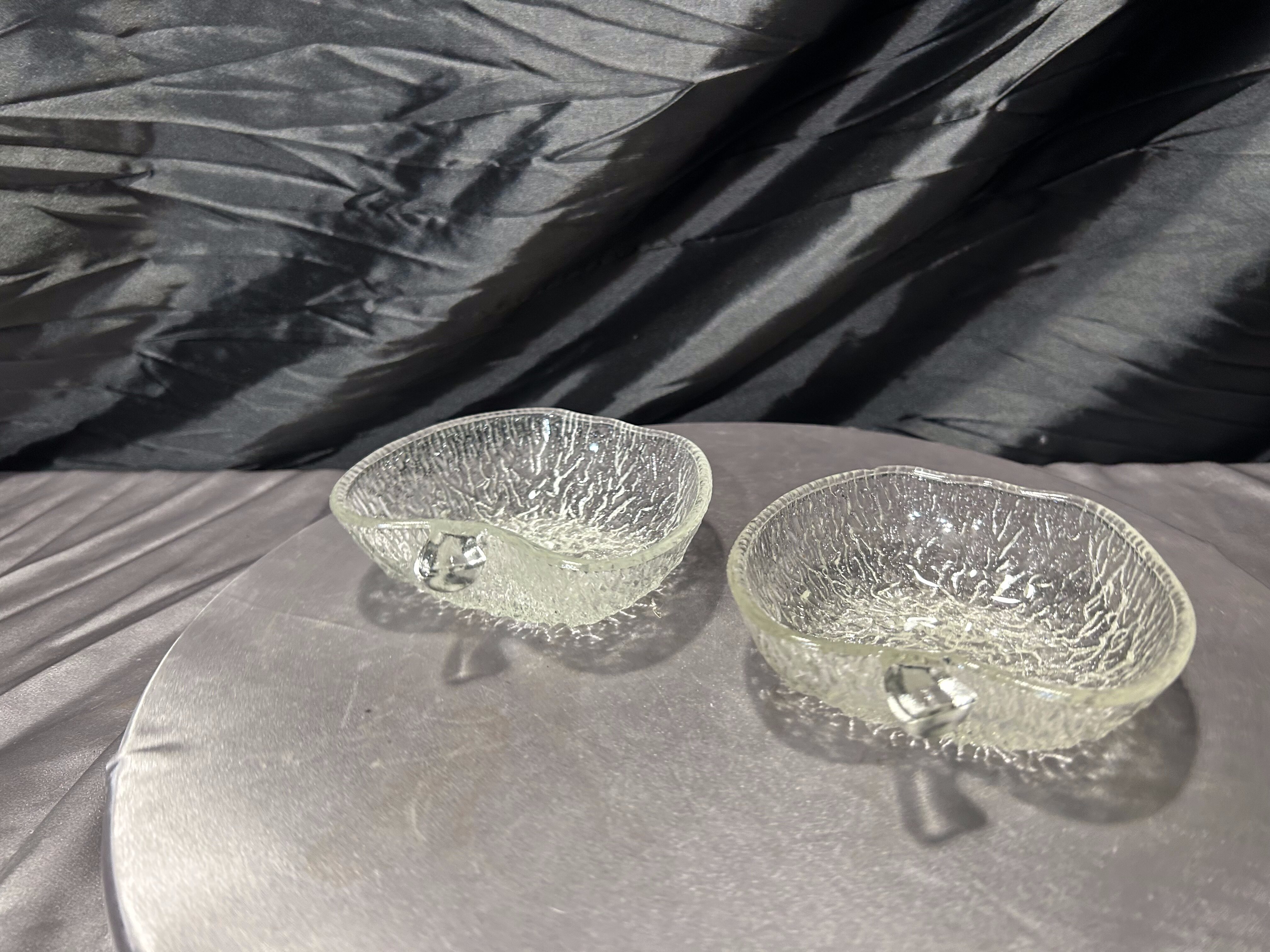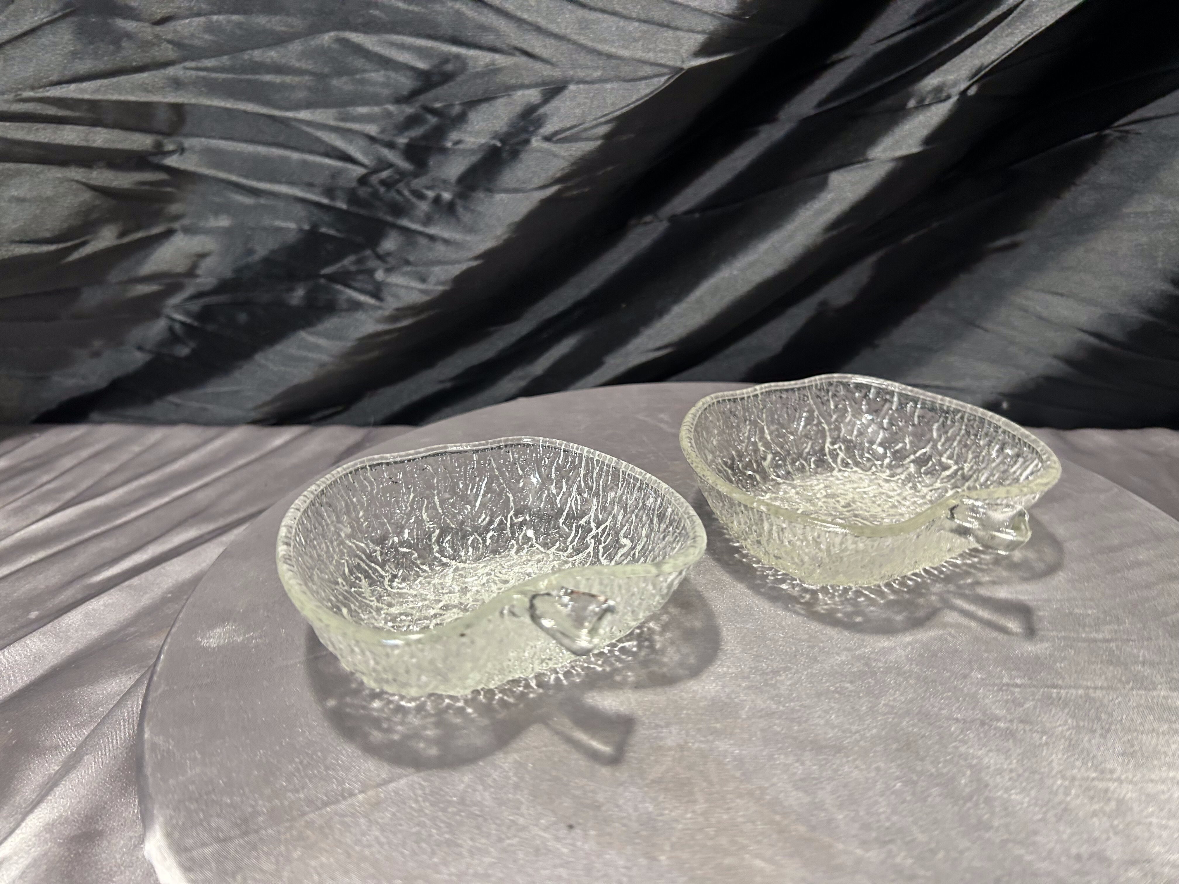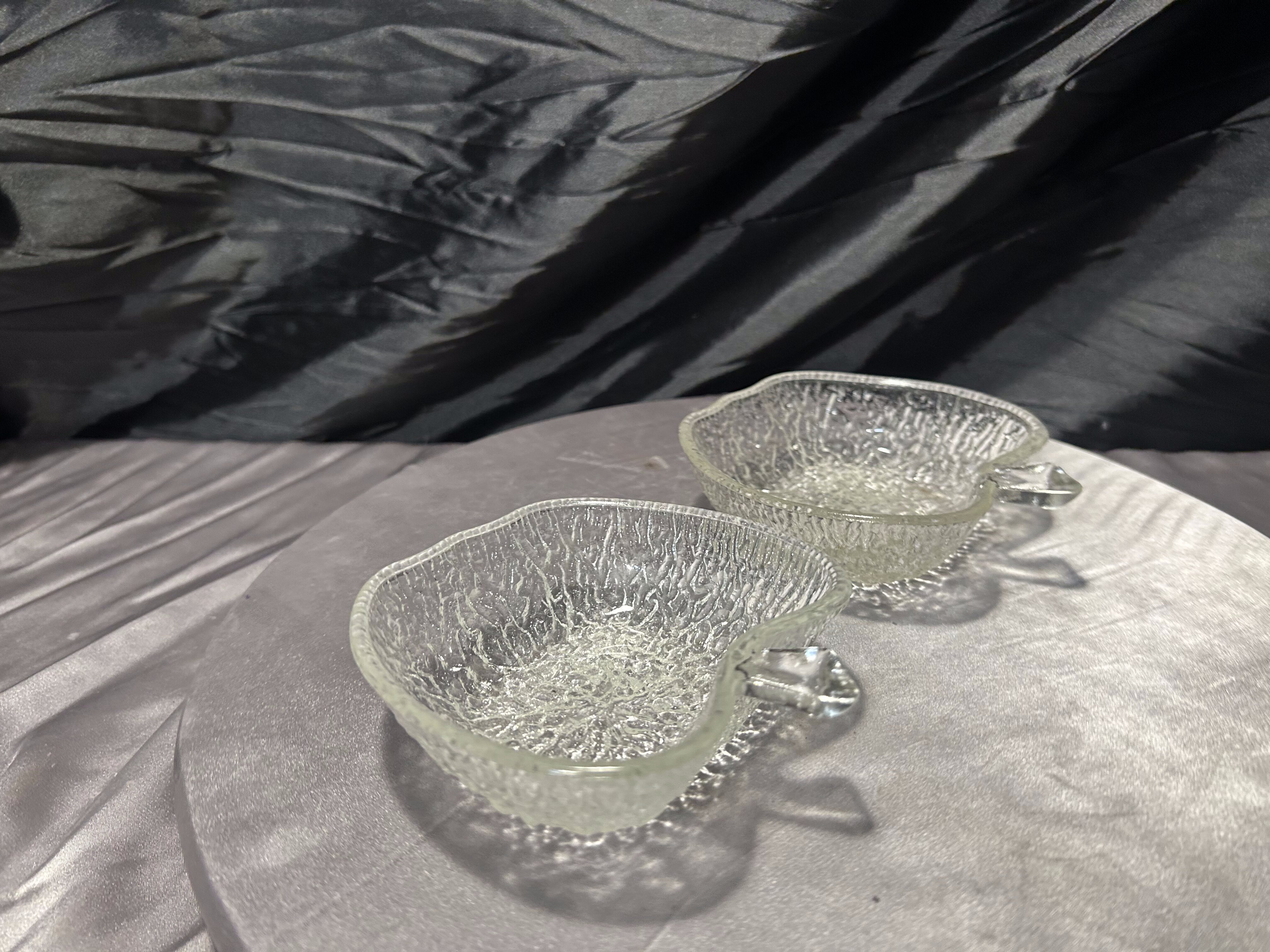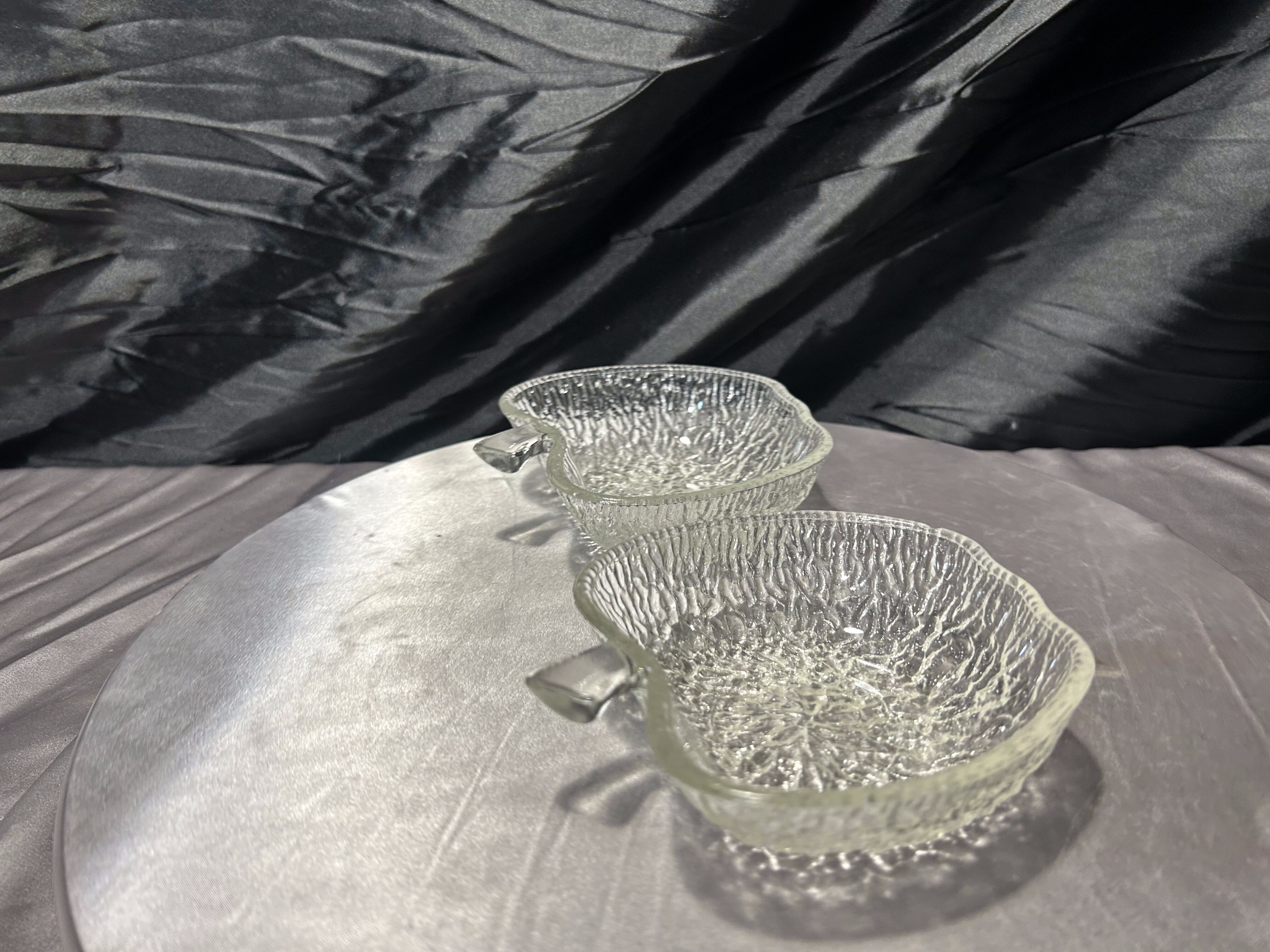 Delikatny i dekoracyjny komplet dwóch artystycznych miseczek szklanych w kształcie jabłuszek. Wykonane z transparentnego szkła o nieregularnej, fakturowanej powierzchni, pięknie załamują światło i tworzą subtelny efekt lodowego szkła. Ich organiczna forma oraz staranne wykończenie sprawiają, że doskonale odnajdą się zarówno w eleganckich, jak i bardziej naturalnych aranżacjach wnętrz.