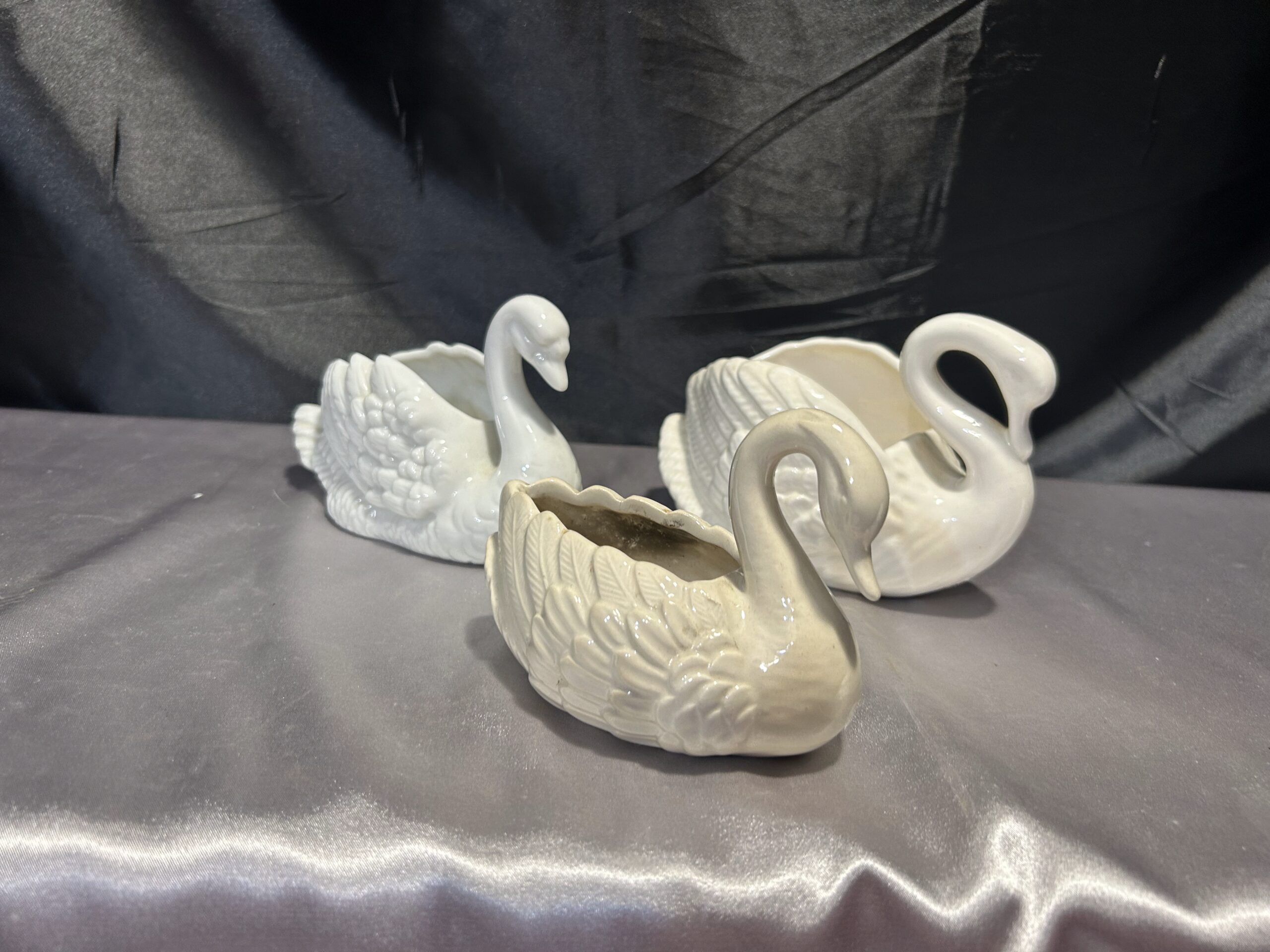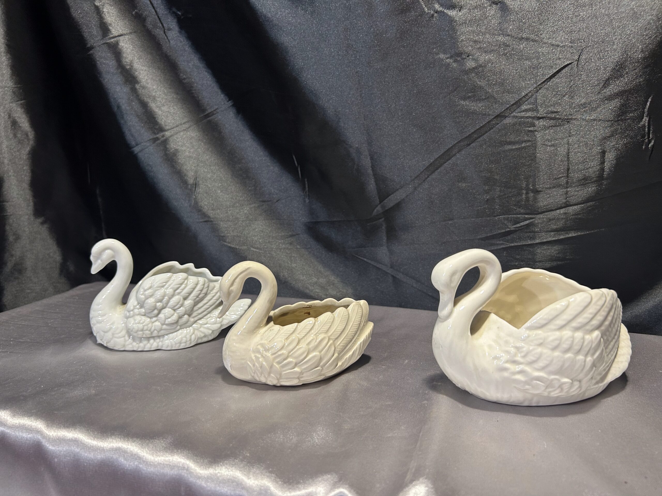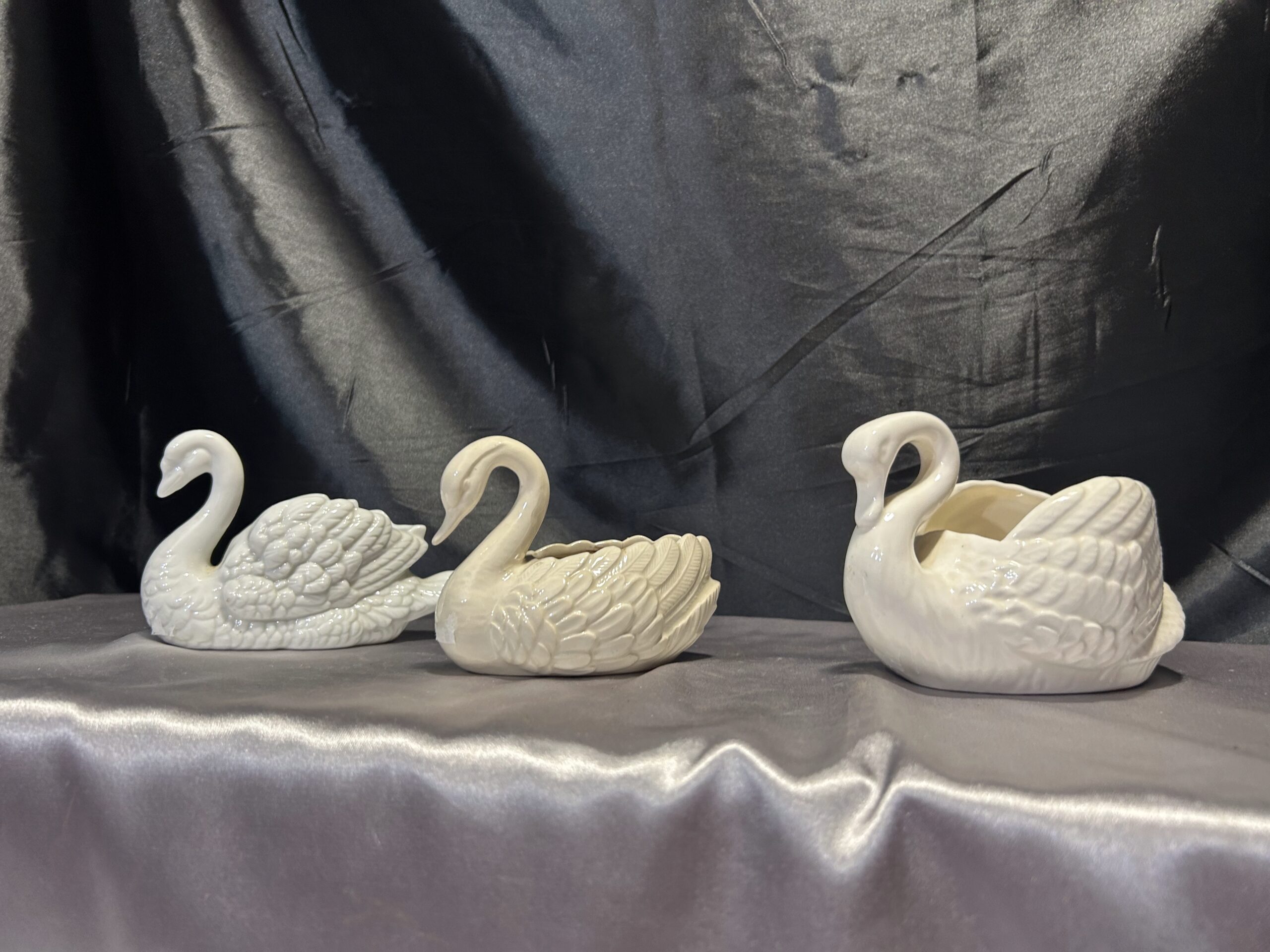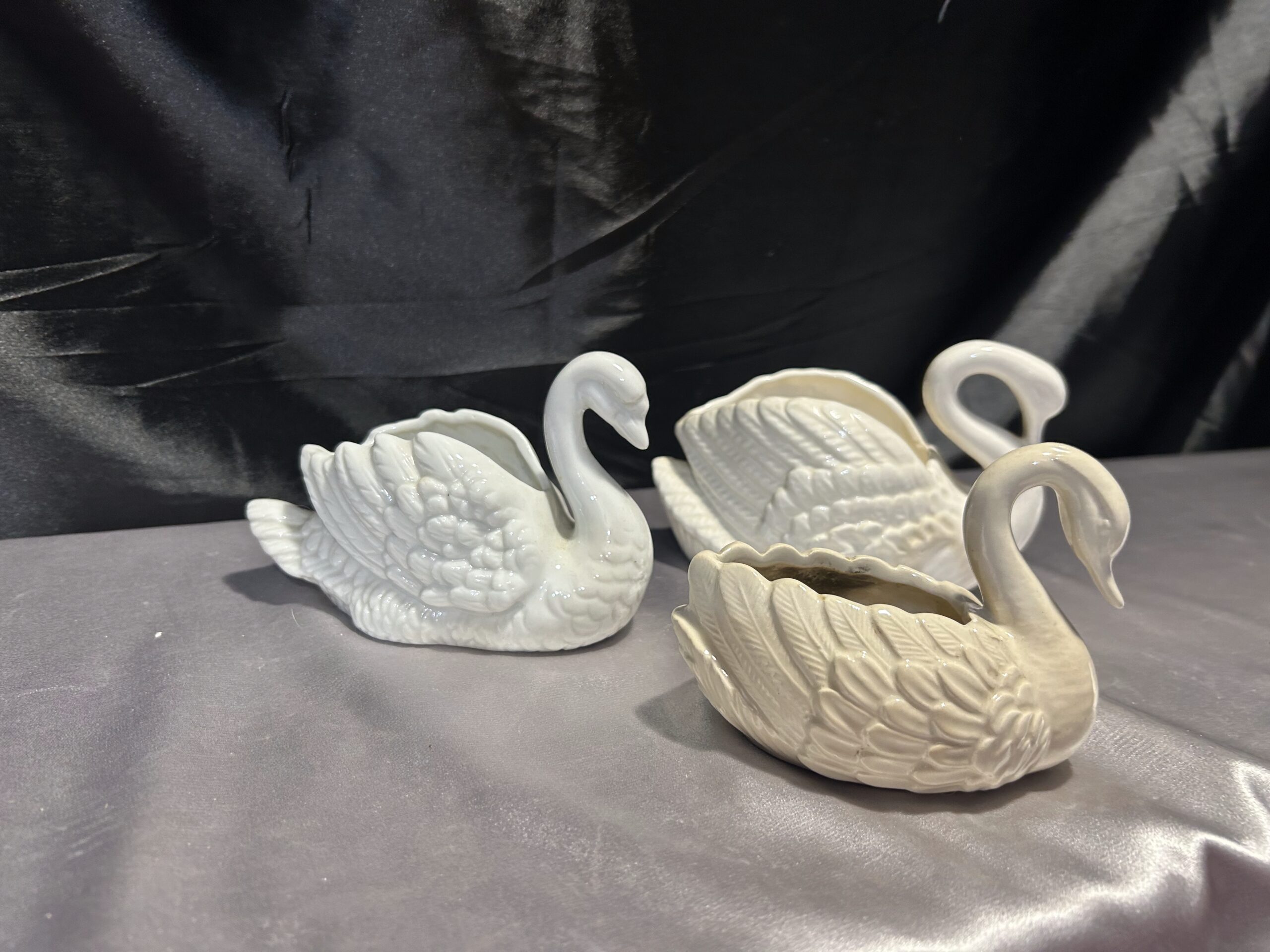 Piękny zestaw trzech realistycznie wykonanych łabędzi, które mogą pełnić funkcję misy, patery lub kwietnika. Wykonane z ceramiki lub porcelany, dwa z nich są sygnowane. Kolekcja utrzymana w subtelnych odcieniach bieli, écru i kremu, doskonale pasująca do klasycznych i romantycznych wnętrz.