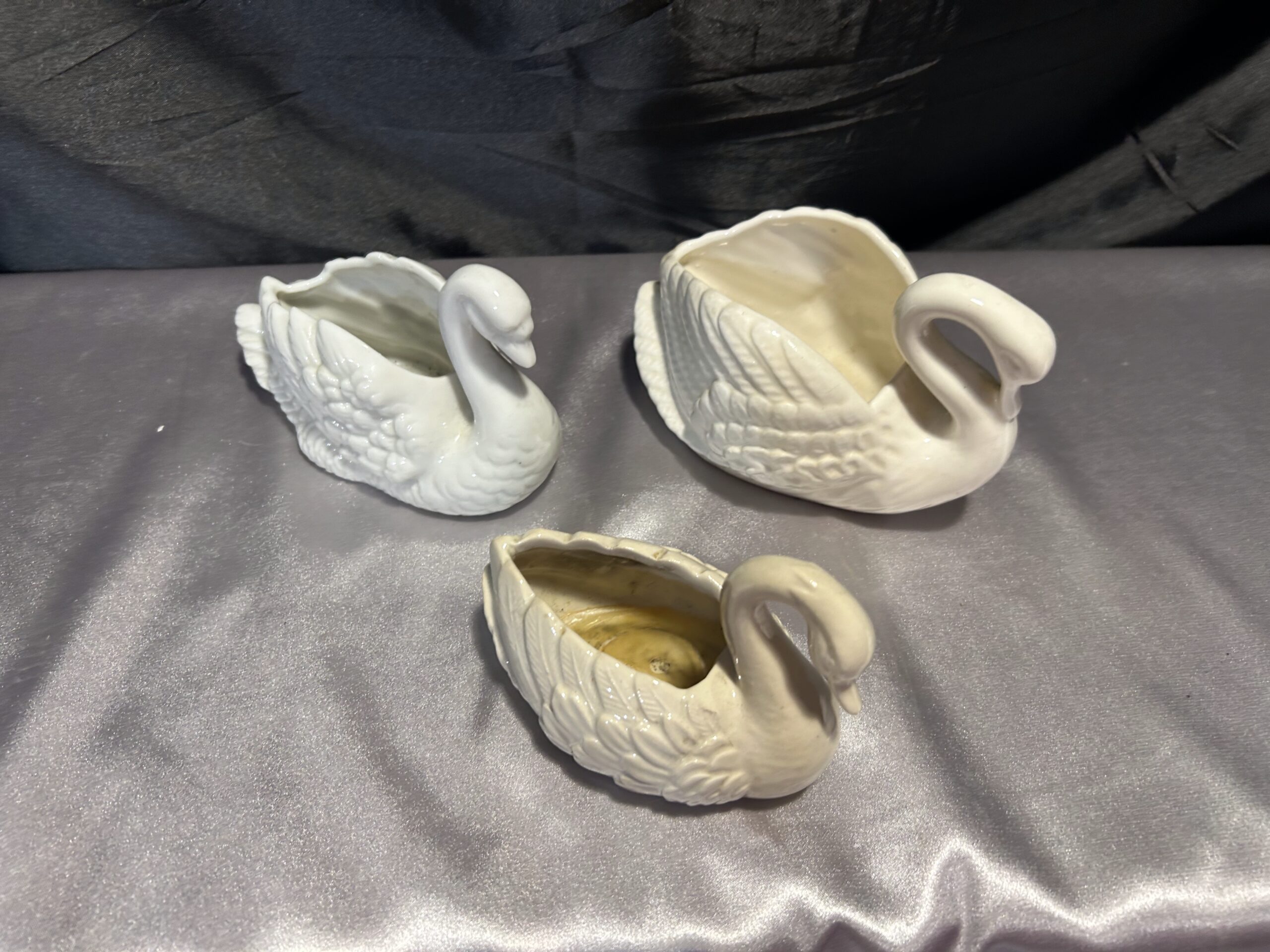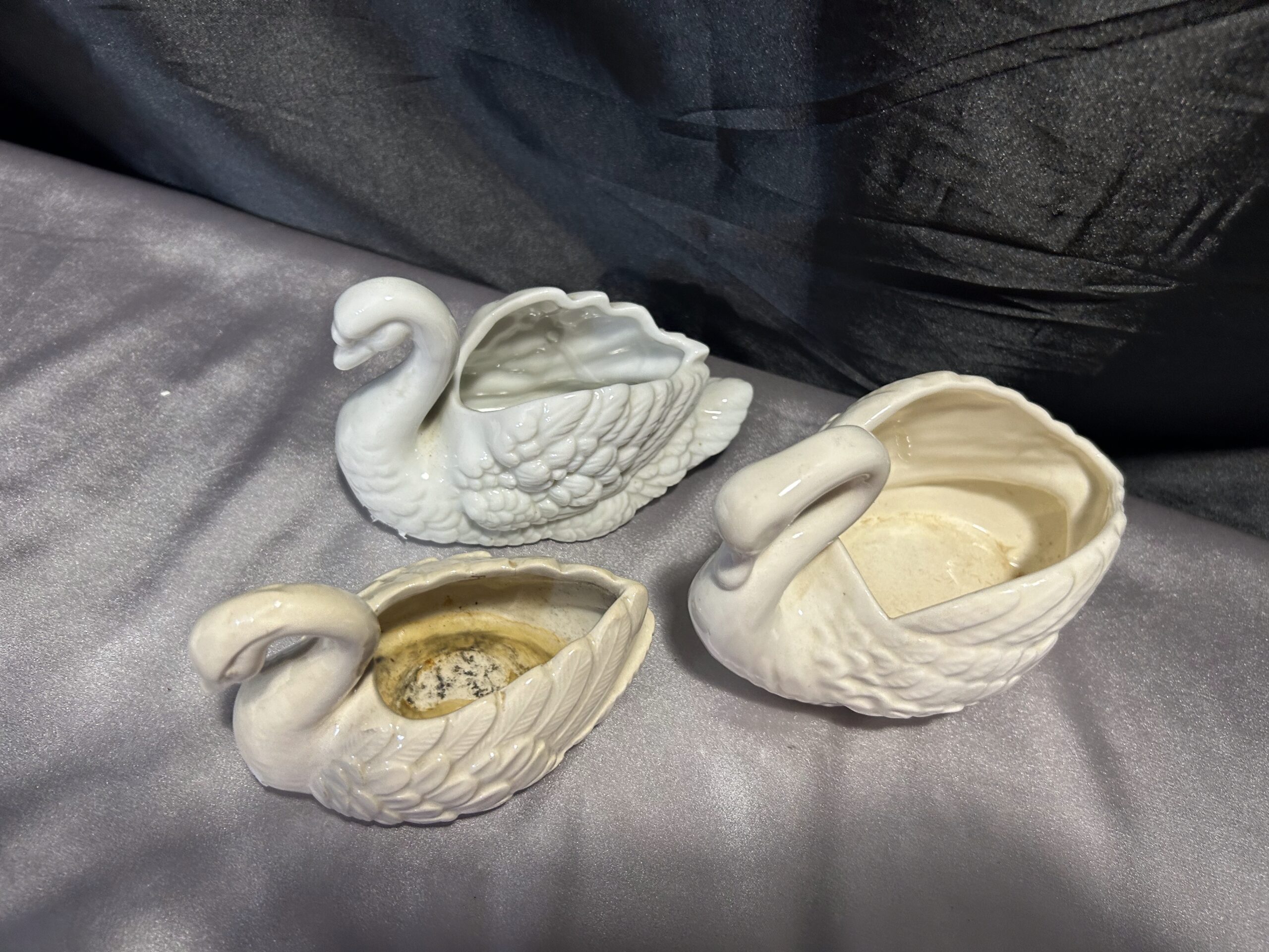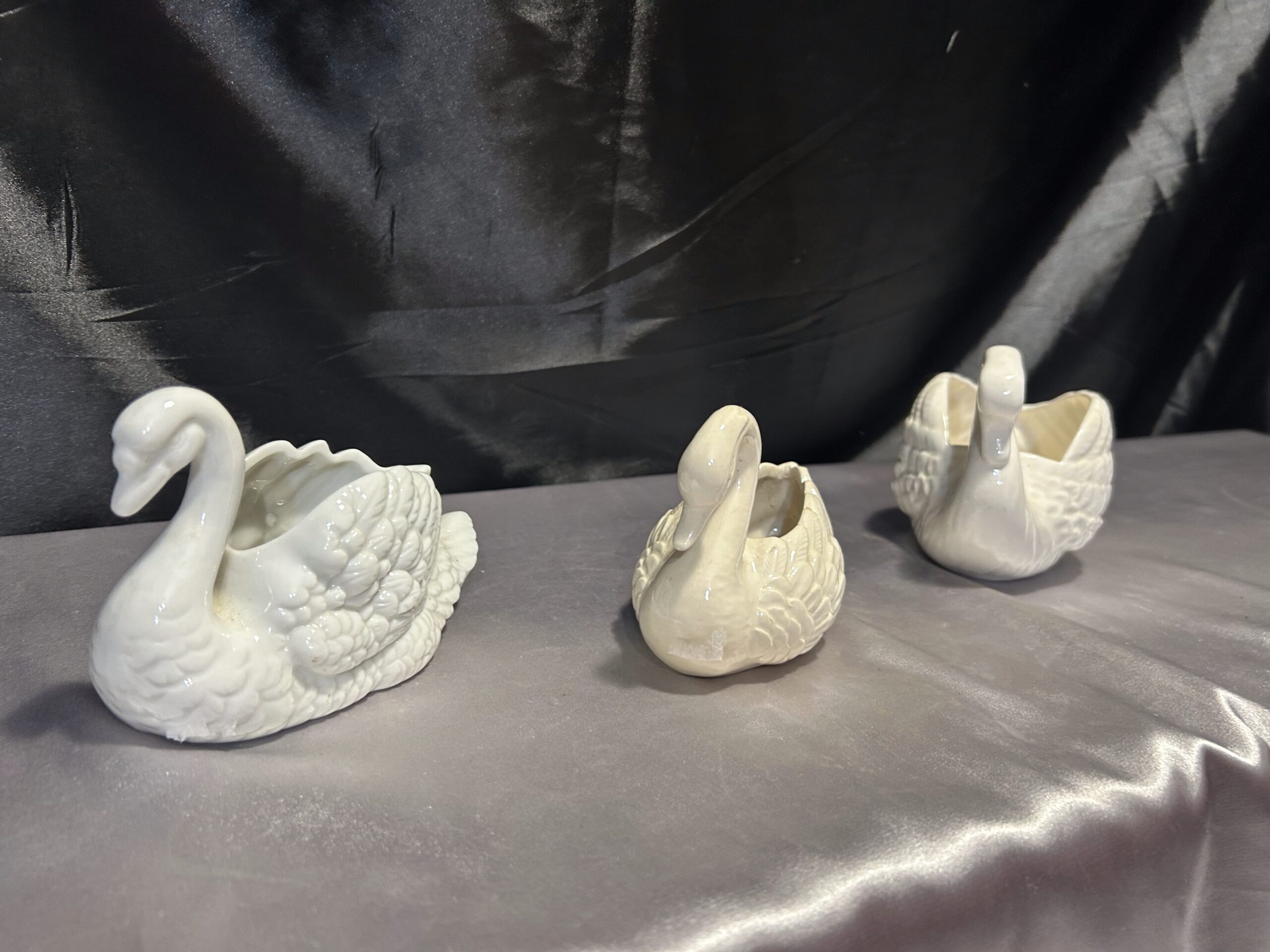 Piękny zestaw trzech realistycznie wykonanych łabędzi, które mogą pełnić funkcję misy, patery lub kwietnika. Wykonane z ceramiki lub porcelany, dwa z nich są sygnowane. Kolekcja utrzymana w subtelnych odcieniach bieli, écru i kremu, doskonale pasująca do klasycznych i romantycznych wnętrz.