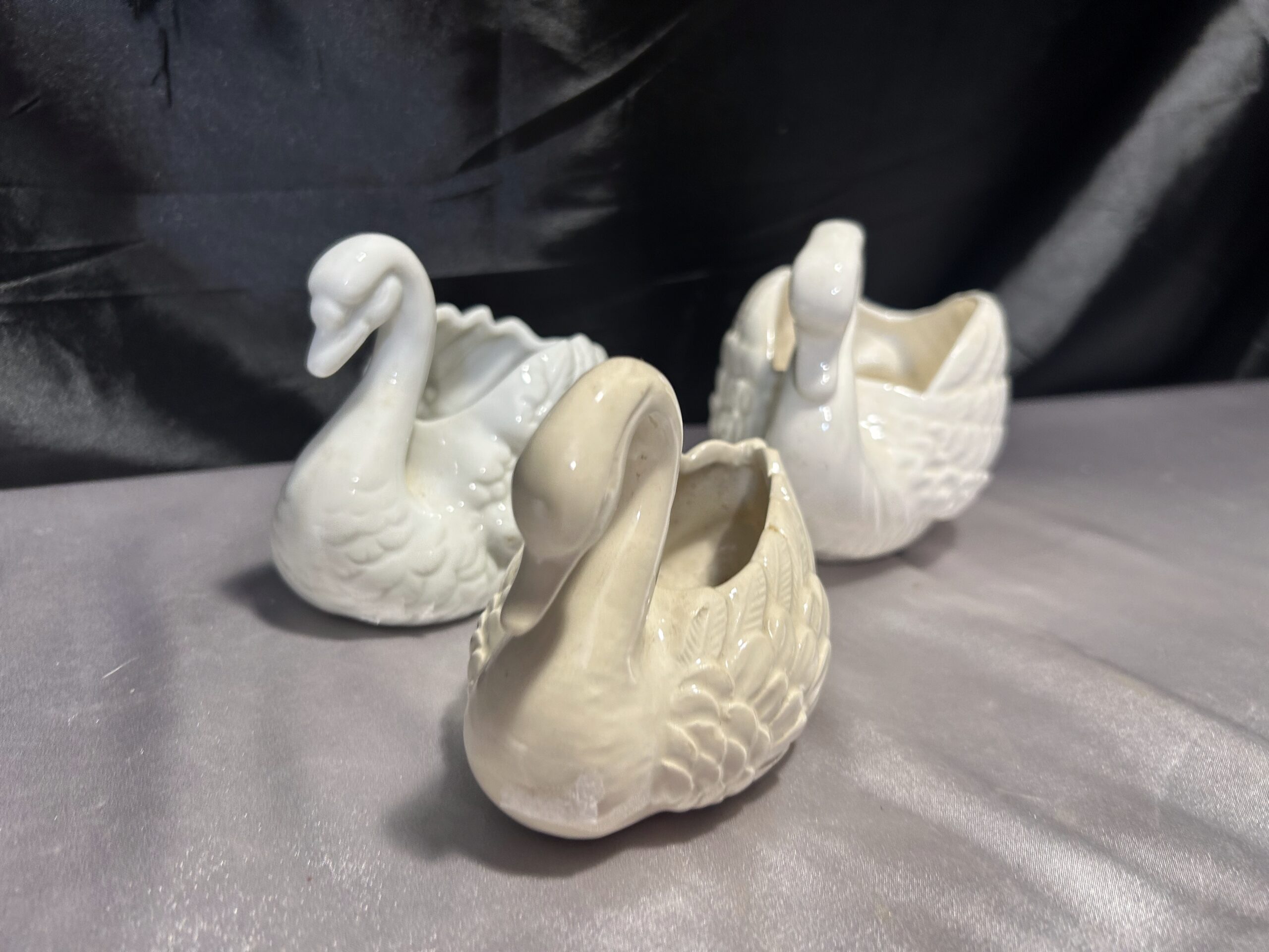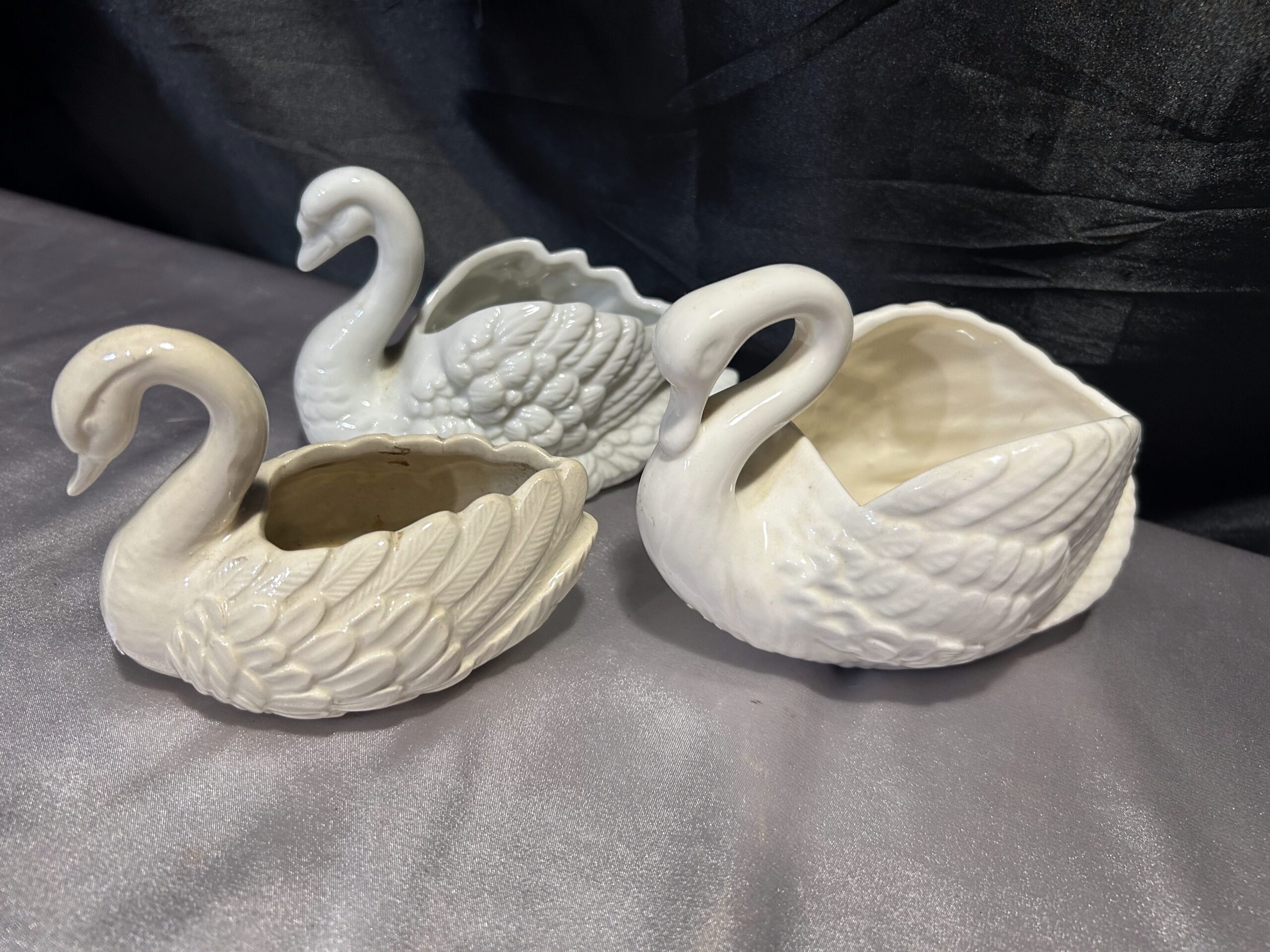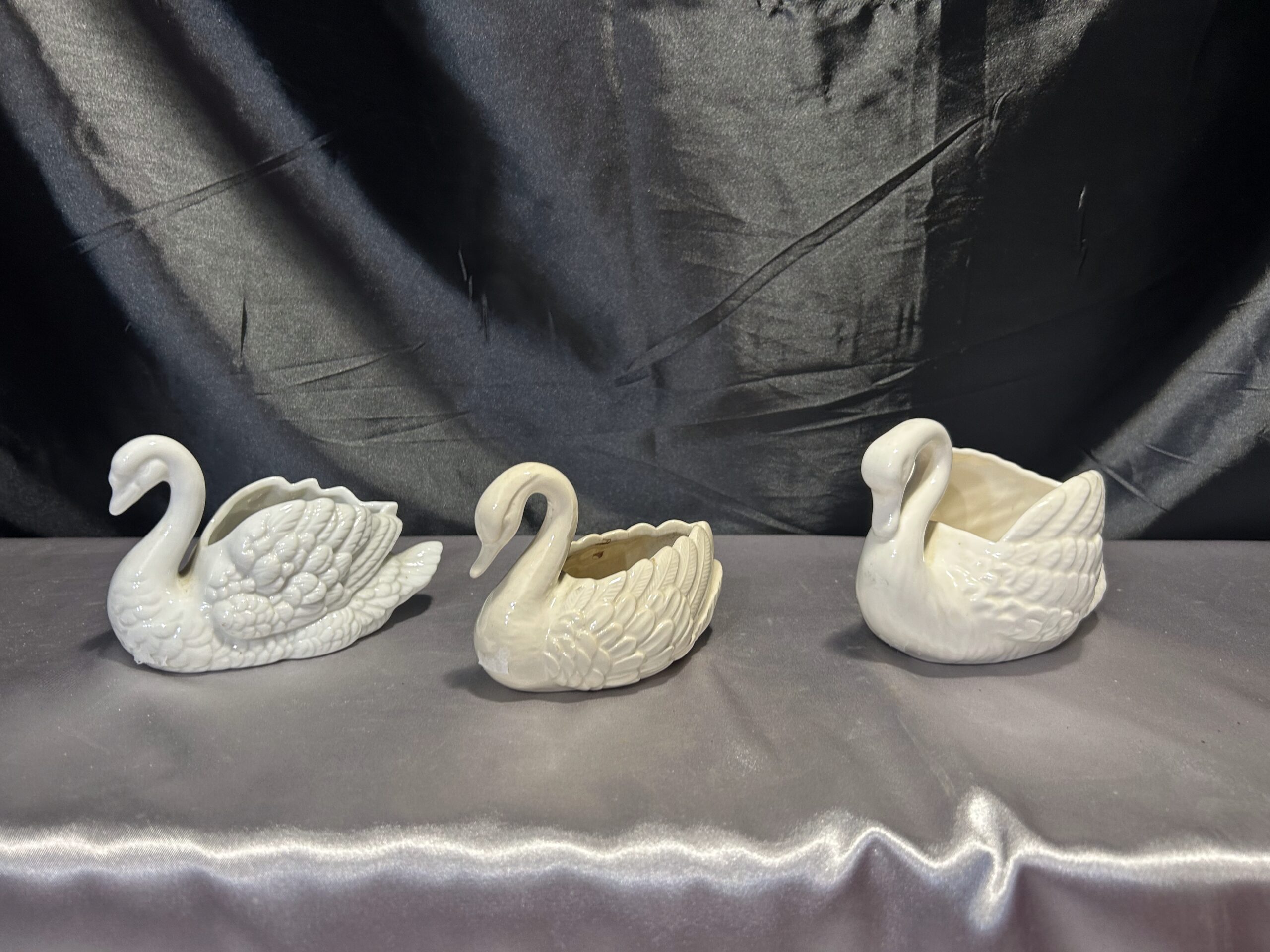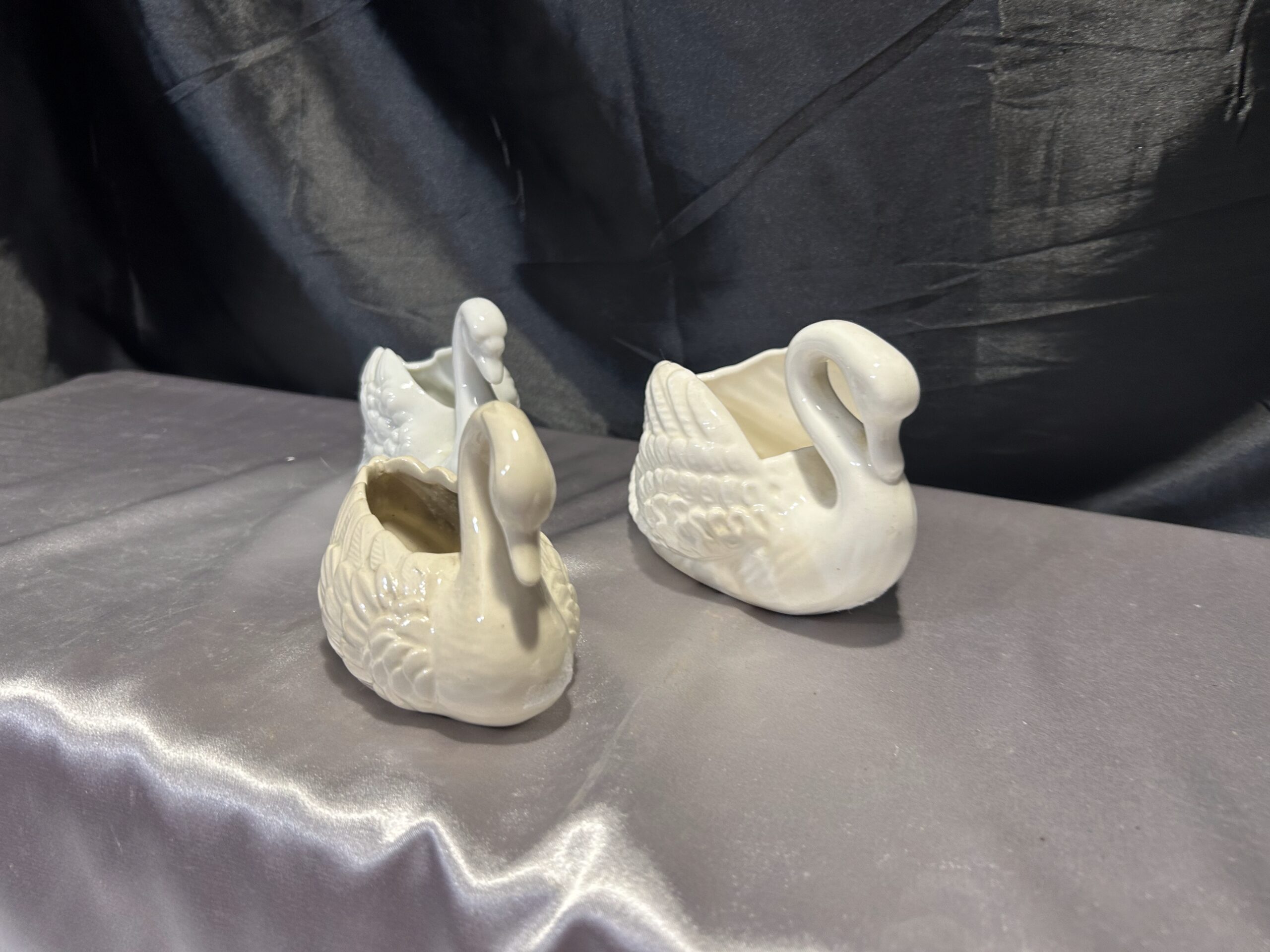 Piękny zestaw trzech realistycznie wykonanych łabędzi, które mogą pełnić funkcję misy, patery lub kwietnika. Wykonane z ceramiki lub porcelany, dwa z nich są sygnowane. Kolekcja utrzymana w subtelnych odcieniach bieli, écru i kremu, doskonale pasująca do klasycznych i romantycznych wnętrz.