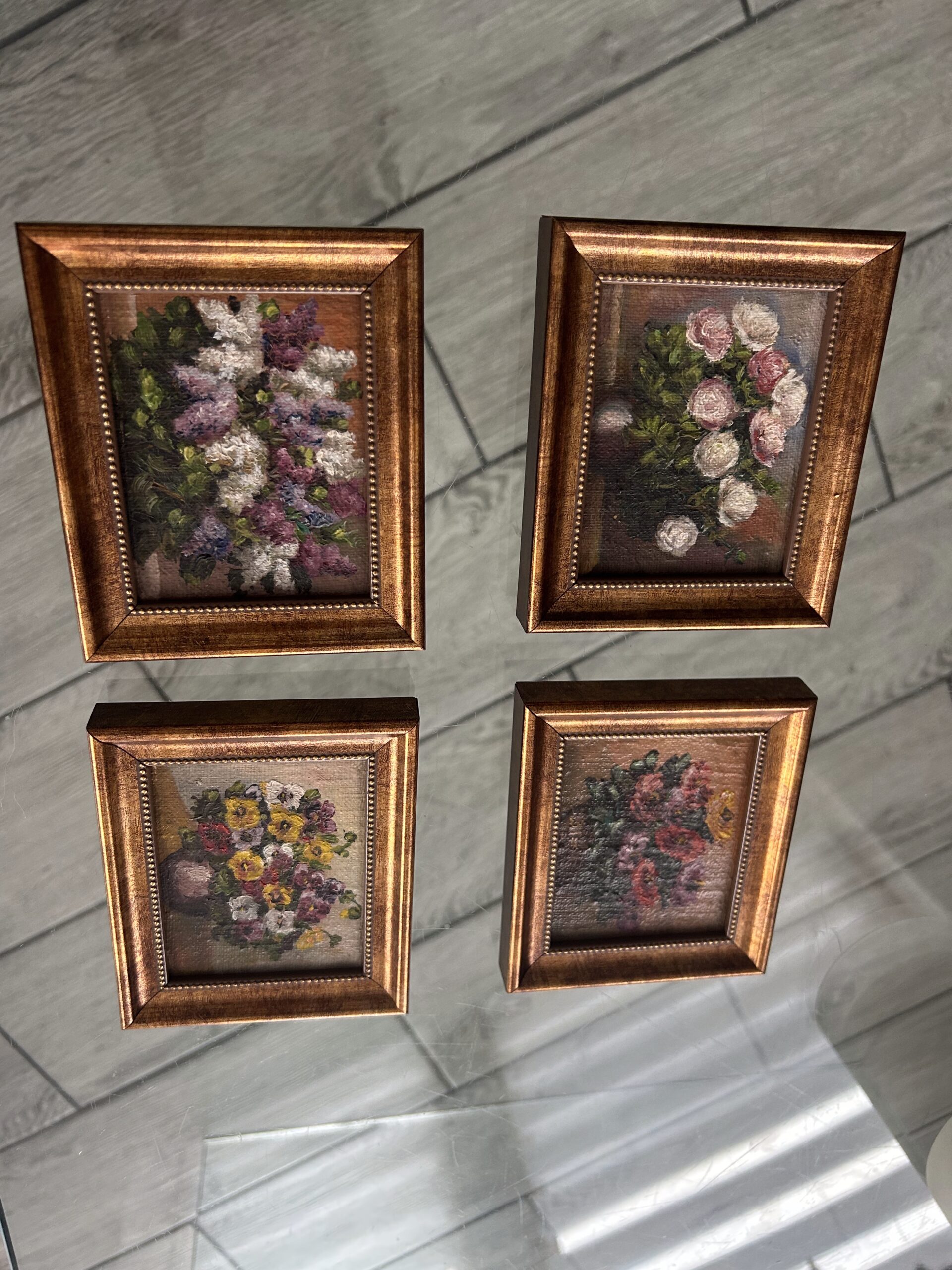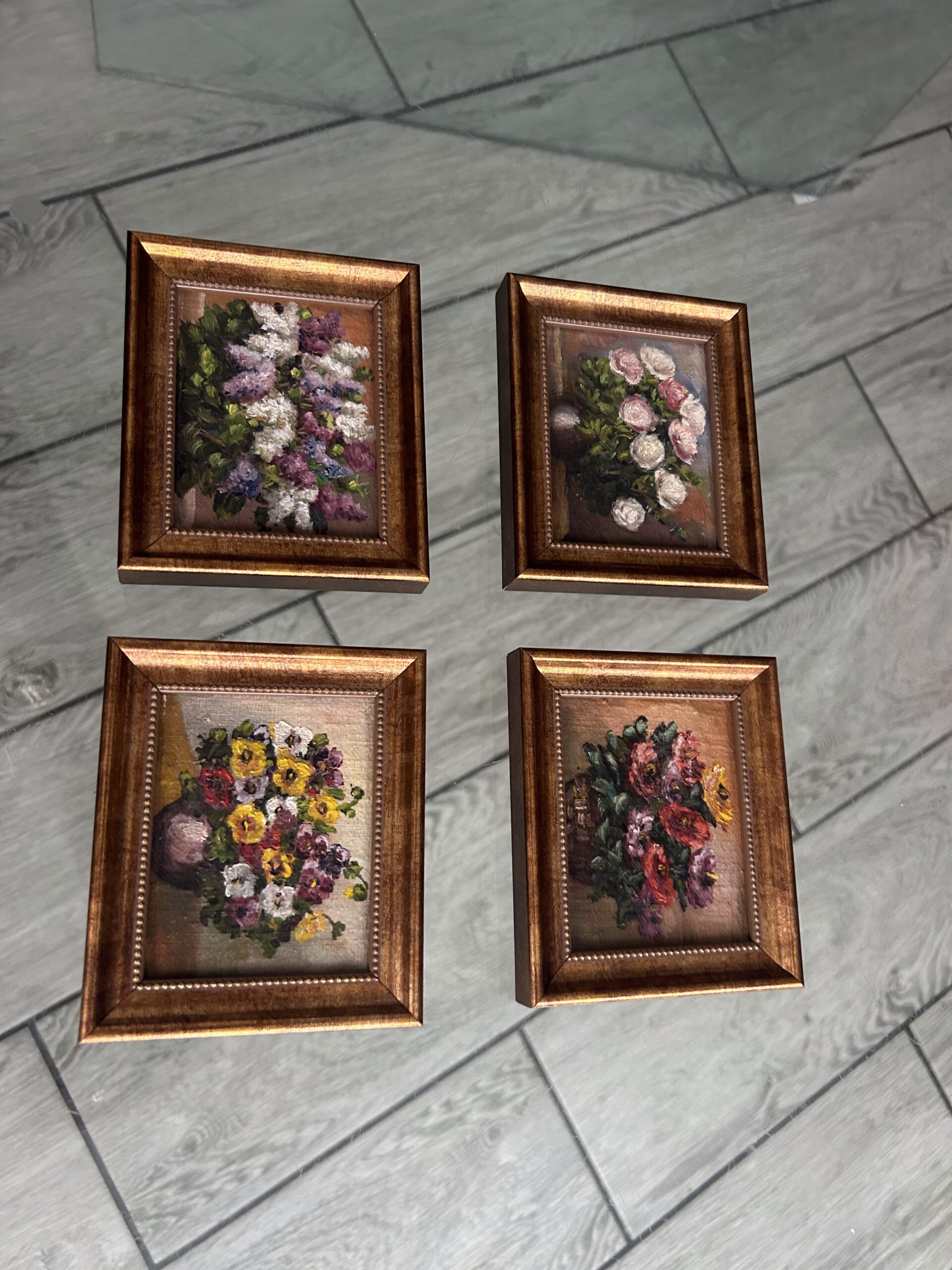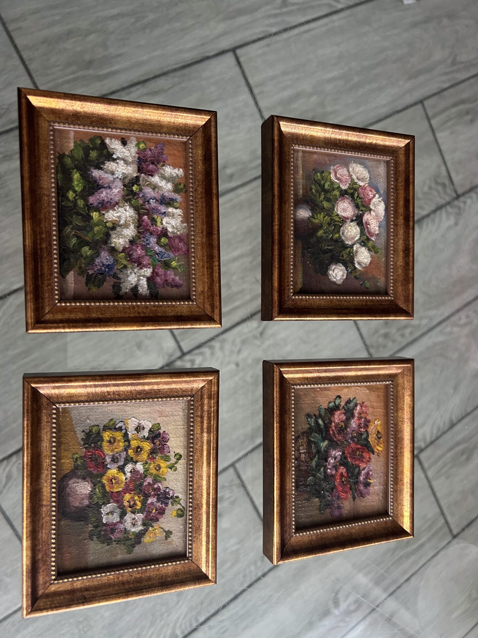 Zestaw czterech pięknych obrazków przedstawiających motywy kwiatowe, wykonanych techniką olejną na desce. Każdy obrazek jest oprawiony w elegancką złotą ramkę, co nadaje im wyjątkowego charakteru. Idealny dodatek do wnętrz o klasycznym lub romantycznym wystroju.
