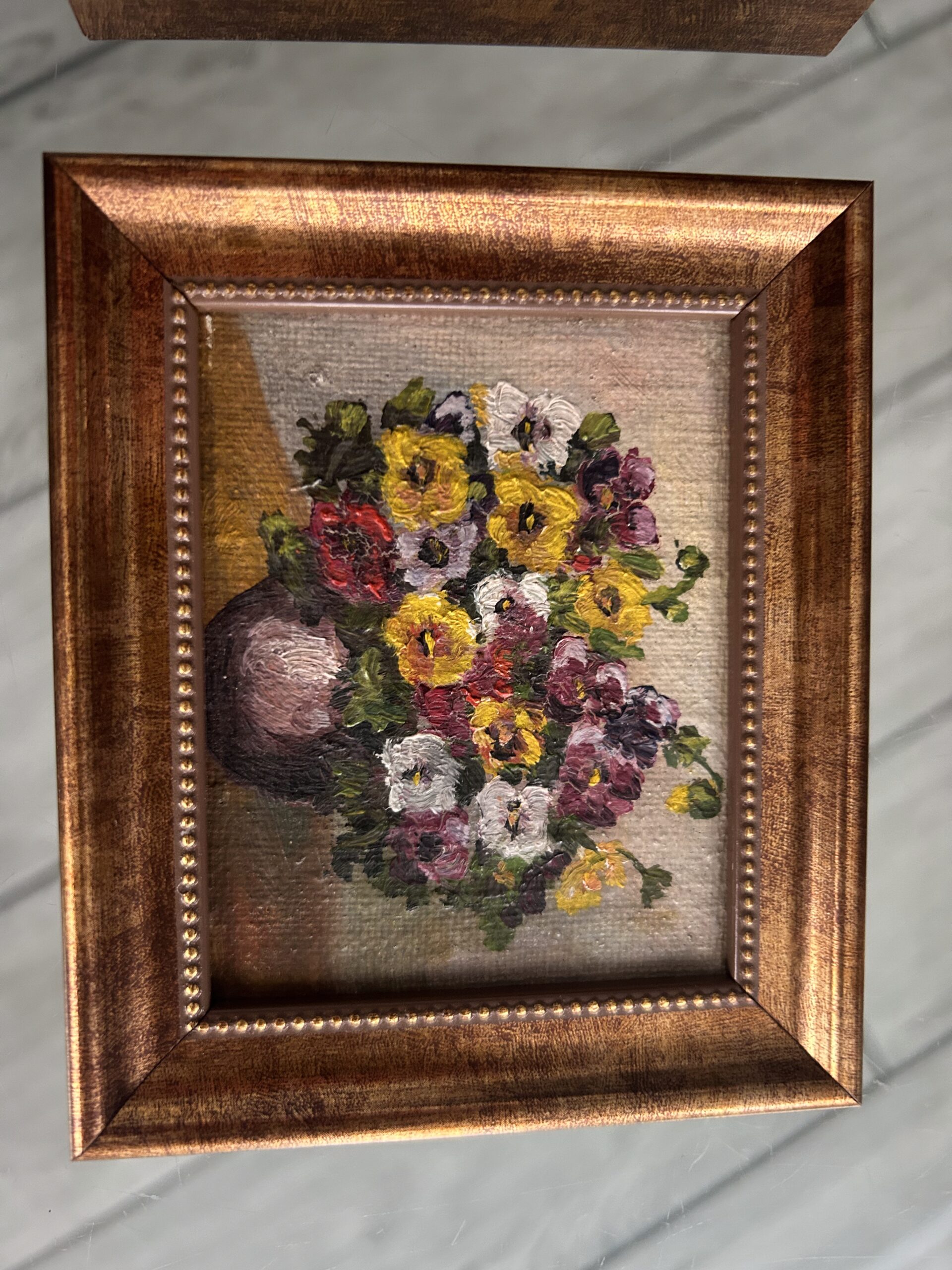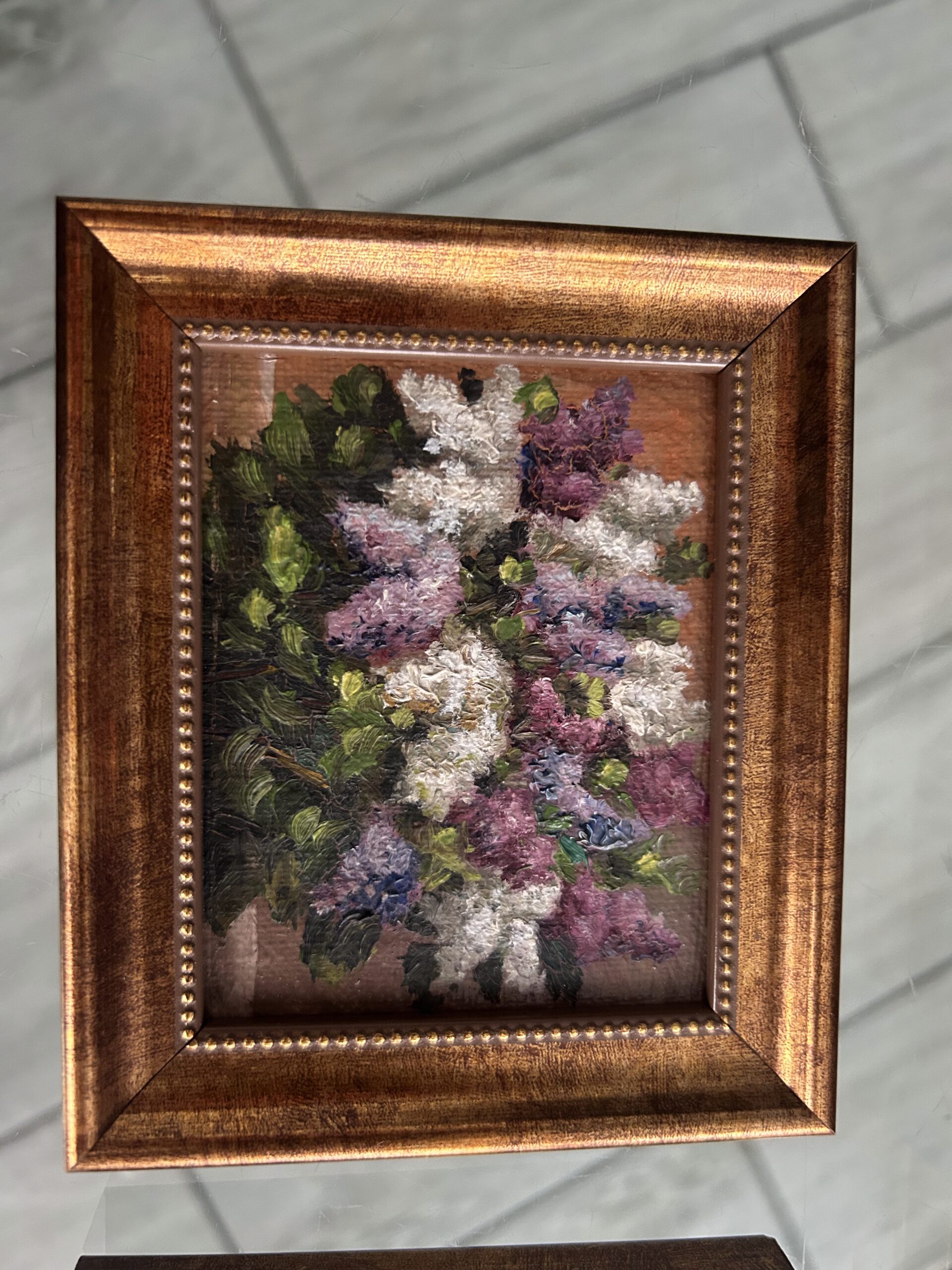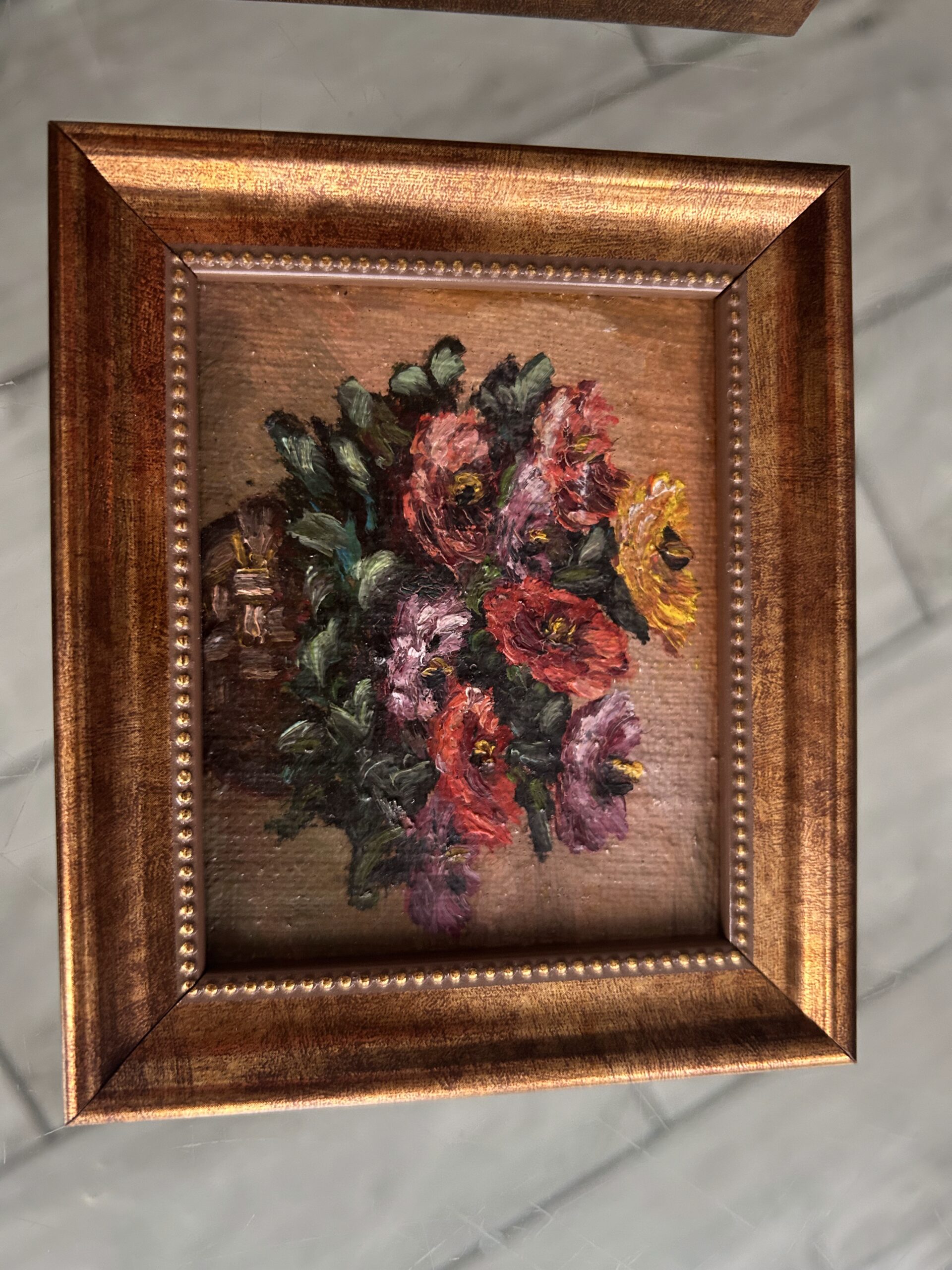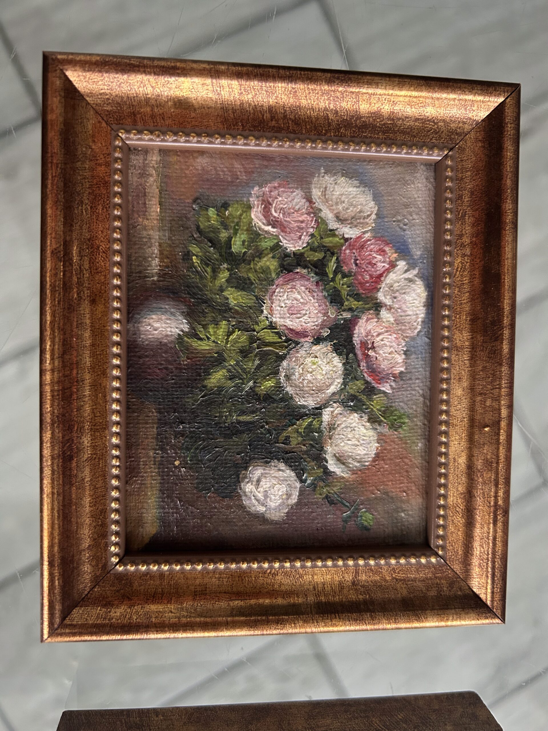 Zestaw czterech pięknych obrazków przedstawiających motywy kwiatowe, wykonanych techniką olejną na desce. Każdy obrazek jest oprawiony w elegancką złotą ramkę, co nadaje im wyjątkowego charakteru. Idealny dodatek do wnętrz o klasycznym lub romantycznym wystroju.