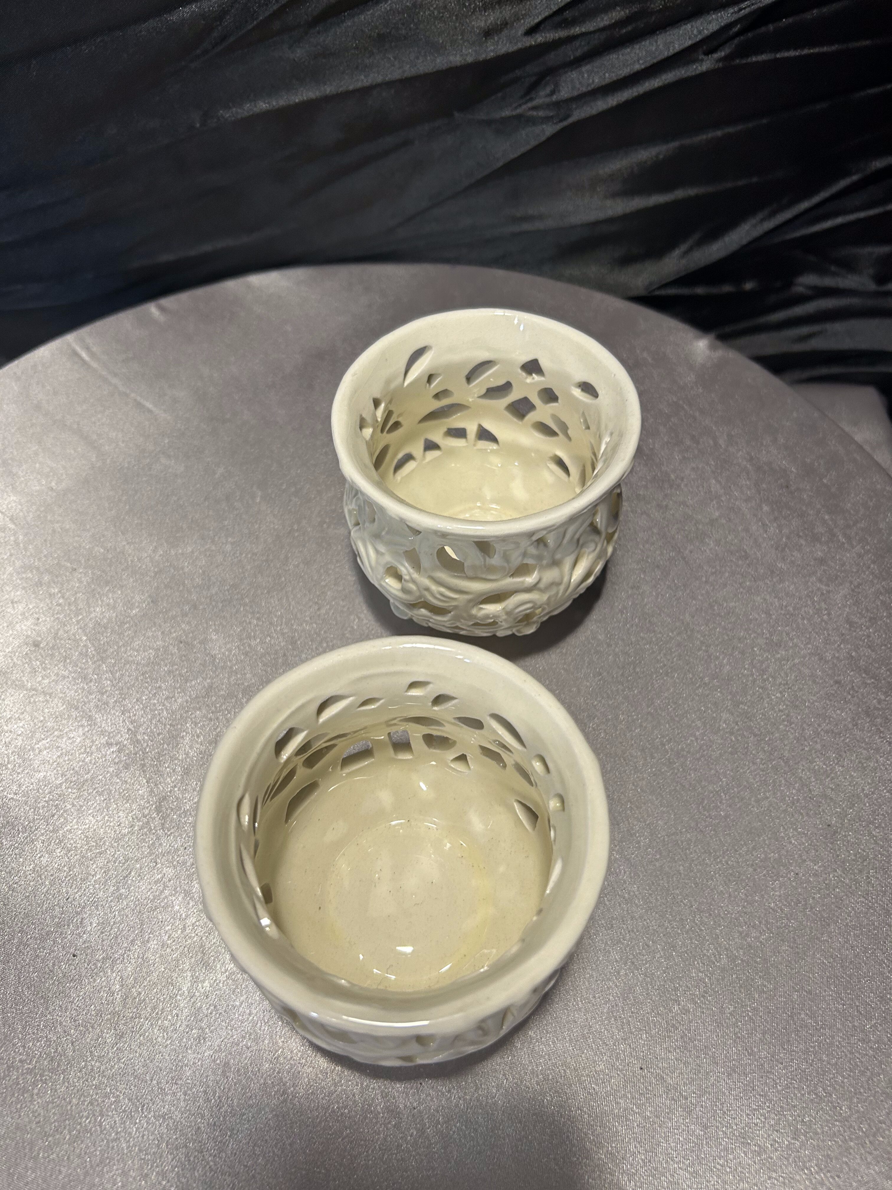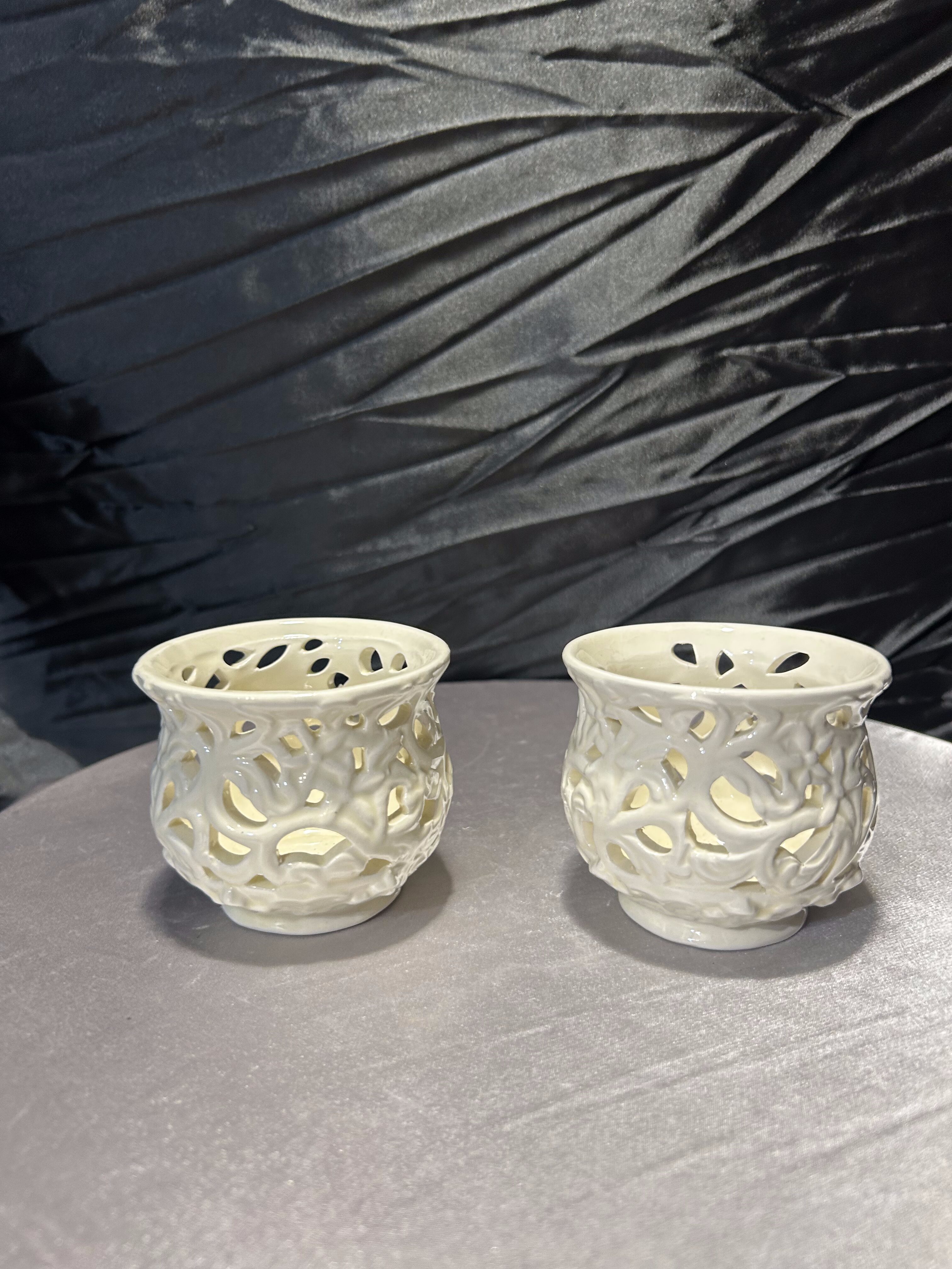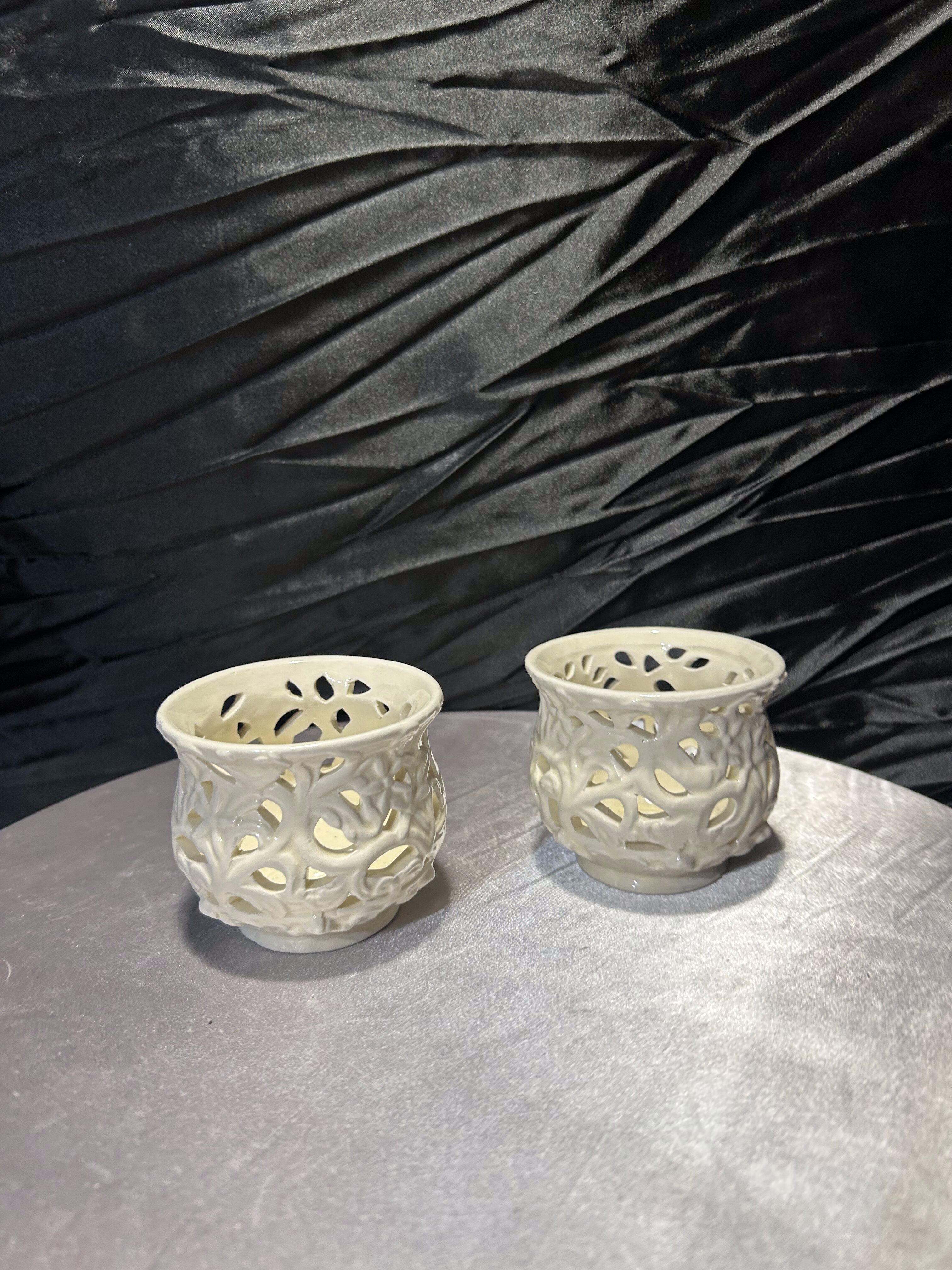 - Komplet ażurowych świeczników ceramicznych – kolor ecru – styl dekoracyjny