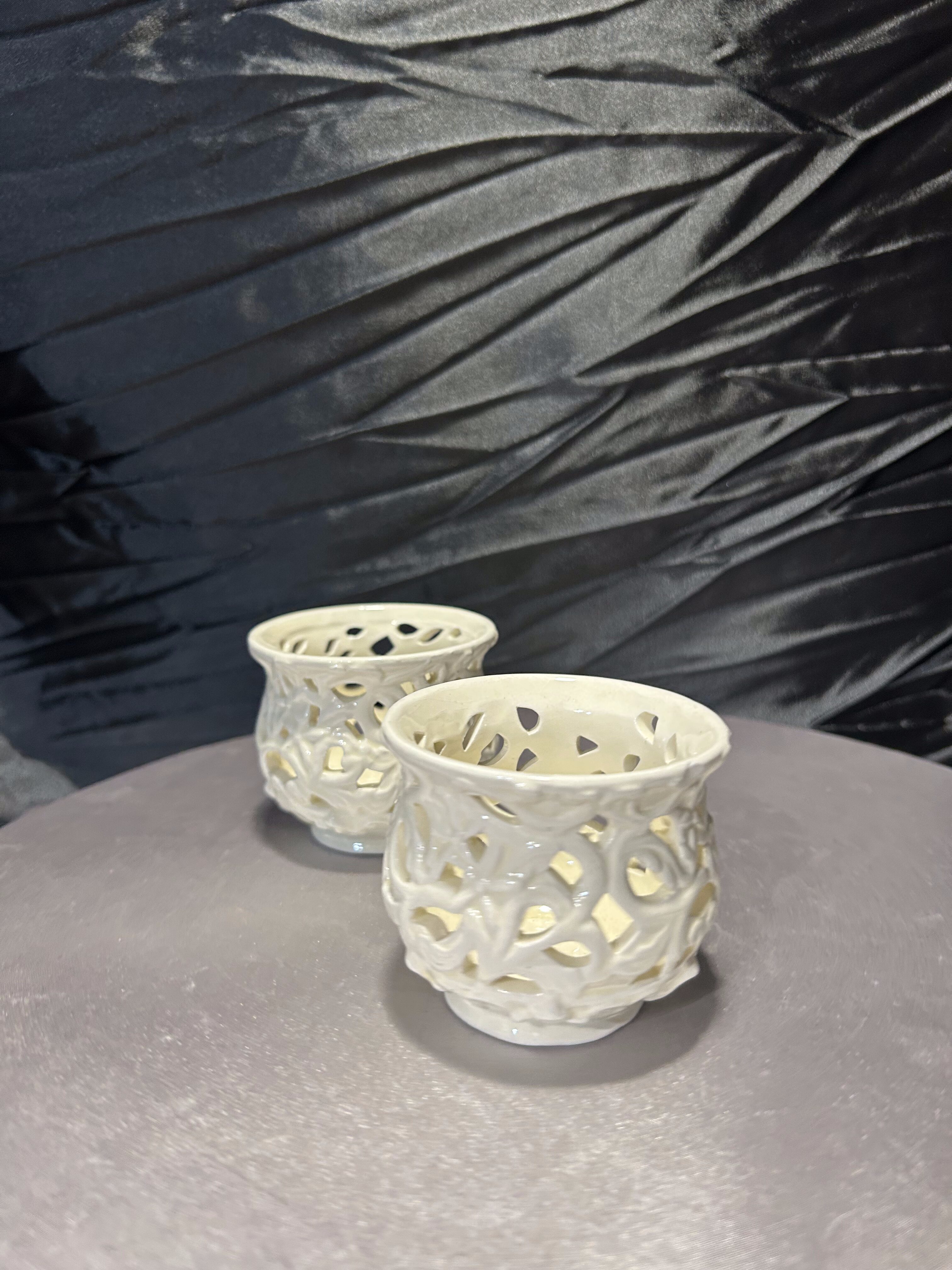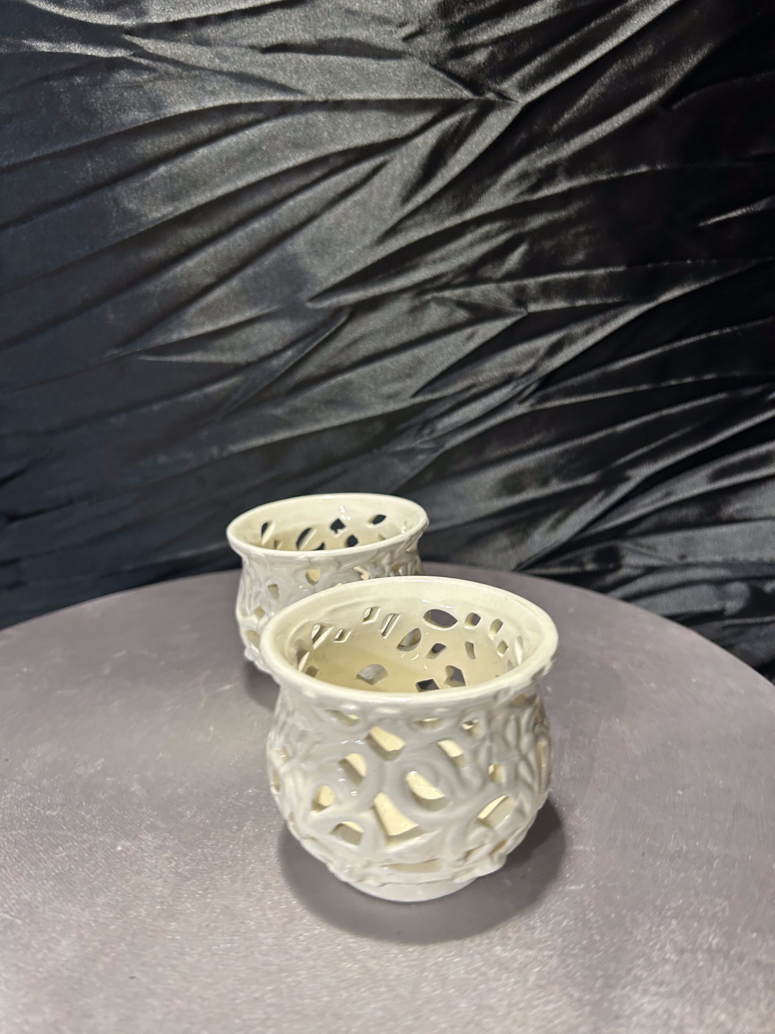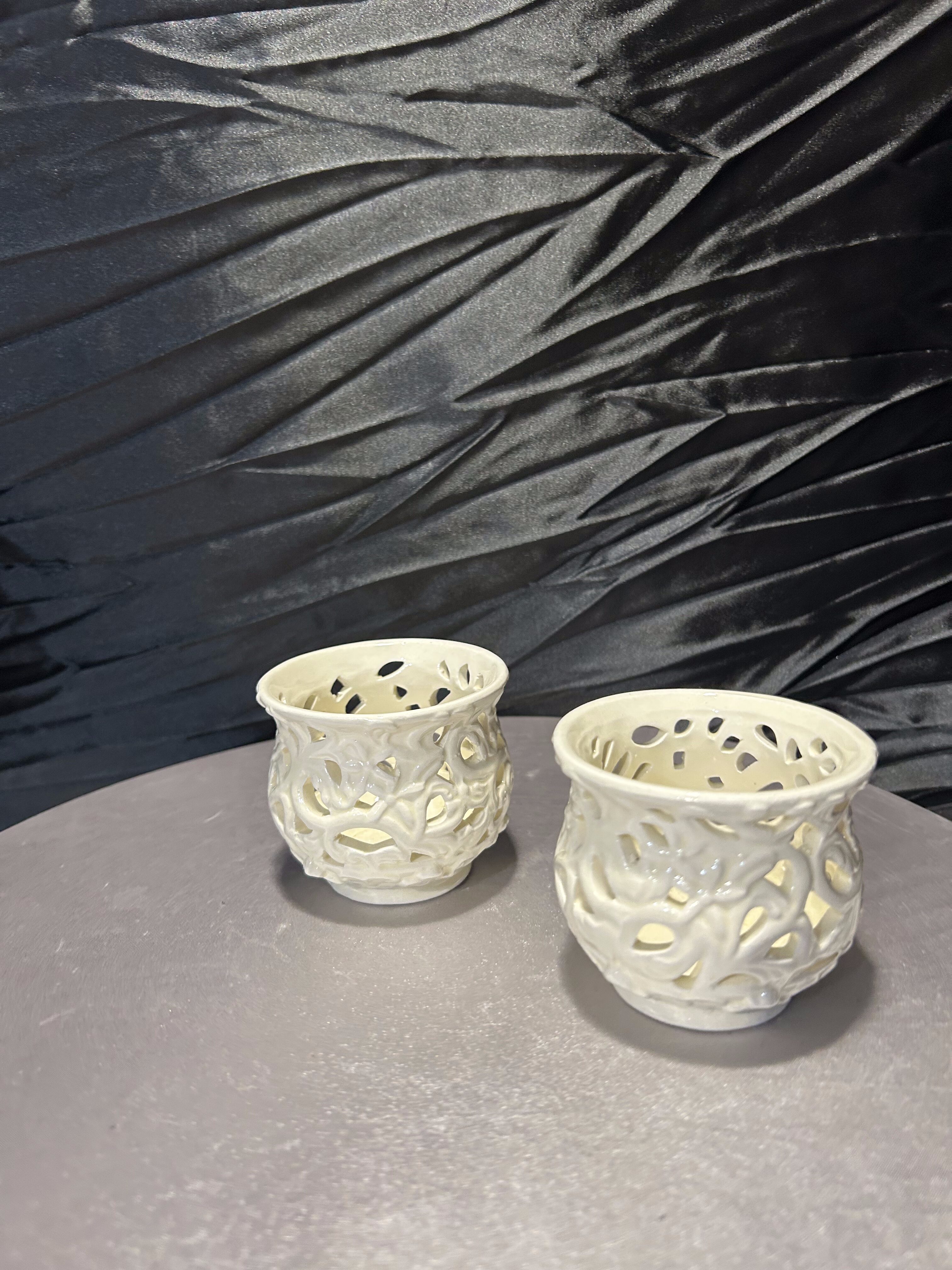 Zestaw dwóch eleganckich, ażurowych świeczników ceramicznych w odcieniu ecru. Wykonane z dbałością o detale, prezentują delikatny, koronkowy wzór, który po zapaleniu świecy tworzy efektowne, świetlne refleksy na otoczeniu. Idealne do wprowadzenia nastrojowej atmosfery w salonie, sypialni czy na tarasie. Świetnie sprawdzą się jako dekoracja stołu podczas kolacji lub element aranżacji wnętrza w stylu romantycznym czy boho.
