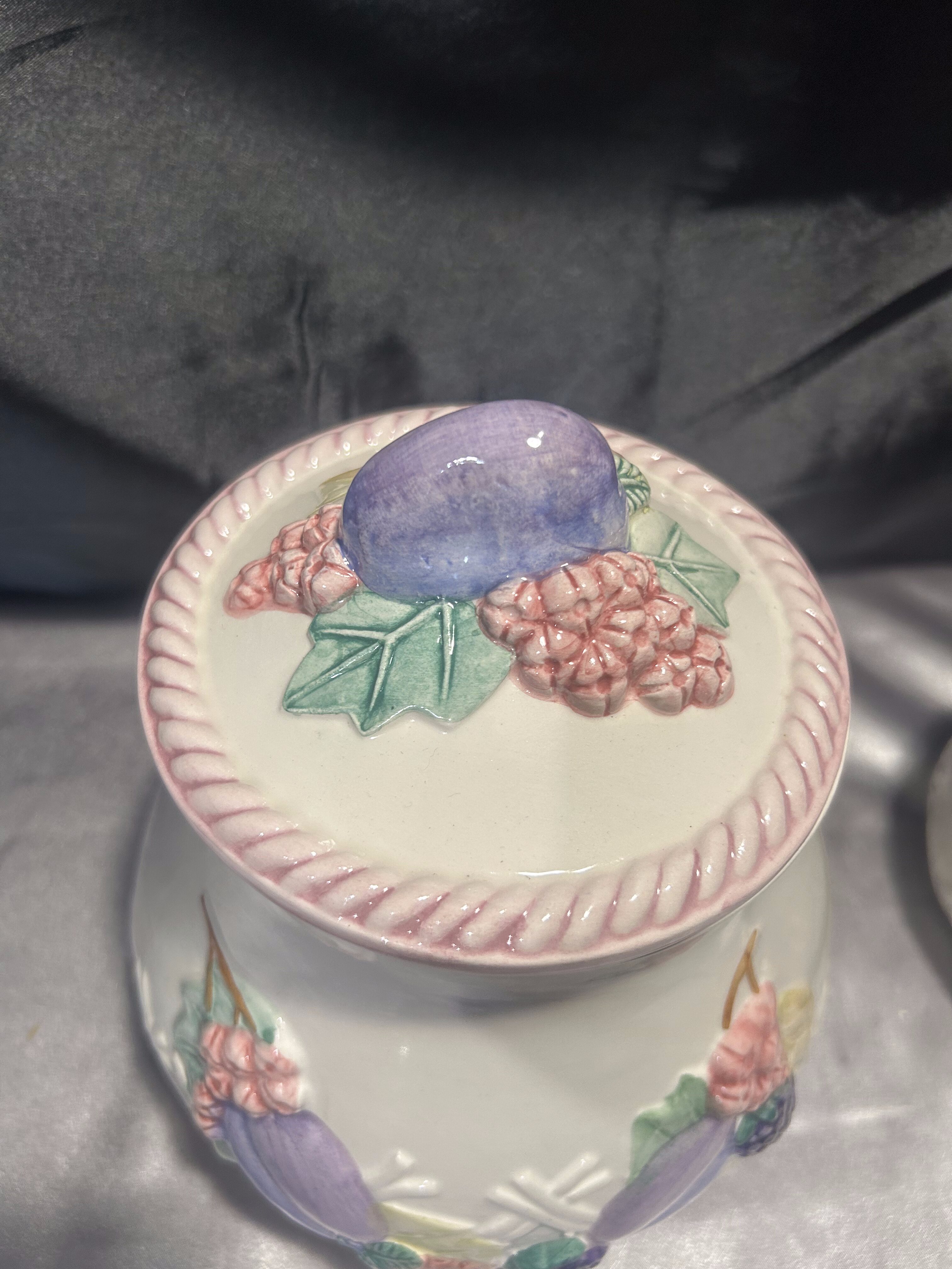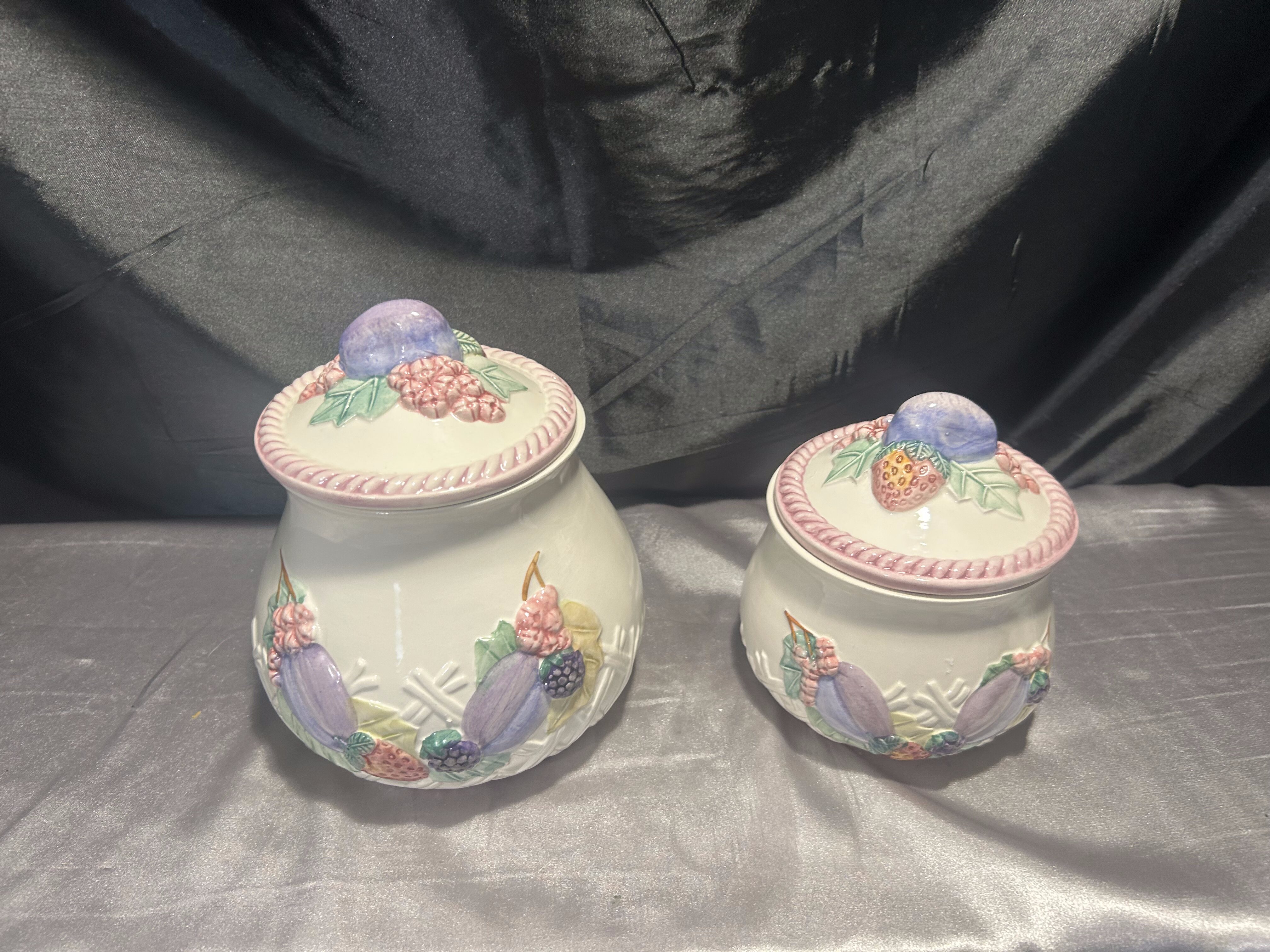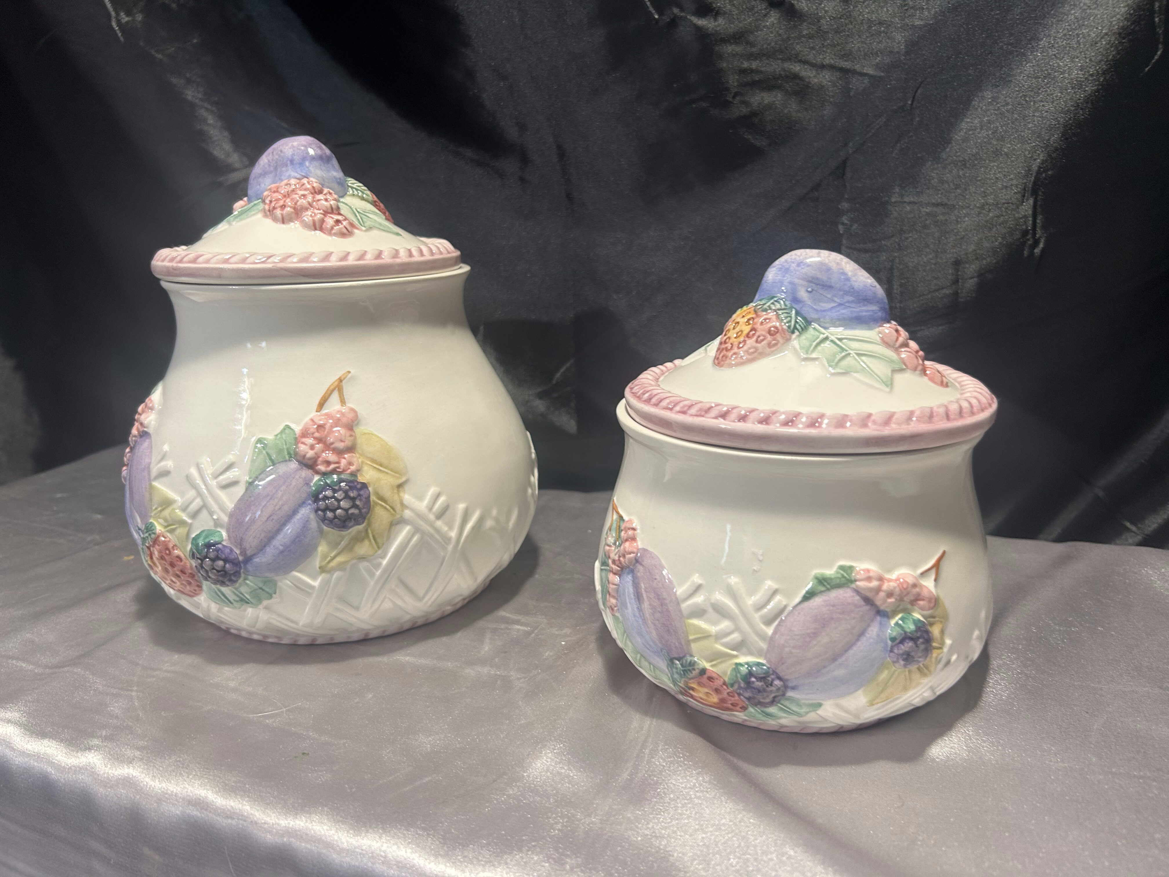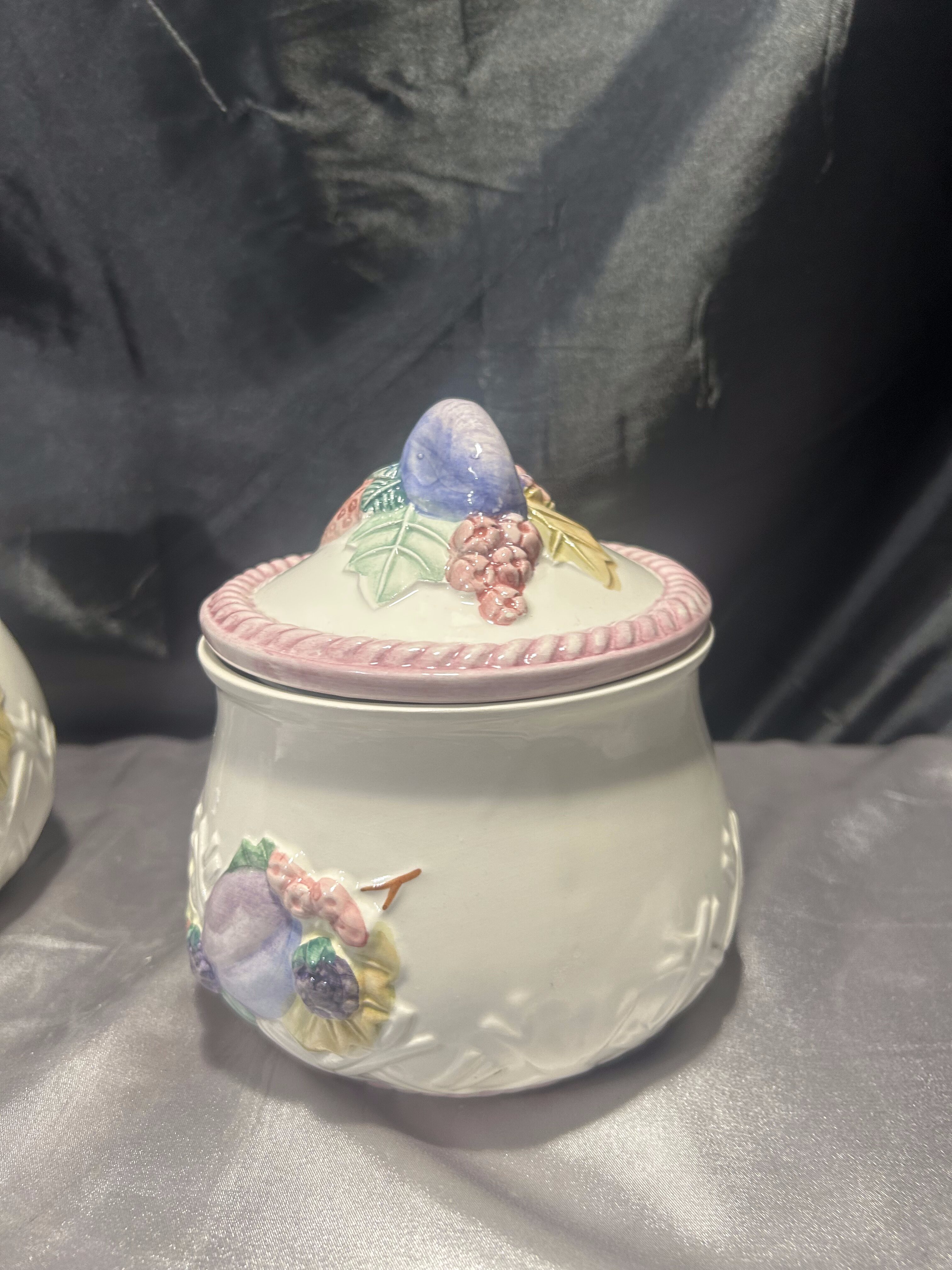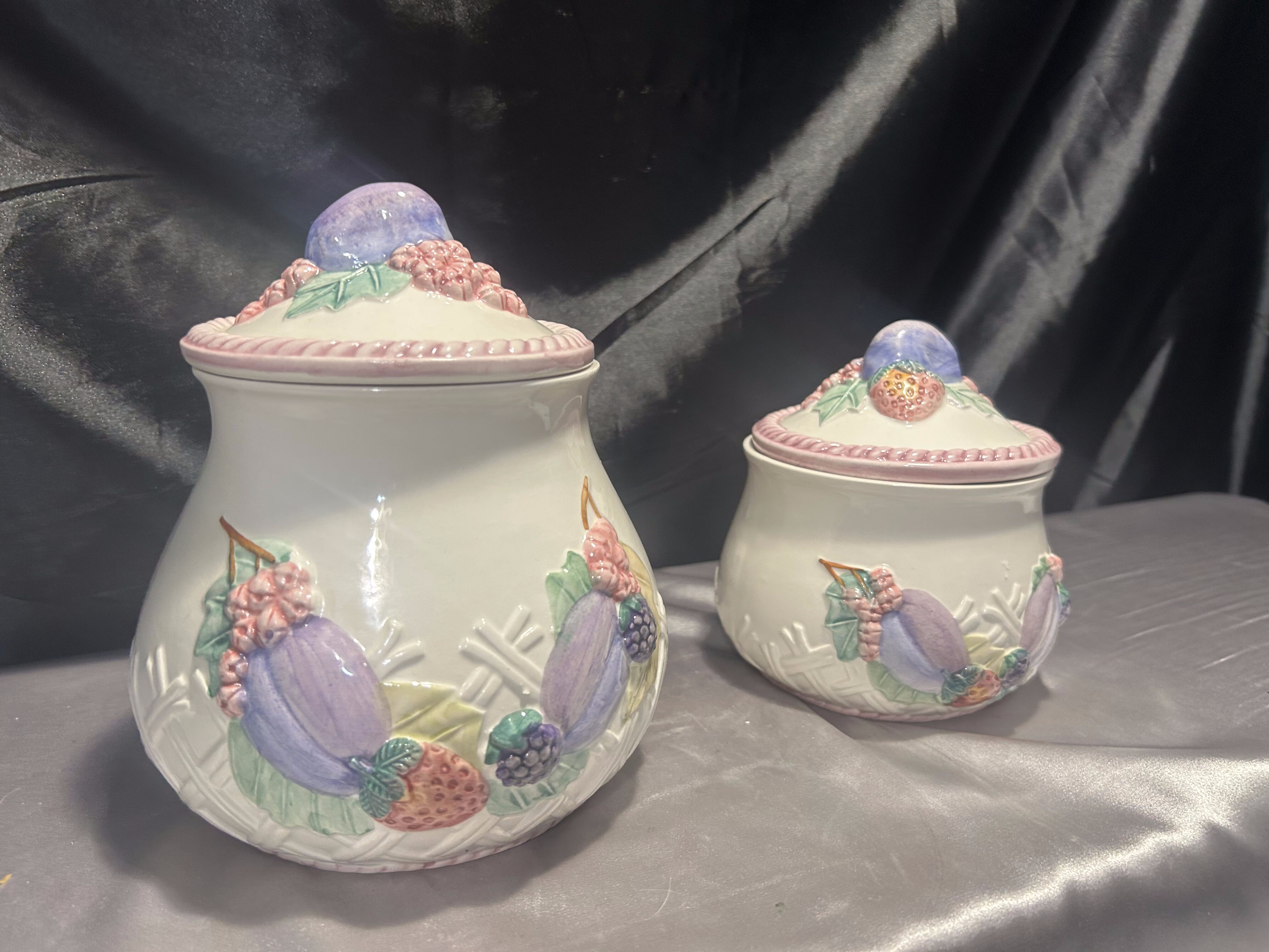 Przepiękny zestaw dwóch ceramicznych pojemników kuchennych z pokrywkami, dekorowanych w stylu rustykalnym z kolorowym, wypukłym motywem owoców leśnych. Obie sztuki tworzą harmonijną całość i będą doskonałą dekoracją kuchennej półki, a przy tym praktycznym miejscem do przechowywania produktów sypkich lub słodkości.