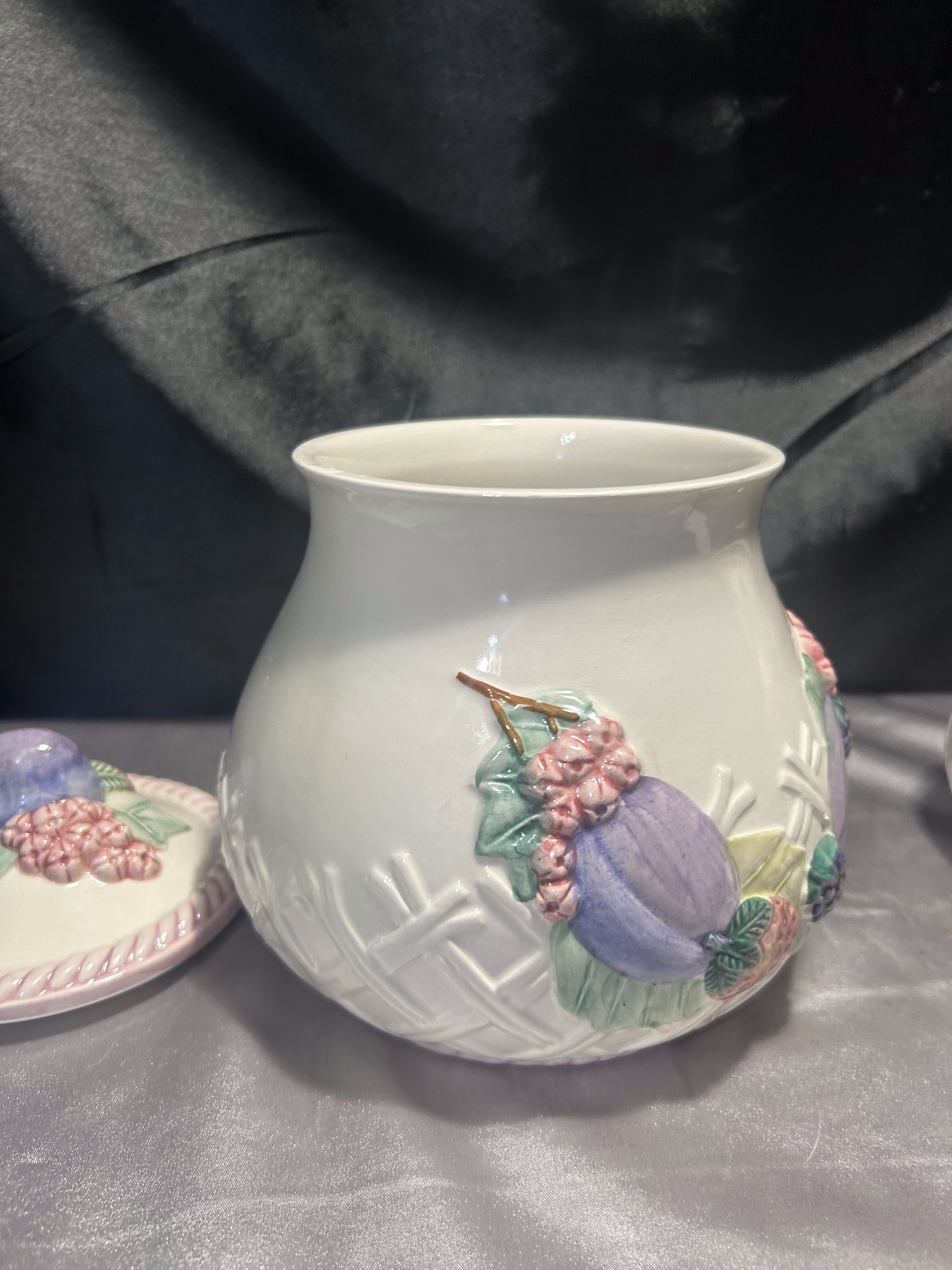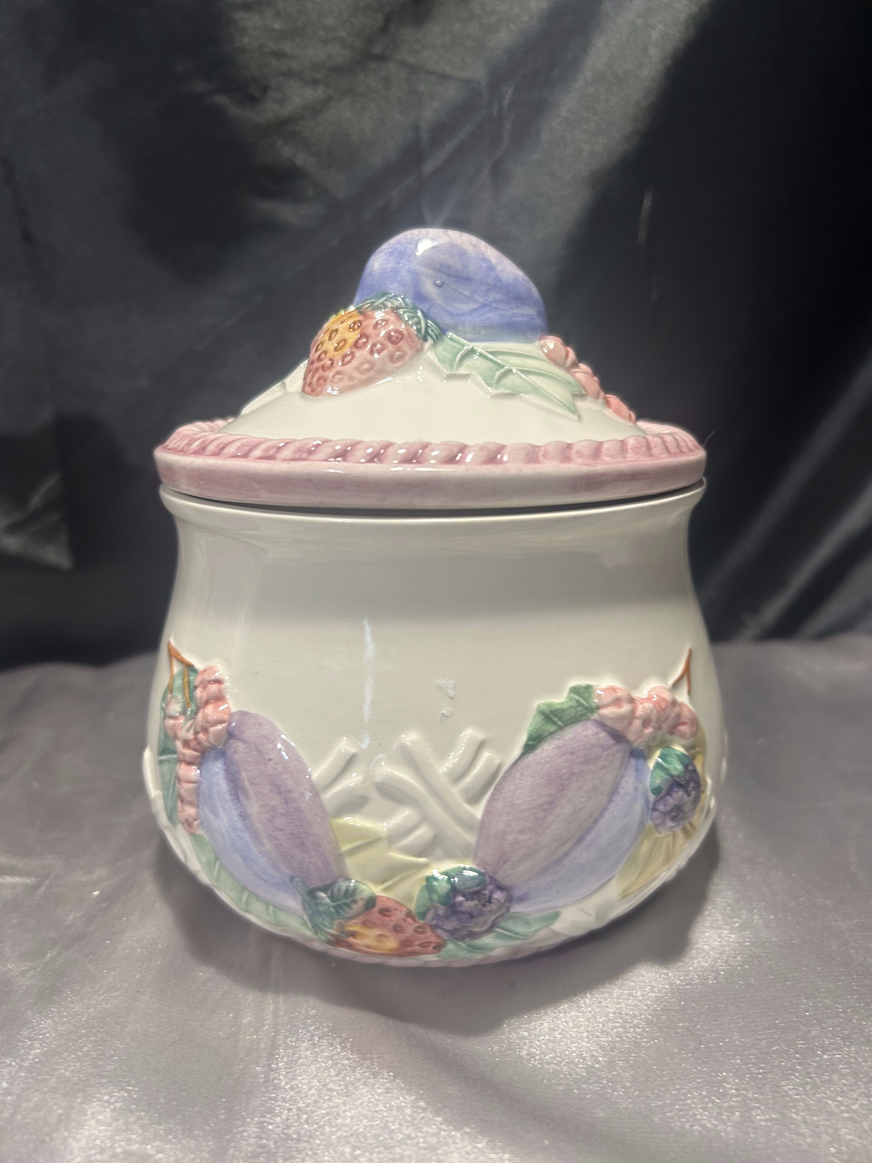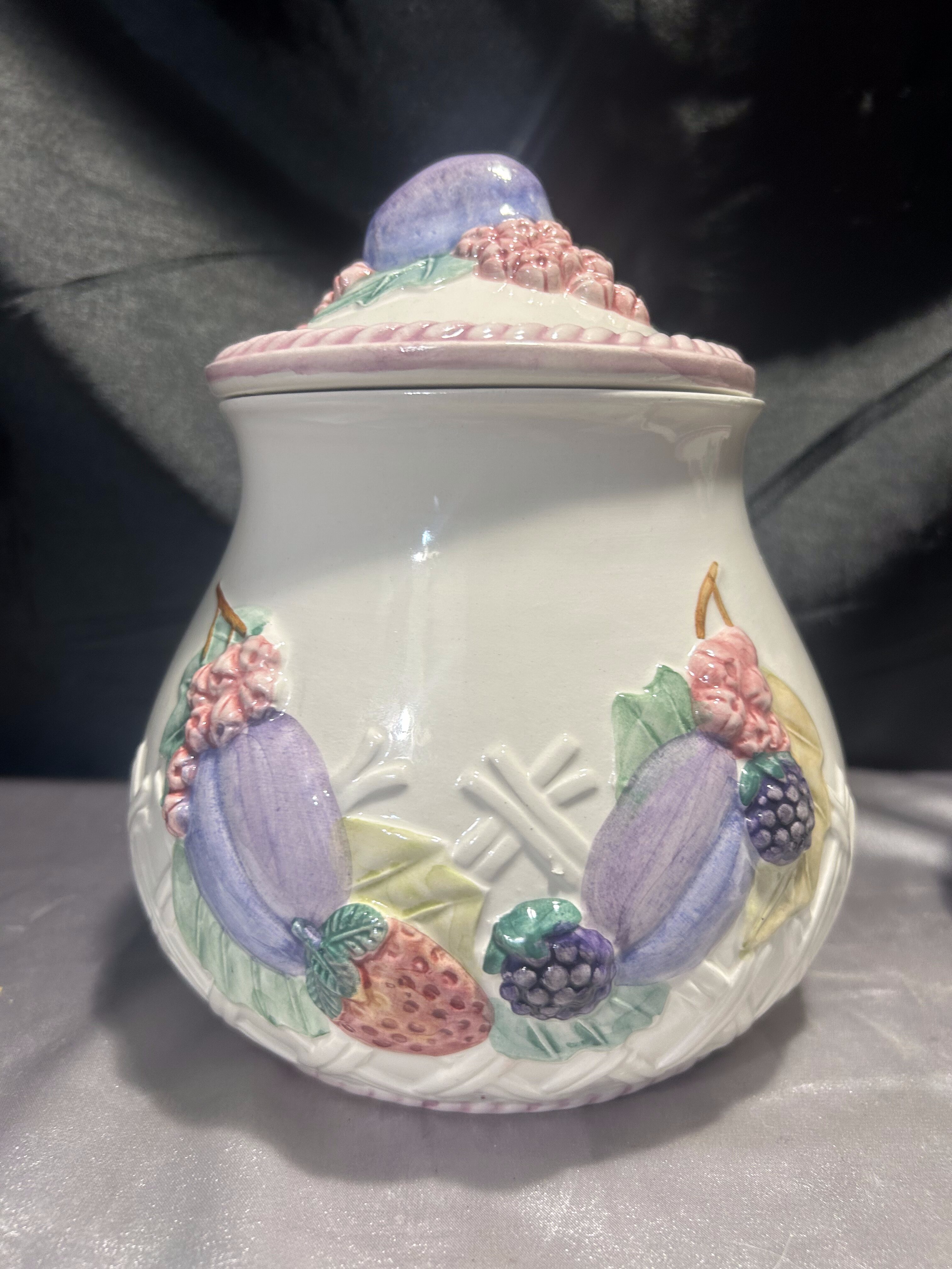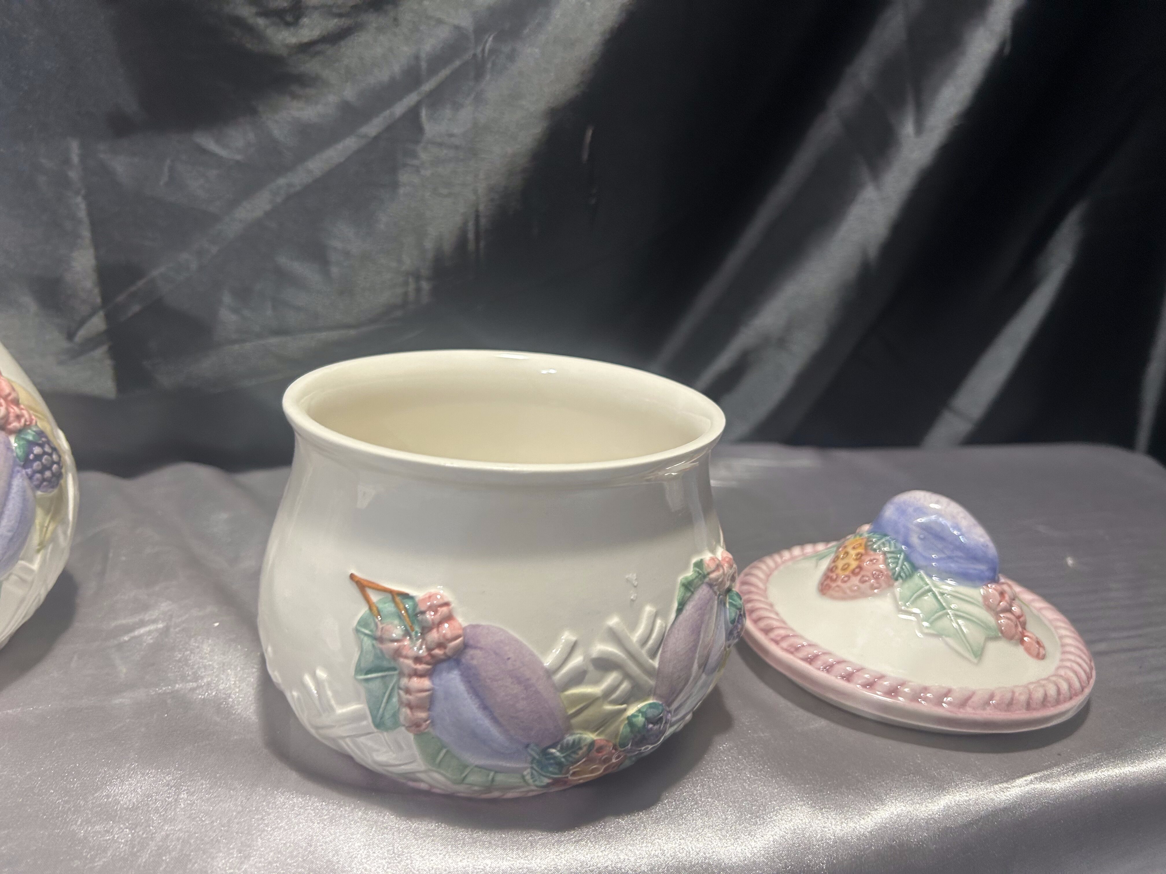 Przepiękny zestaw dwóch ceramicznych pojemników kuchennych z pokrywkami, dekorowanych w stylu rustykalnym z kolorowym, wypukłym motywem owoców leśnych. Obie sztuki tworzą harmonijną całość i będą doskonałą dekoracją kuchennej półki, a przy tym praktycznym miejscem do przechowywania produktów sypkich lub słodkości.
