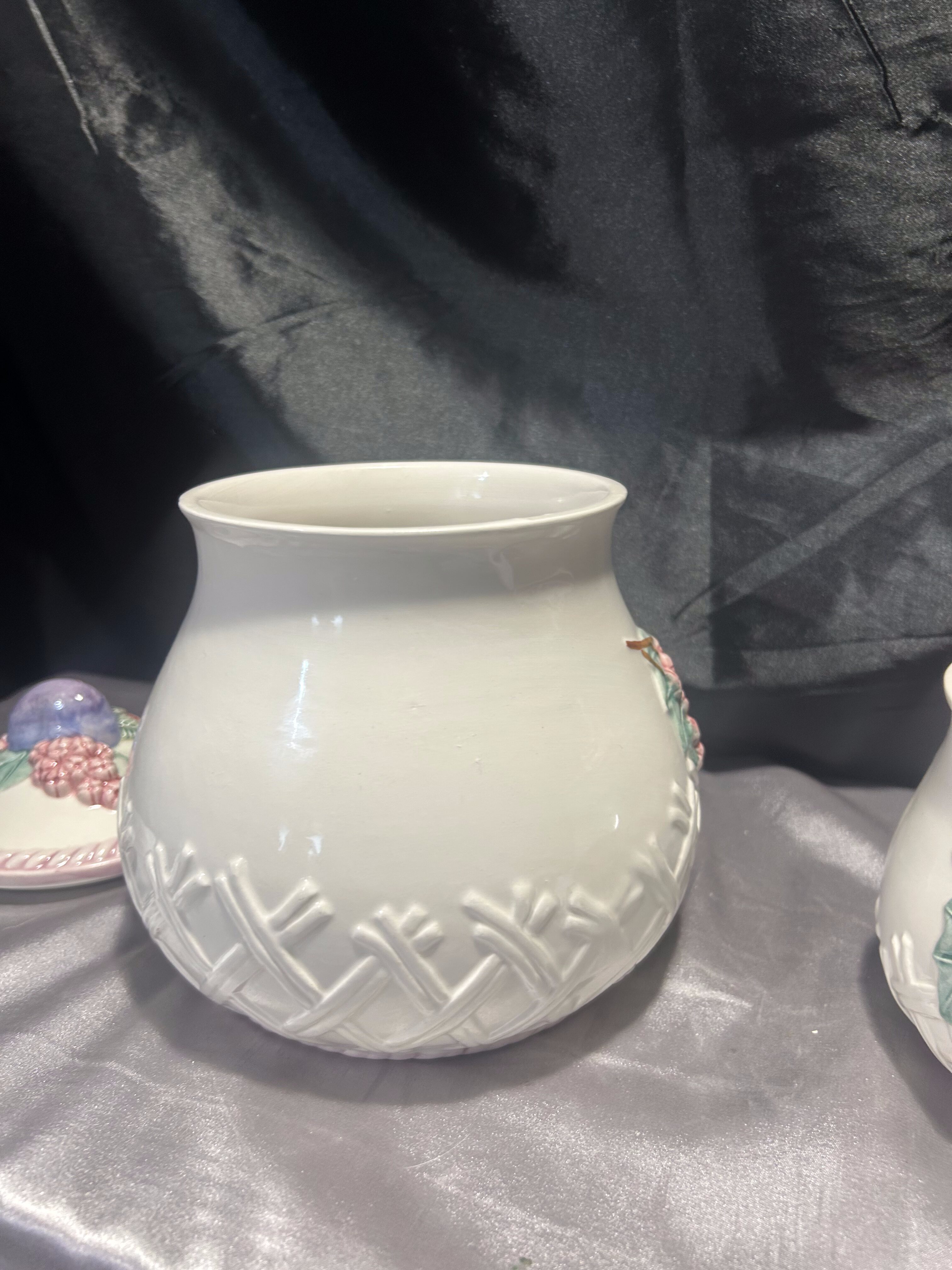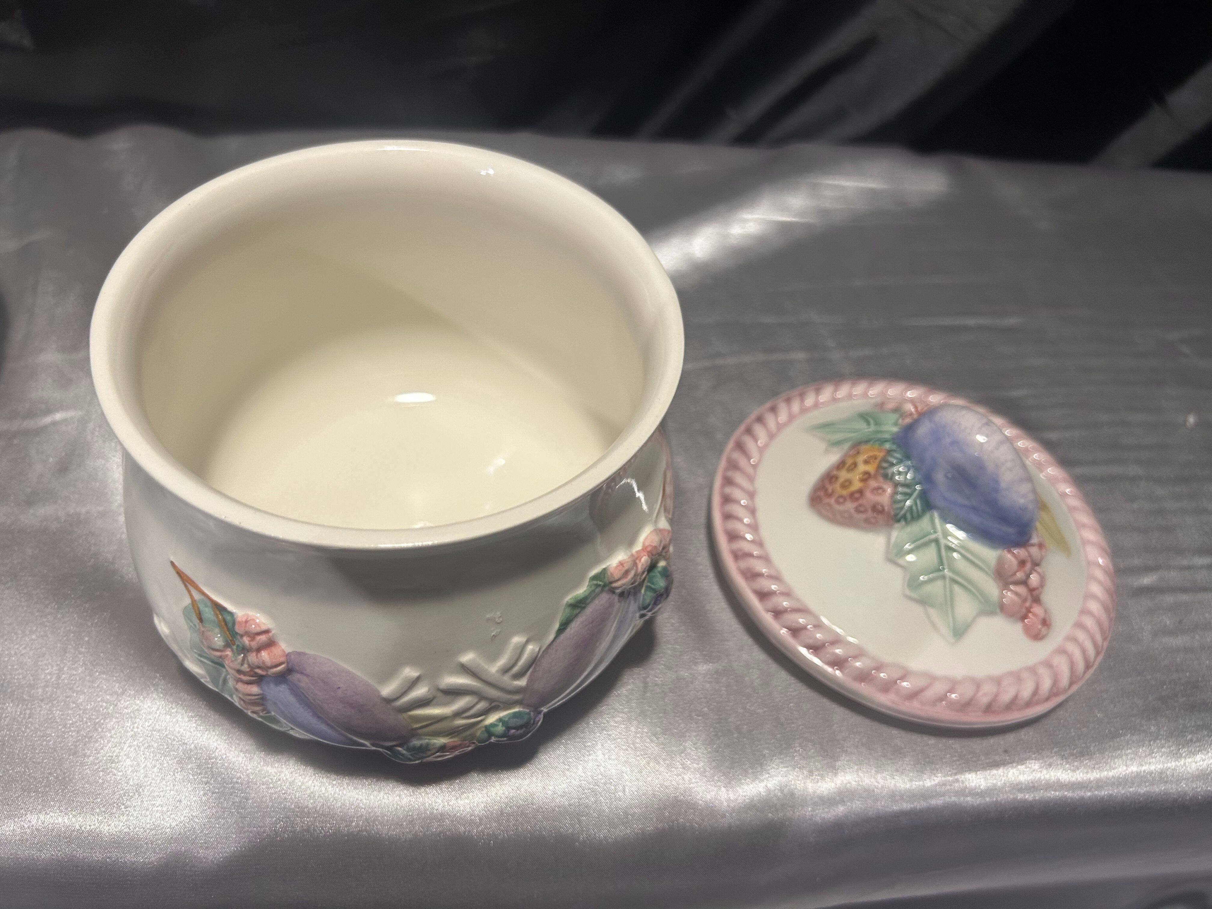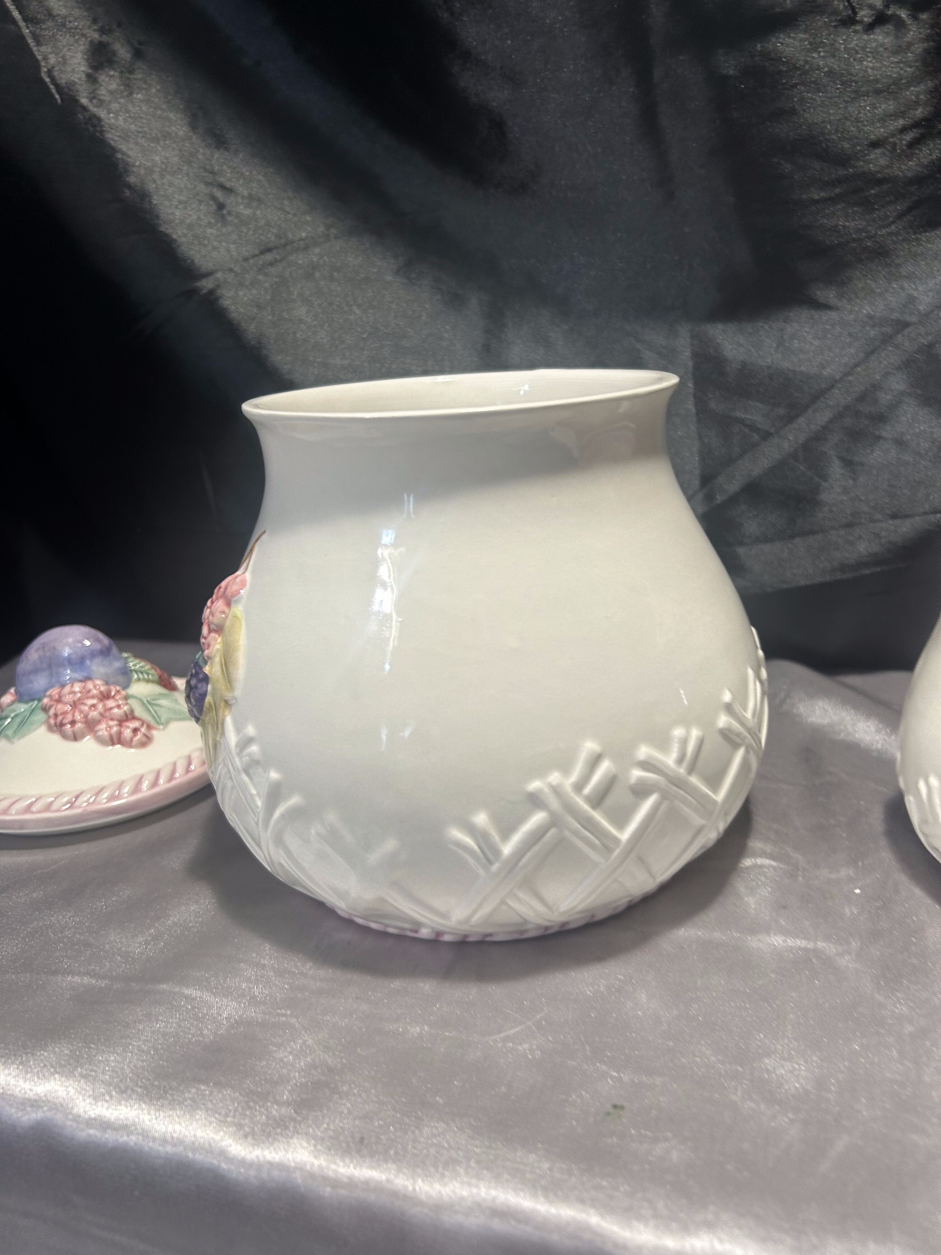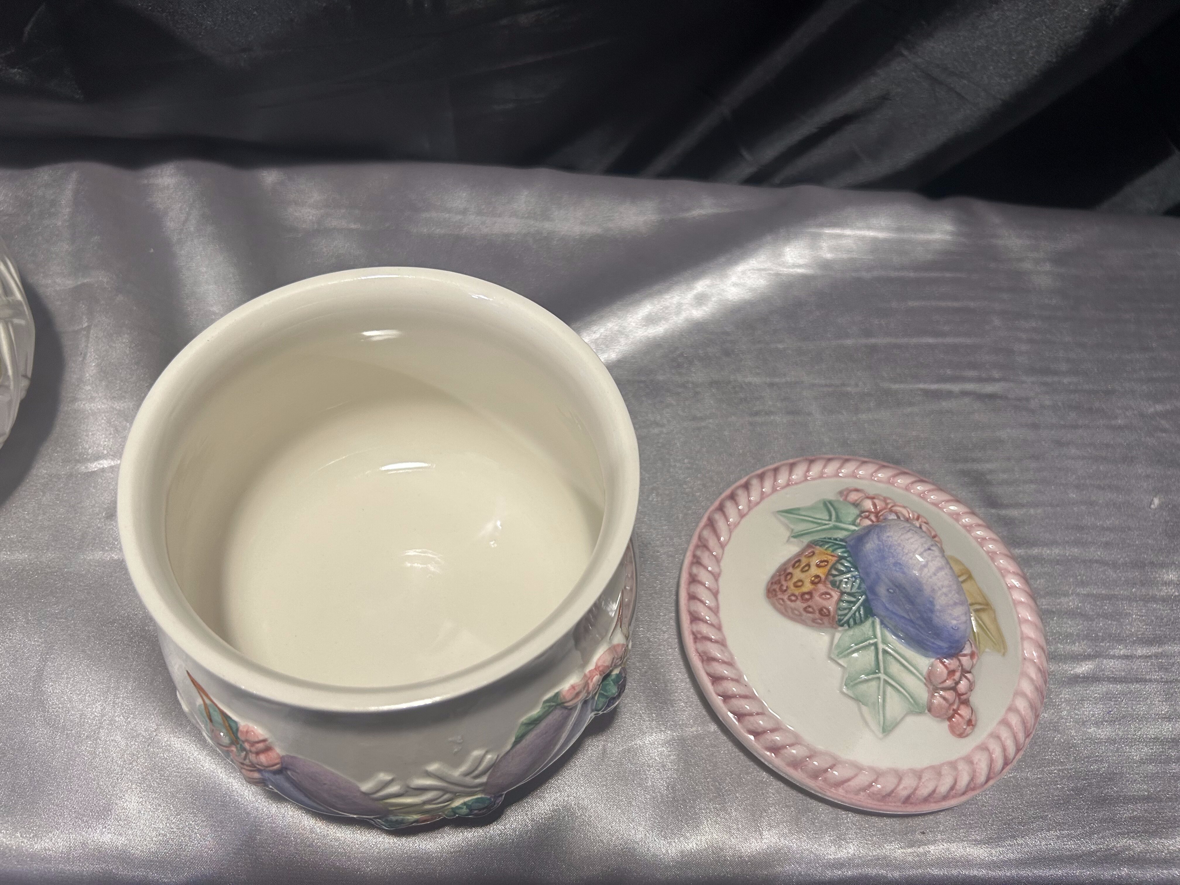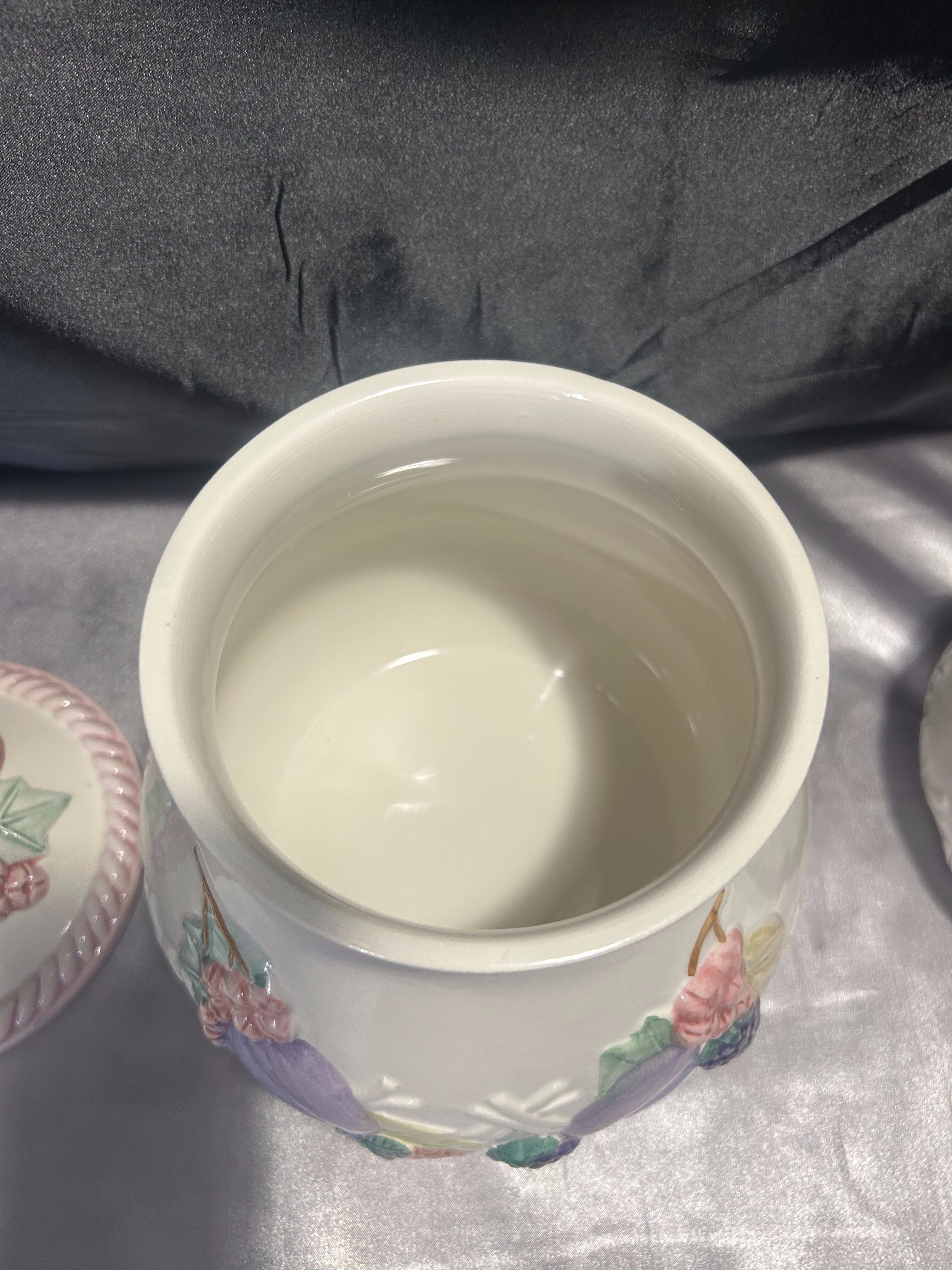 Przepiękny zestaw dwóch ceramicznych pojemników kuchennych z pokrywkami, dekorowanych w stylu rustykalnym z kolorowym, wypukłym motywem owoców leśnych. Obie sztuki tworzą harmonijną całość i będą doskonałą dekoracją kuchennej półki, a przy tym praktycznym miejscem do przechowywania produktów sypkich lub słodkości.