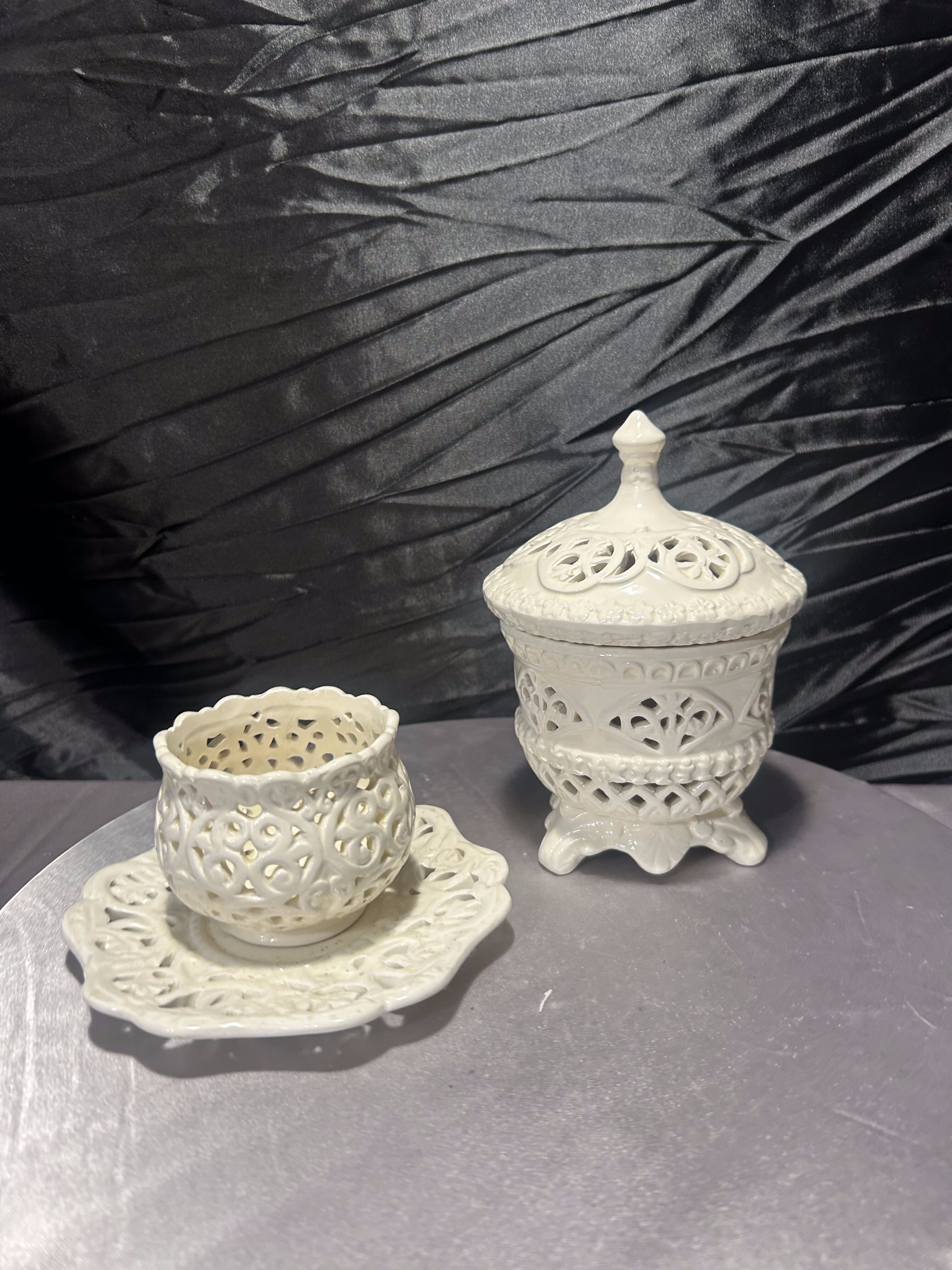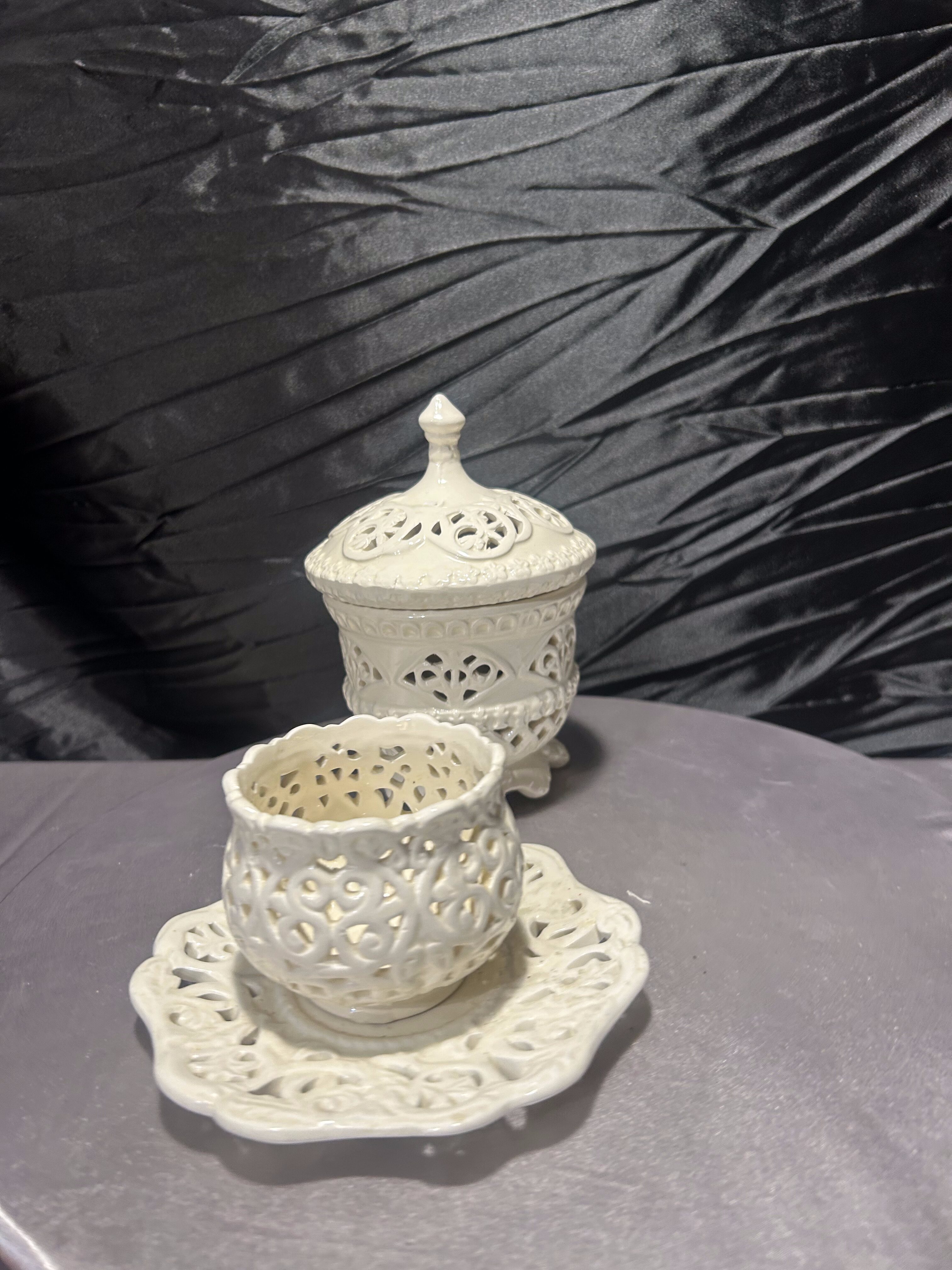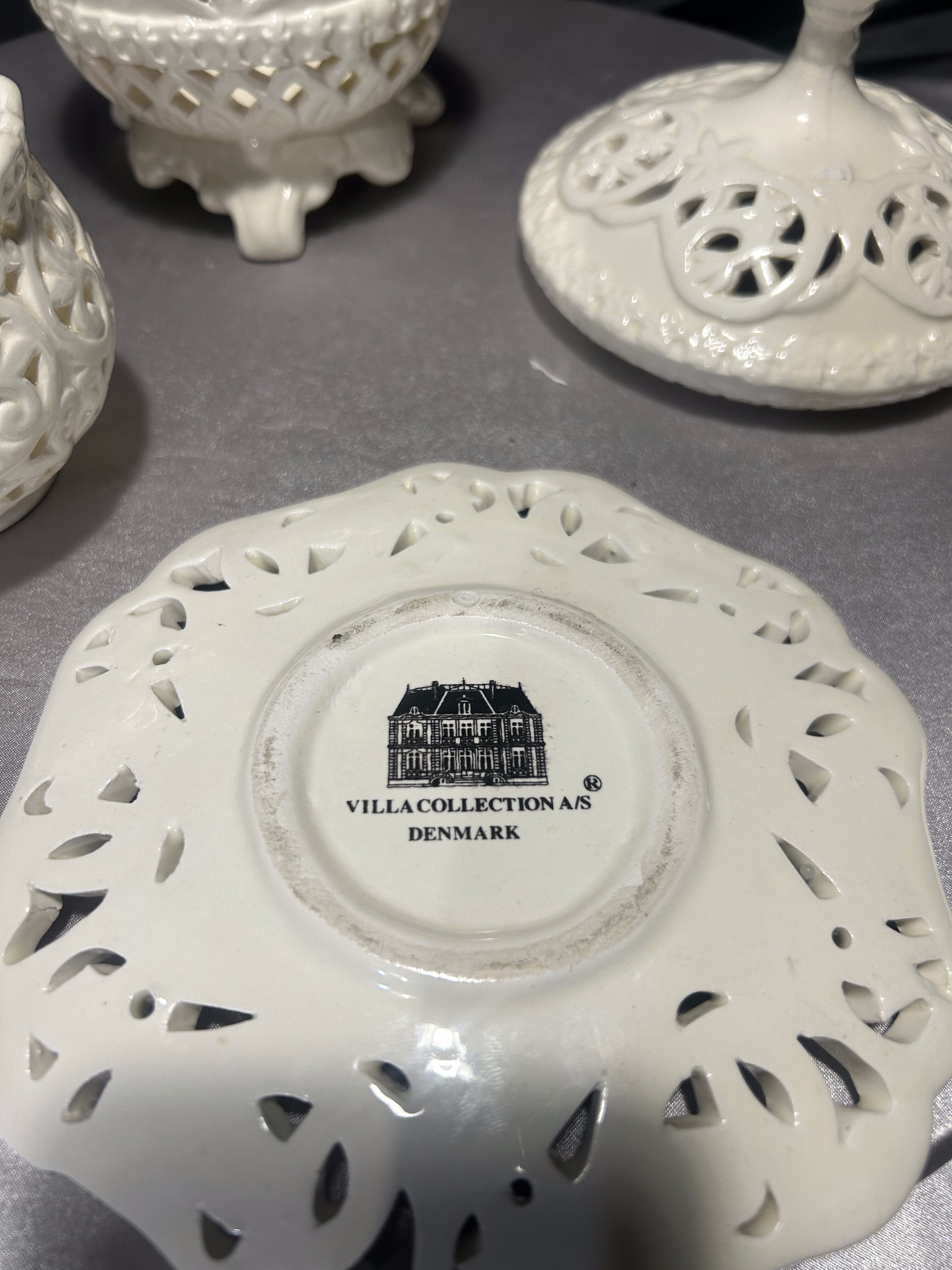 Wykonane z wysokiej jakości ceramiki w jasnym, kremowym odcieniu. Finezyjne ażurowe wzory nadają im lekkości i elegancji, charakterystycznej dla skandynawskiego designu. Obydwa elementy posiadają sygnaturę Villa Collection A/S Denmark, świadczącą o ich oryginalnym pochodzeniu.