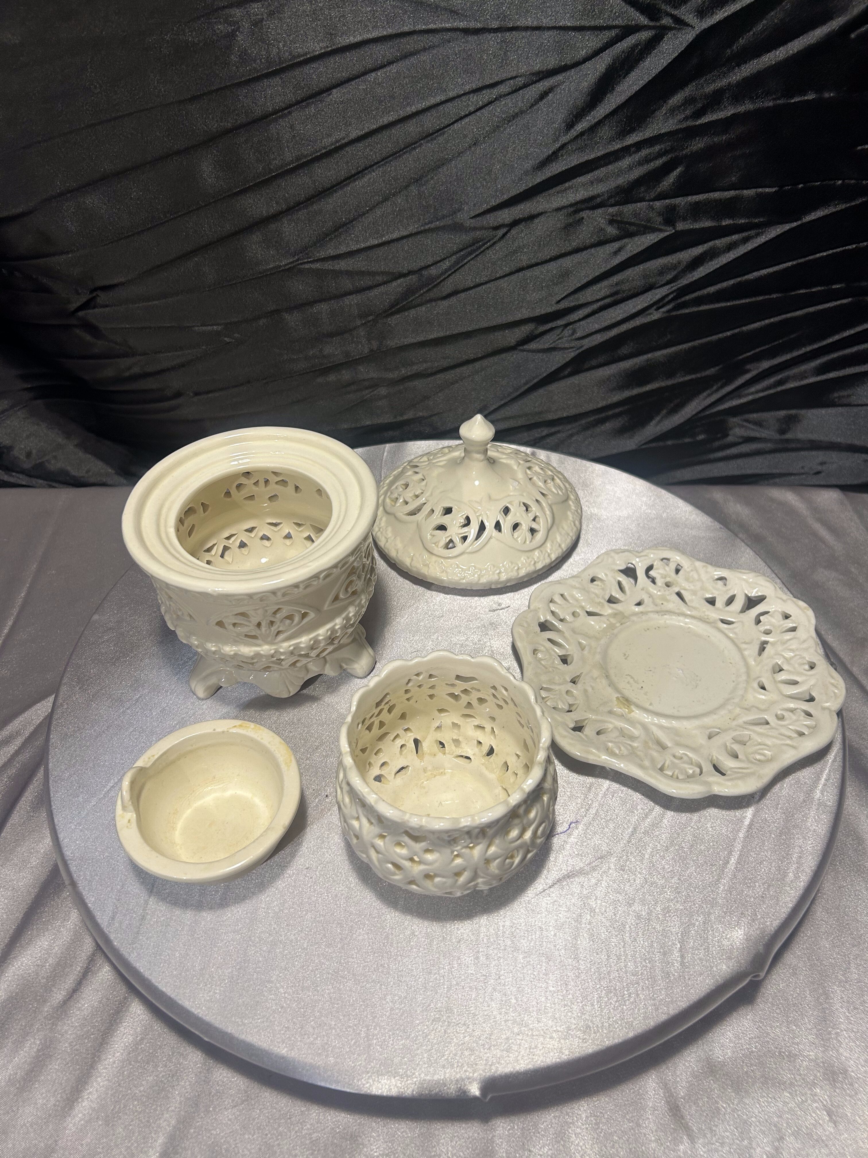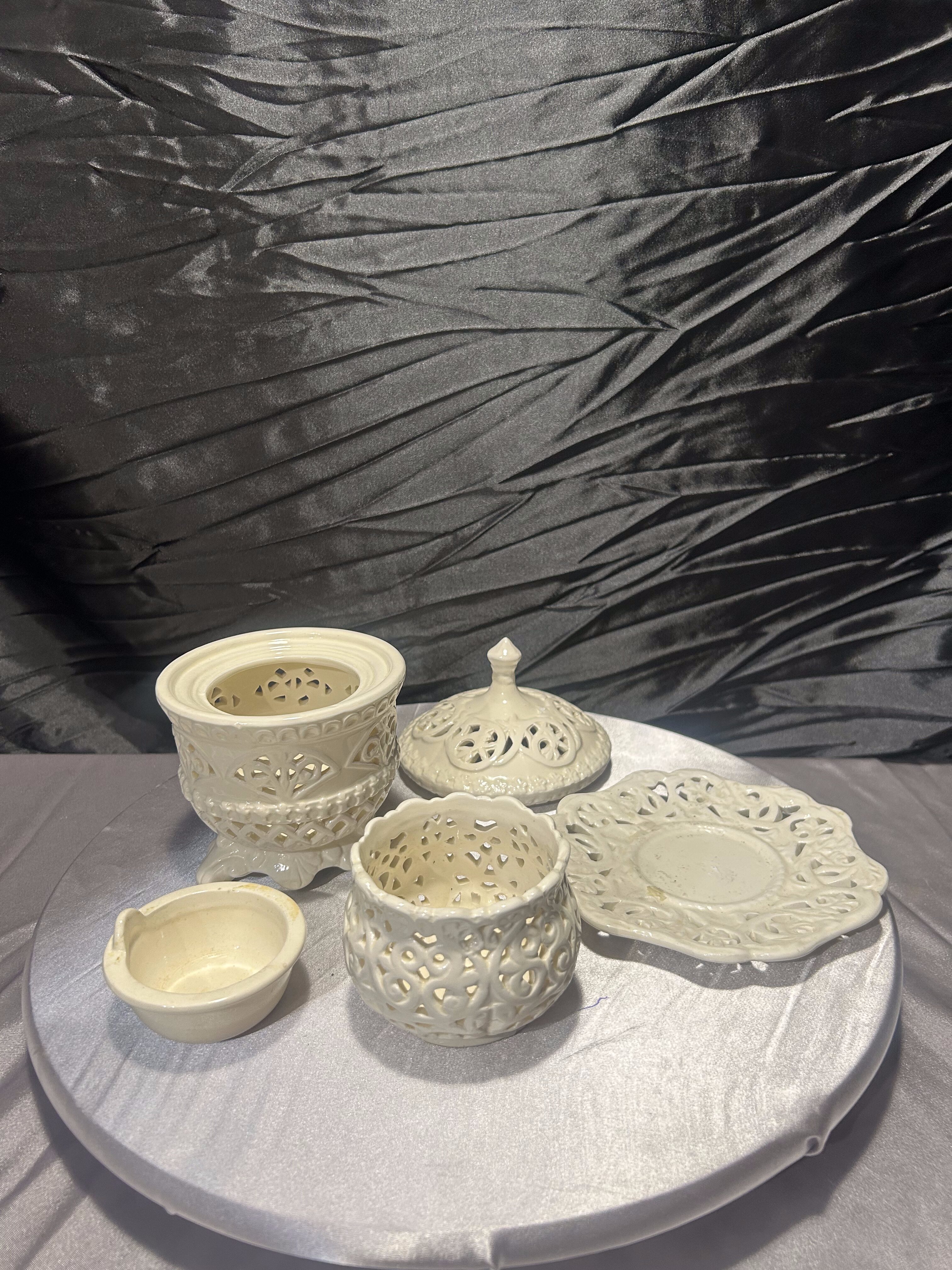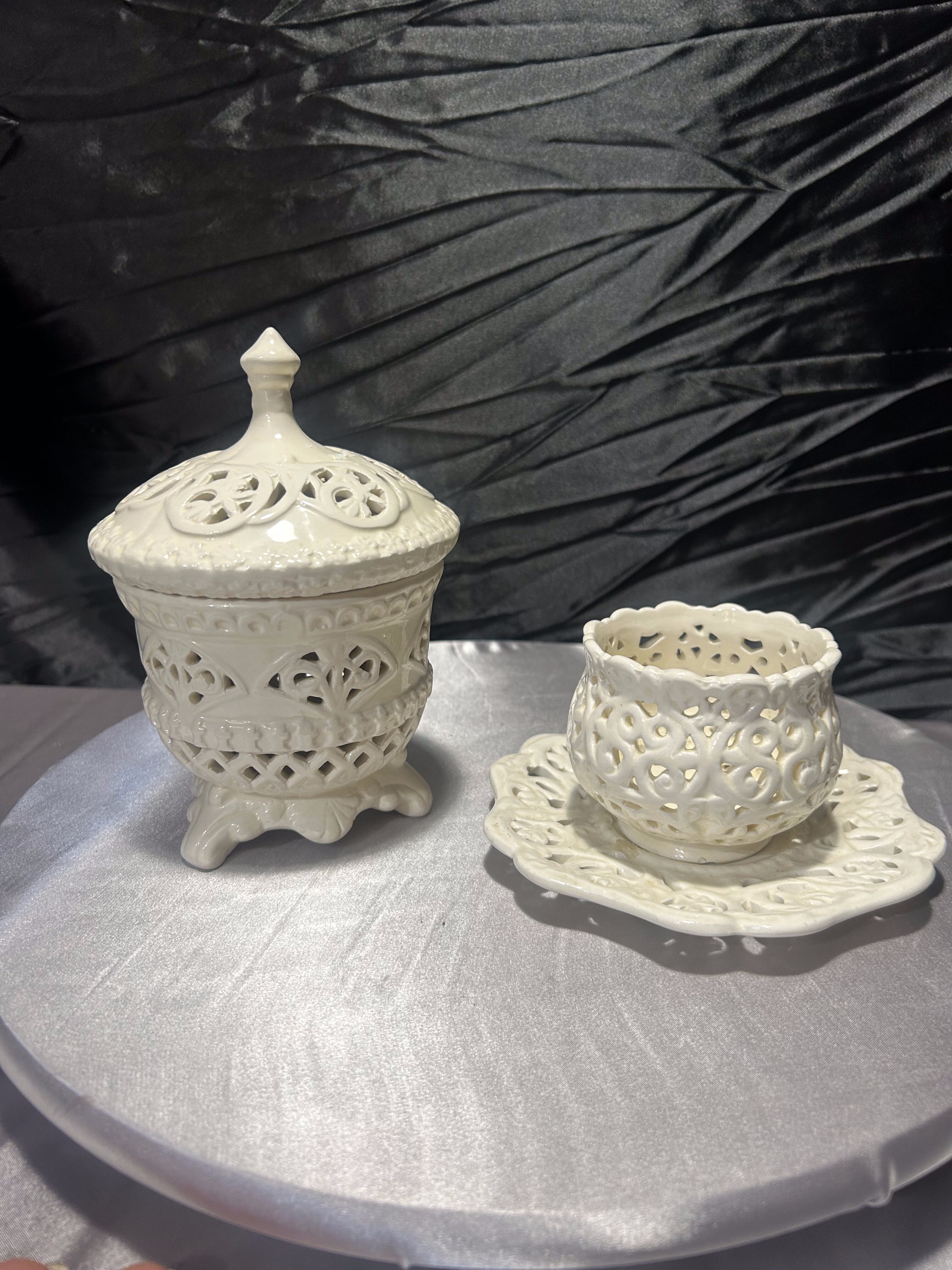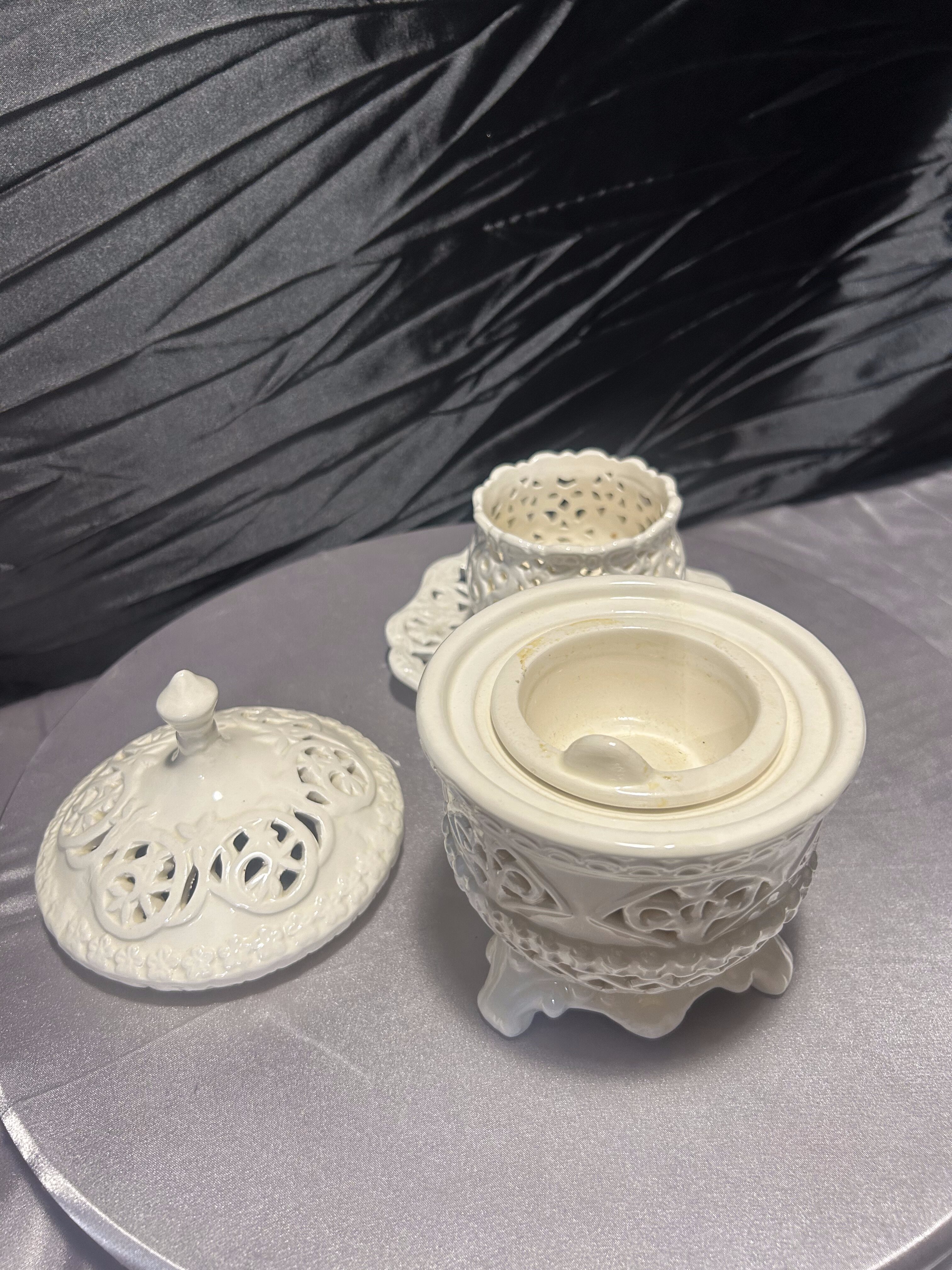 Wykonane z wysokiej jakości ceramiki w jasnym, kremowym odcieniu. Finezyjne ażurowe wzory nadają im lekkości i elegancji, charakterystycznej dla skandynawskiego designu. Obydwa elementy posiadają sygnaturę Villa Collection A/S Denmark, świadczącą o ich oryginalnym pochodzeniu.