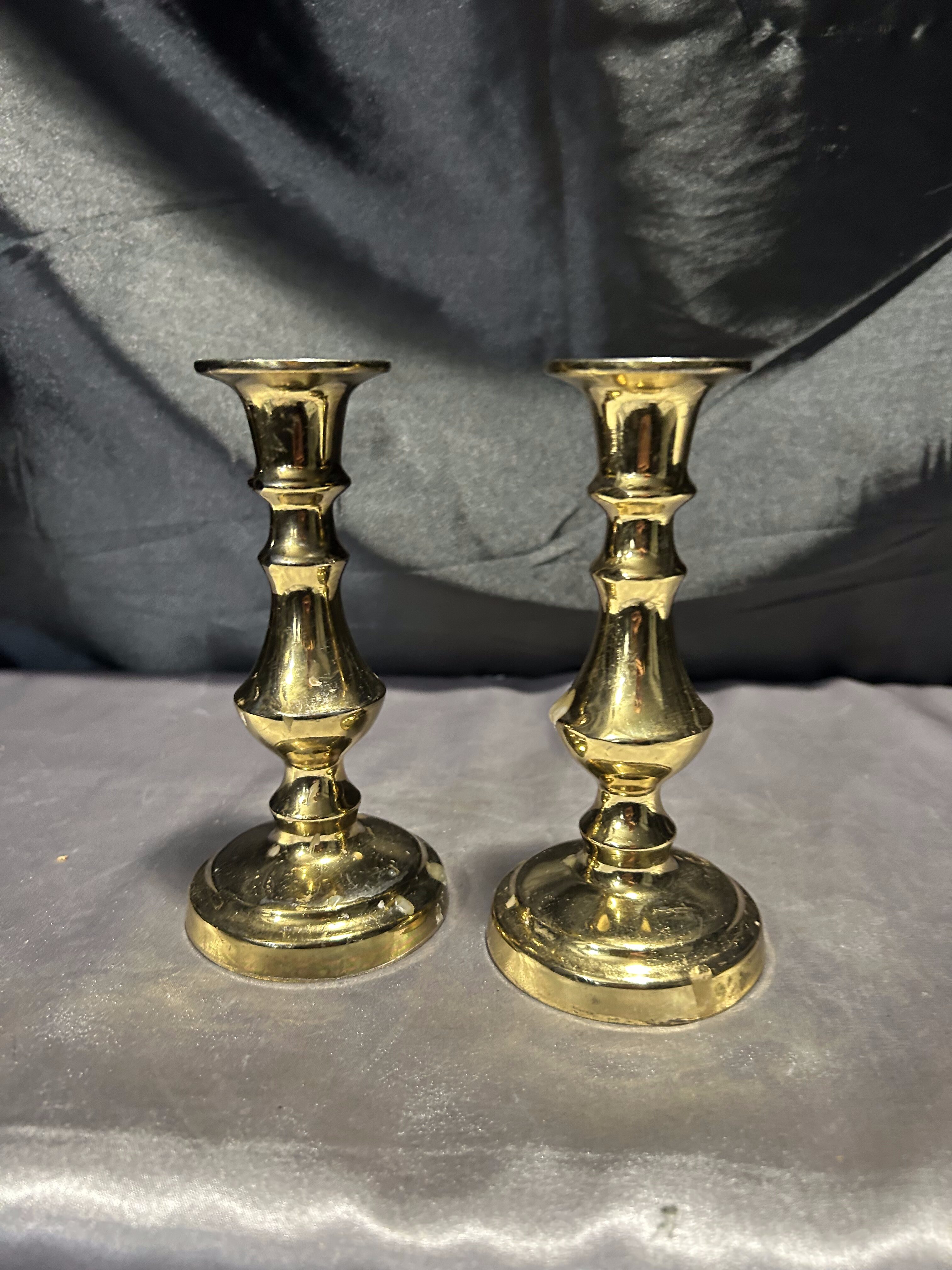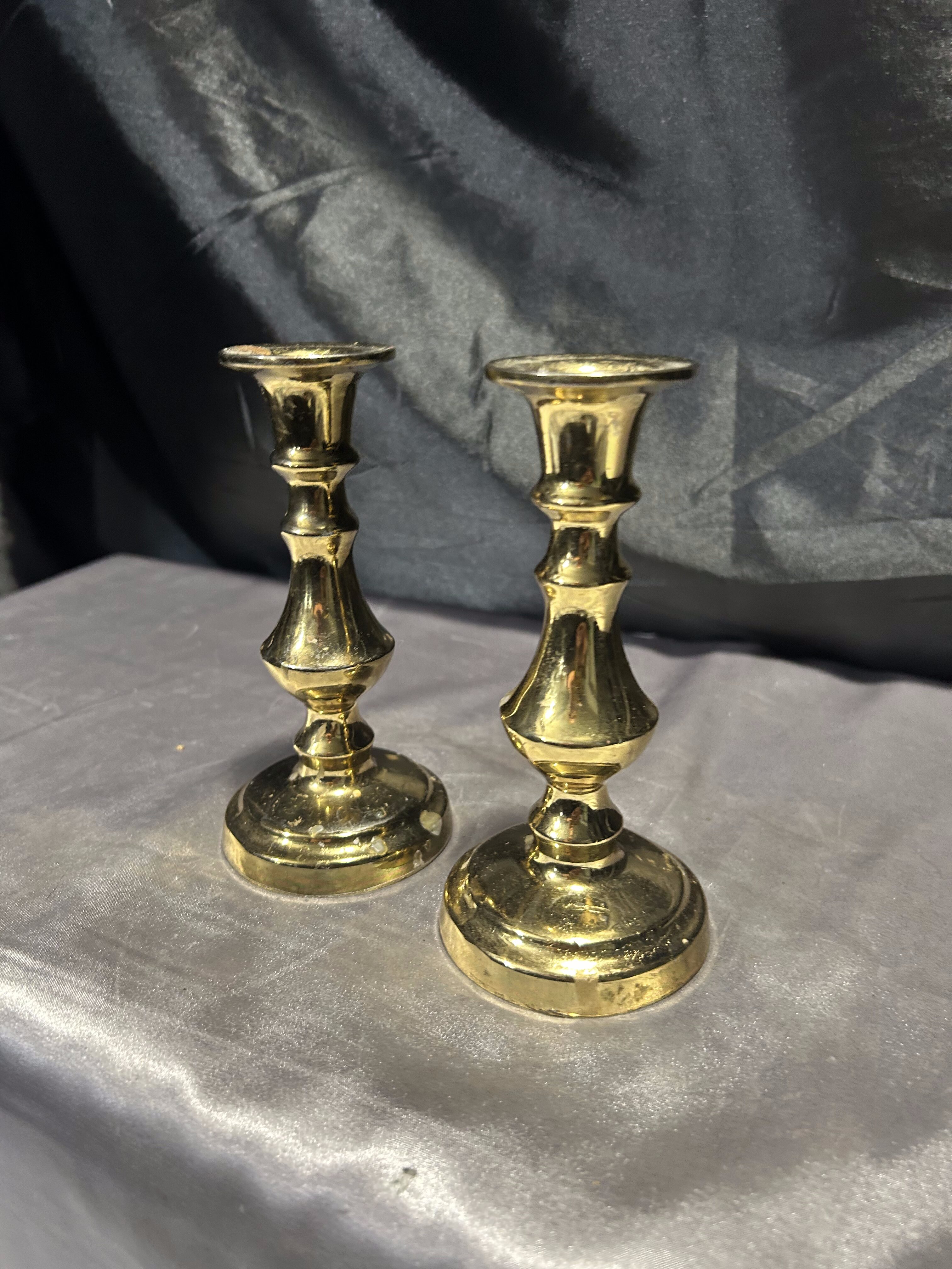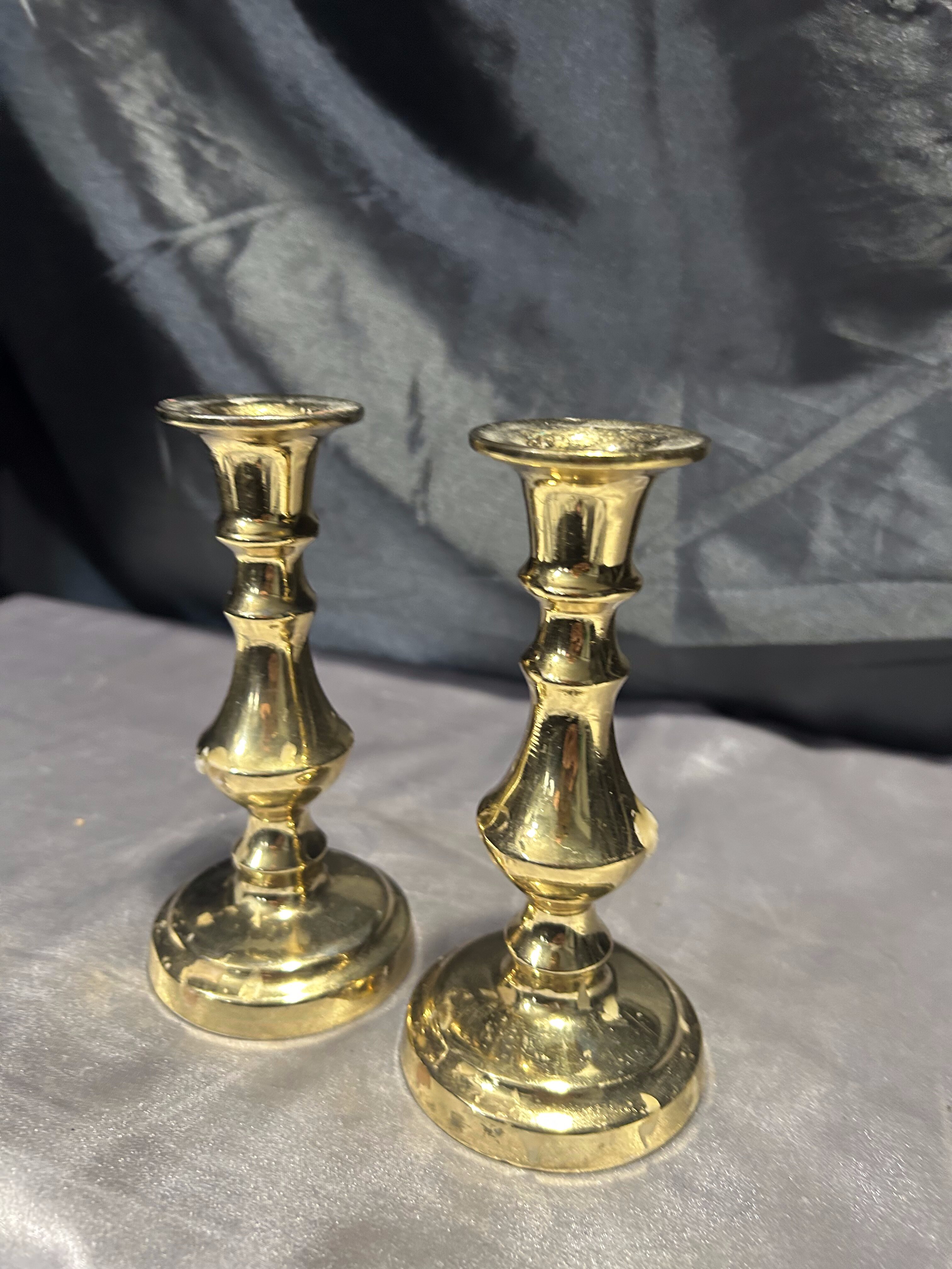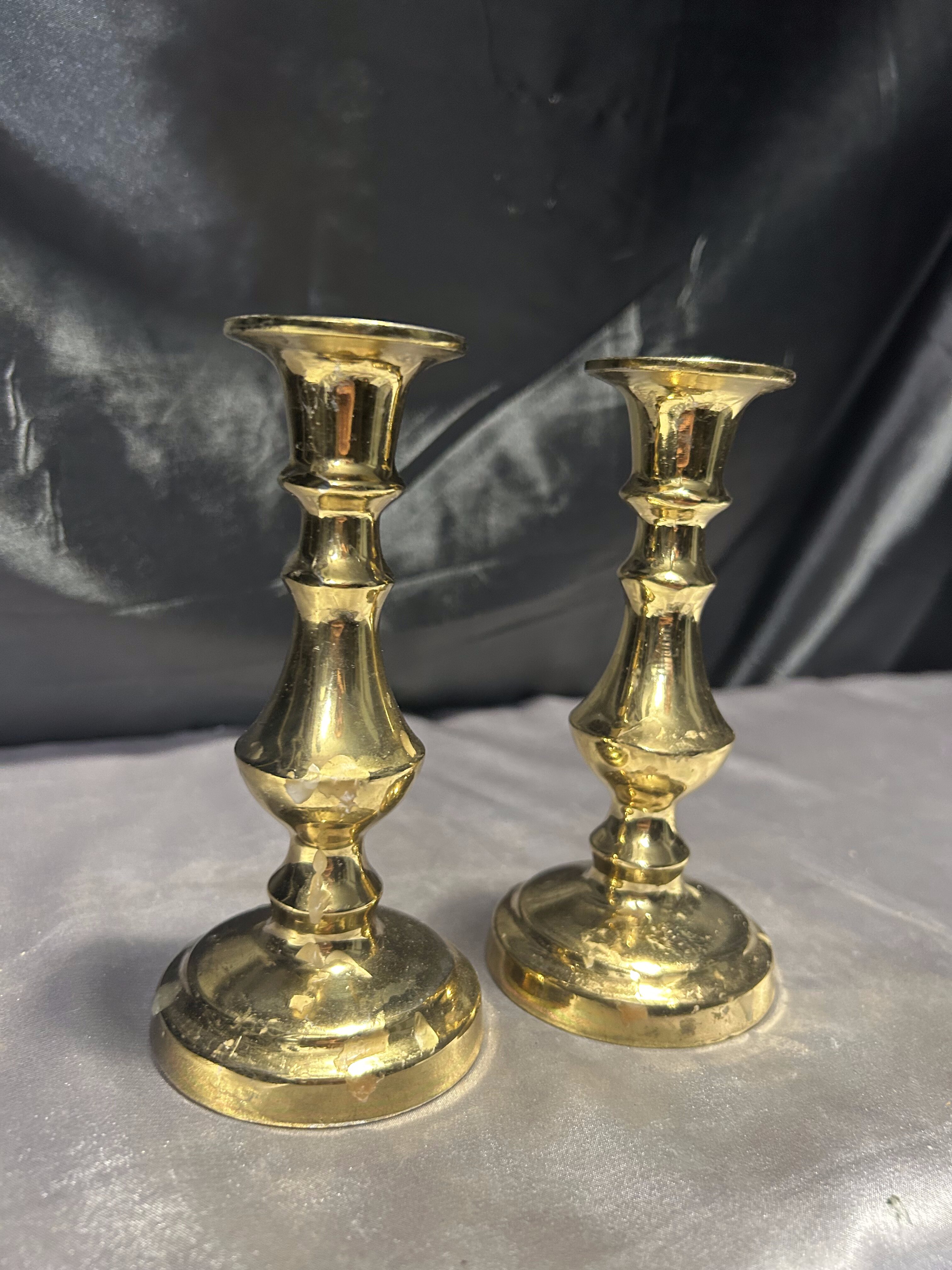 Przedstawiam elegancki zestaw dwóch lichtarzy wykonanych z mosiądzu, sygnowanych „Made in England”.