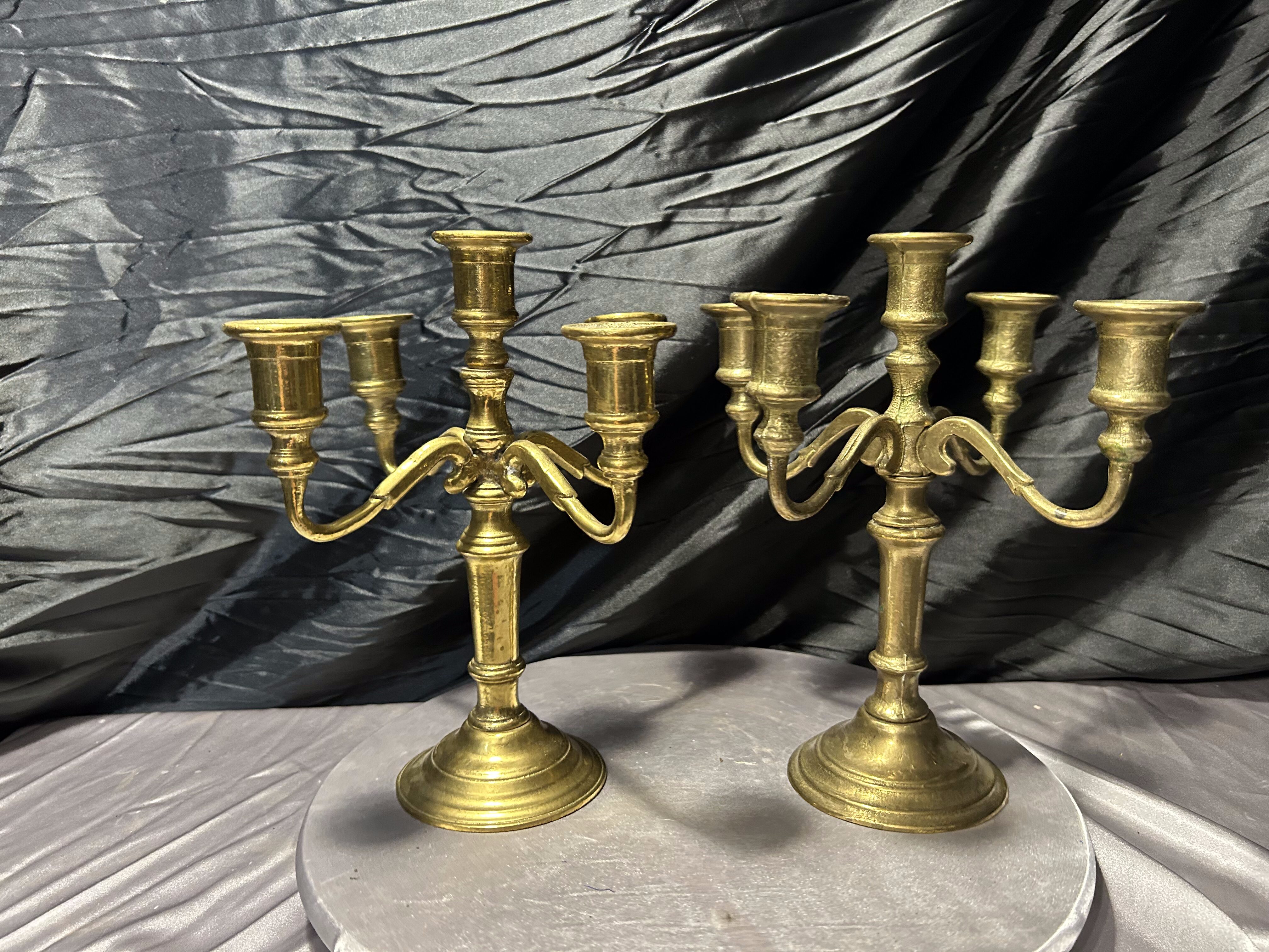 Piękny zestaw dwóch solidnych świeczników wykonanych z mosiądzu, utrzymanych w klasycznej, eleganckiej stylistyce. Każdy świecznik posiada cztery misternie wyprofilowane ramiona oraz jedno centralne gniazdo, co razem daje możliwość umieszczenia pięciu świec.