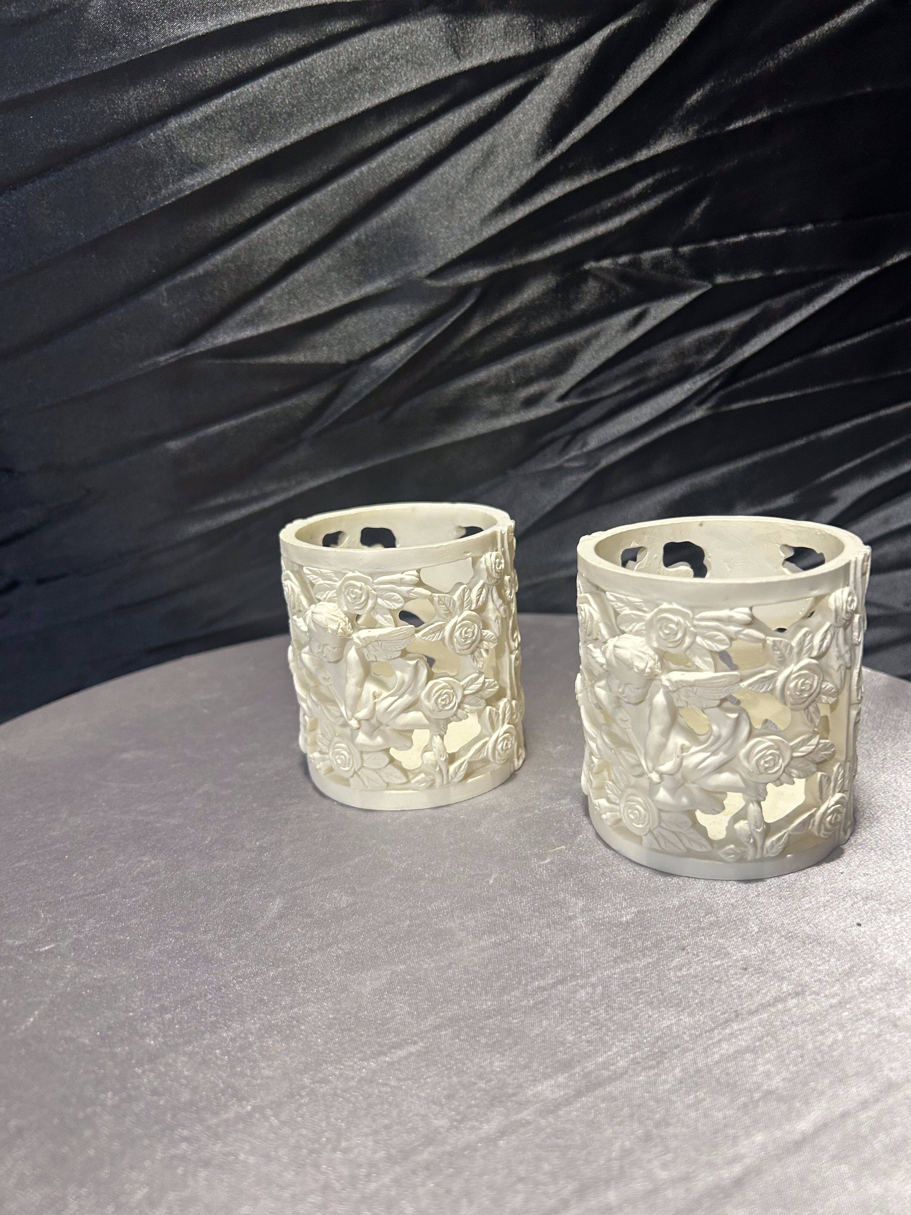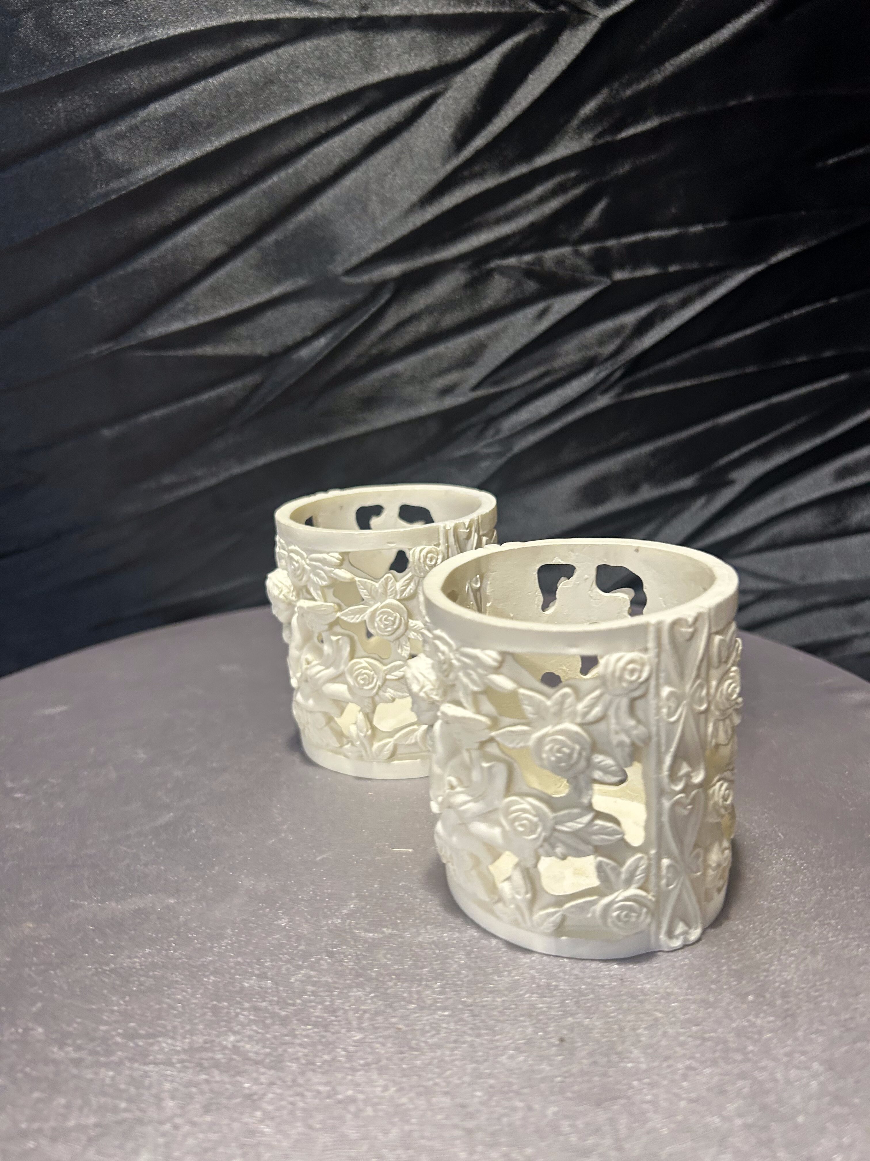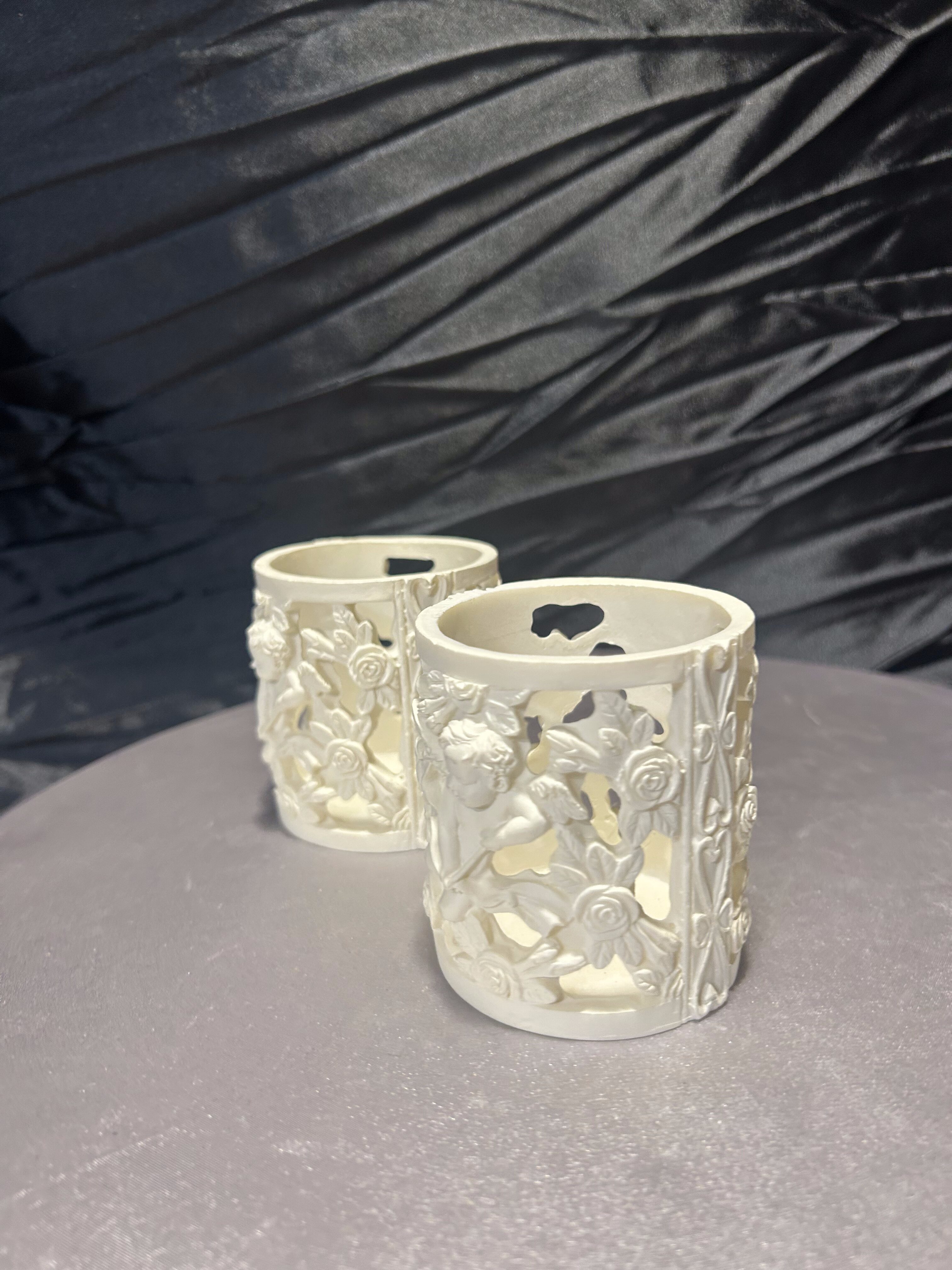 - Komplet dwóch świeczników ceramicznych – ażurowe z aniołkami – romantyczna dekoracja