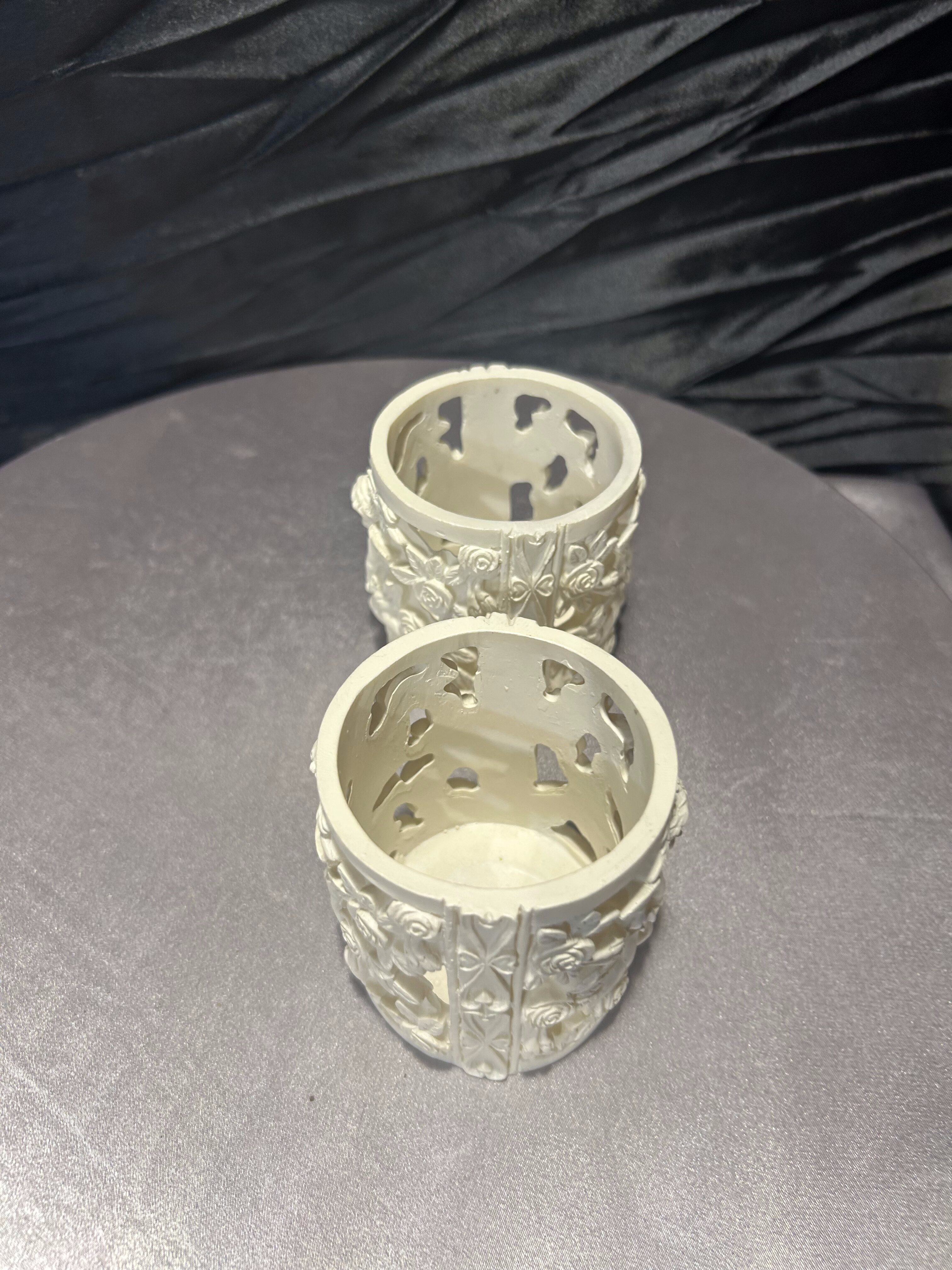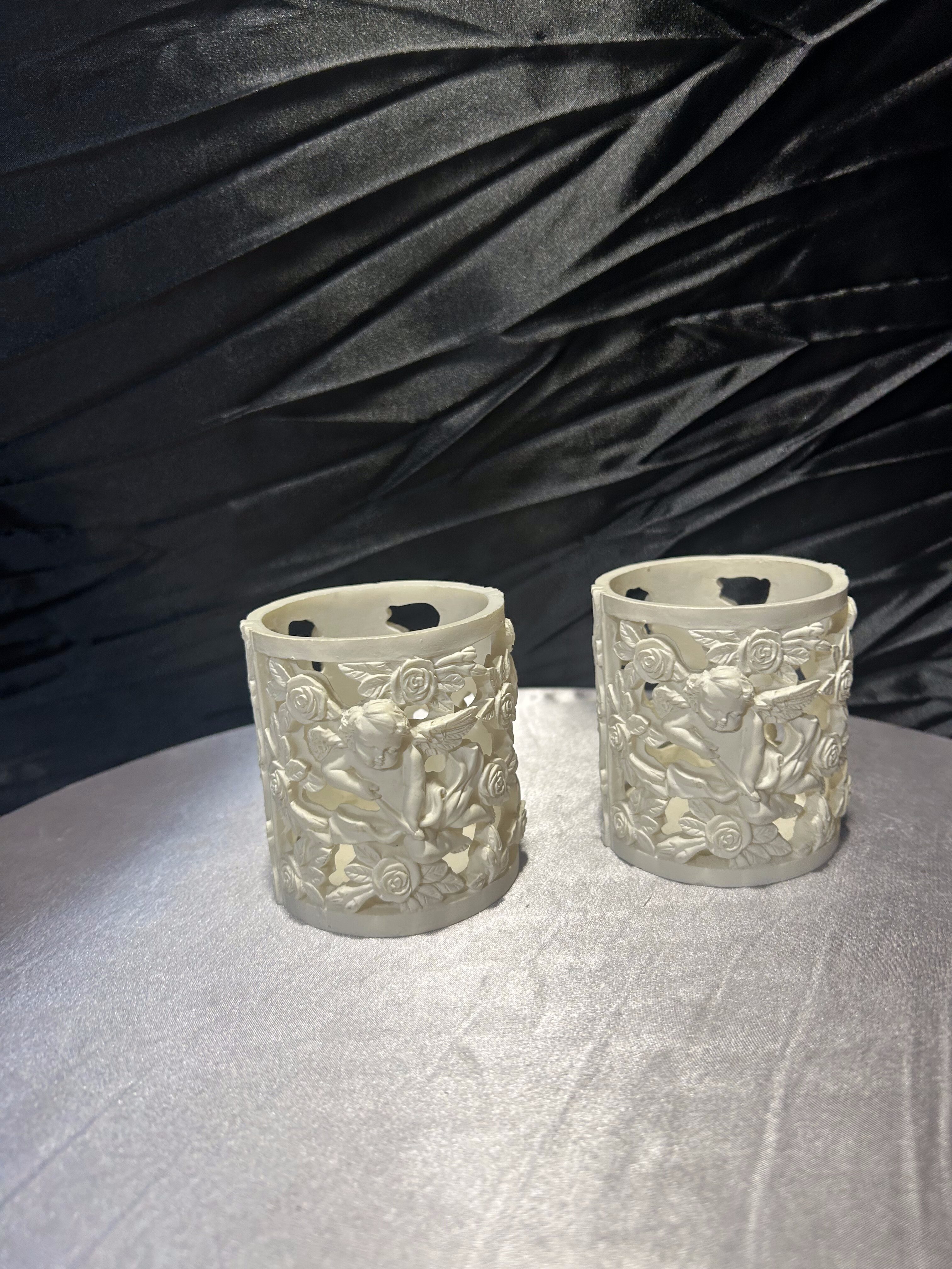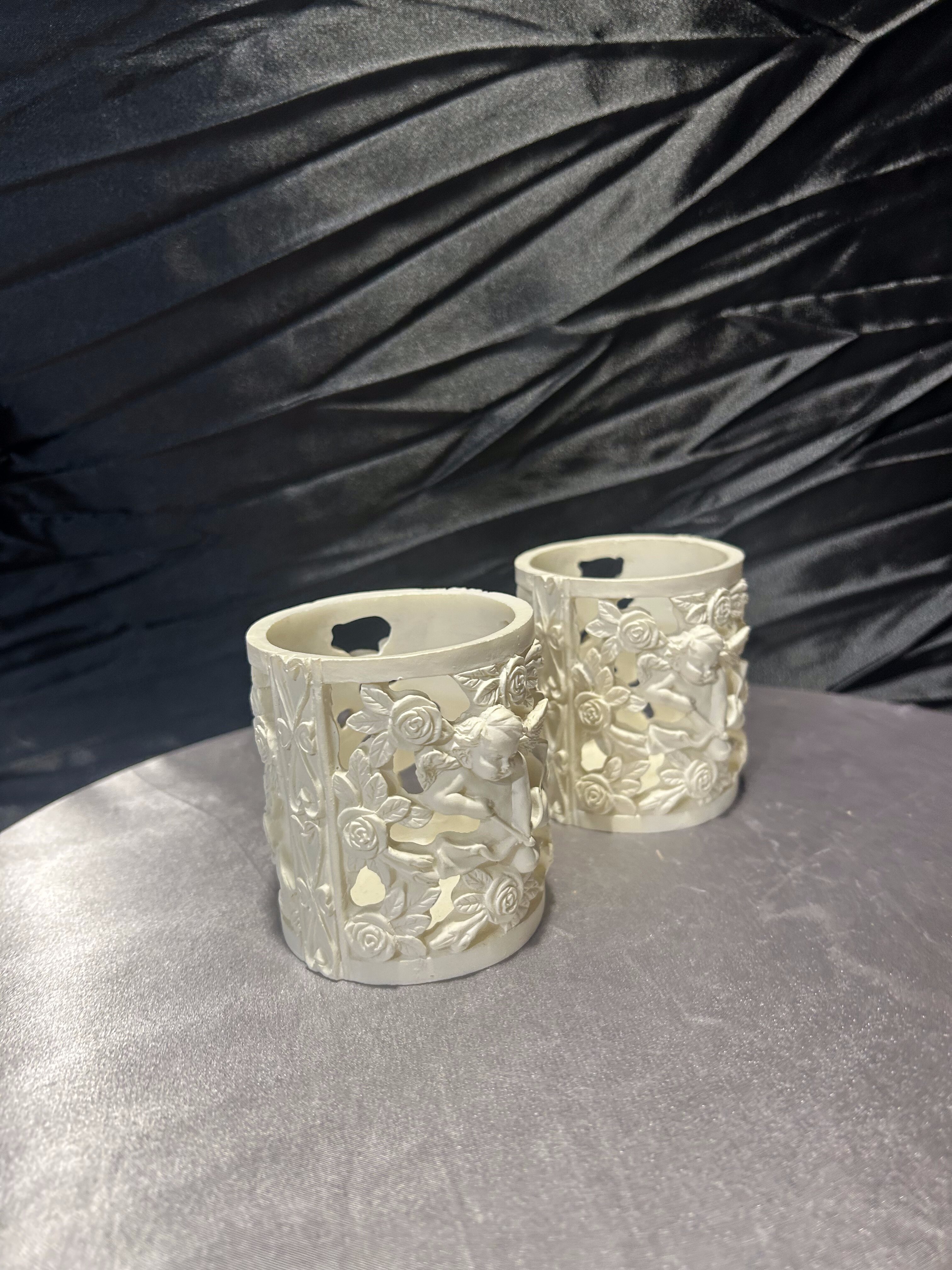 - Komplet dwóch świeczników ceramicznych – ażurowe z aniołkami – romantyczna dekoracja