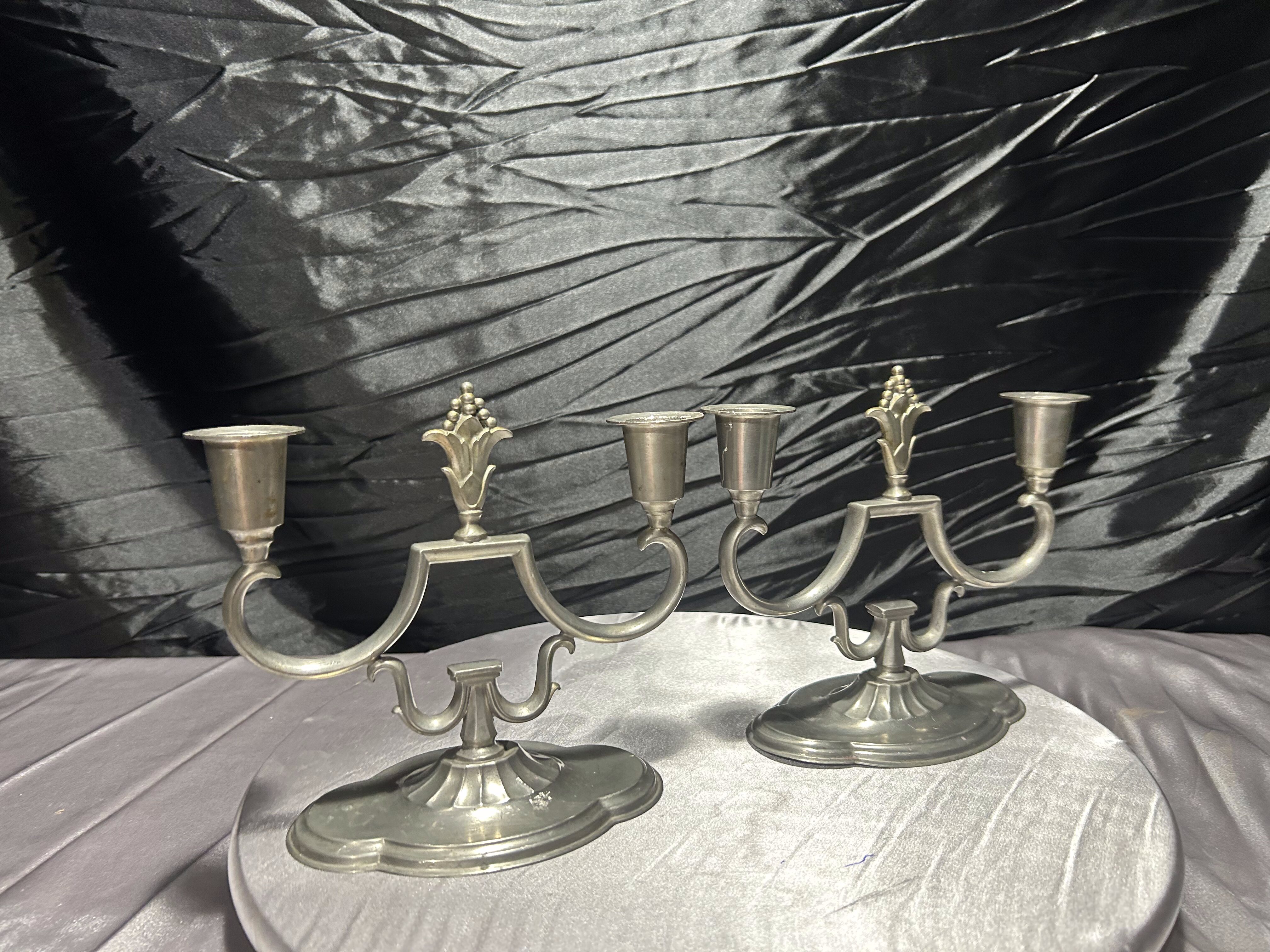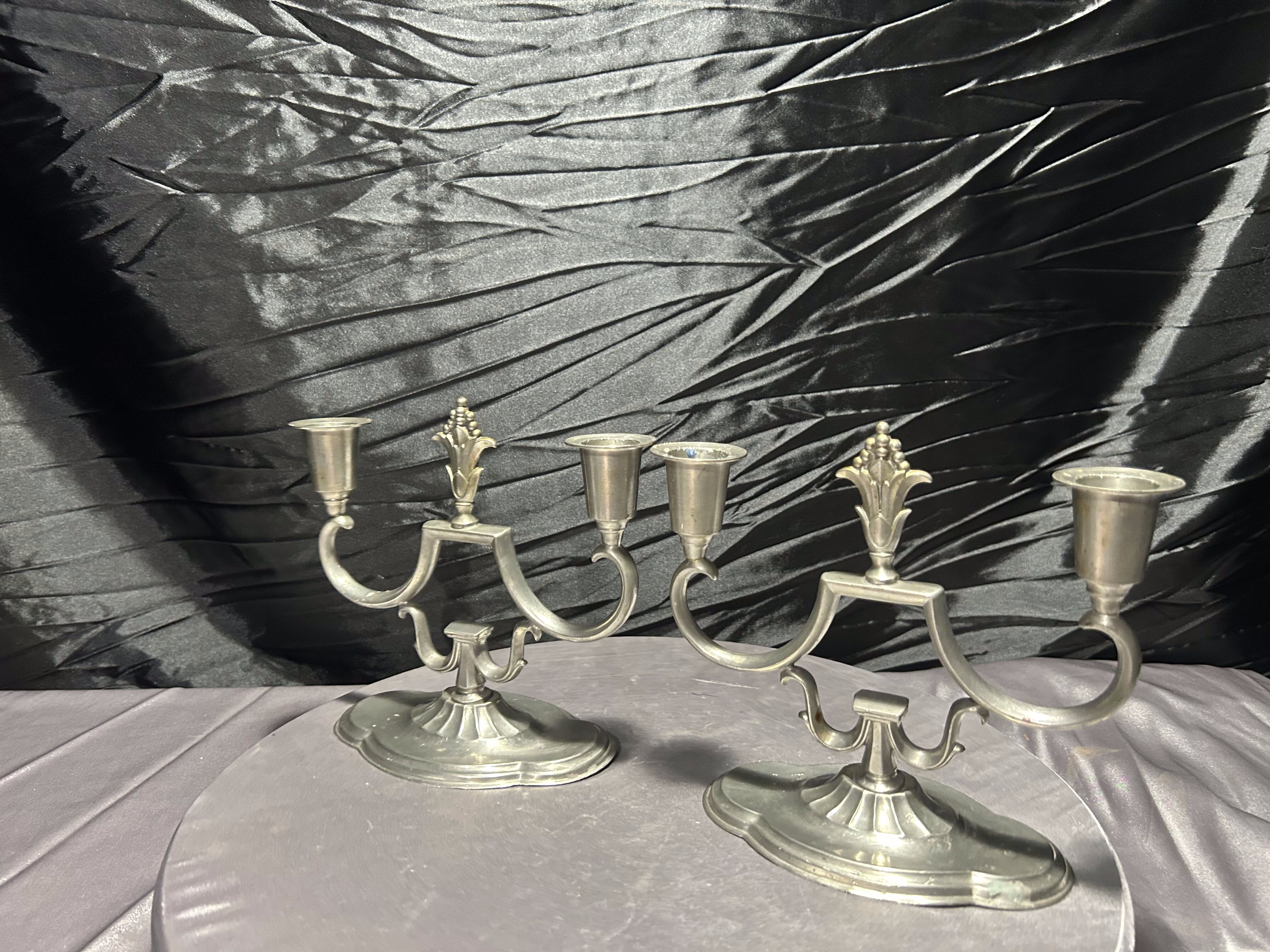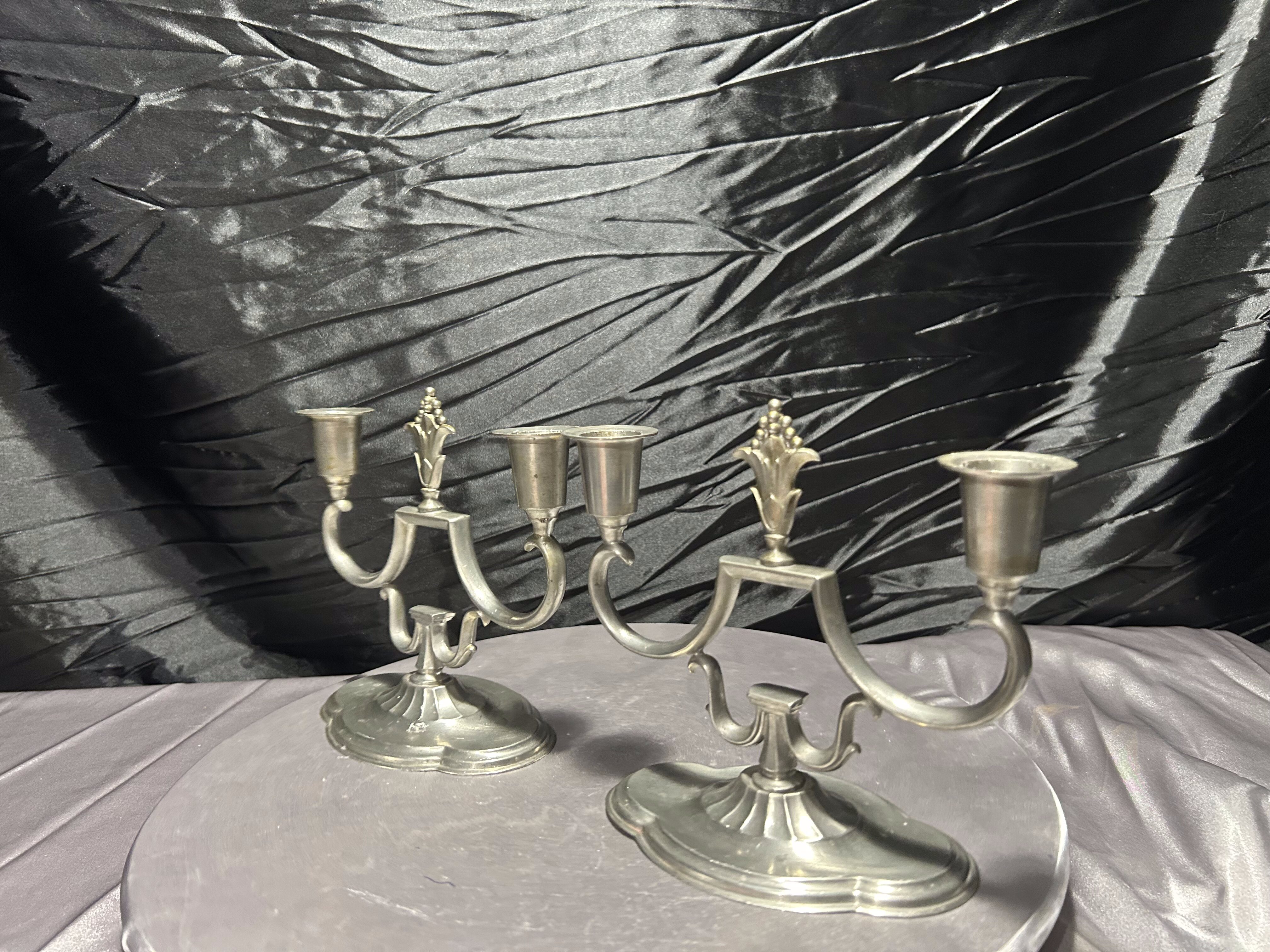 Elegancki komplet dwóch świeczników wykonanych z metalu w kolorze srebra. Każdy z nich przeznaczony jest na dwie świece, a ich forma inspirowana jest klasycznym stylem – z delikatnie falującymi ramionami, ozdobnym środkiem i stabilną, owalną podstawą. Zdobienia w górnej części ramion dodają kompozycji lekkości i wytworności.