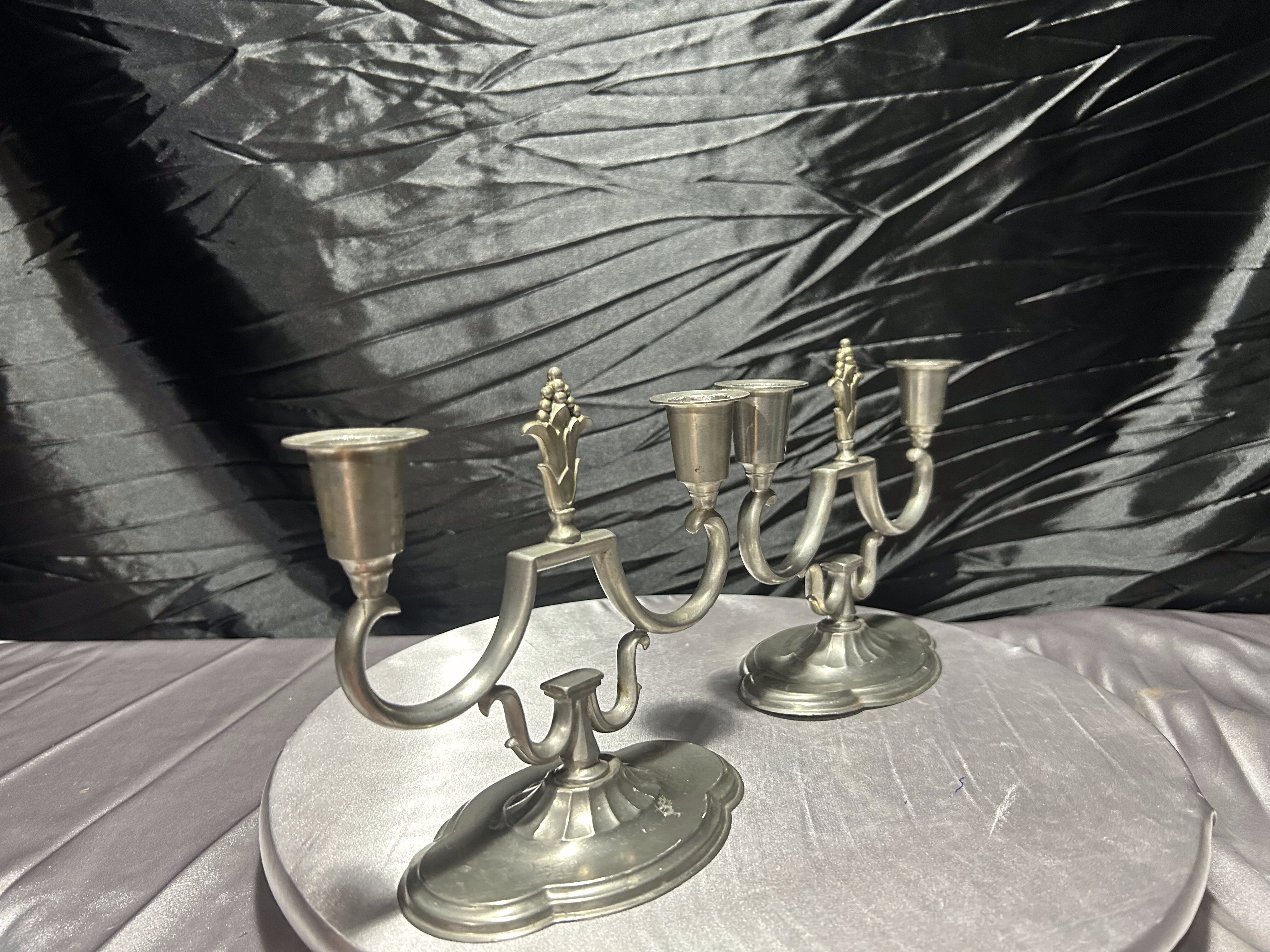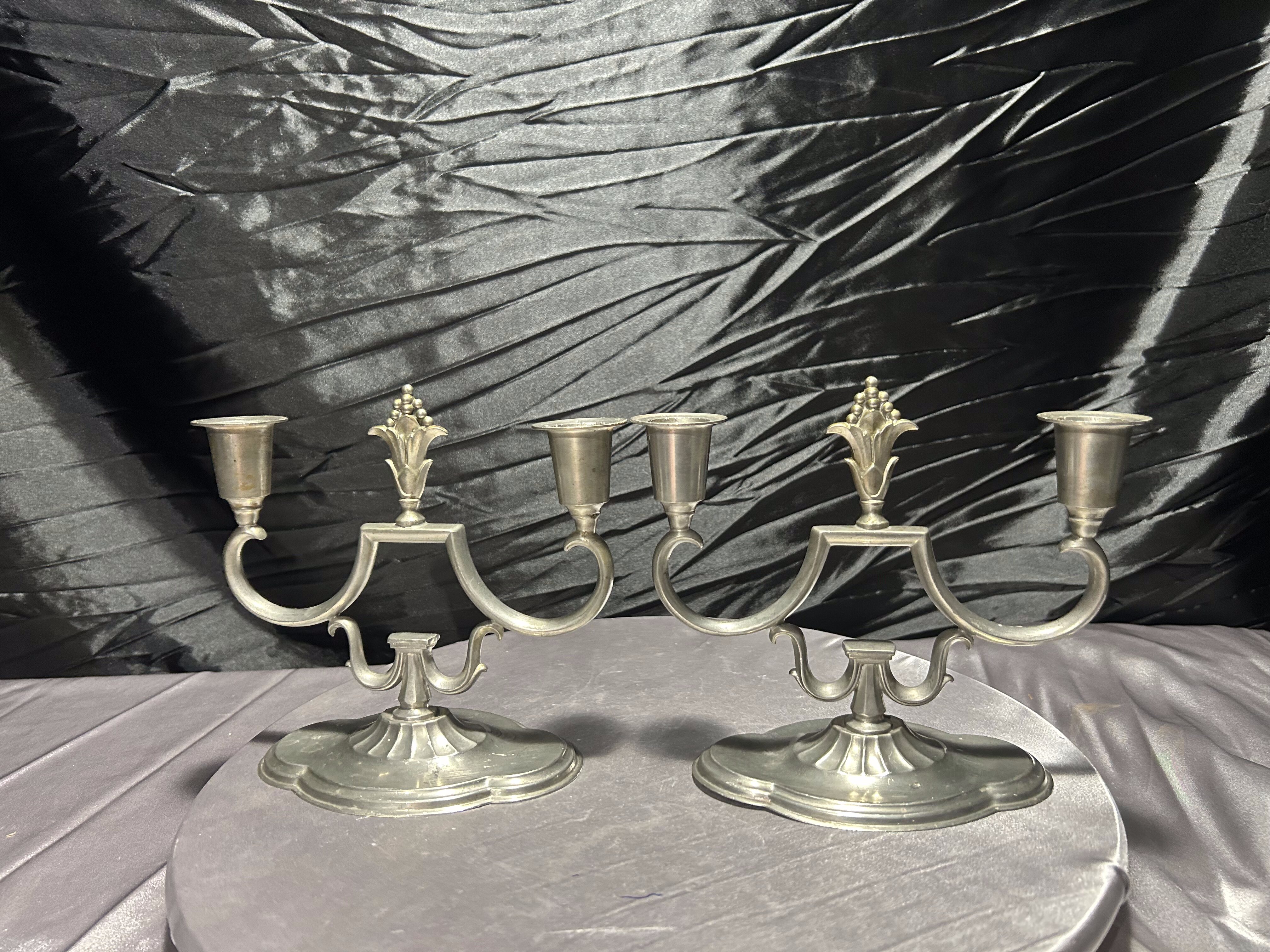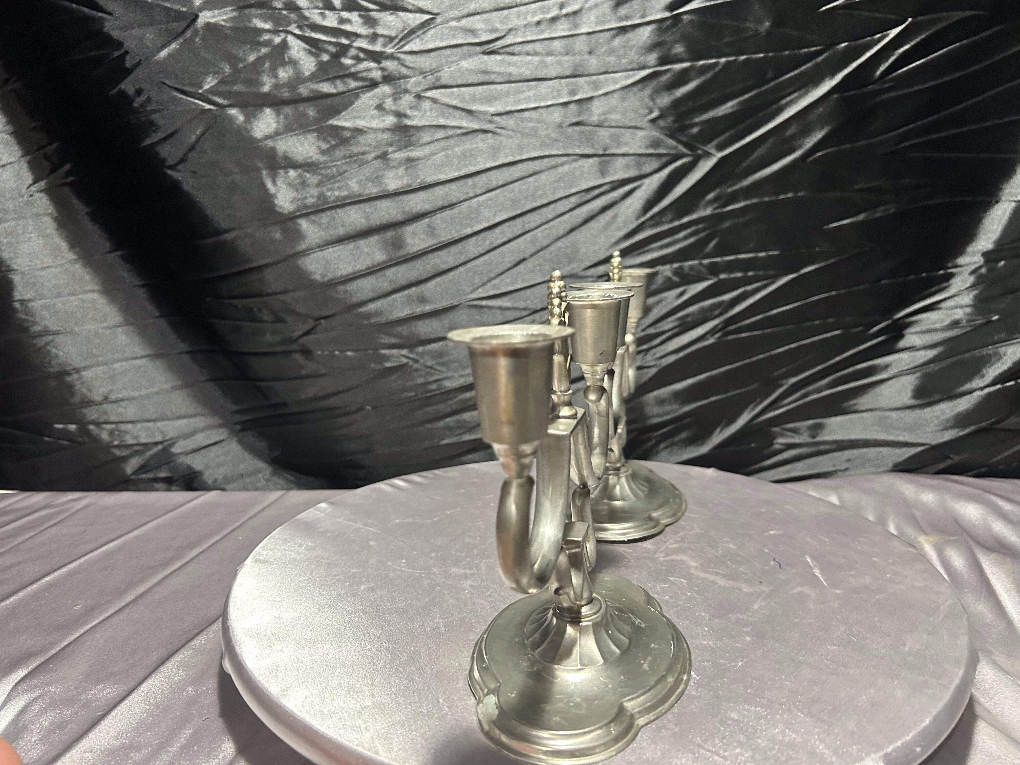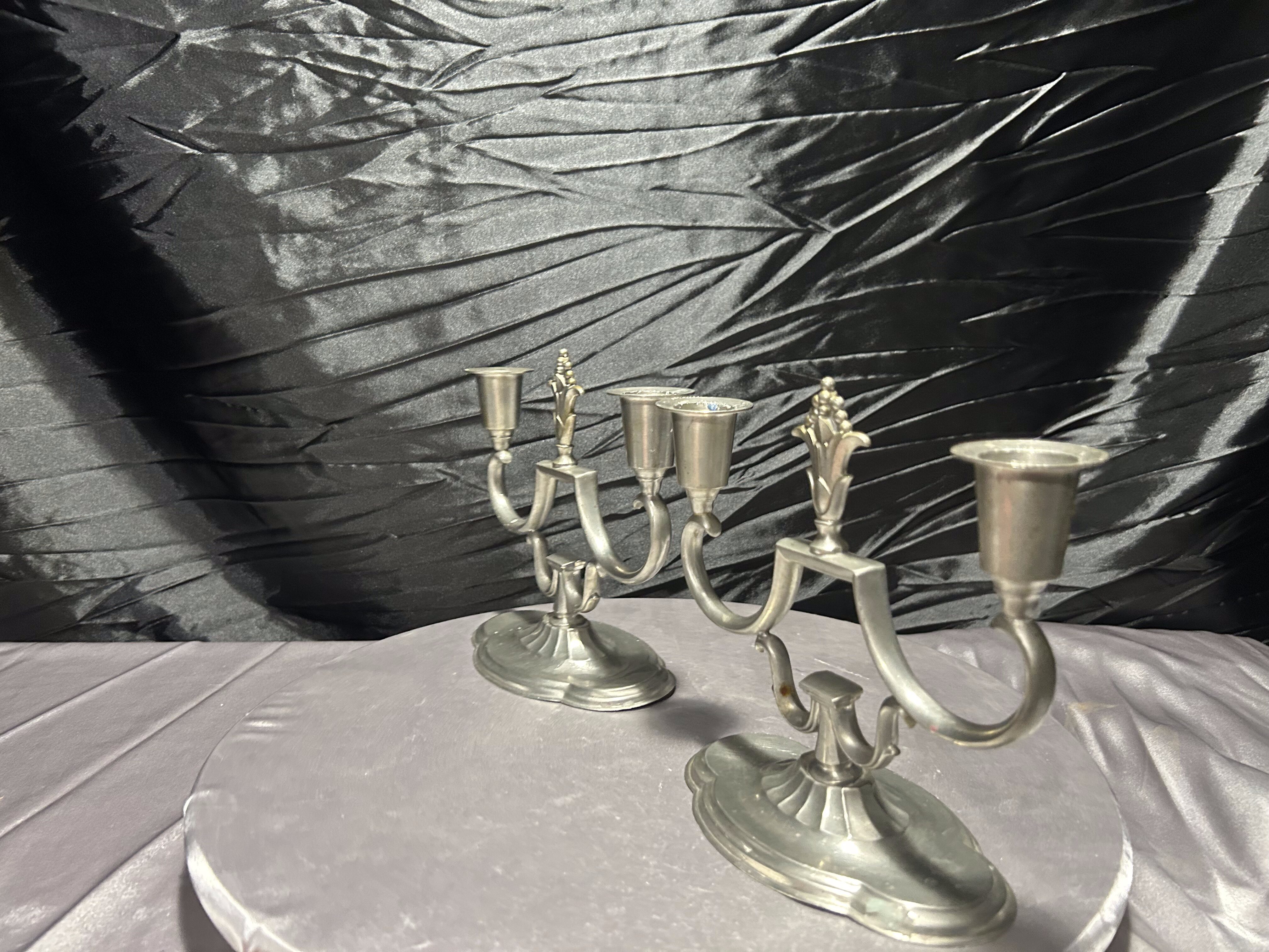 Elegancki komplet dwóch świeczników wykonanych z metalu w kolorze srebra. Każdy z nich przeznaczony jest na dwie świece, a ich forma inspirowana jest klasycznym stylem – z delikatnie falującymi ramionami, ozdobnym środkiem i stabilną, owalną podstawą. Zdobienia w górnej części ramion dodają kompozycji lekkości i wytworności.