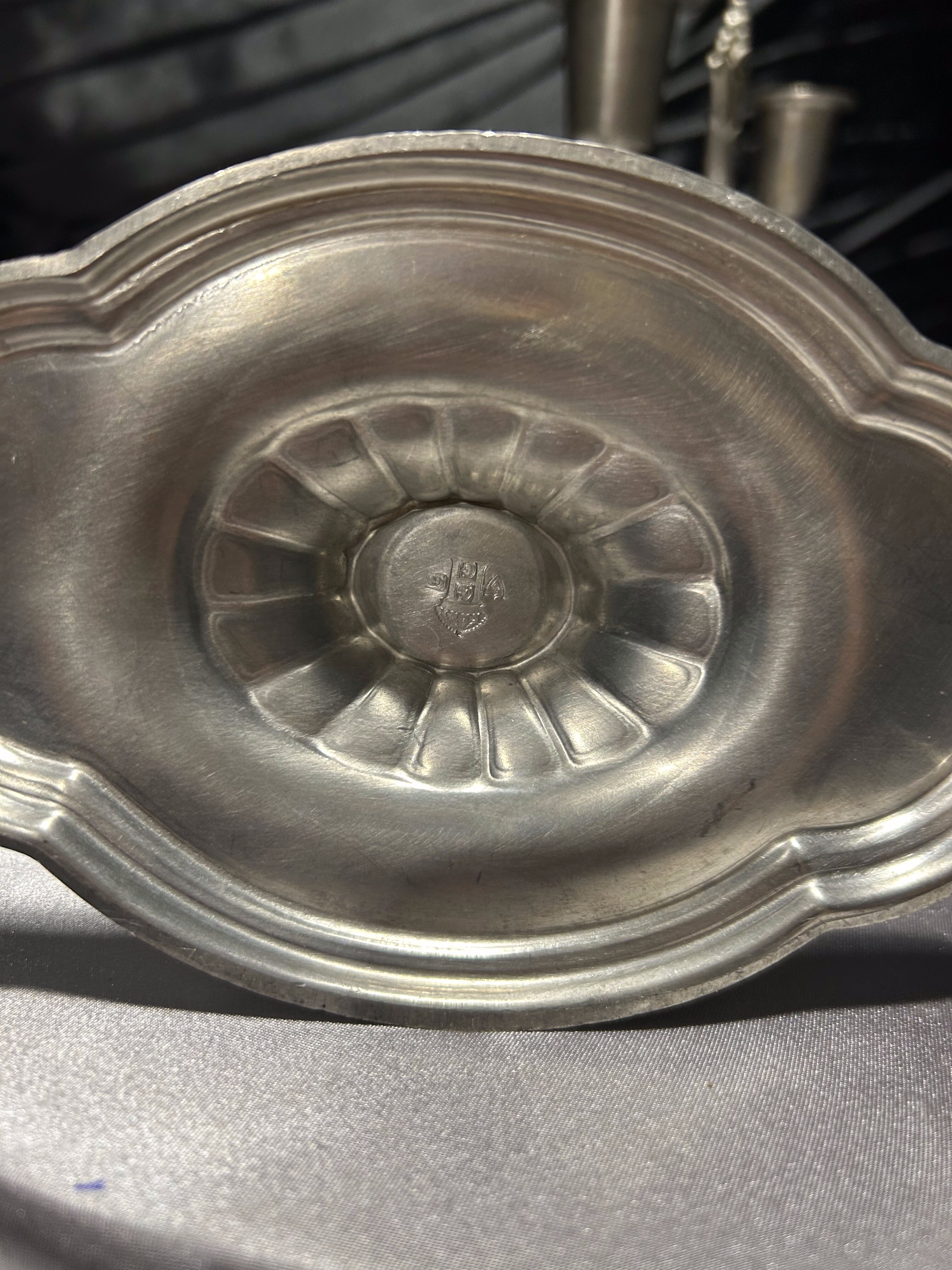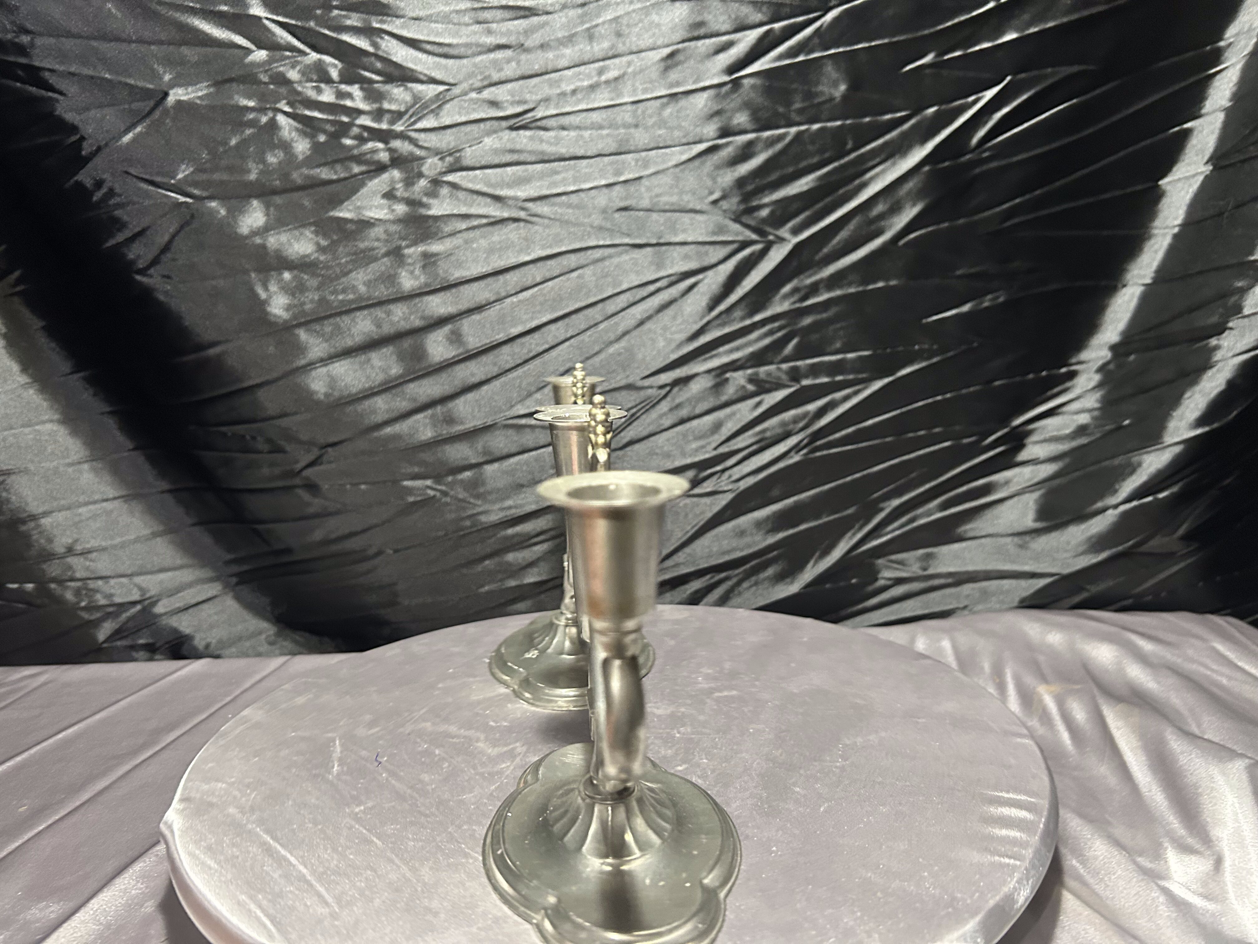 - Komplet dwóch świeczników – srebrny kolor, zdobione, sygnowane, styl klasyczny
