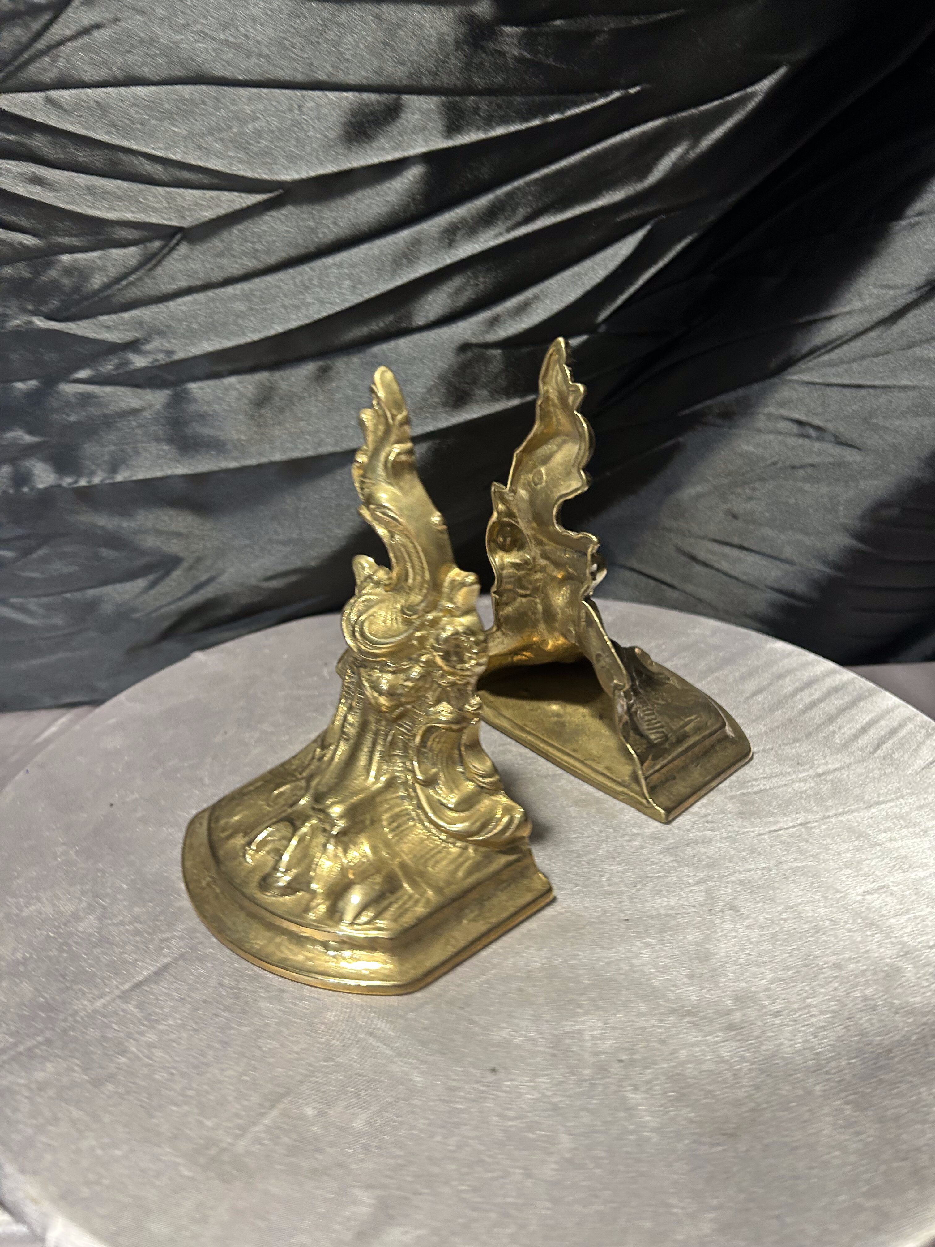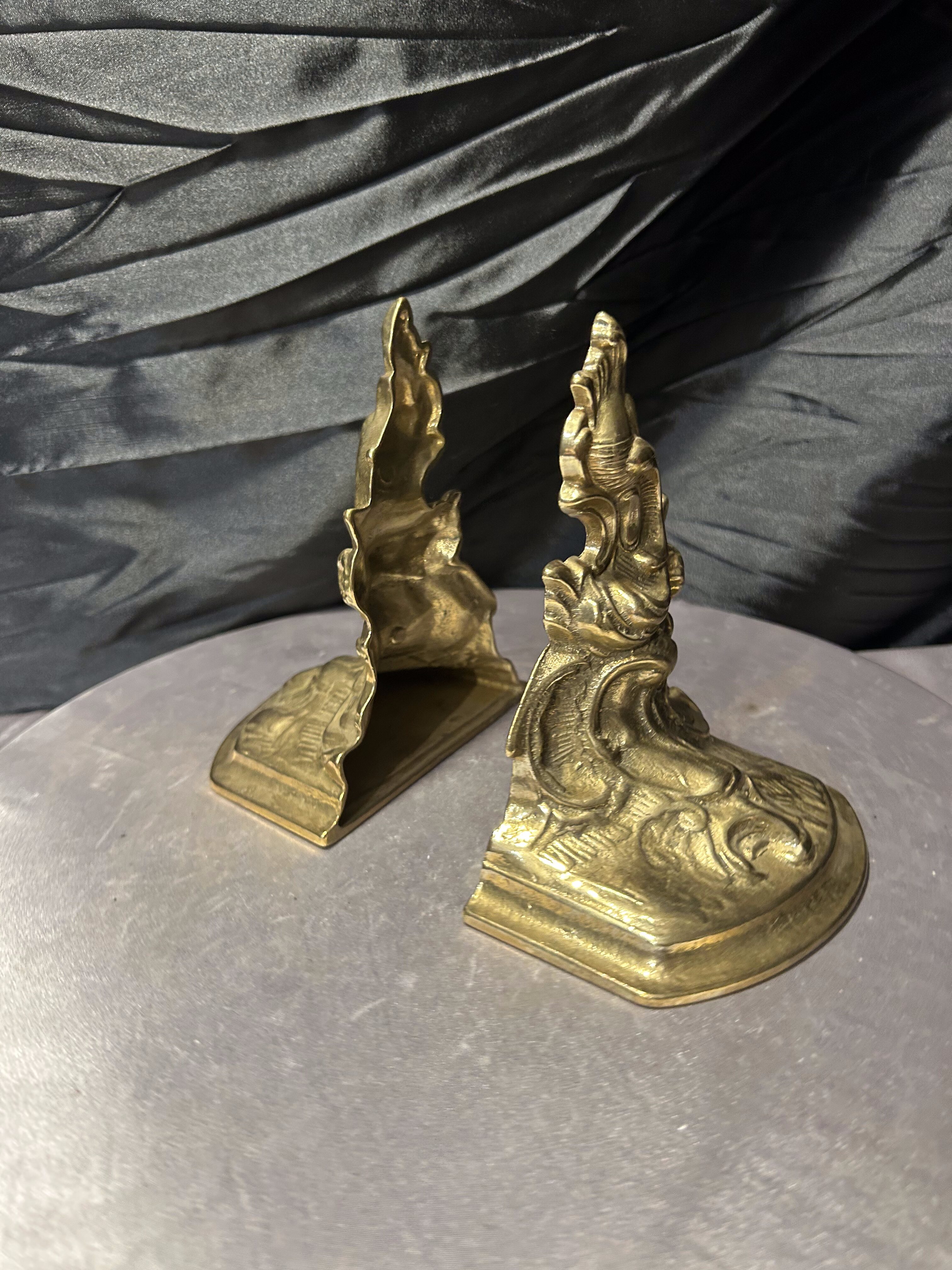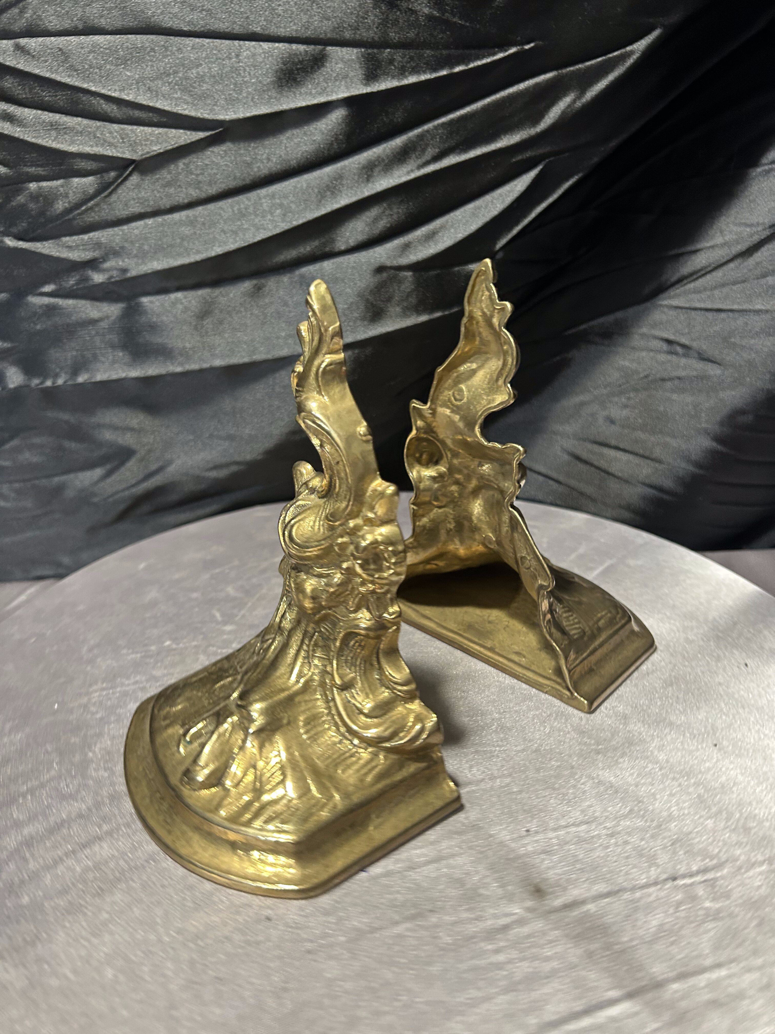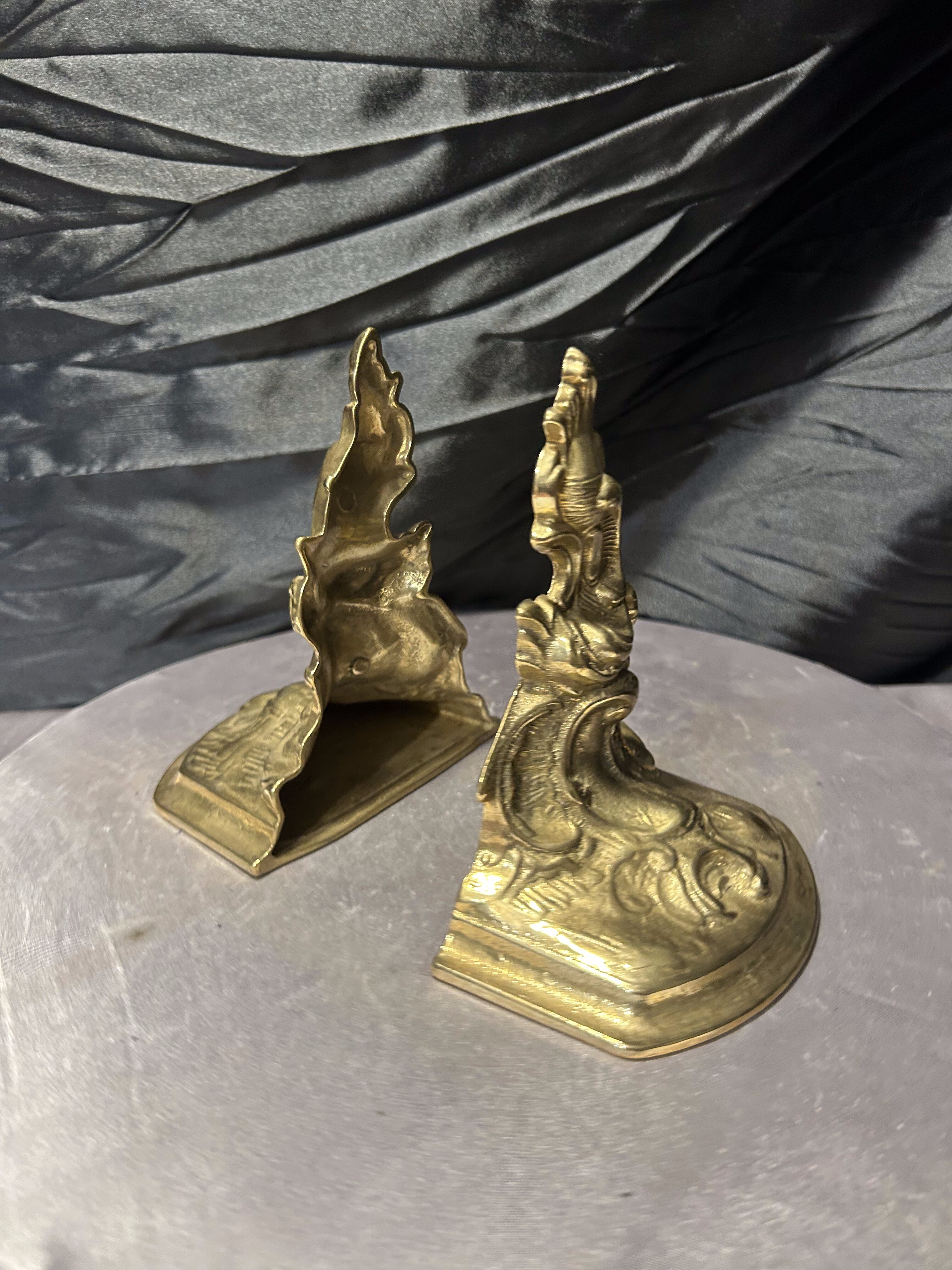 Efektowny komplet dwóch ciężkich podstawek na książki wykonanych z mosiądzu. Bogato zdobiona forma o dekoracyjnym, niemal barokowym charakterze sprawia, że są to nie tylko praktyczne podpórki, ale również wyrazisty element wystroju wnętrza.