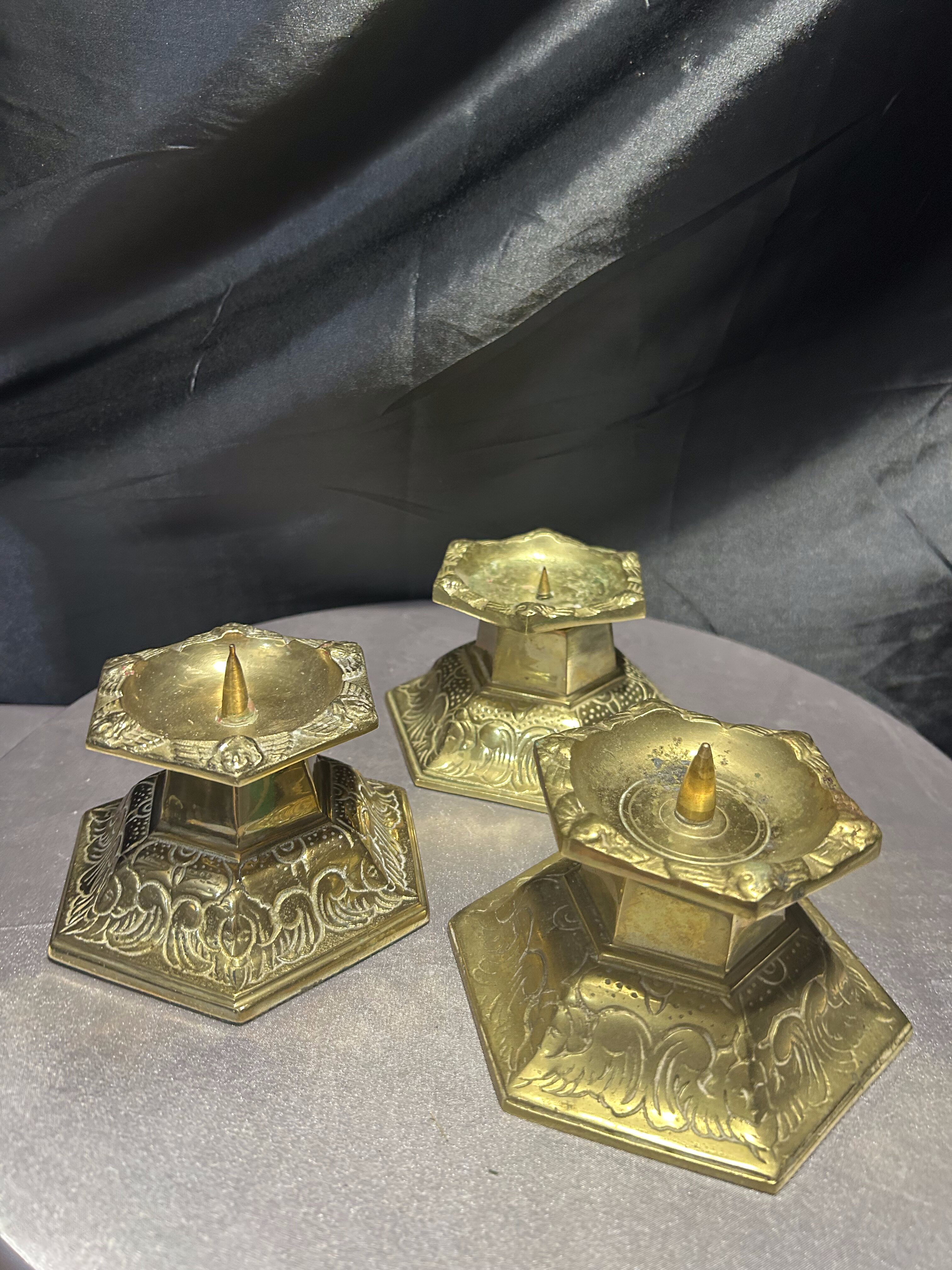 Elegancki zestaw trzech świeczników wykonanych z mosiądzu, przeznaczonych na pojedyncze świece typu gromnica. Każdy z nich ma sześciokątną podstawę ozdobioną tłoczonym ornamentem, który pięknie odbija światło i dodaje kompozycji wyrazistego charakteru.
