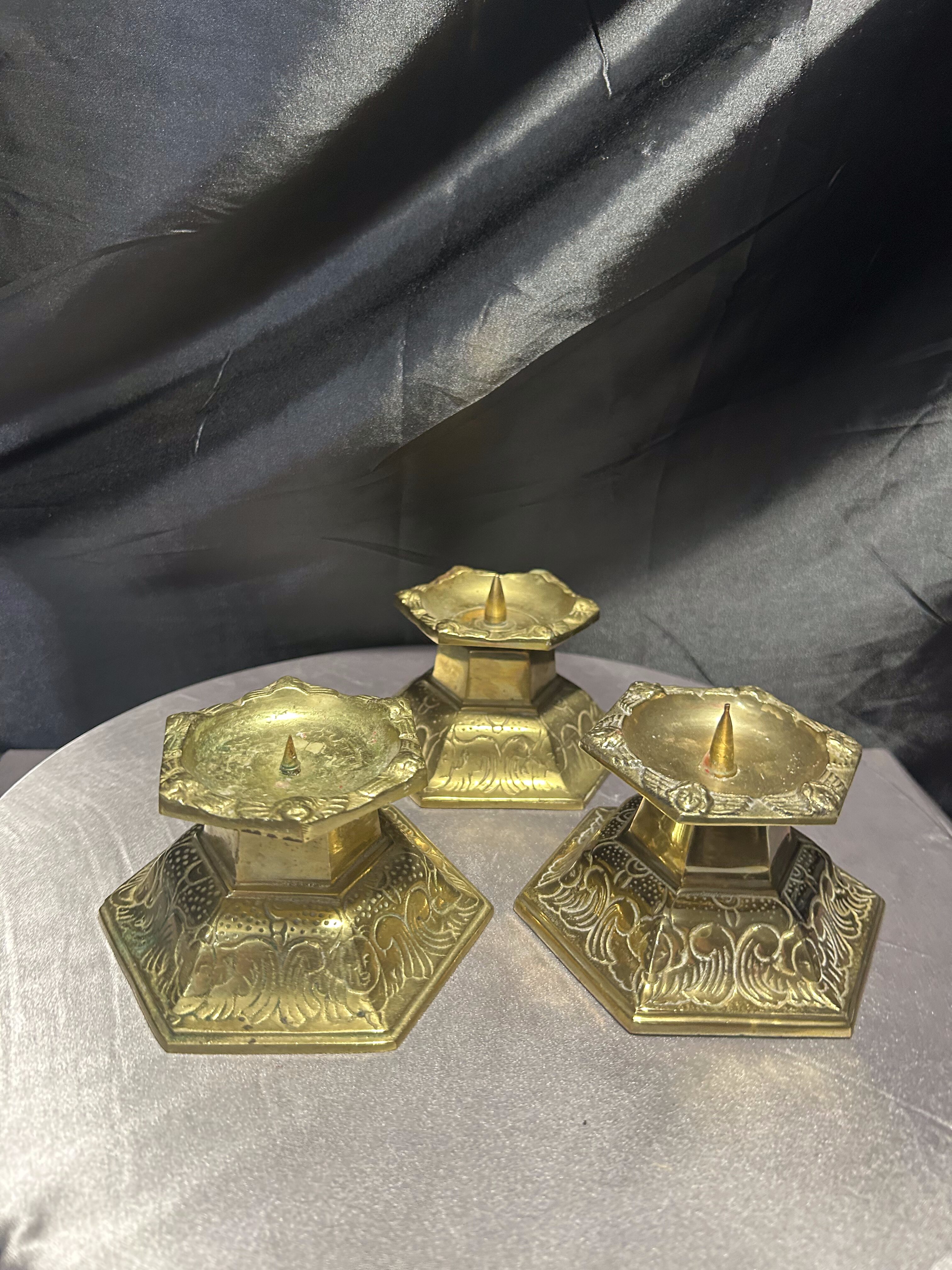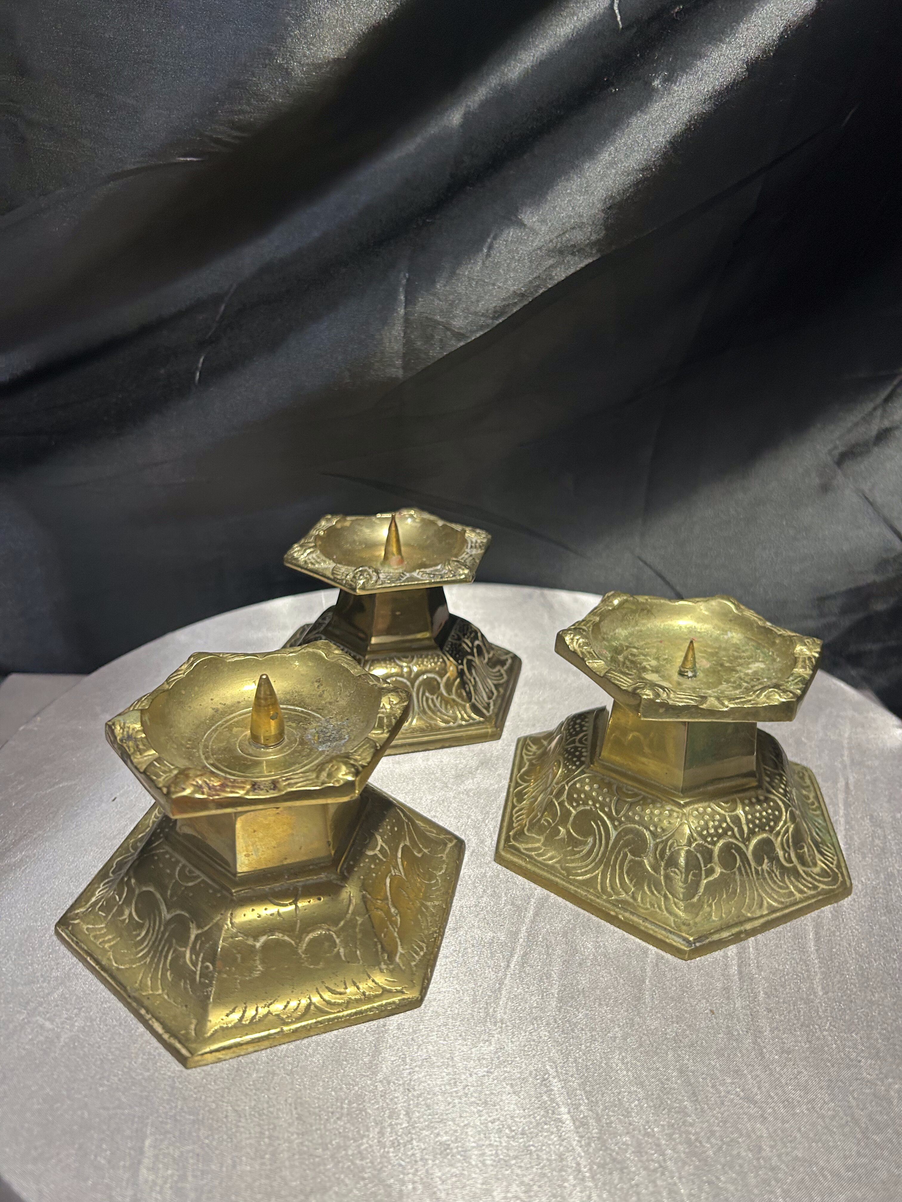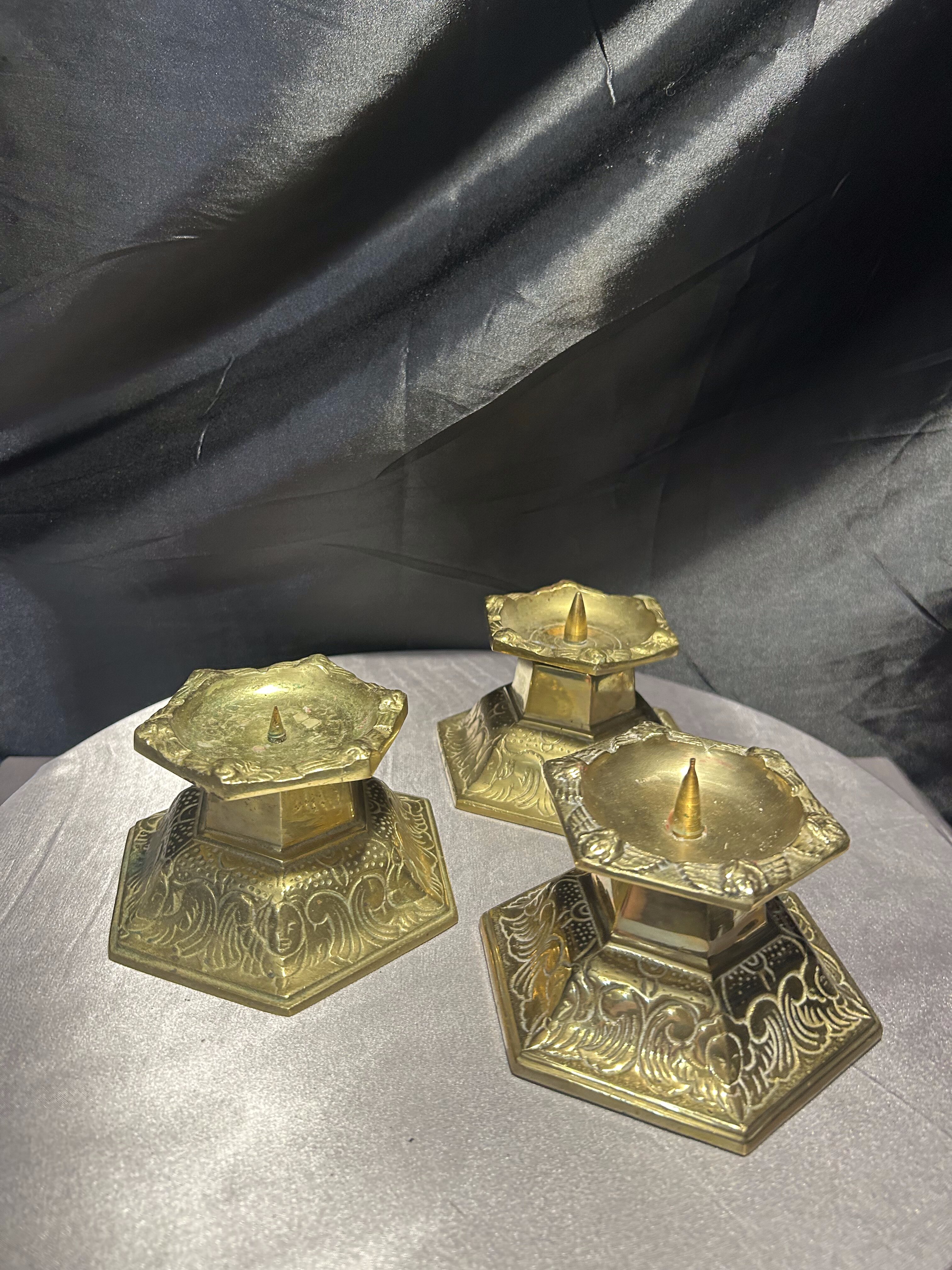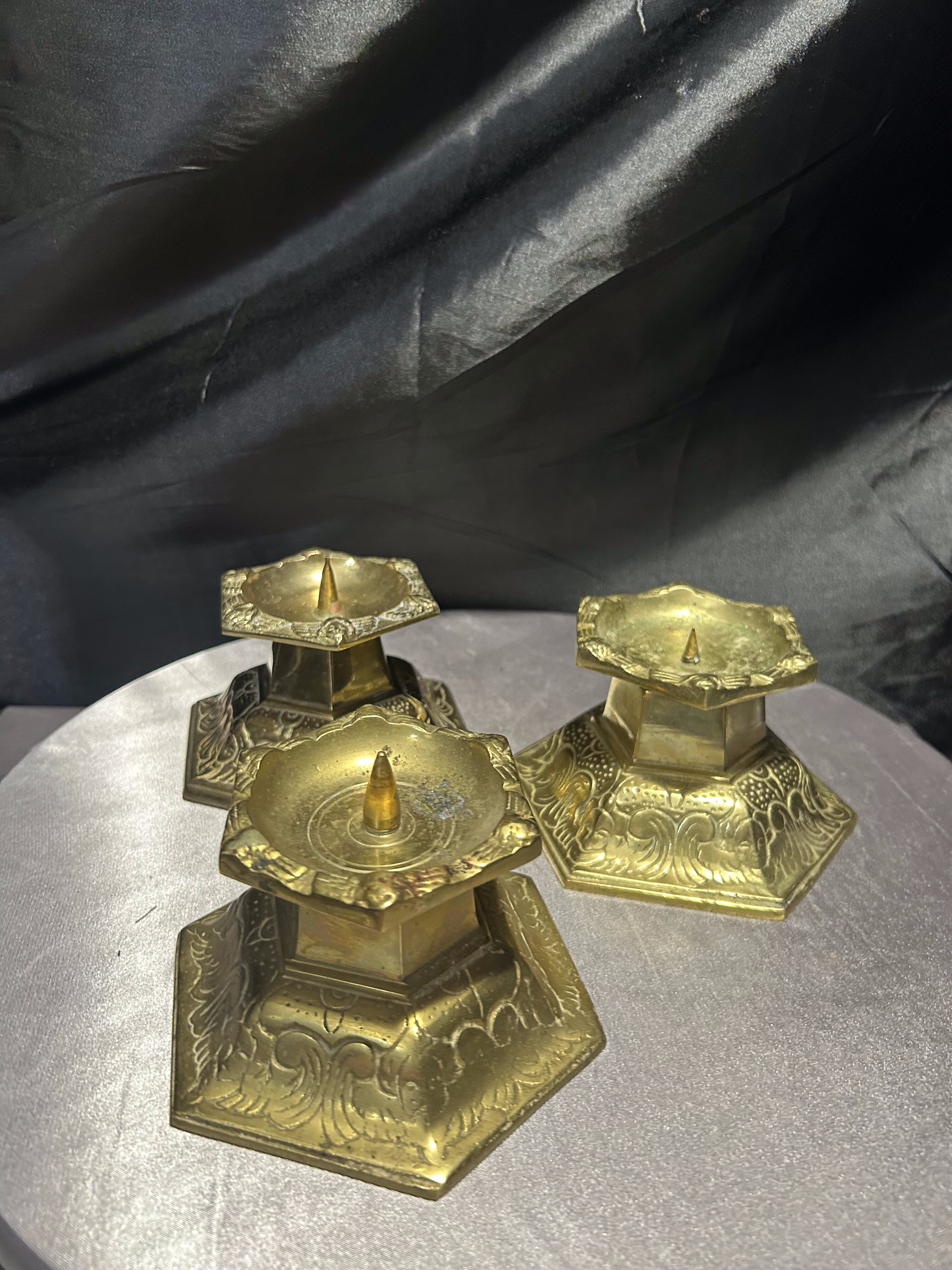 - Komplet trzech mosiężnych świeczników – zdobione podstawy – klasyczna forma
