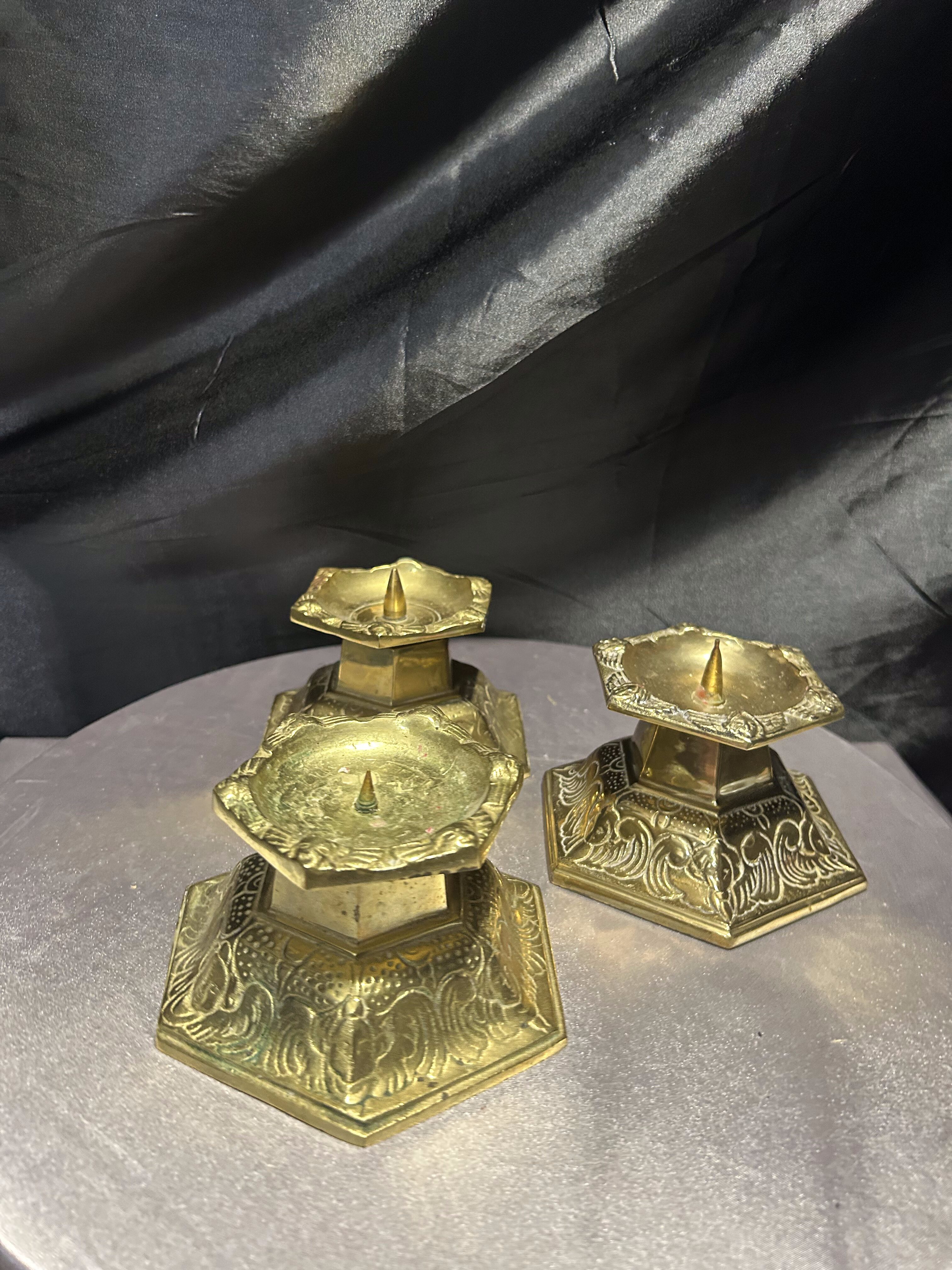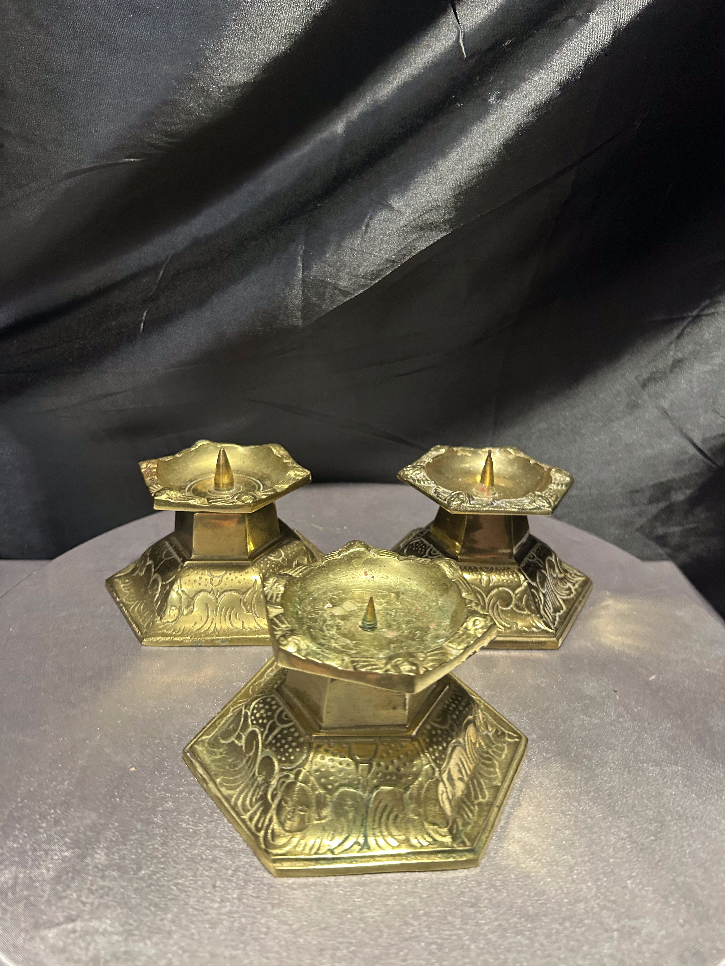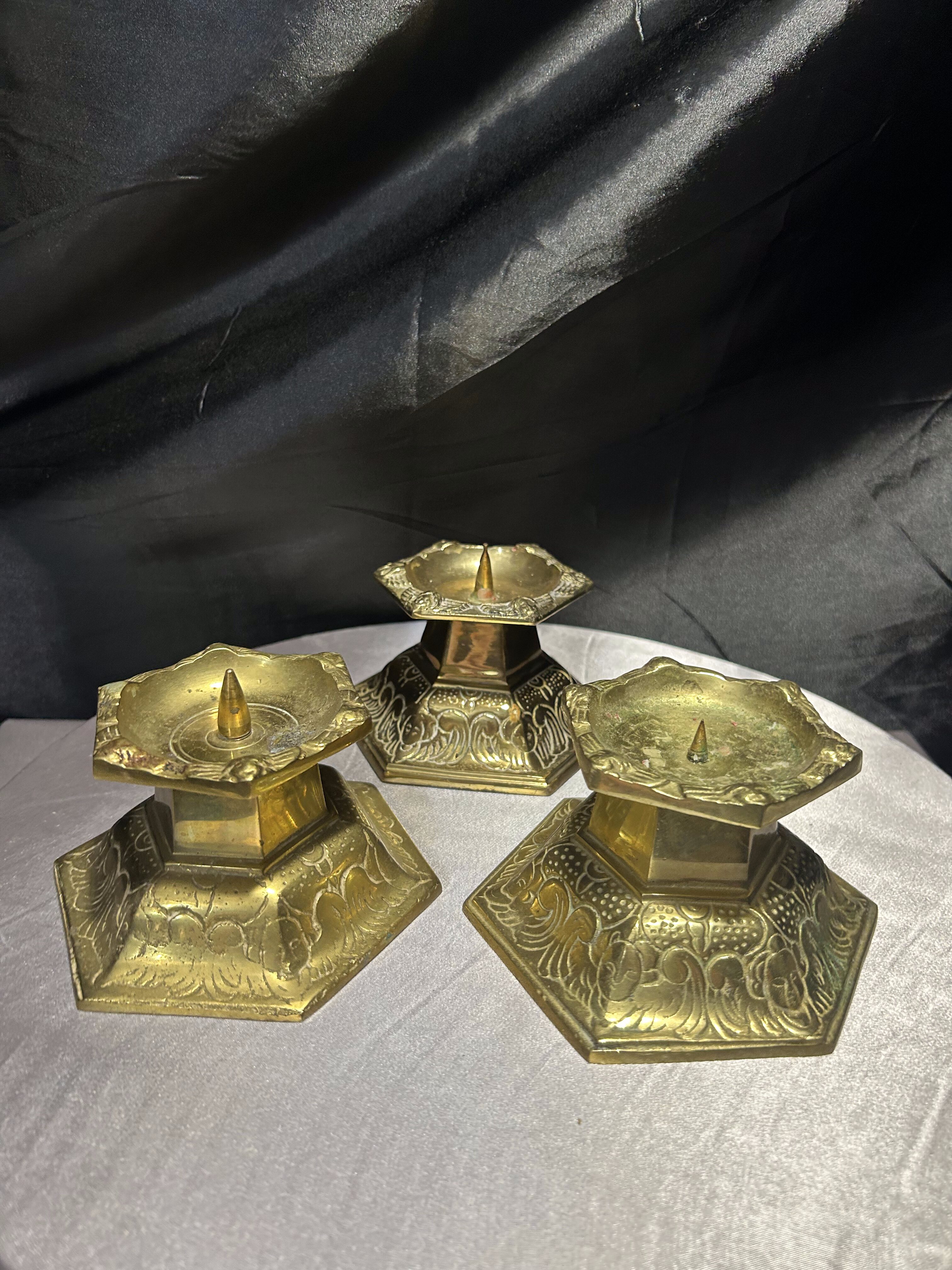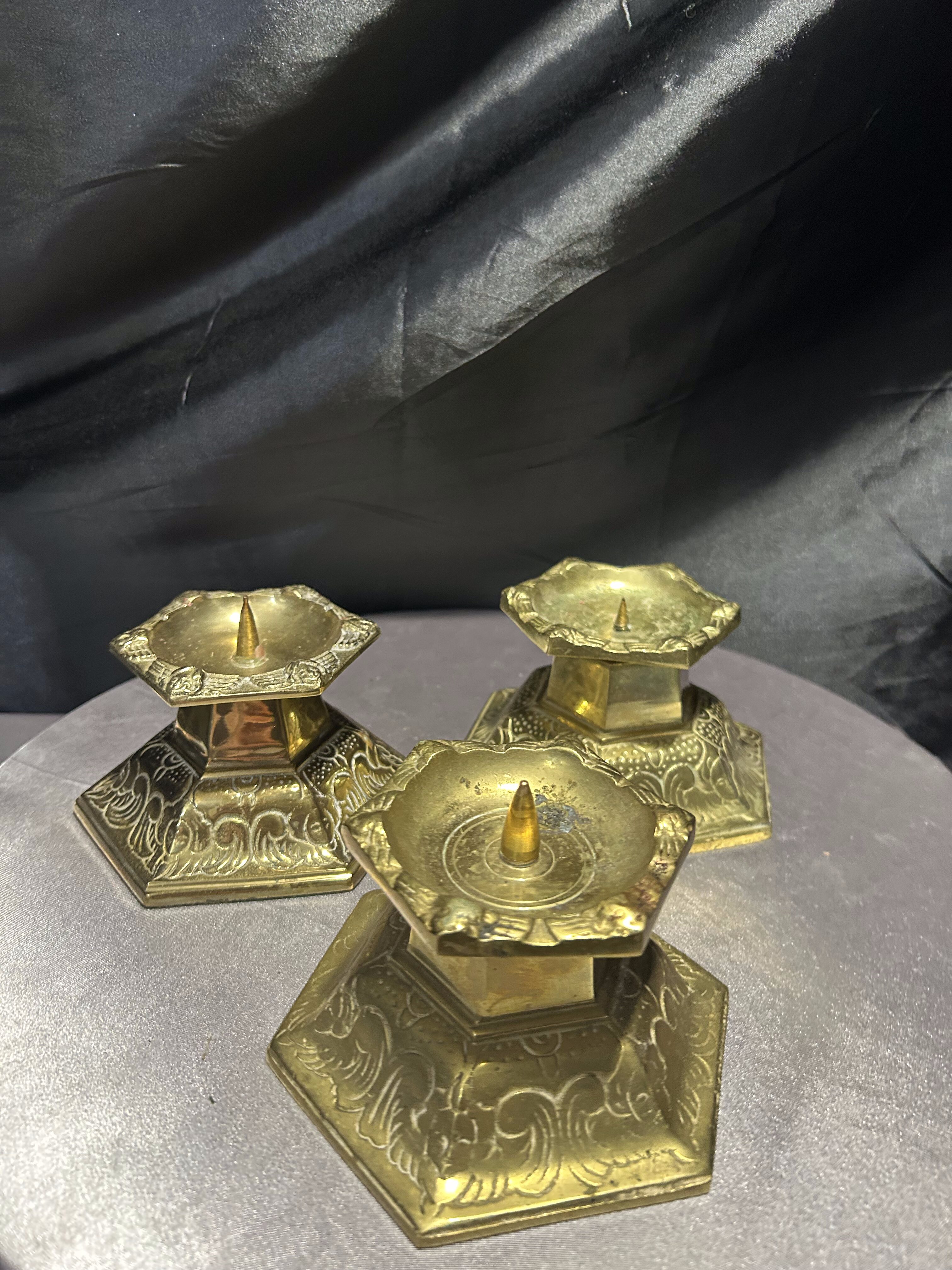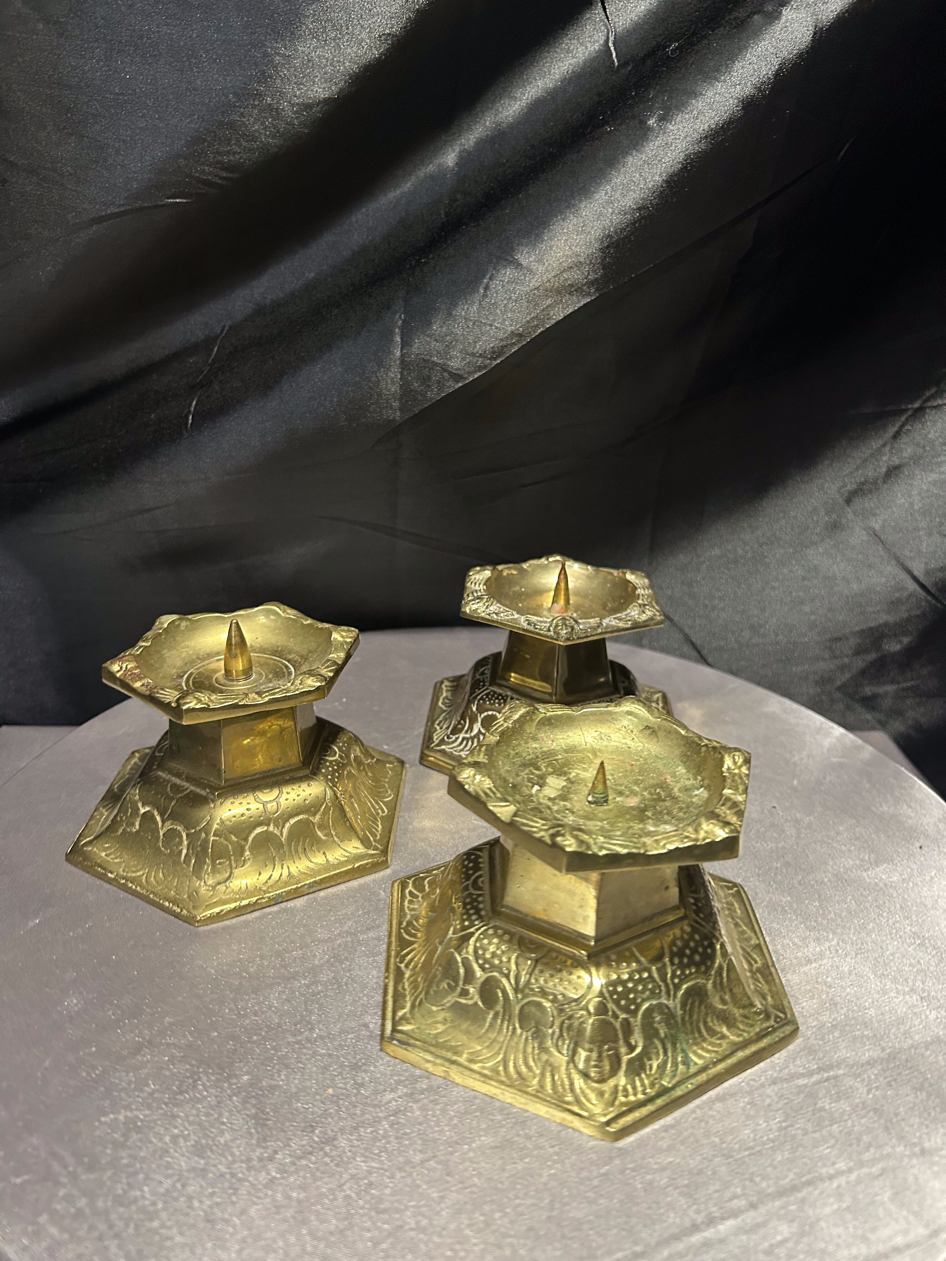 - Komplet trzech mosiężnych świeczników – zdobione podstawy – klasyczna forma