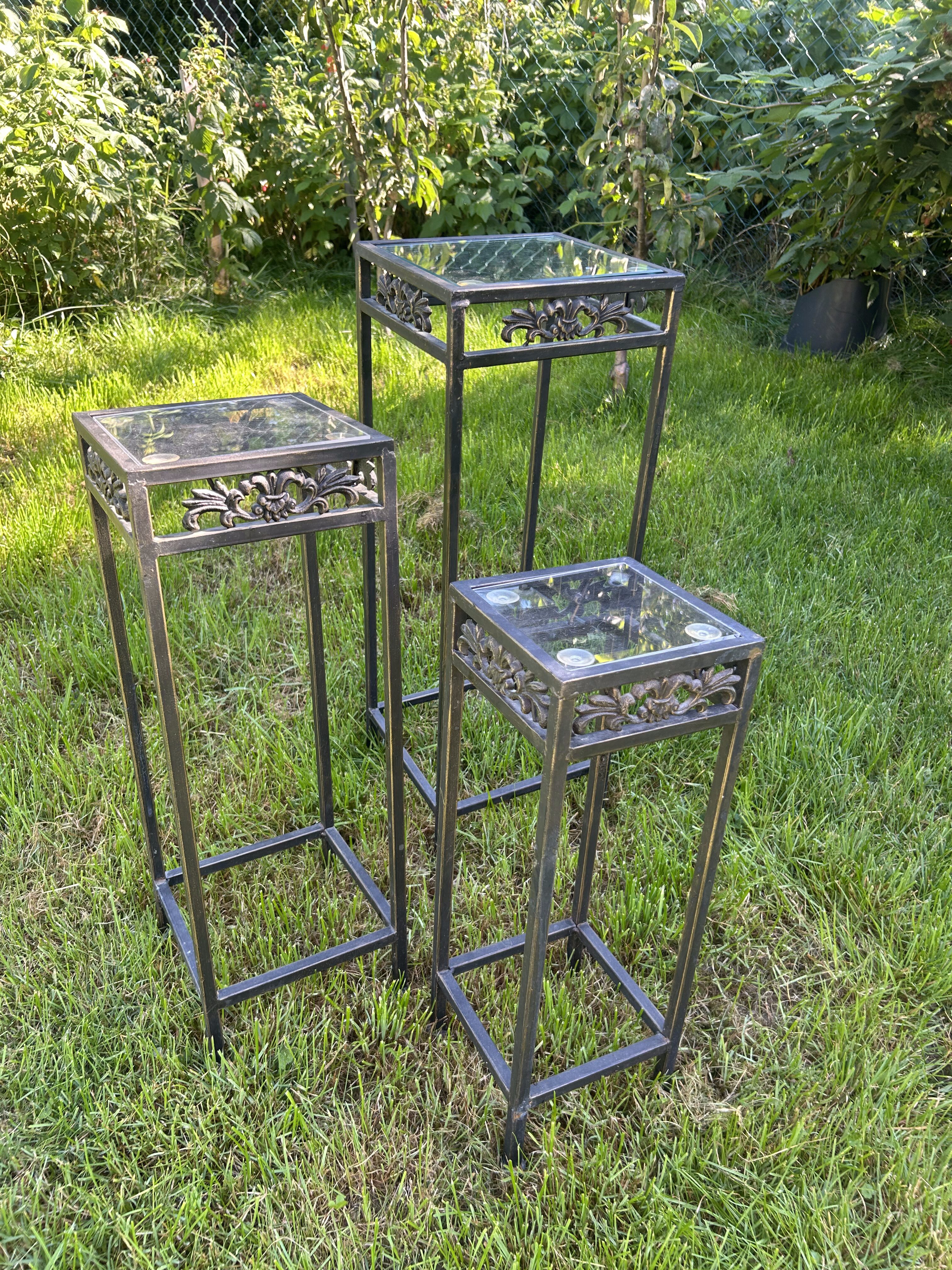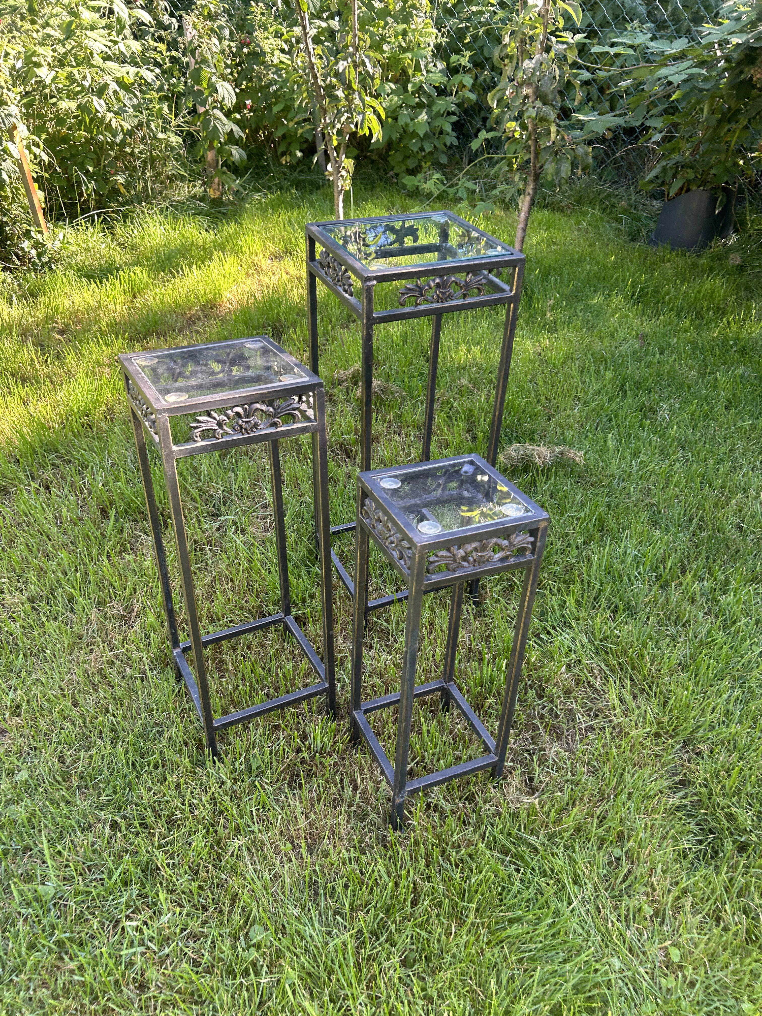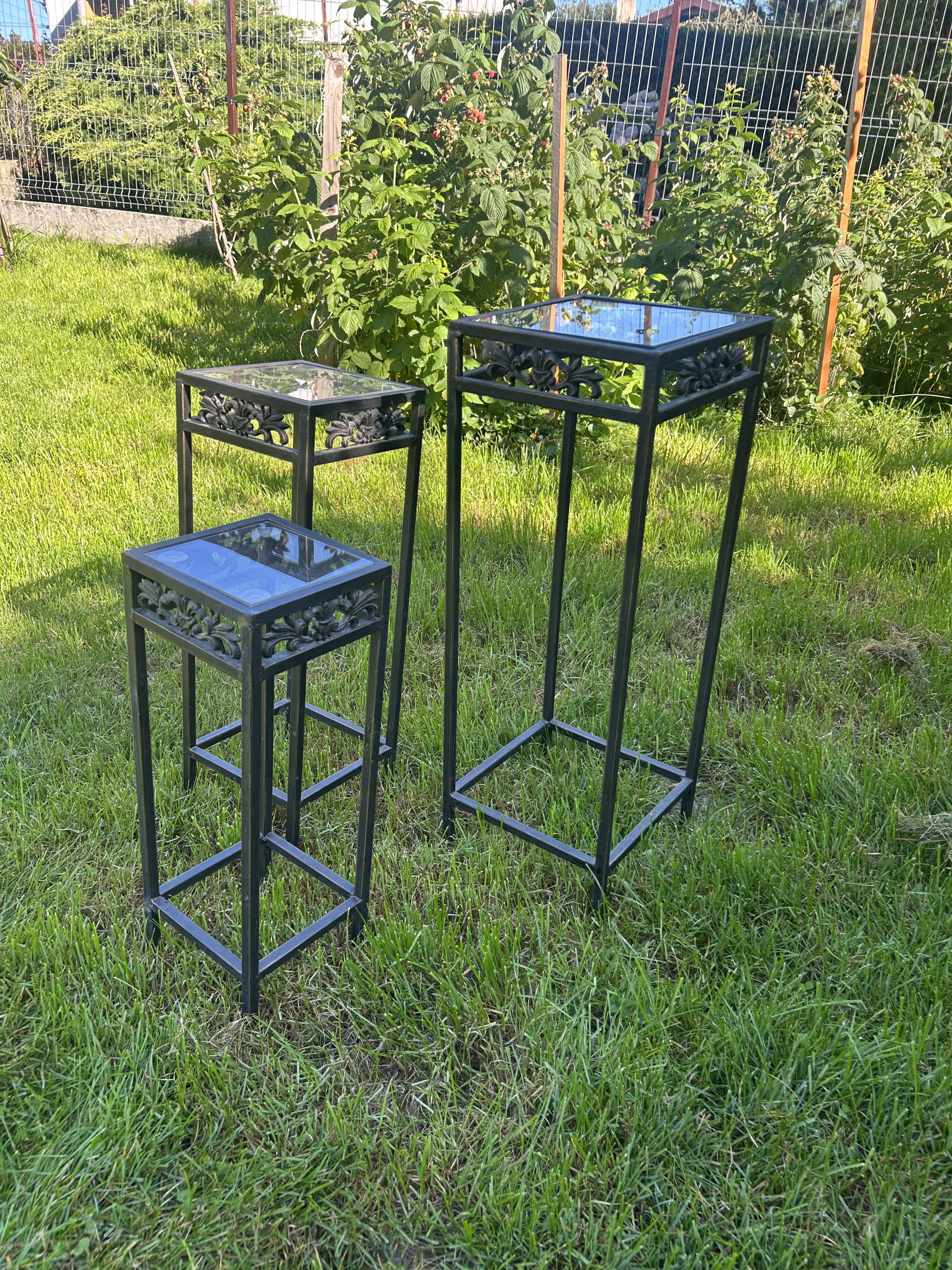 Komplet trzech stoliczków na kwiaty – metalowe – zdobione