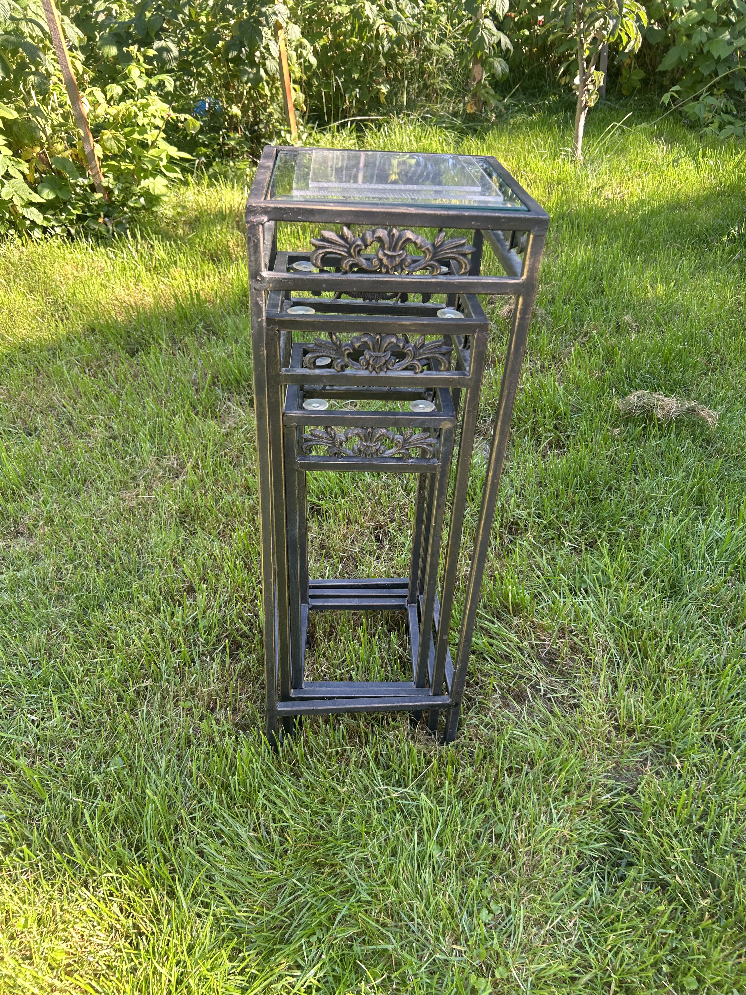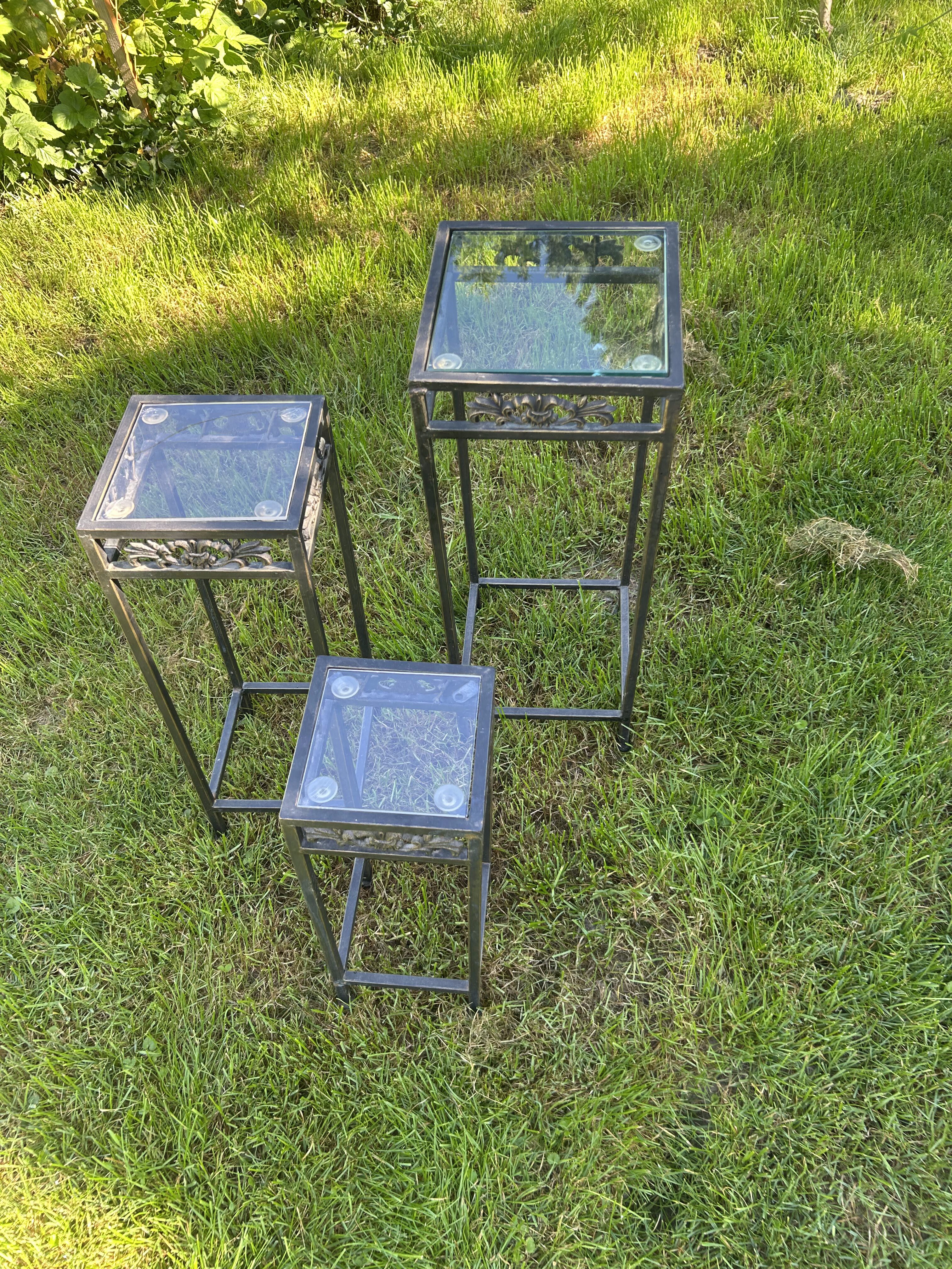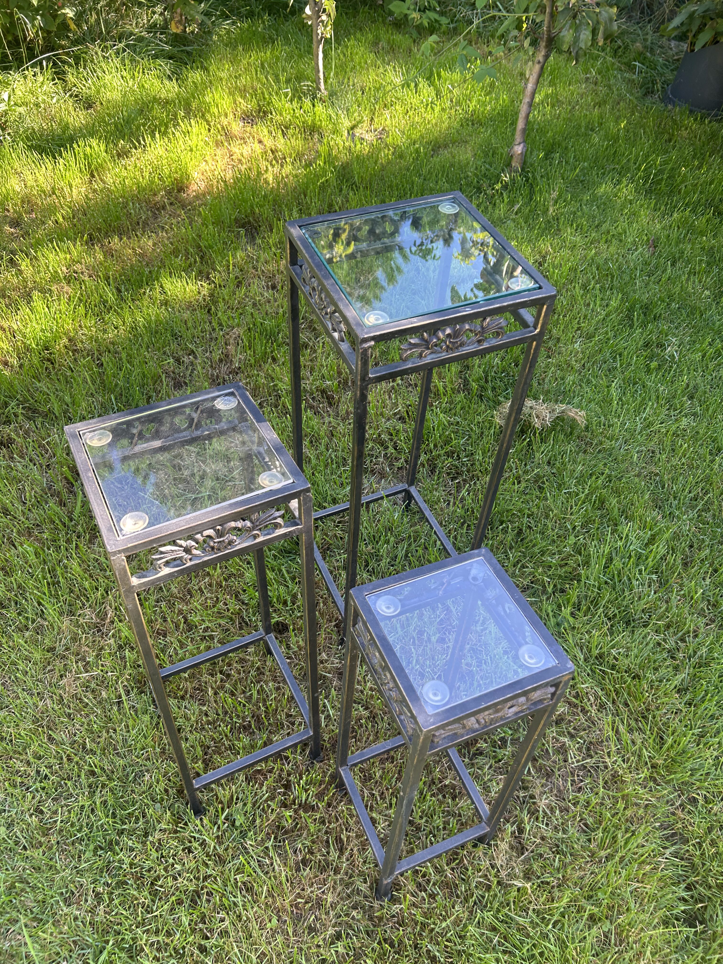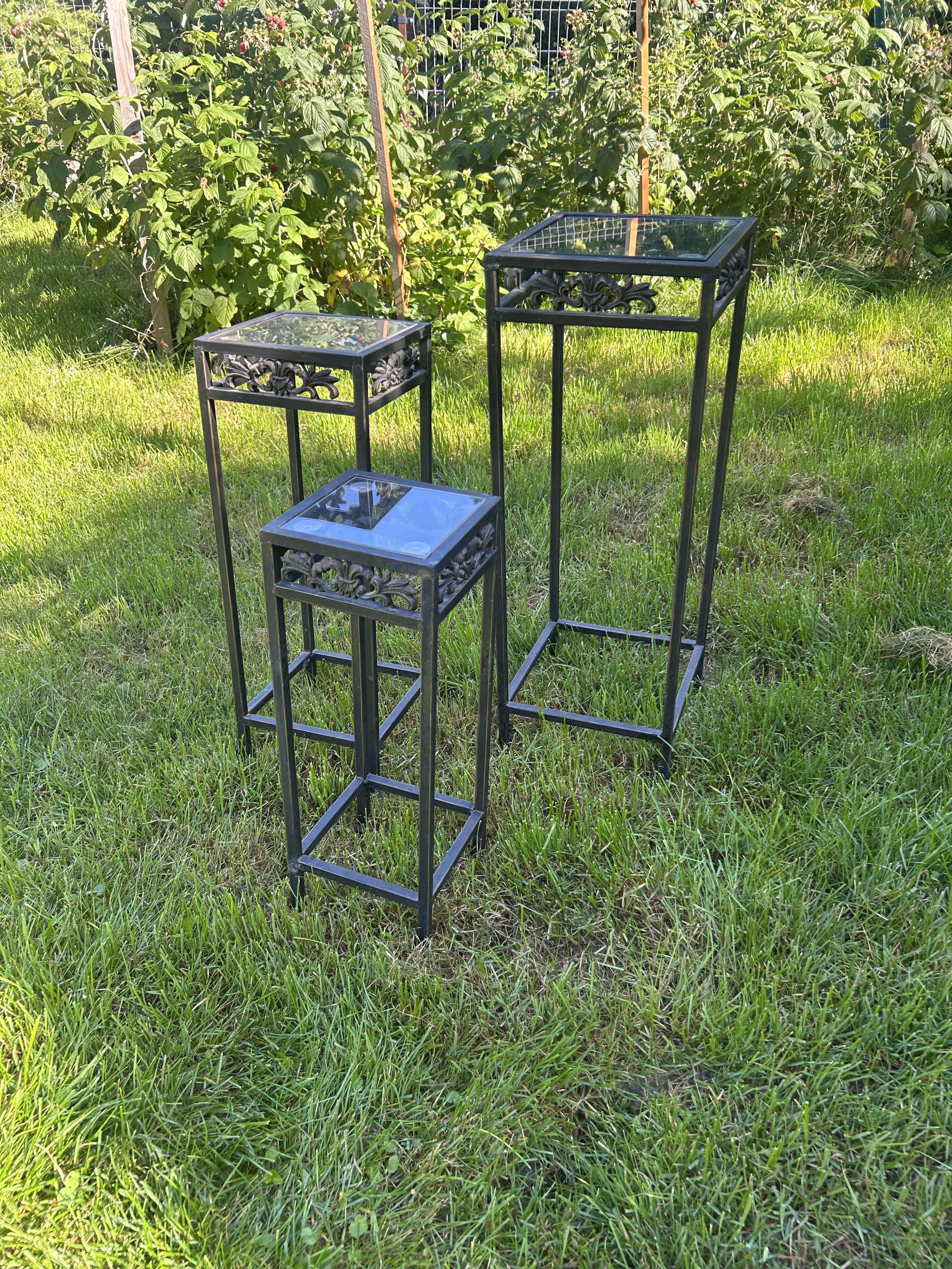 Komplet trzech stoliczków na kwiaty – metalowe – zdobione