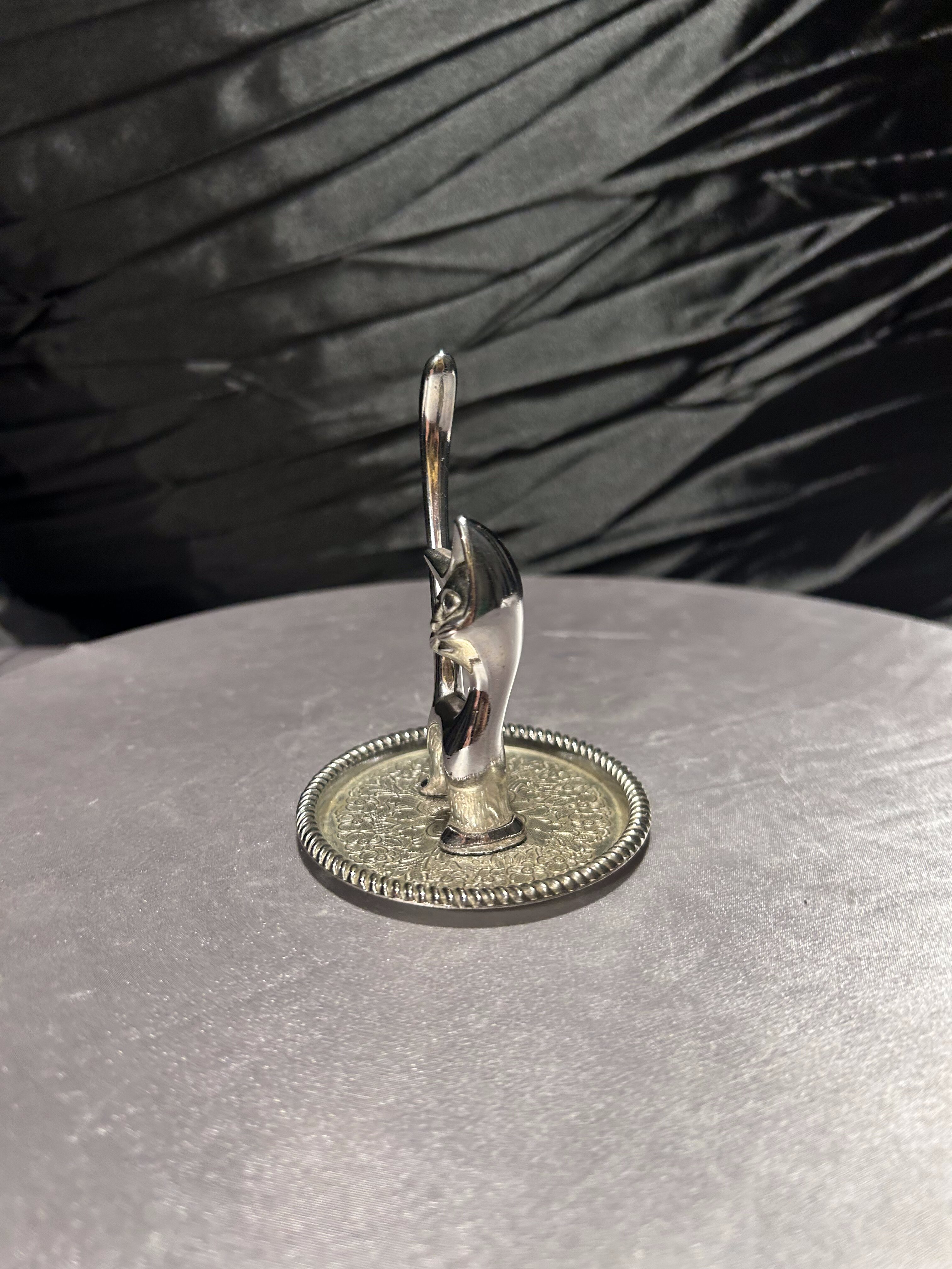 Uroczy stojak na biżuterię w formie kotka w srebrnym kolorze, osadzonego na ozdobnej, metalowej tackce. Jego smukła sylwetka i długi, elegancki ogon doskonale sprawdzają się do przechowywania pierścionków i drobnych ozdób. Tacka może posłużyć jako miejsce na kolczyki, bransoletki czy naszyjnik, dzięki czemu całość tworzy praktyczną, a zarazem efektowną dekorację toaletki lub komody.