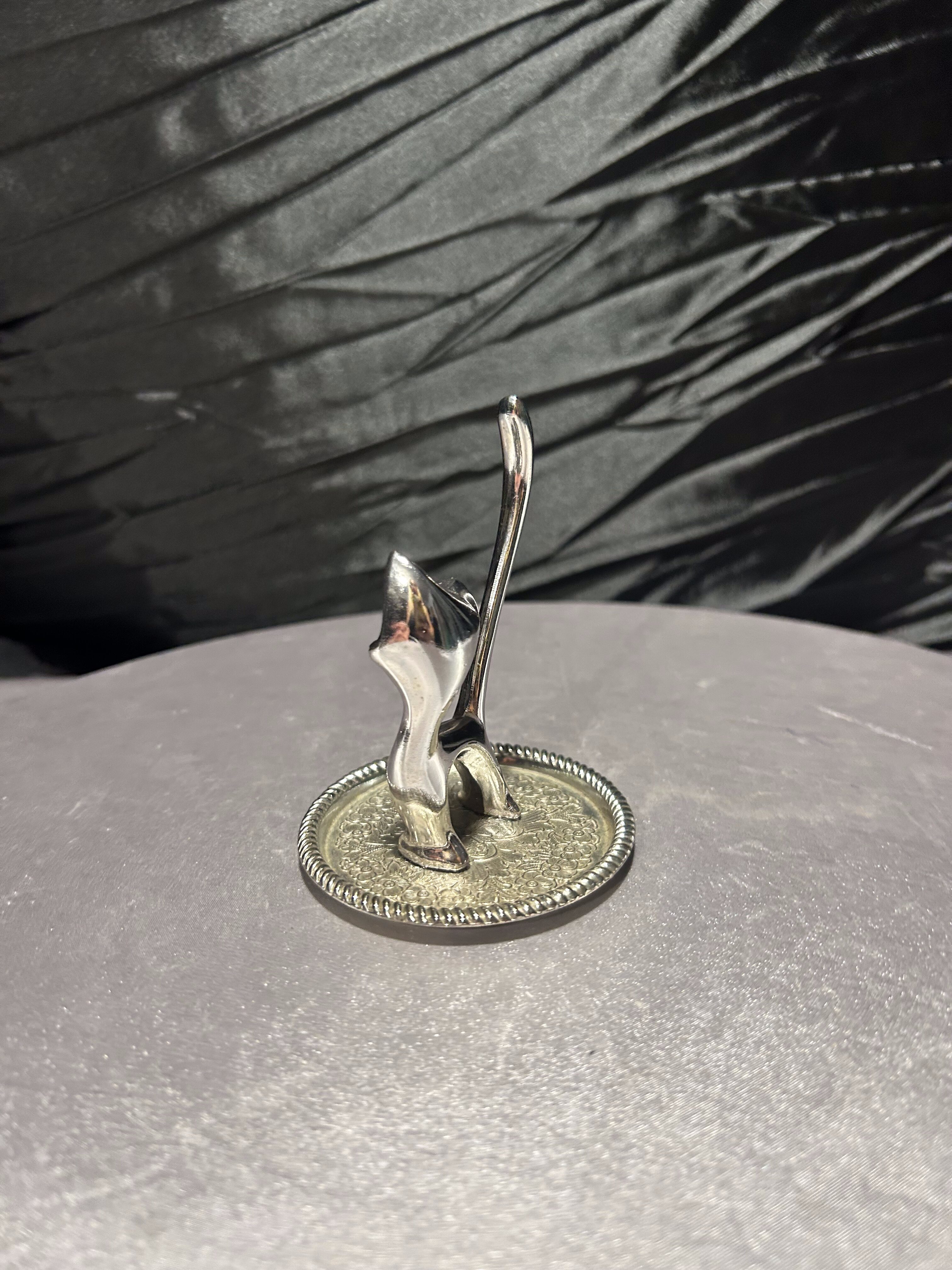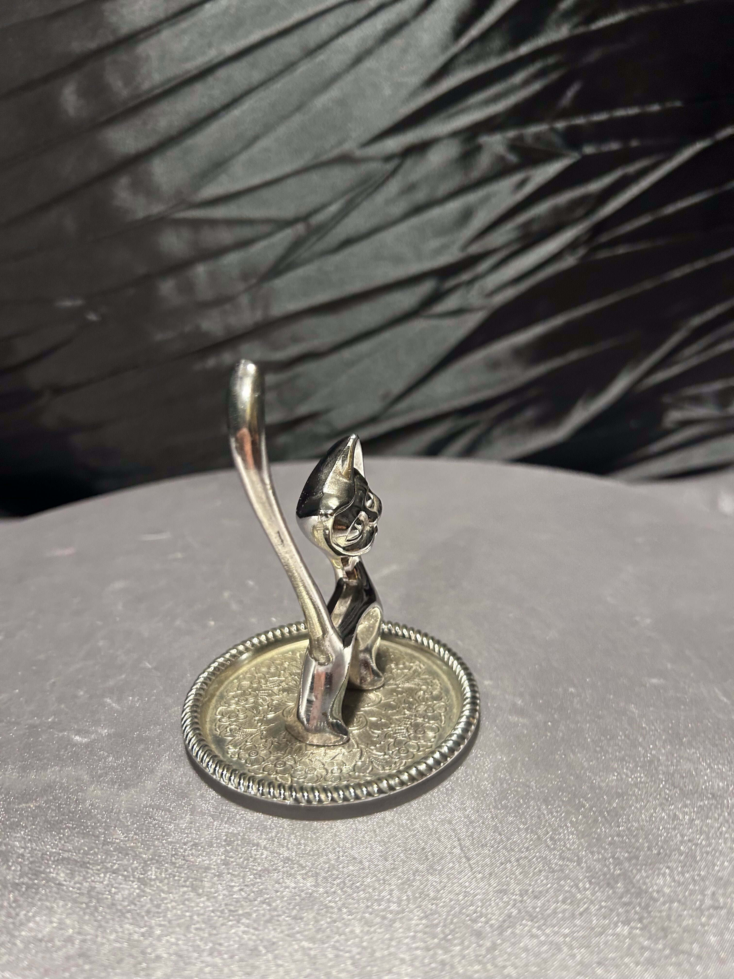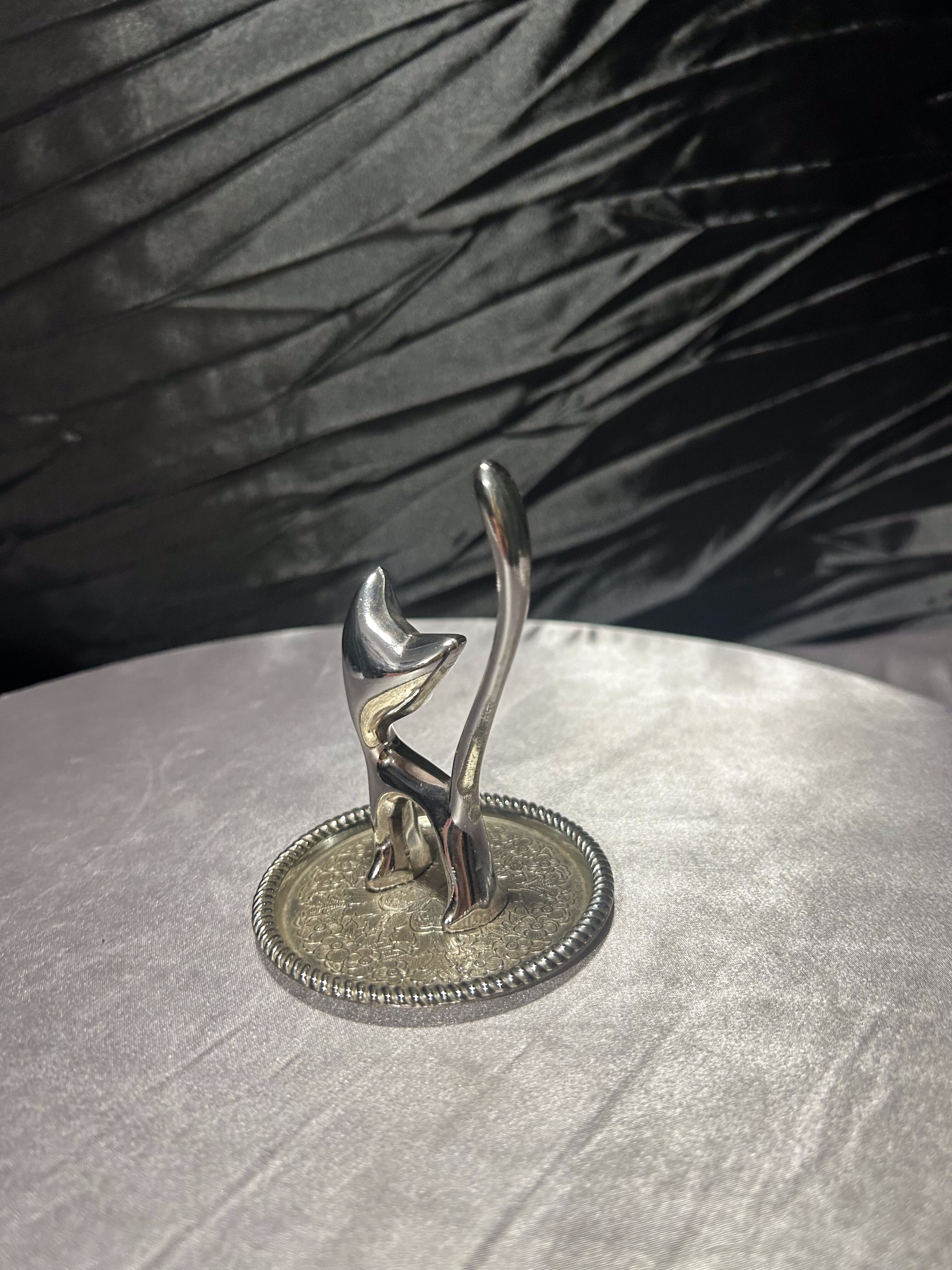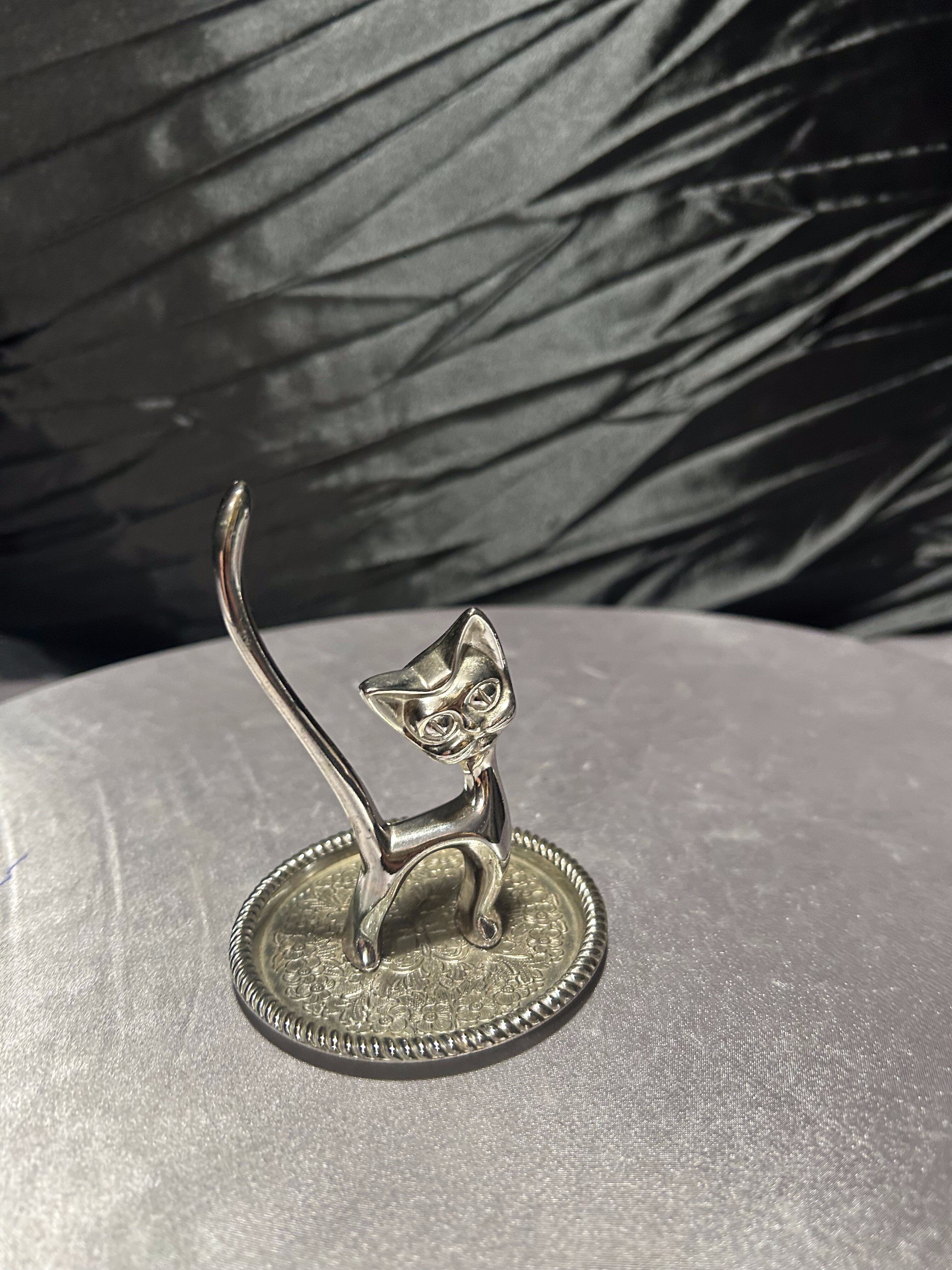 Kotek na biżuterię w srebrnym kolorze – stojak z tacką, wysokość 10 cm