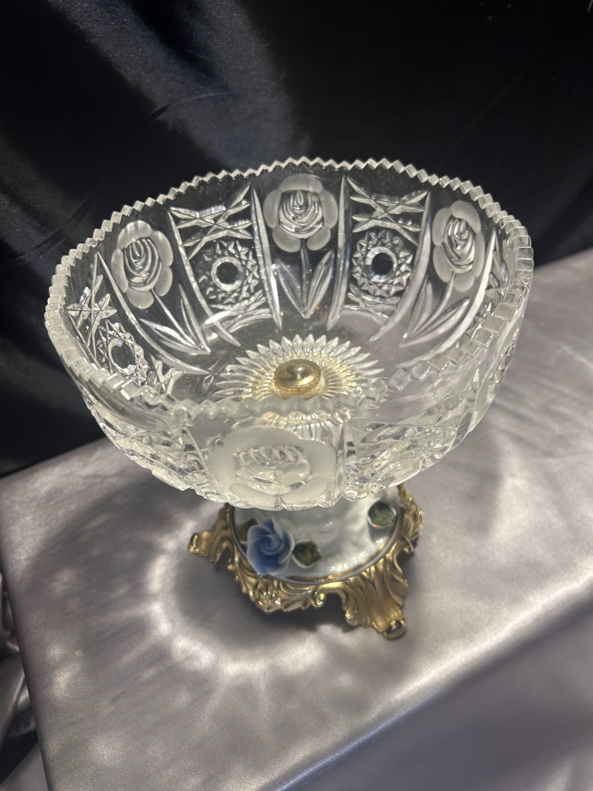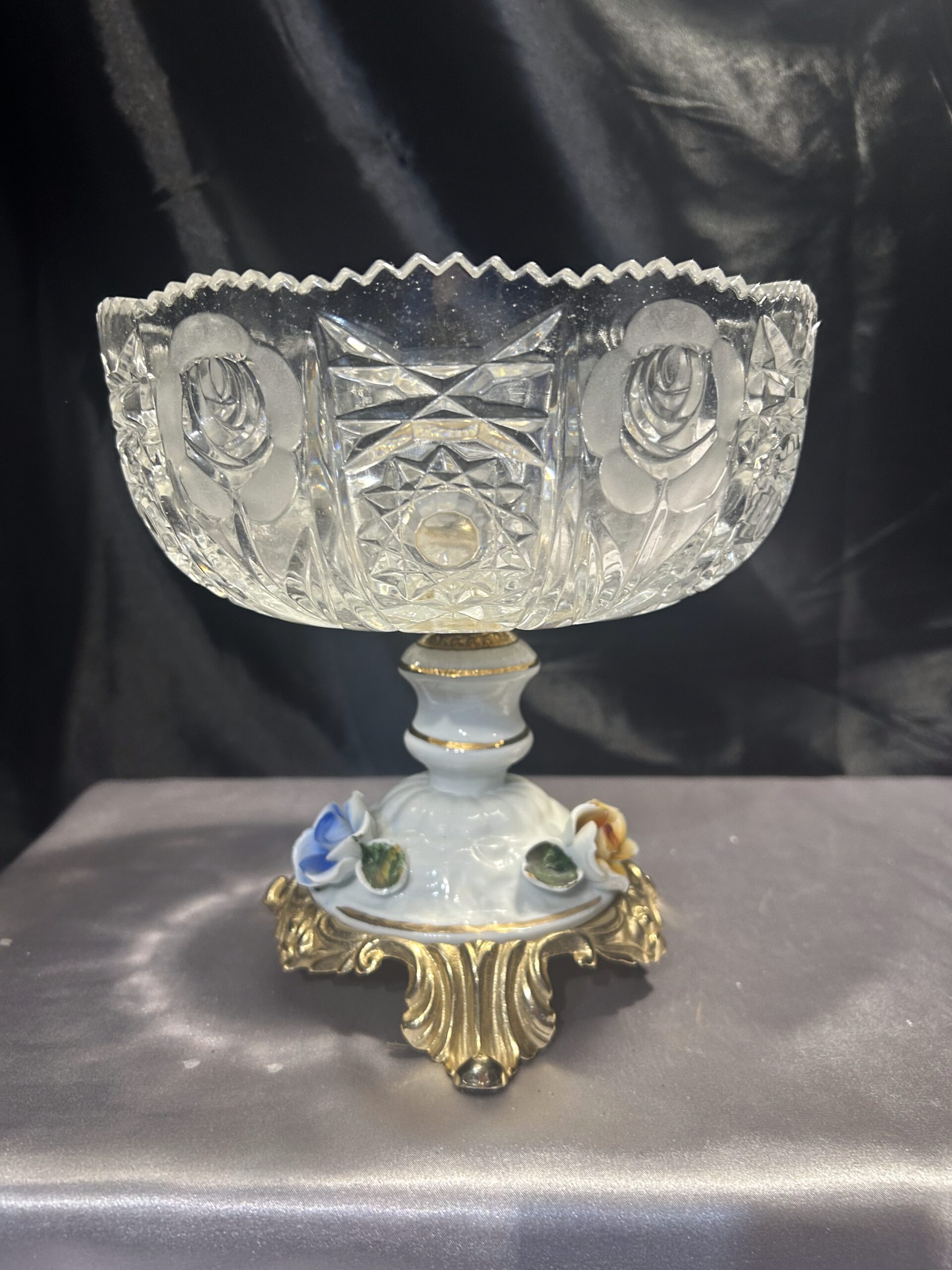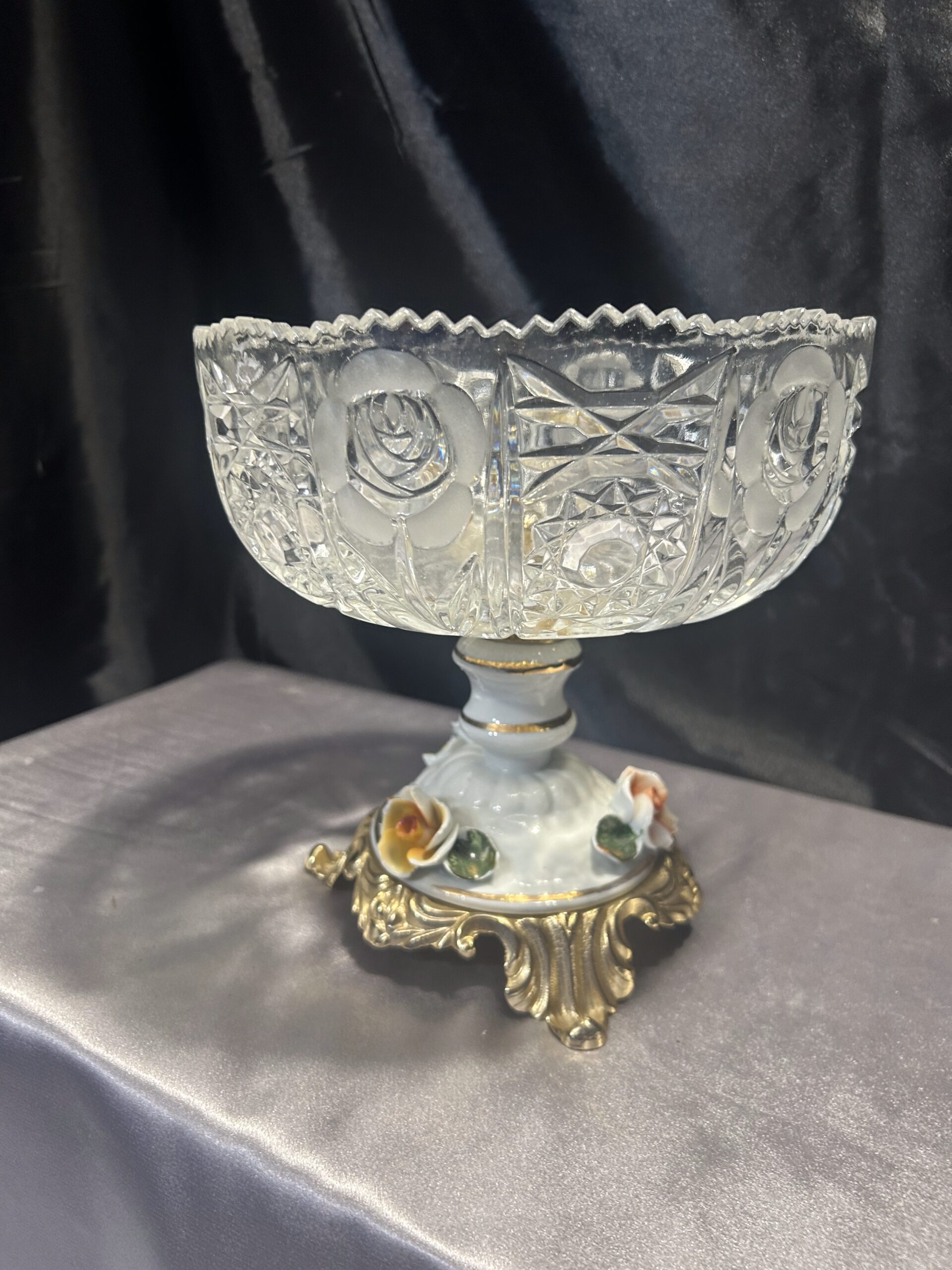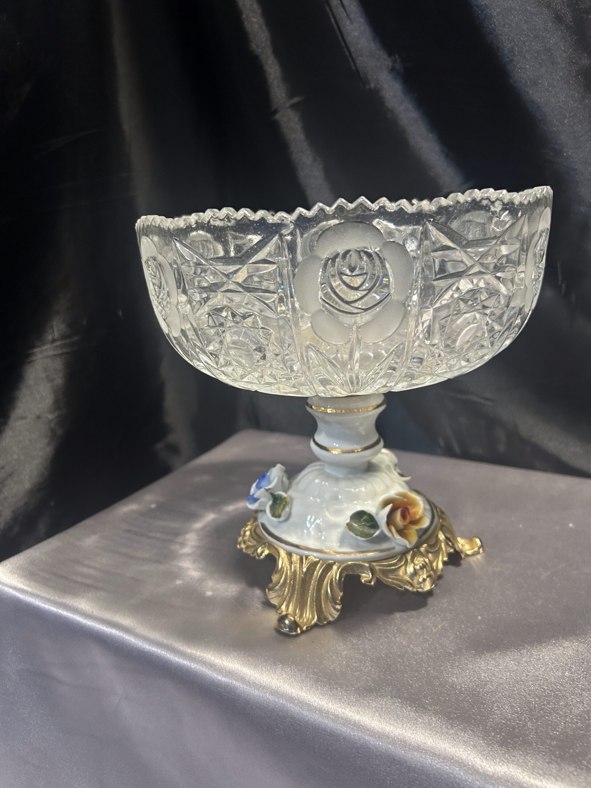 Kryształowa patera z ceramiczną zdobioną nogą w kwiaty to prawdziwy unikat, który doda elegancji każdemu wnętrzu.