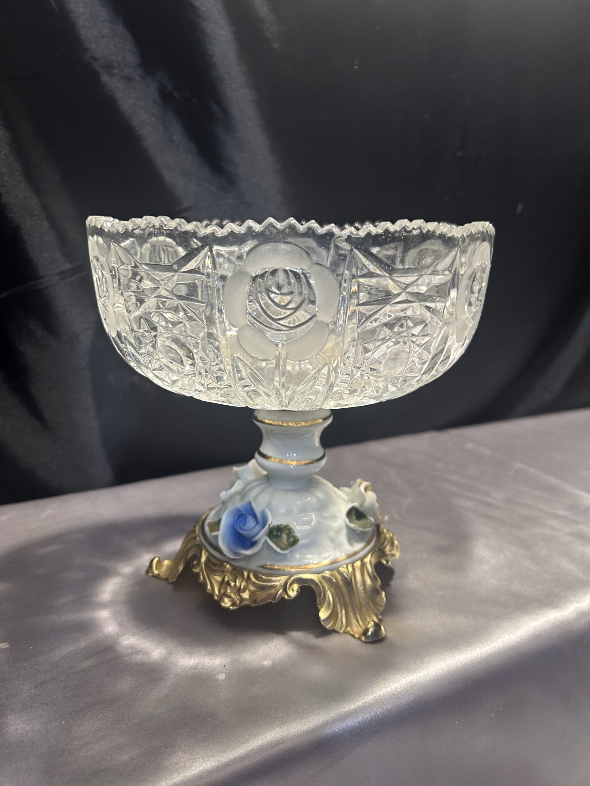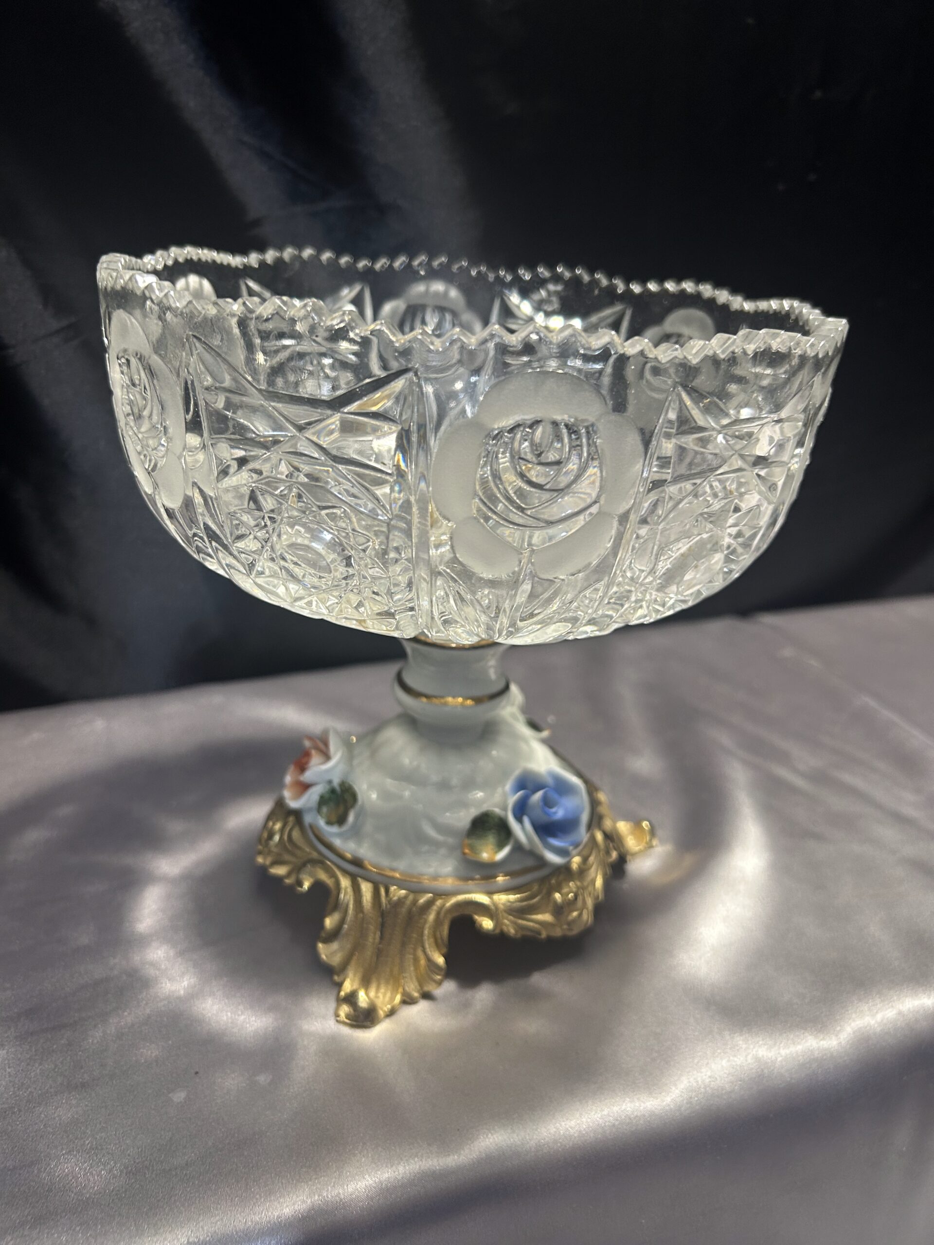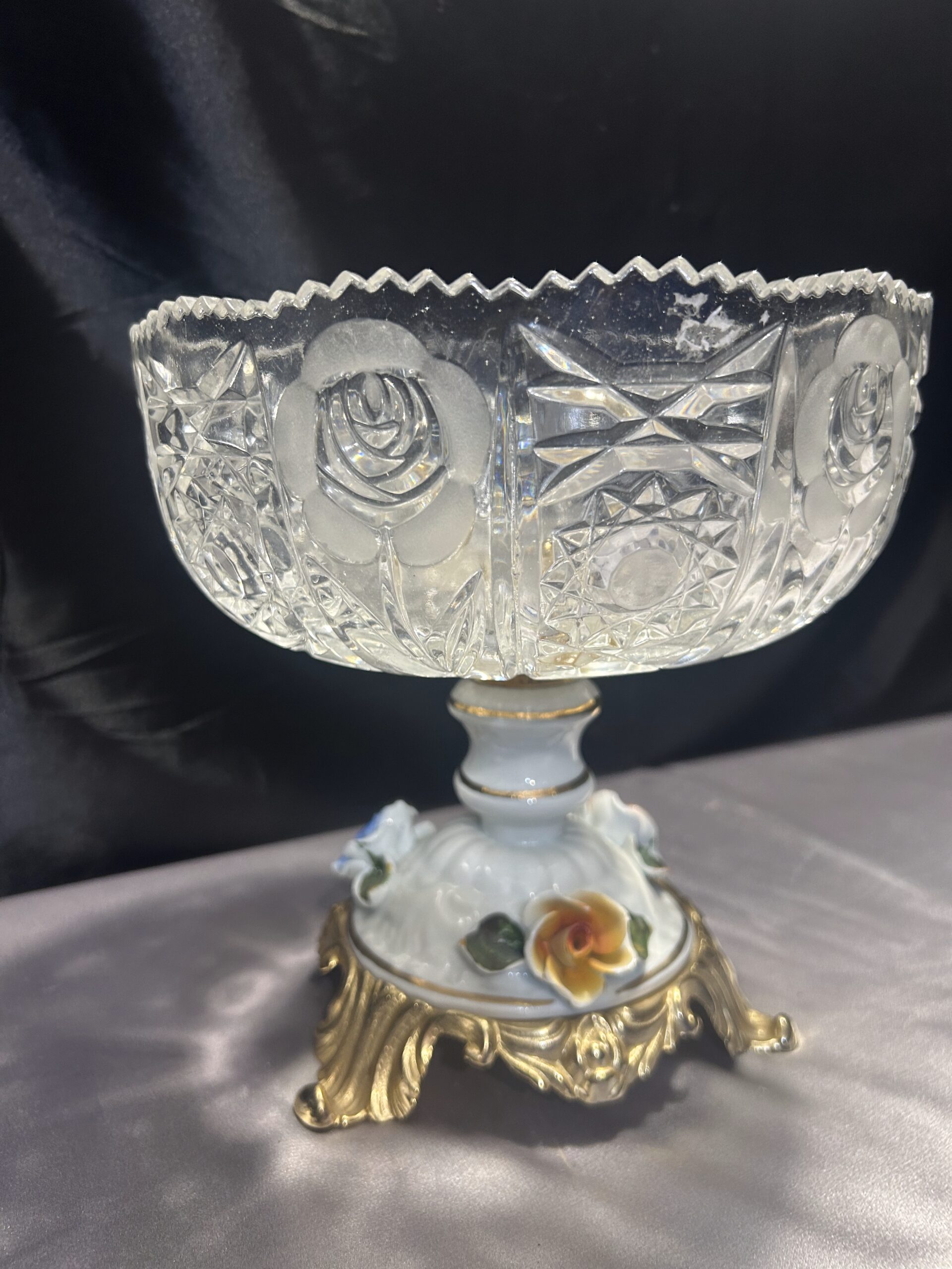 Kryształowa patera z ceramiczną zdobioną nogą w kwiaty to prawdziwy unikat, który doda elegancji każdemu wnętrzu.