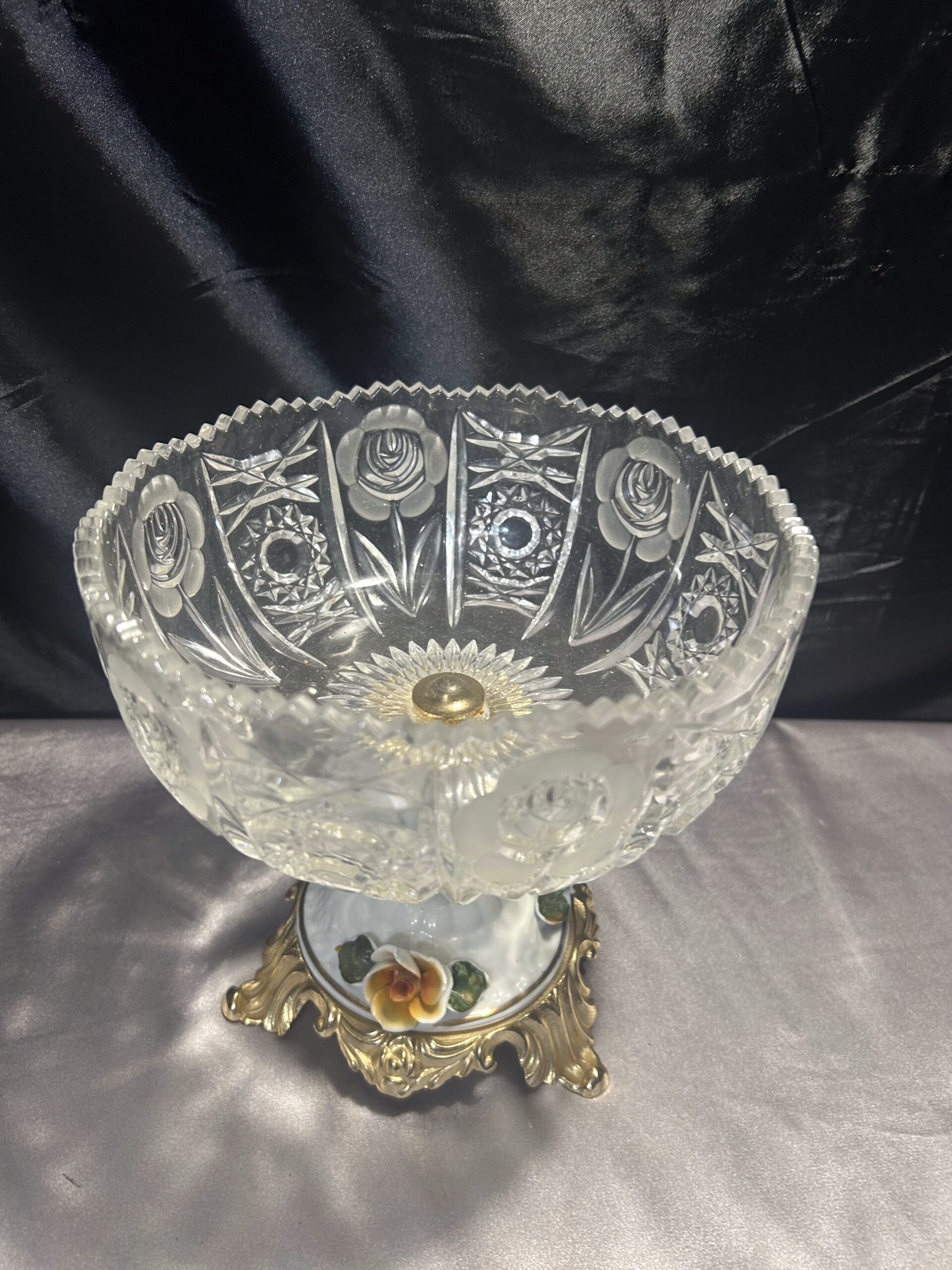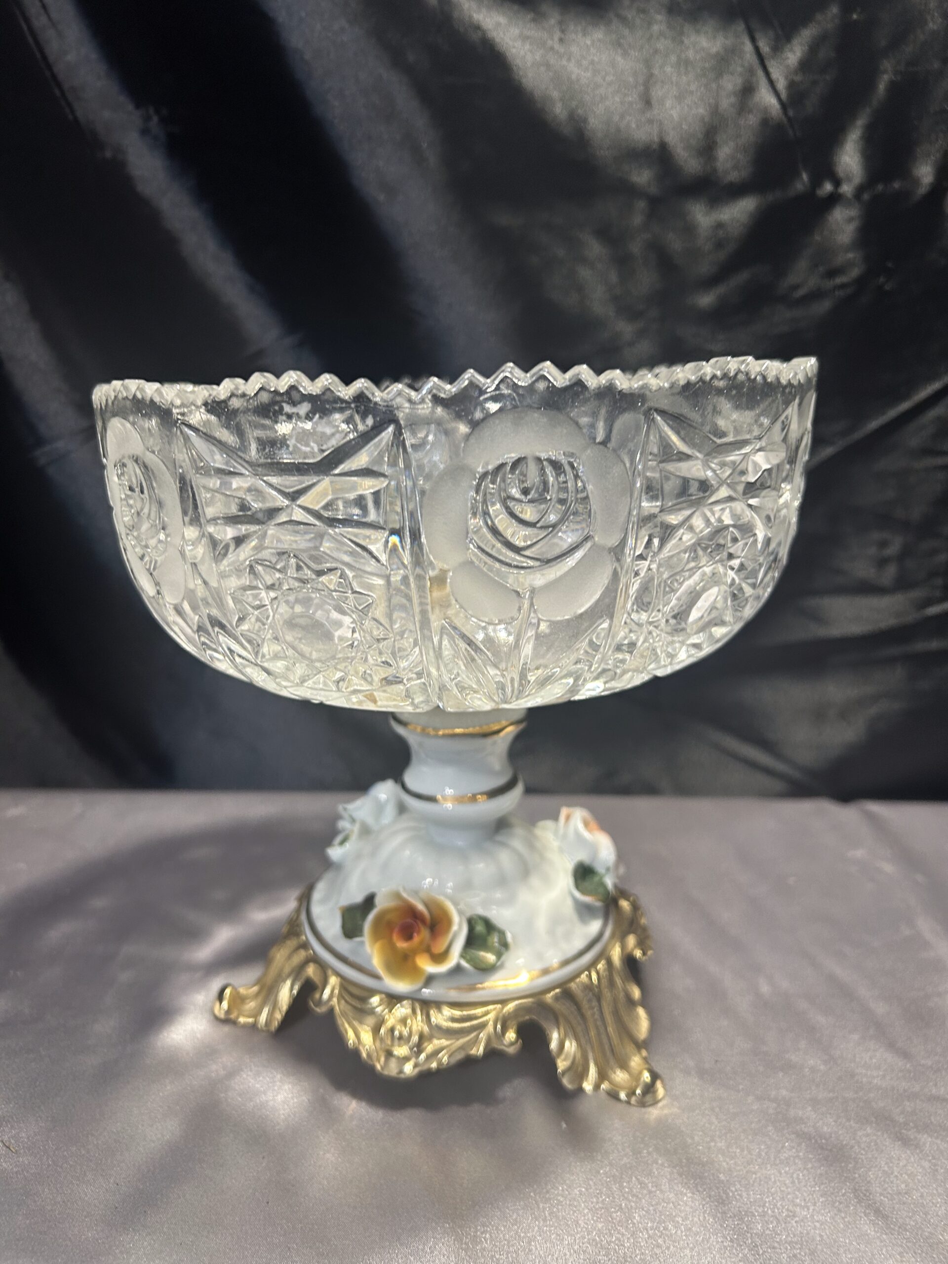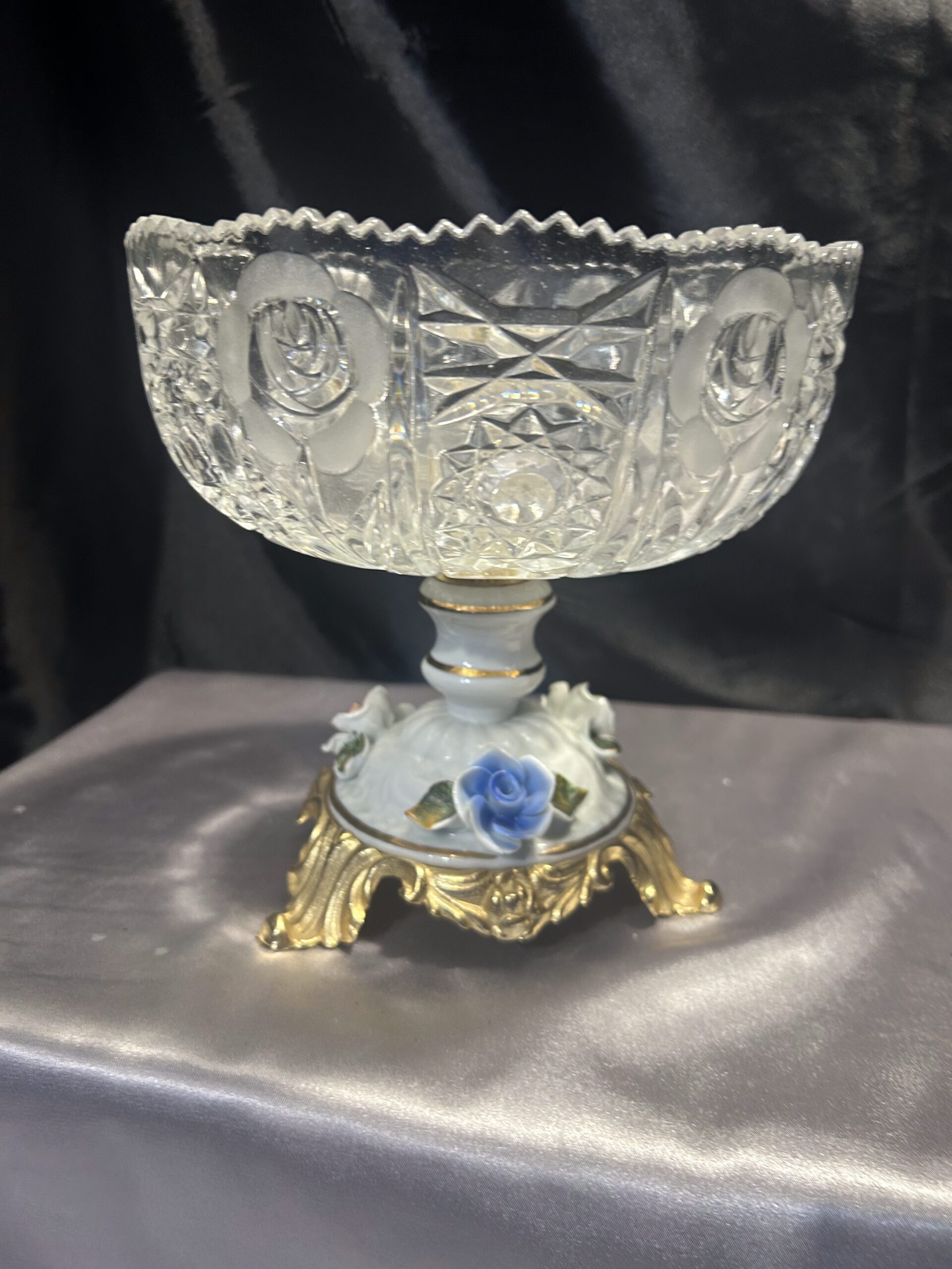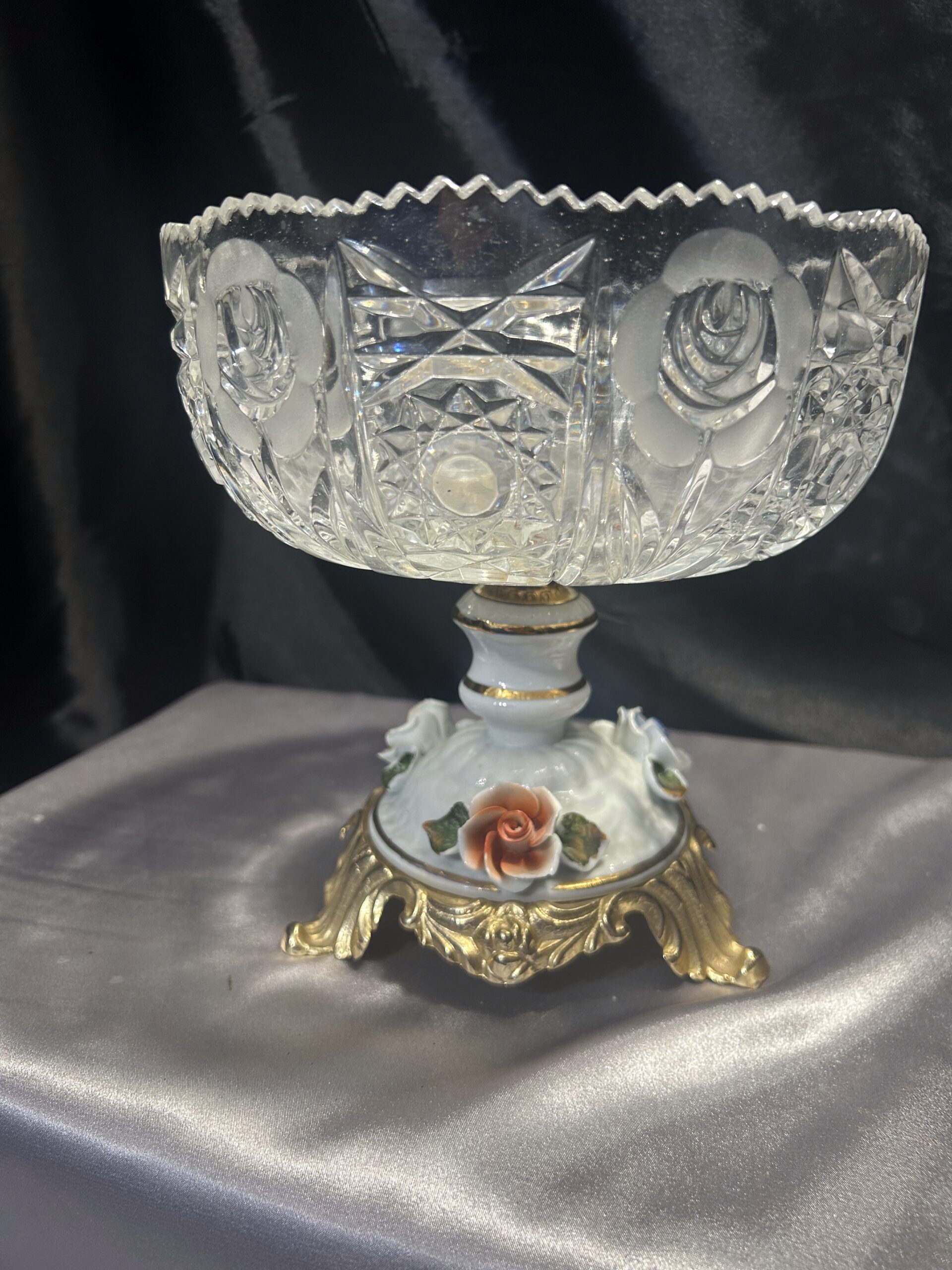 Kryształowa patera z ceramiczną zdobioną nogą w kwiaty to prawdziwy unikat, który doda elegancji każdemu wnętrzu.