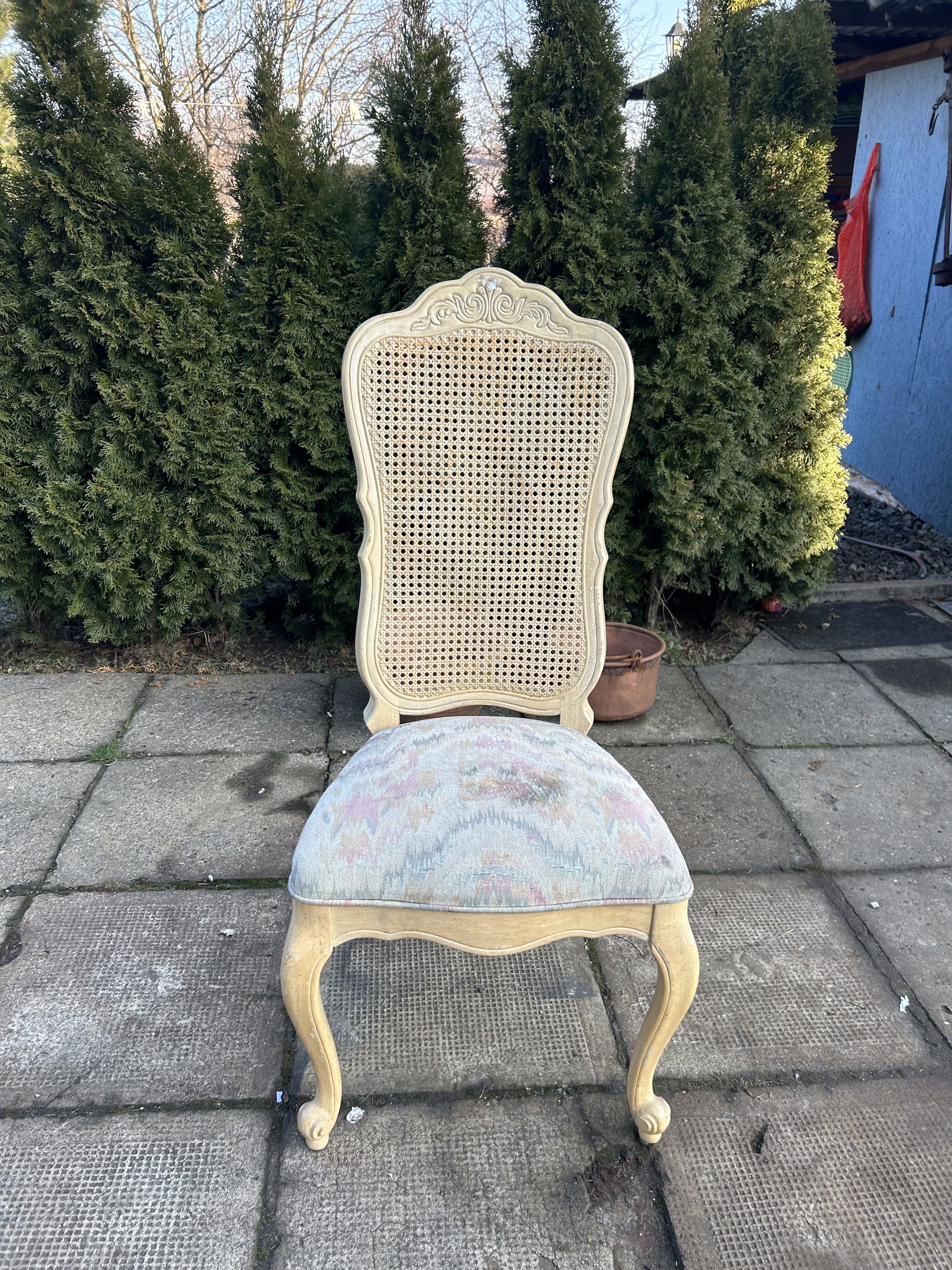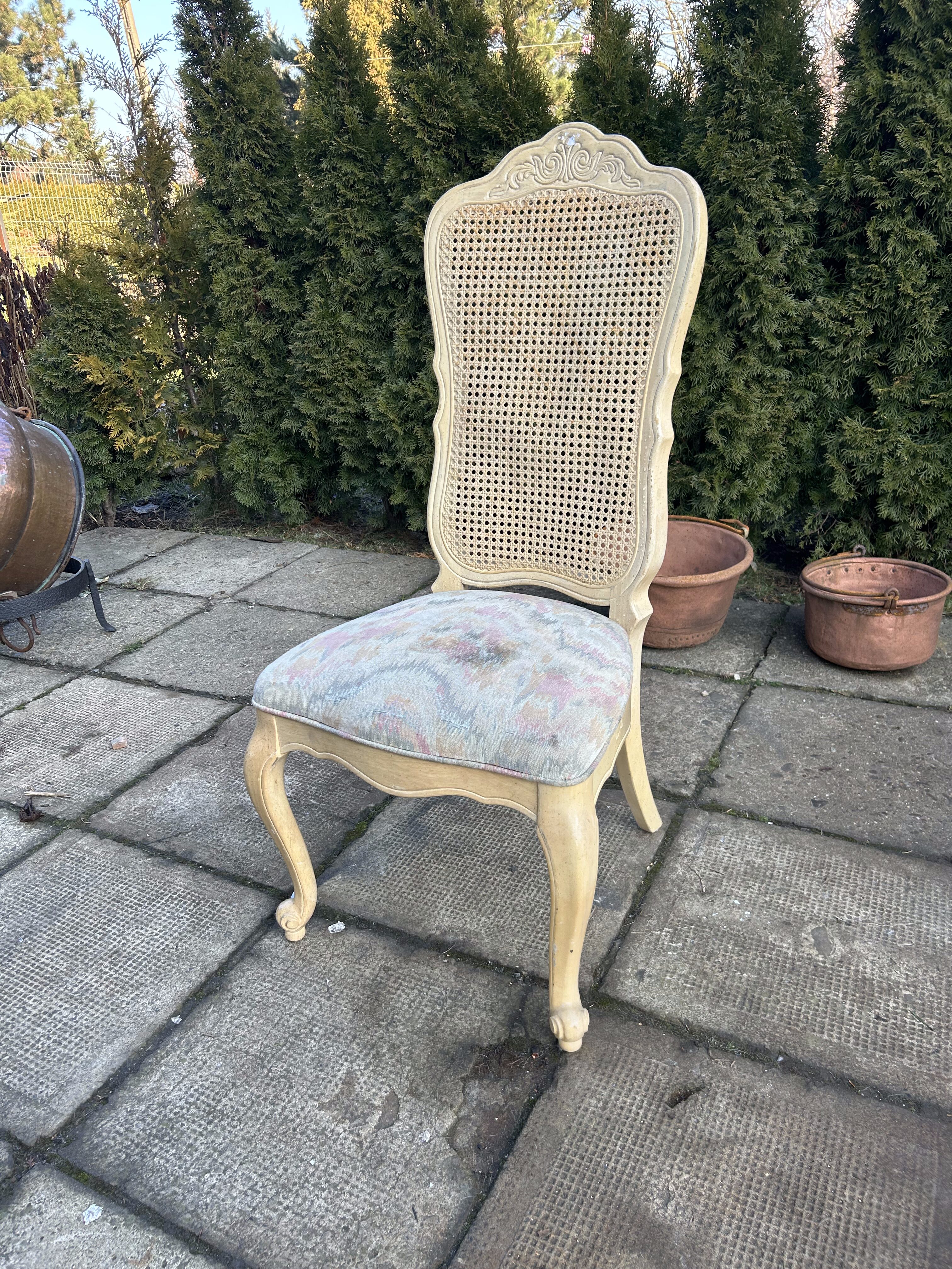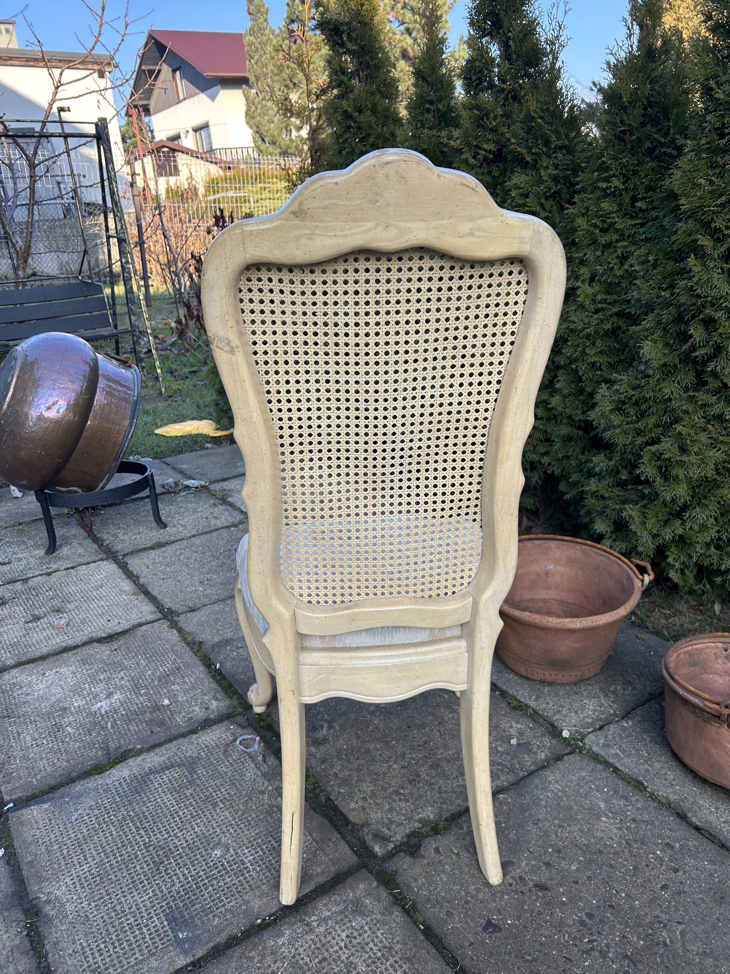 Eleganckie krzesło w jasnej kolorystyce z dekoracyjnym, rattanowym oparciem. Forma inspirowana klasycznym wzornictwem, z delikatnie profilowanymi nogami i subtelnymi liniami ramy. Siedzisko tapicerowane, zapewniające komfort użytkowania. Doskonałe jako pojedynczy akcent we wnętrzu lub element zestawu w jadalni, salonie czy sypialni.