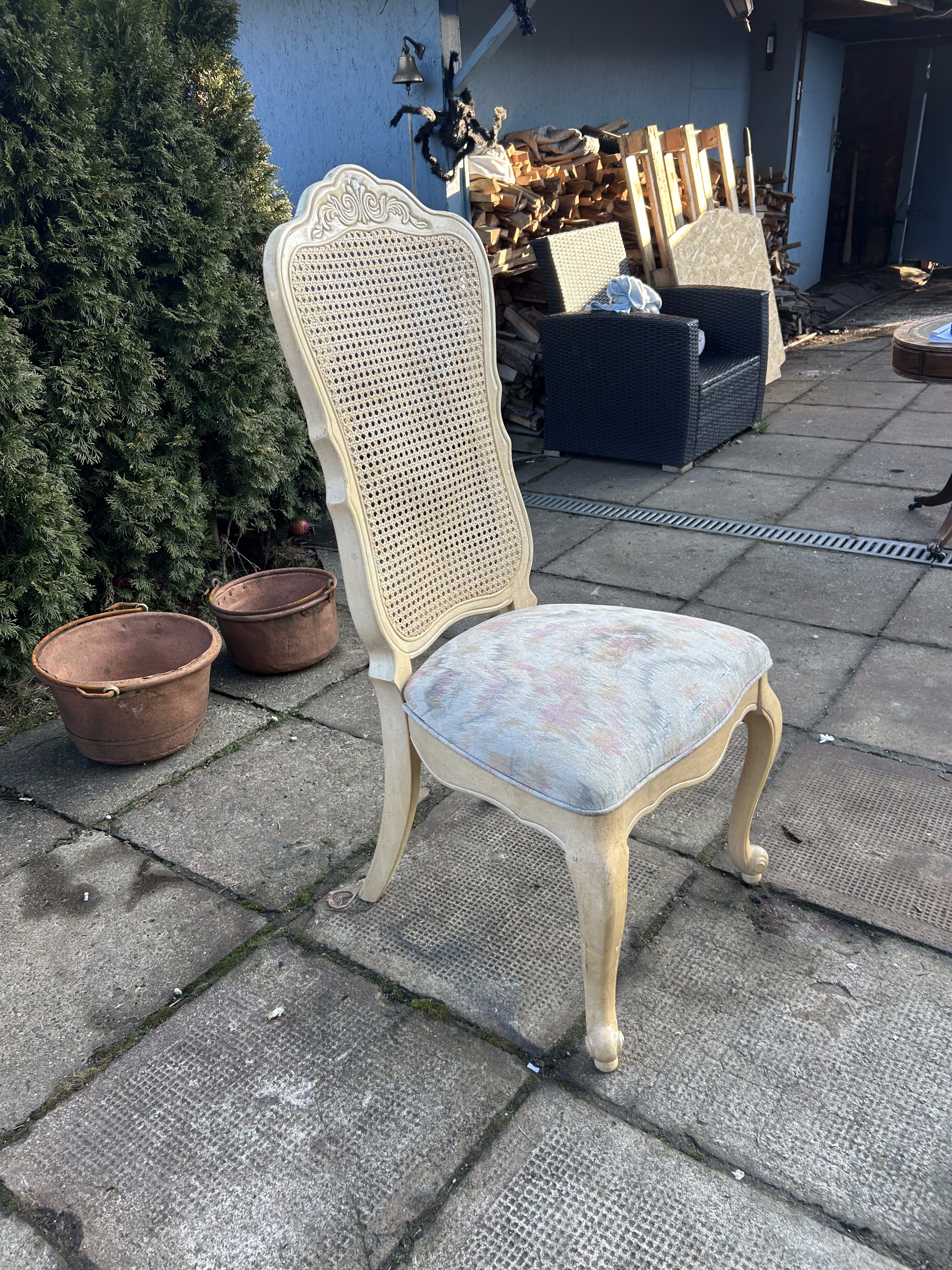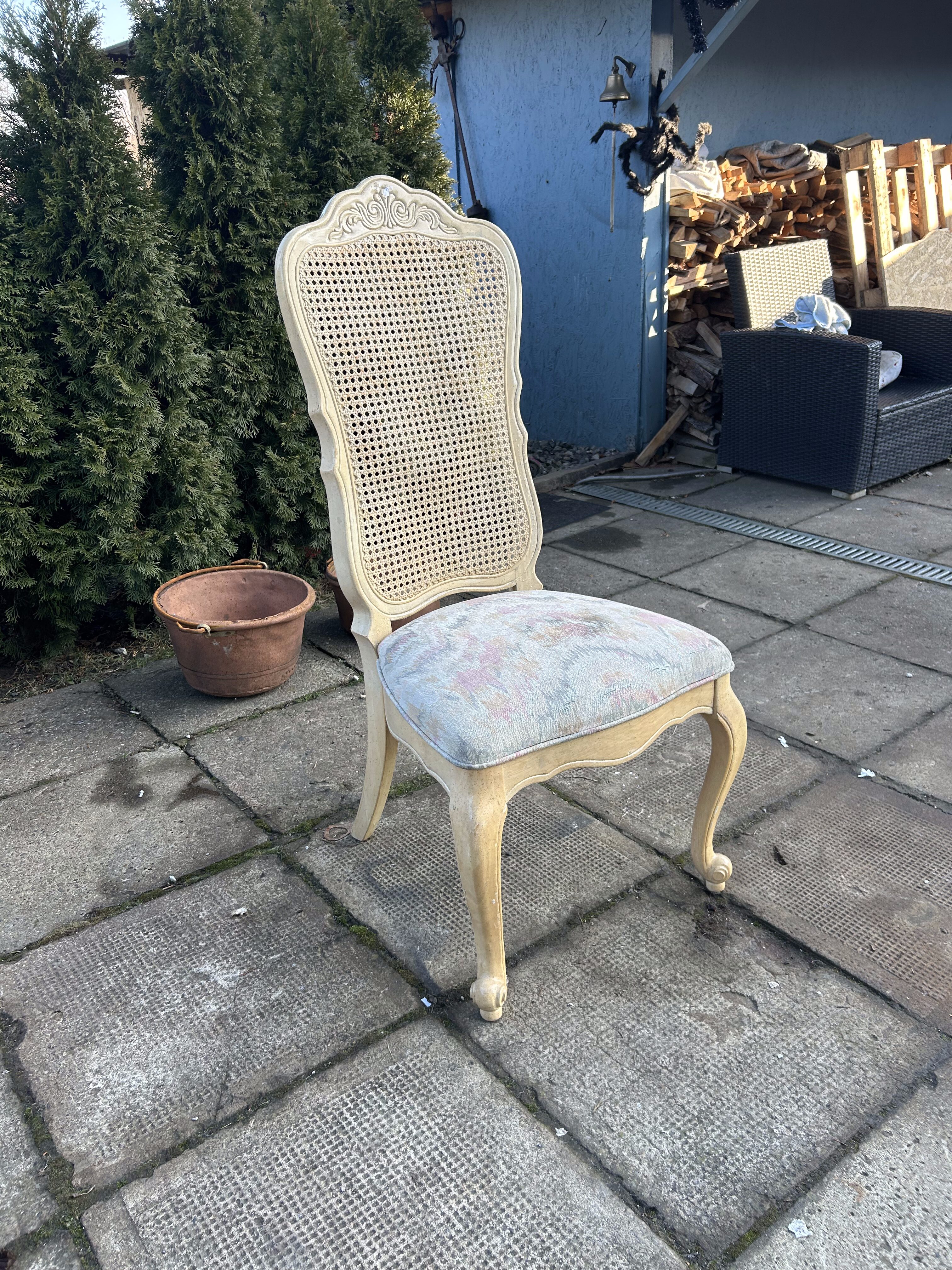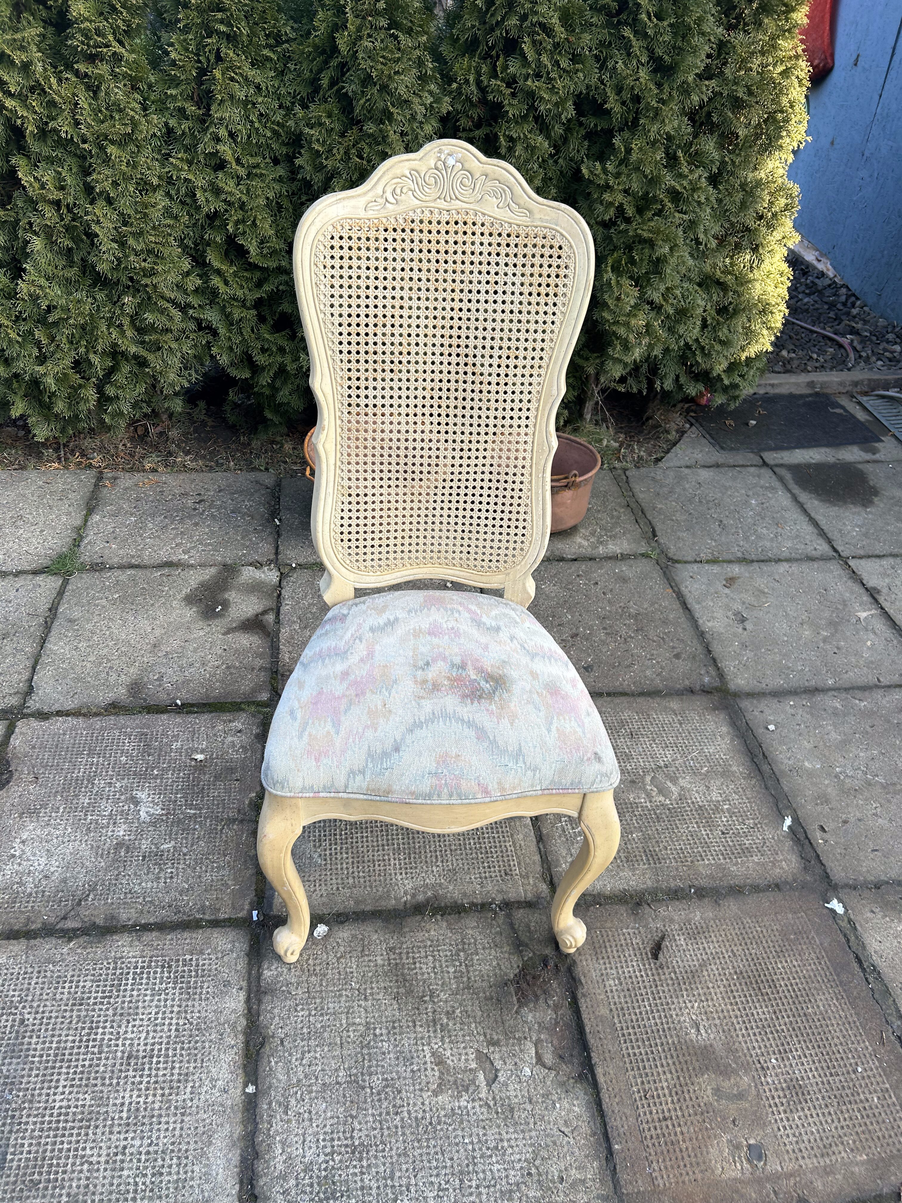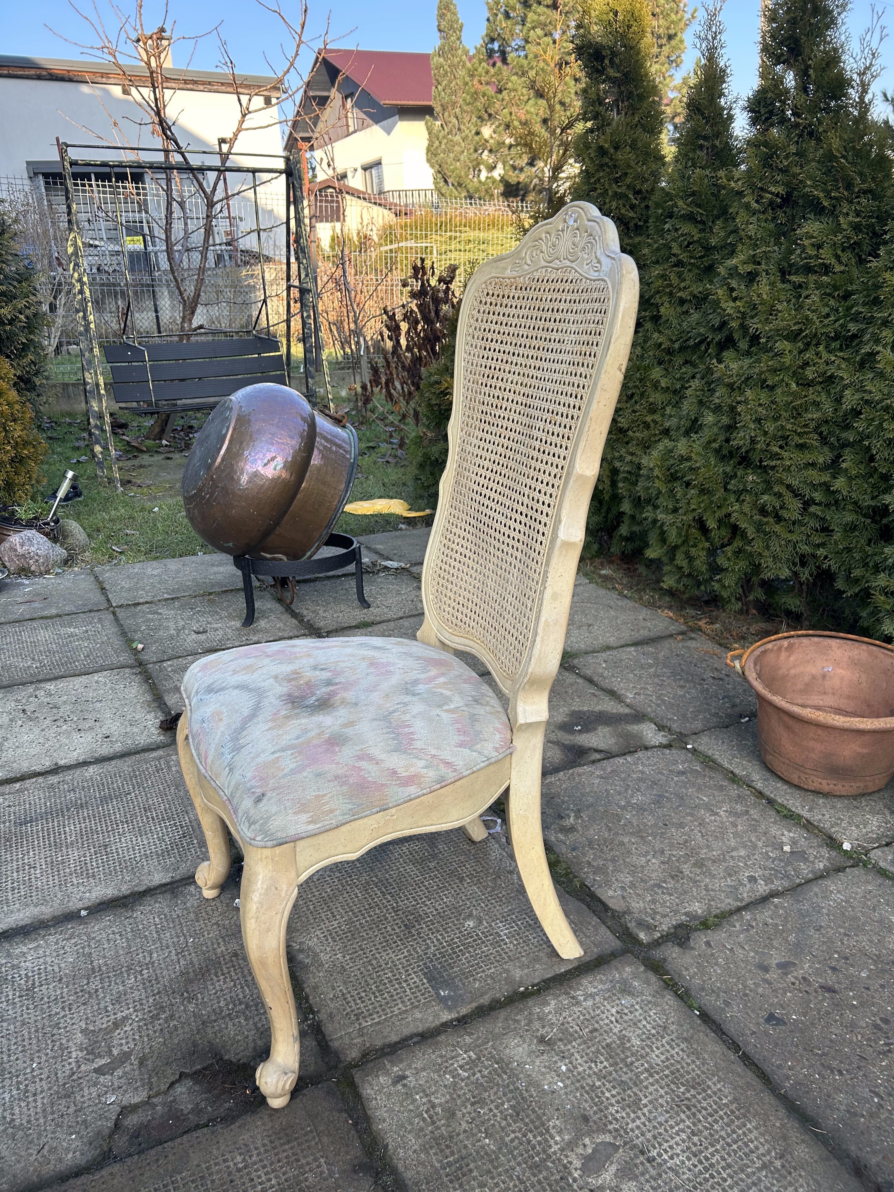 Eleganckie krzesło w jasnej kolorystyce z dekoracyjnym, rattanowym oparciem. Forma inspirowana klasycznym wzornictwem, z delikatnie profilowanymi nogami i subtelnymi liniami ramy. Siedzisko tapicerowane, zapewniające komfort użytkowania. Doskonałe jako pojedynczy akcent we wnętrzu lub element zestawu w jadalni, salonie czy sypialni.
