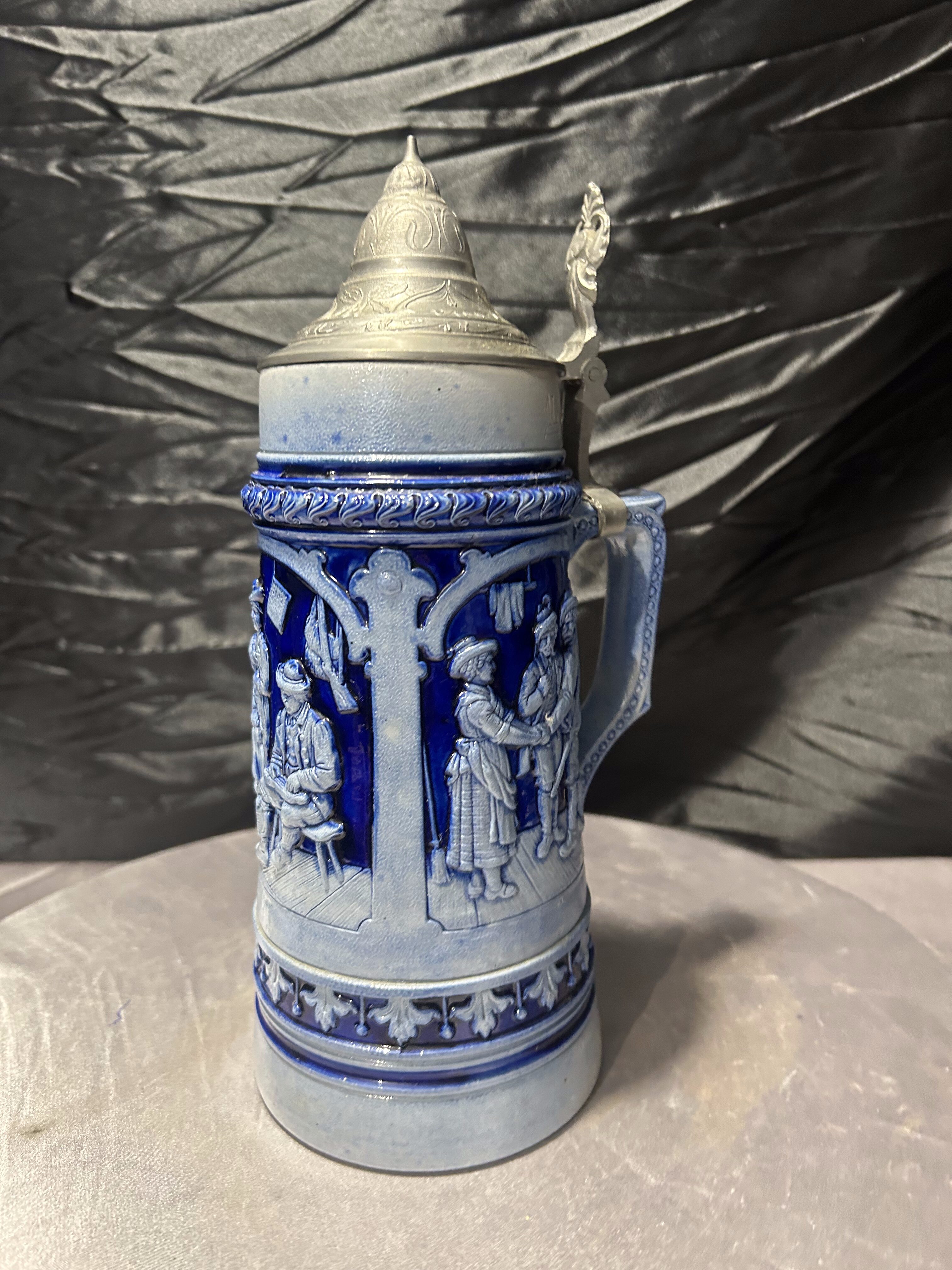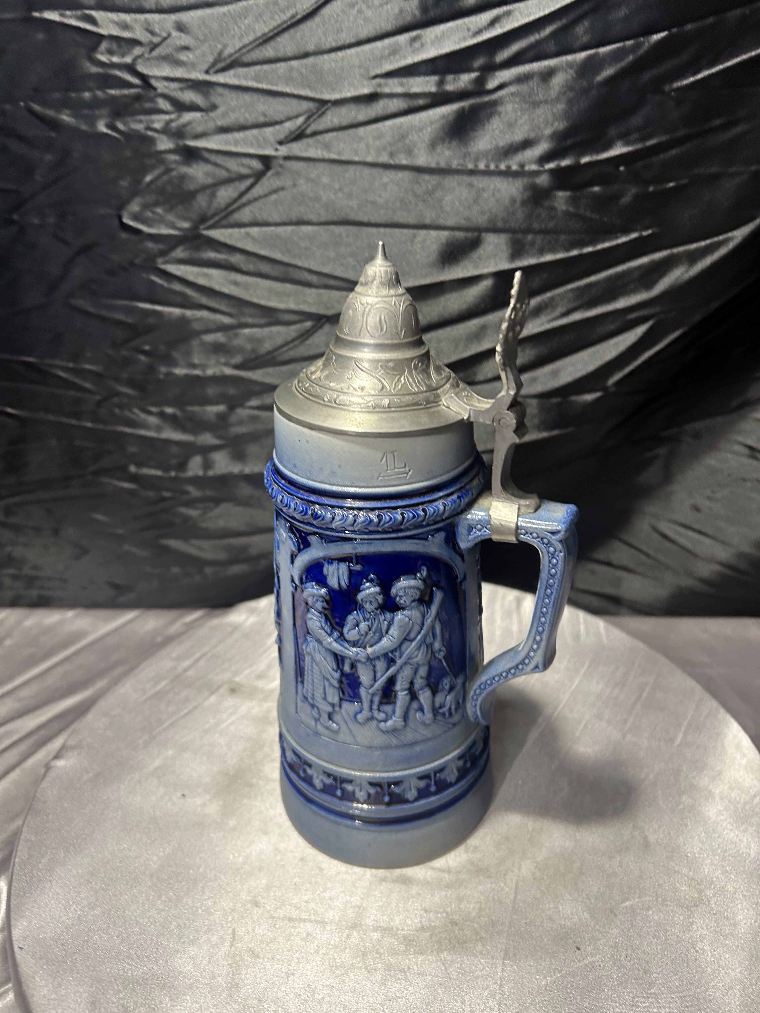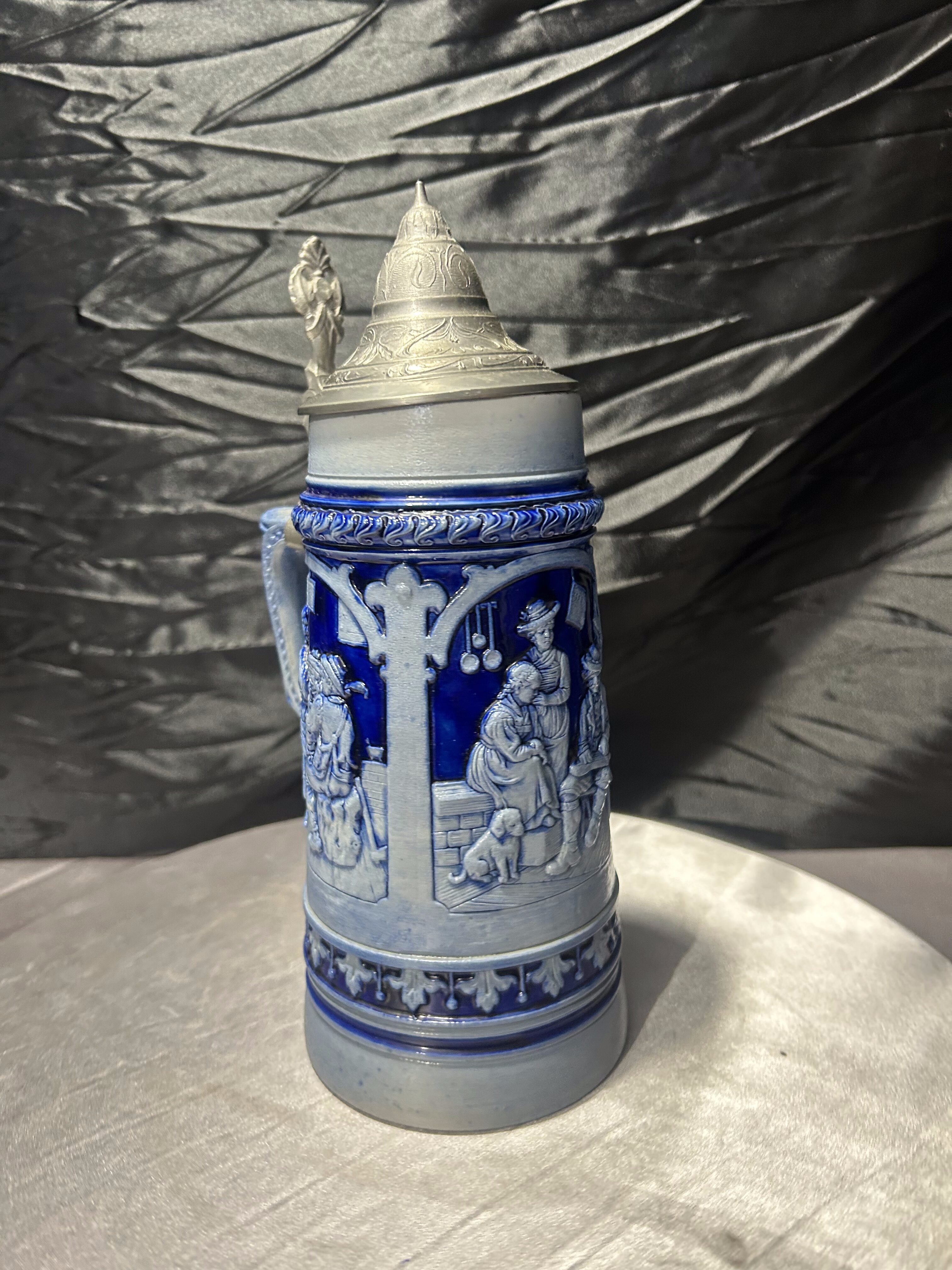 Duży, dekoracyjny kufel ceramiczny o pojemności jednego litra, wykonany w klasycznym, niemieckim stylu. Bogato zdobiony reliefową sceną figuralną oraz ornamentalnymi detalami.