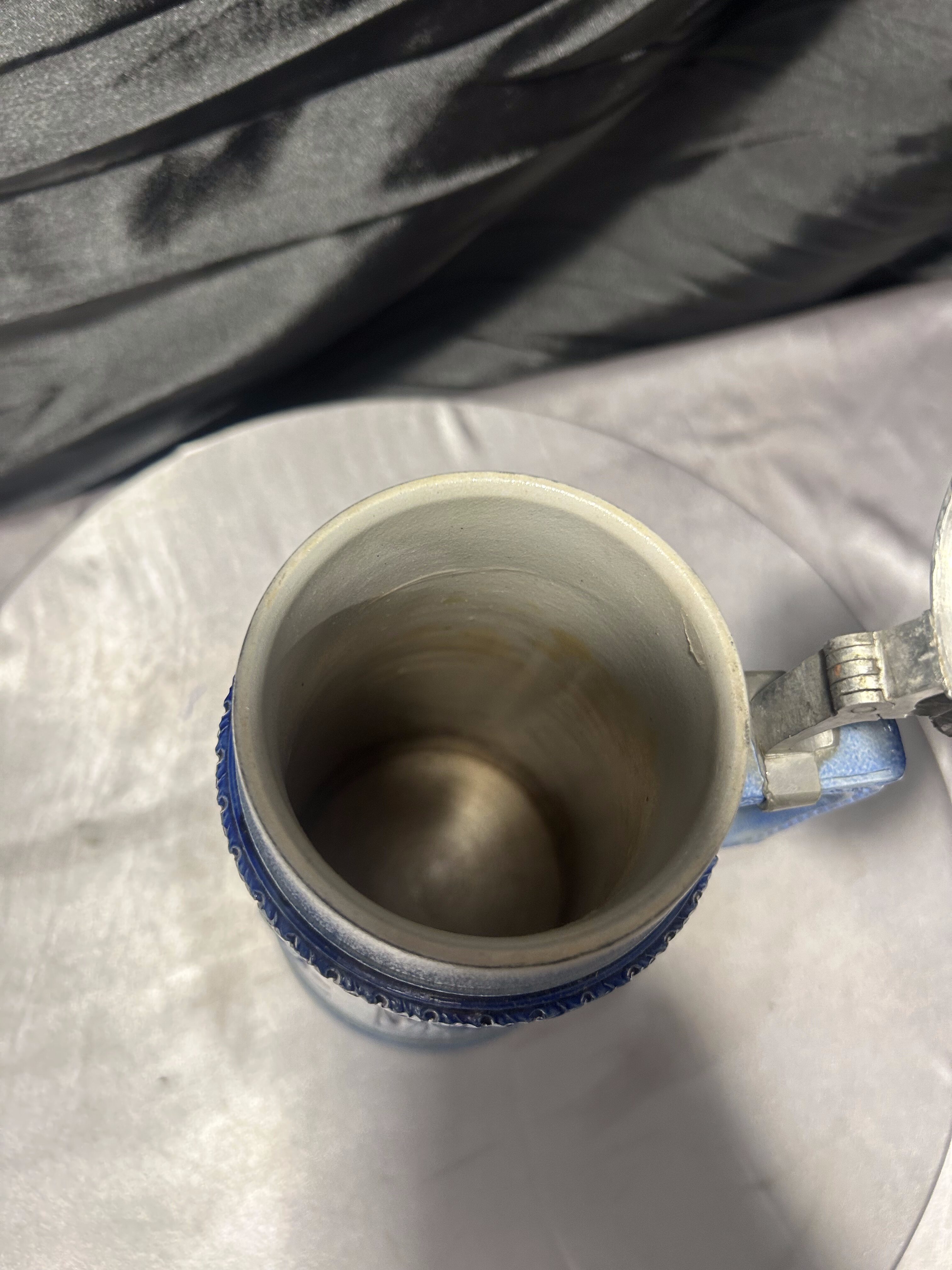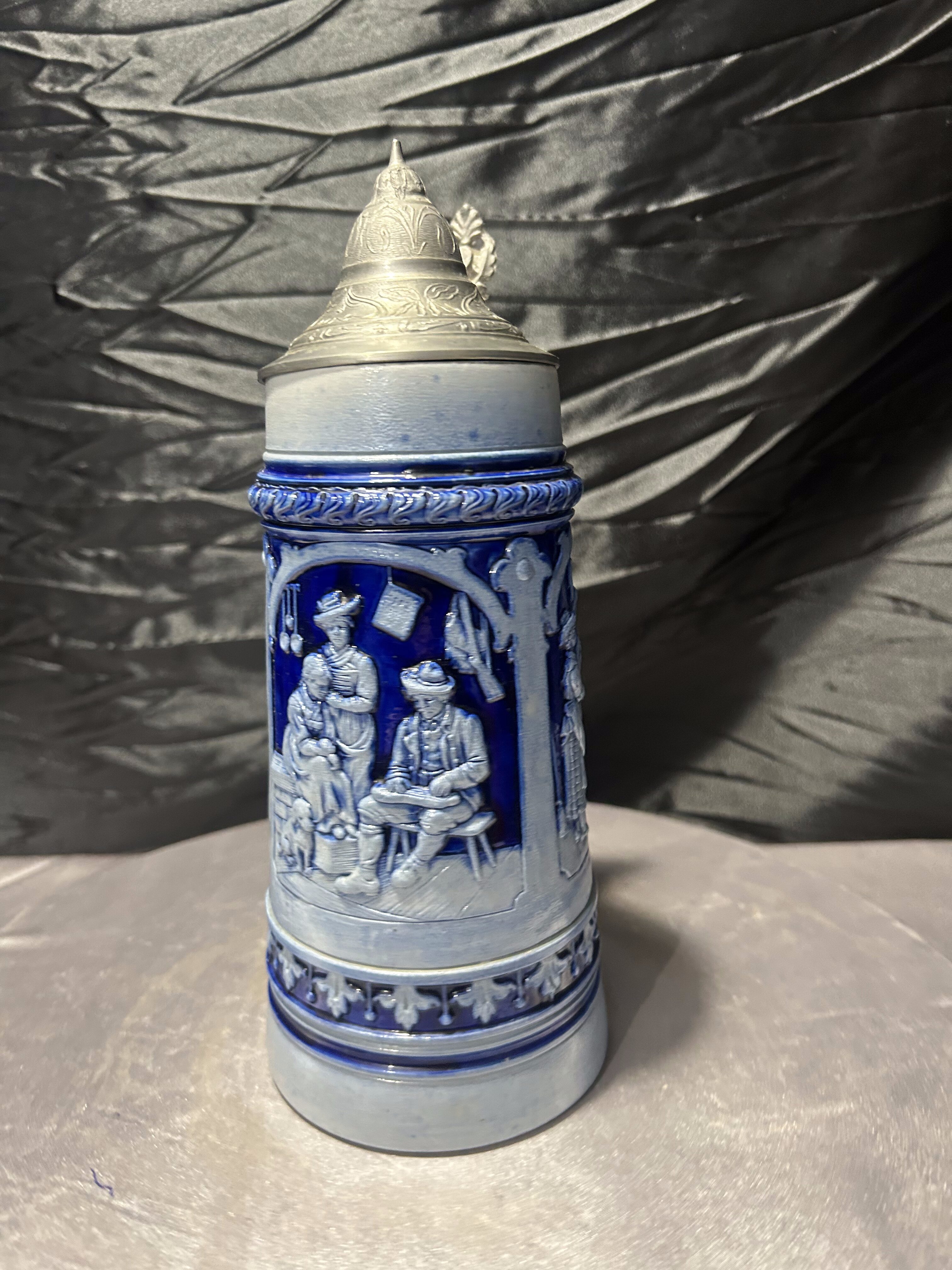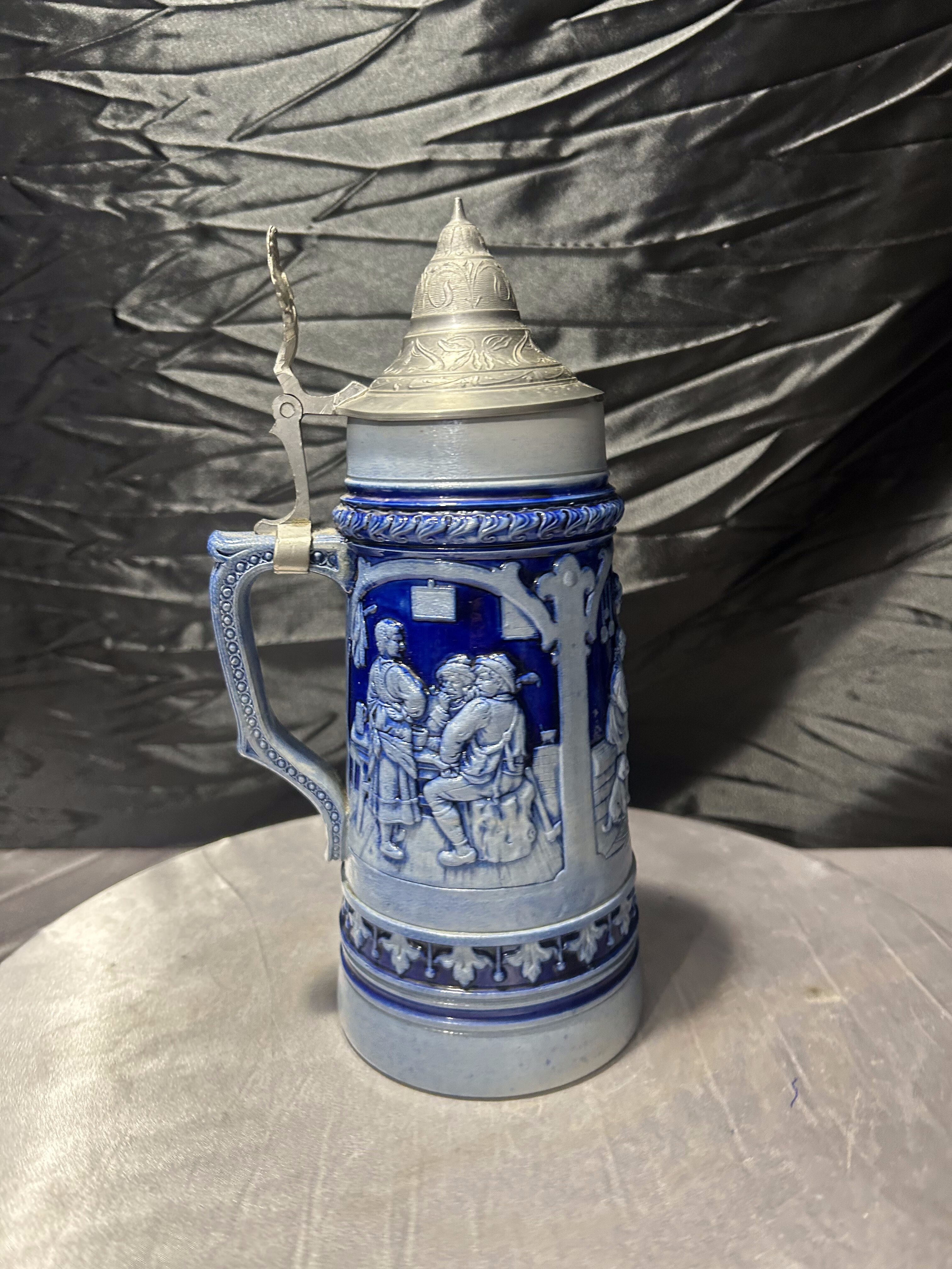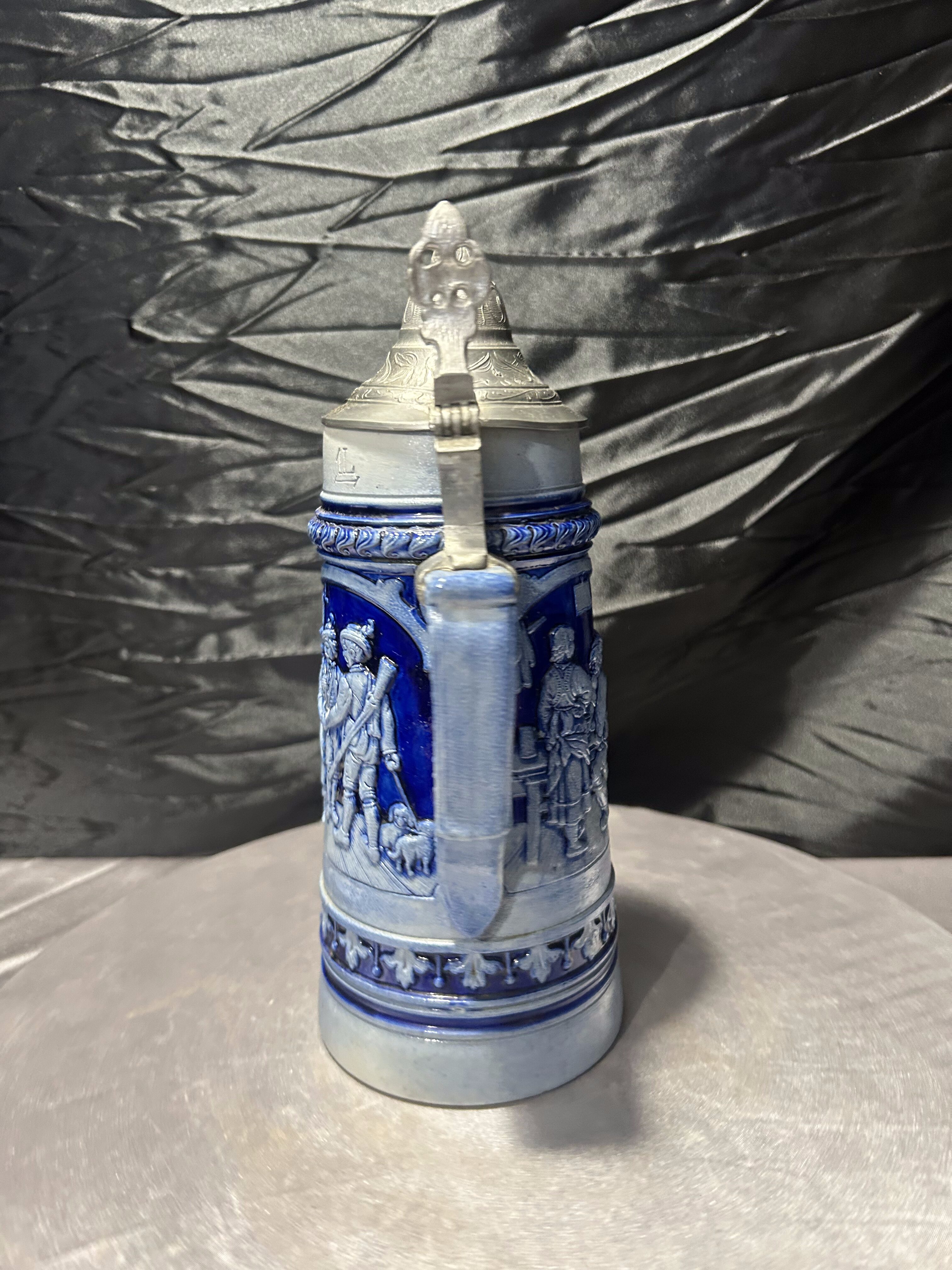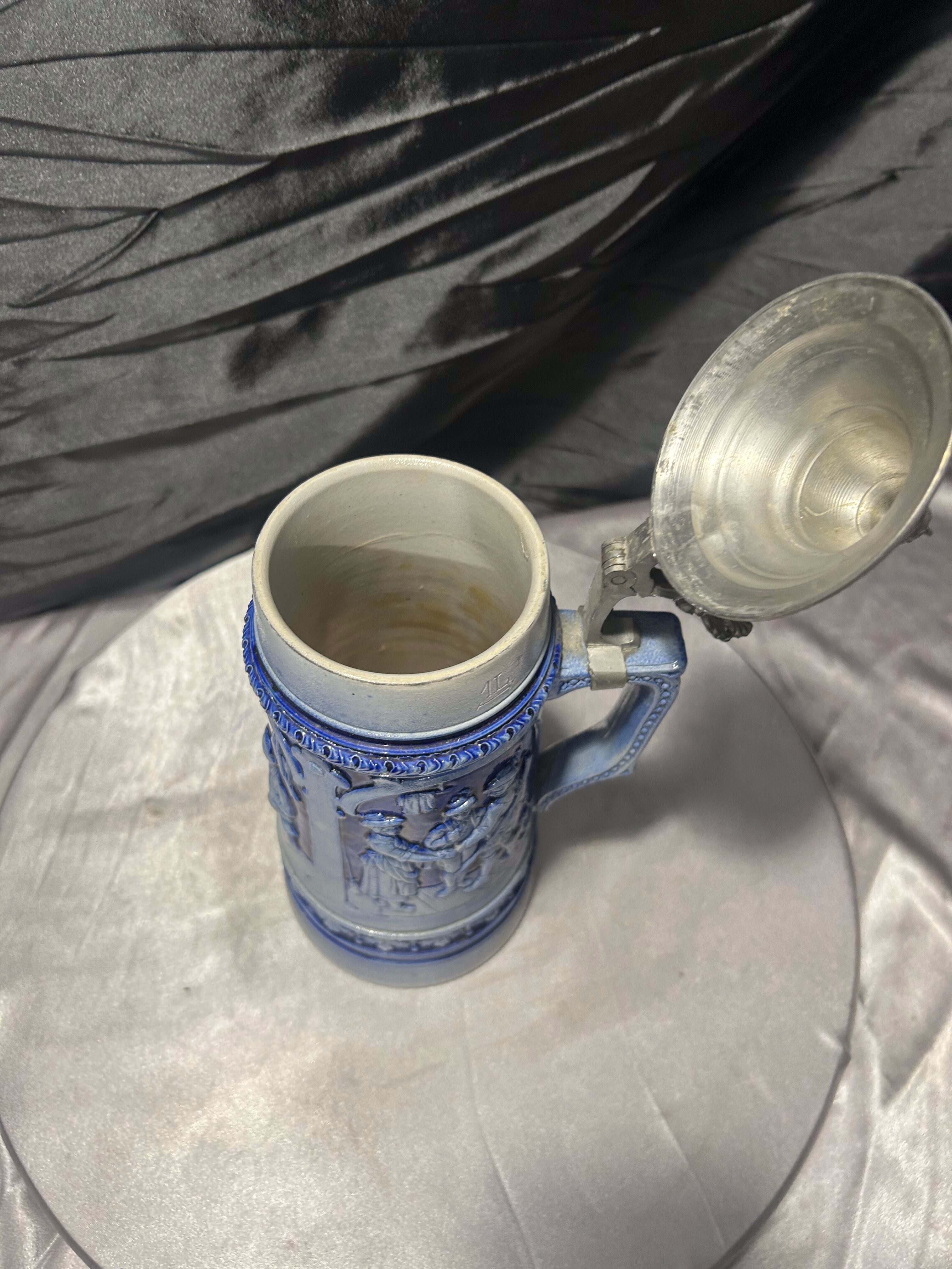 Korpus w odcieniach głębokiego błękitu pięknie kontrastuje z metalowym, zamykanym wiekiem. Charakterystyczna klapa z uchwytem podkreśla tradycyjny charakter kufla i nadaje mu kolekcjonerskiego wyrazu.