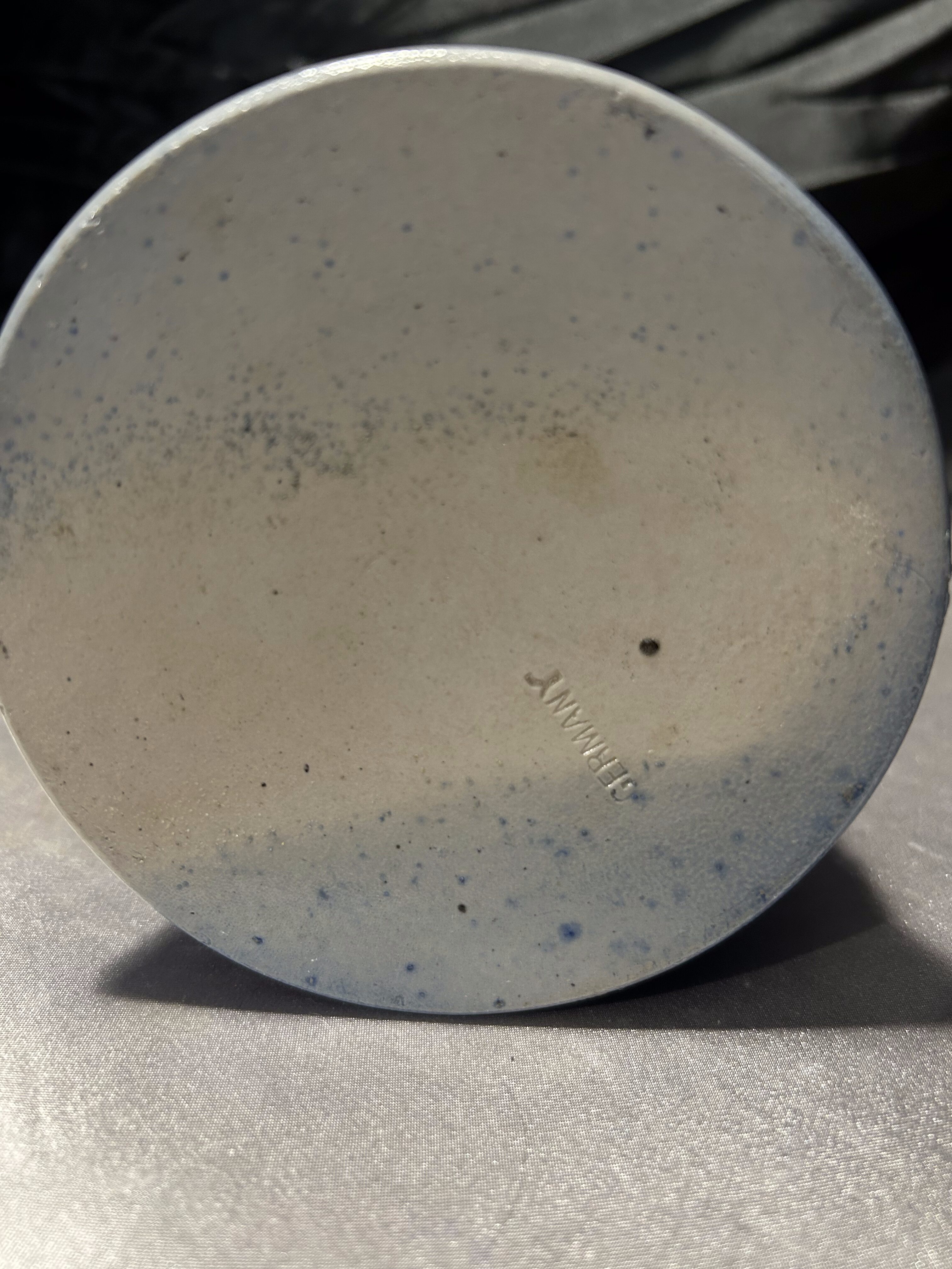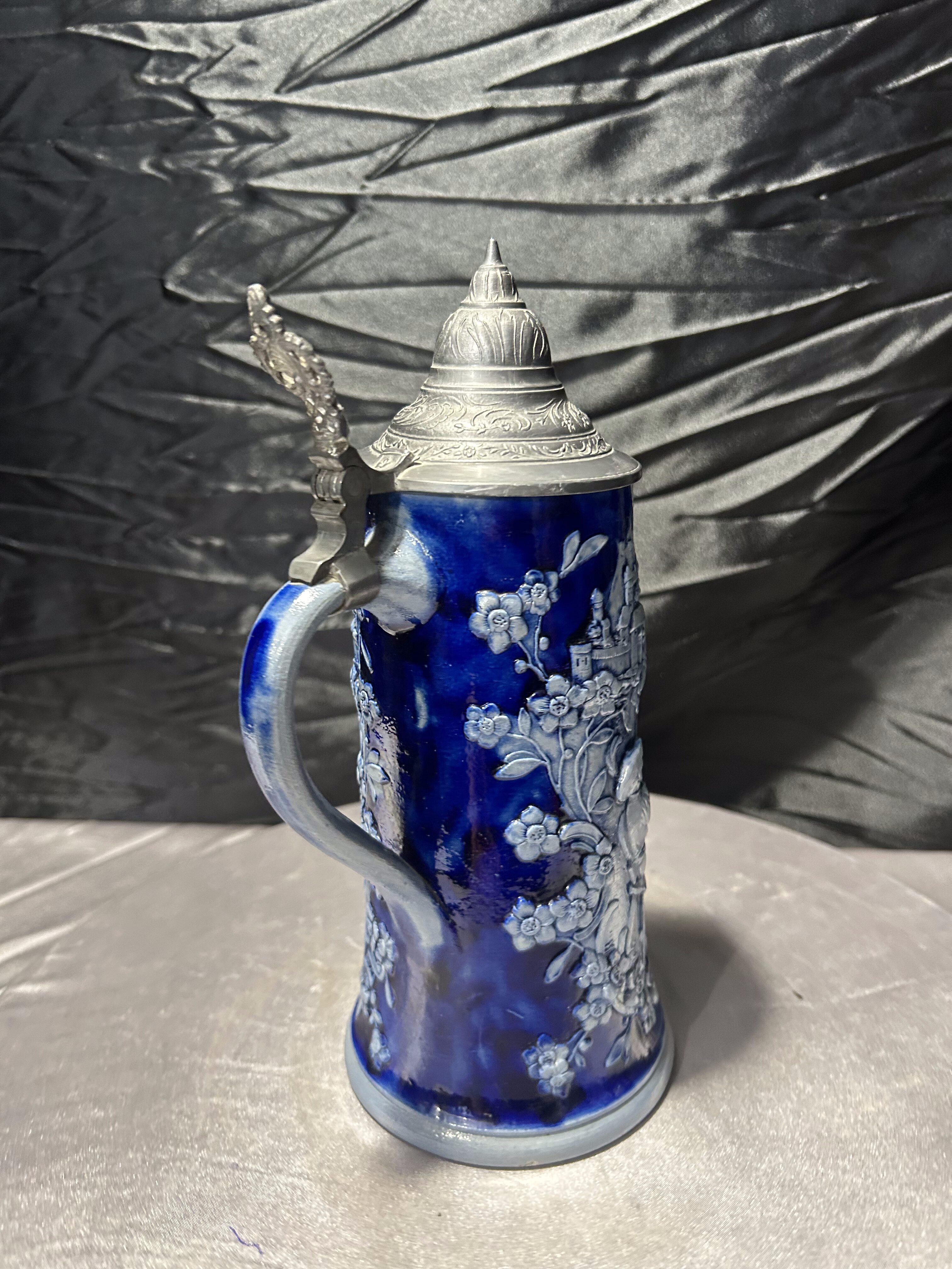 Oryginalny niemiecki kufel ceramiczny sygnowany od spodu „Germany”, bogato zdobiony reliefową sceną rodzajową. Utrzymany w klasycznej, kobaltowo-szarej tonacji, z wyraźnie wypukłymi detalami przedstawiającymi postacie, architekturę i dekoracyjne motywy roślinne.